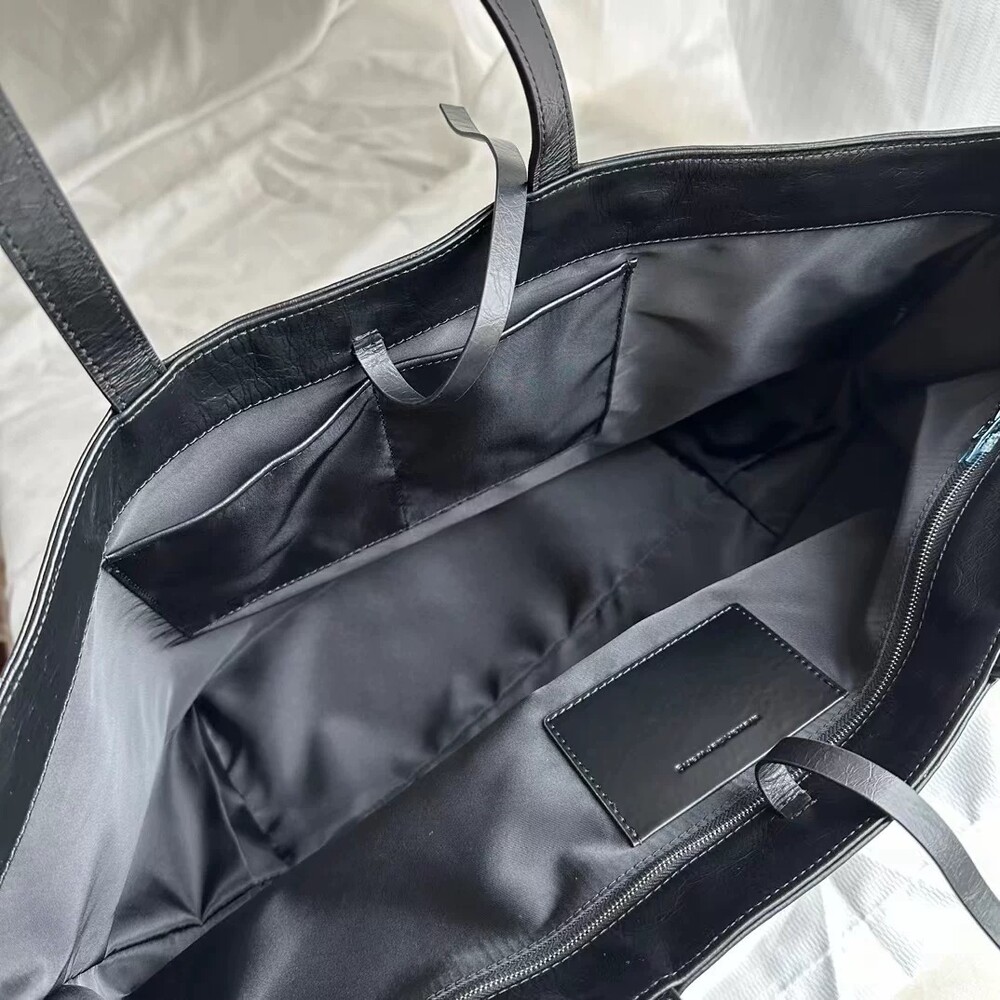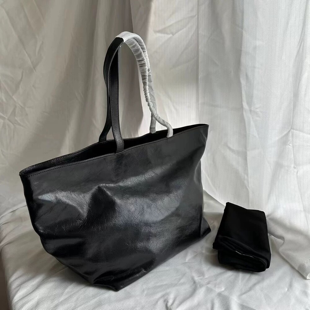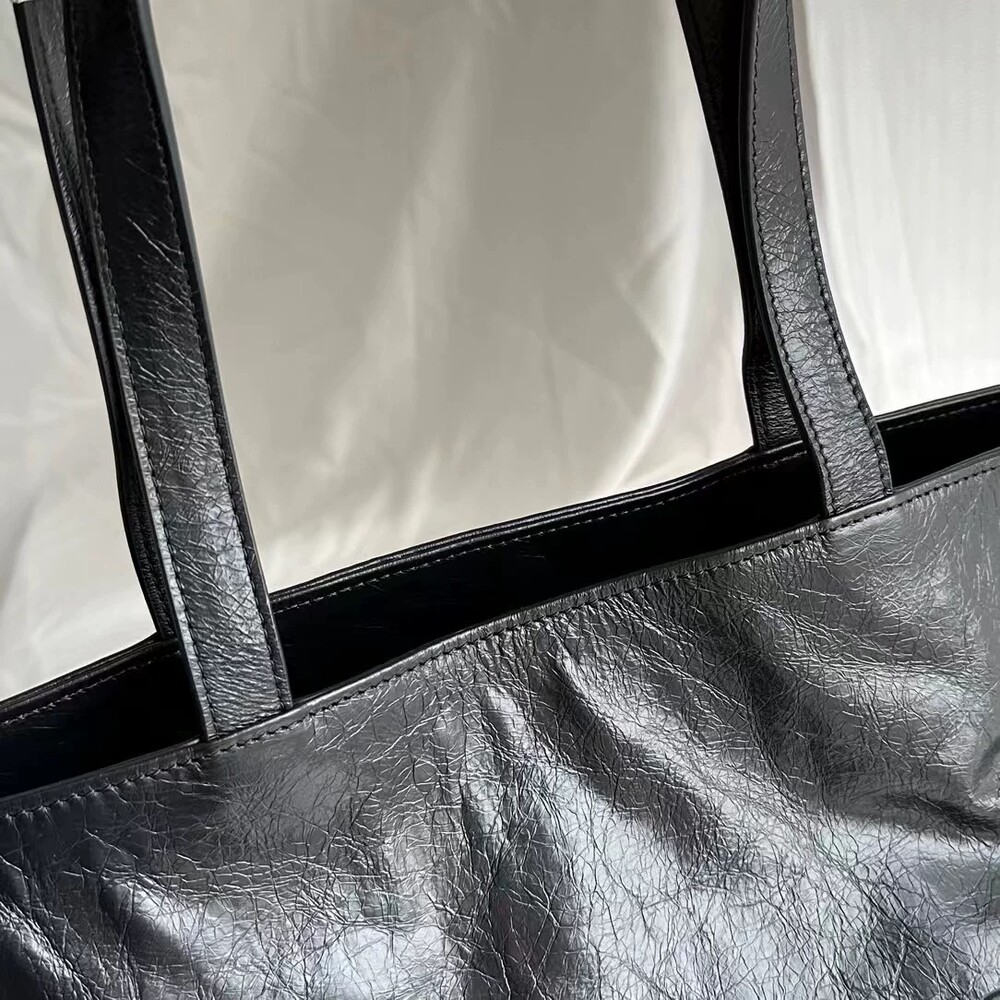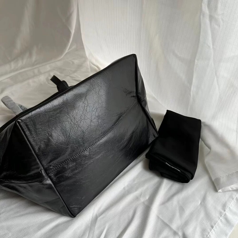 길이 잘 든 룩과 느낌의 크래클 페이턴트 가죽 소재 라지 사이즈 가죽 백, 앞면 중앙의 볼록한 토널 "alexander wang" 로고 디테일. 노트북을 넣을 수 있는 사이즈의 내부 백월 포켓, 2개의 라지 사이즈 핸들, 내부 상단의 타이 여밈.