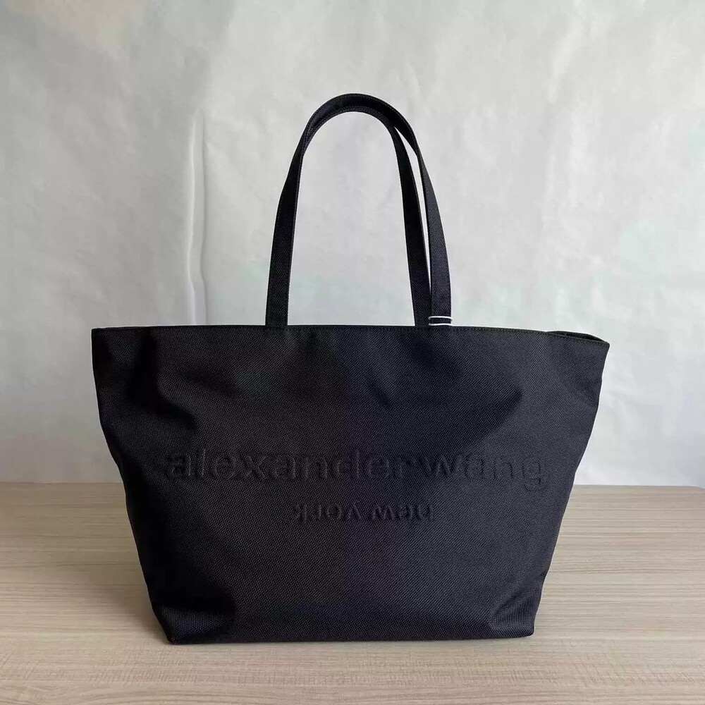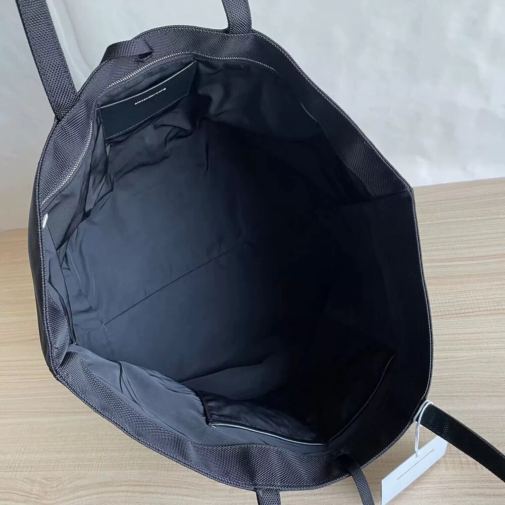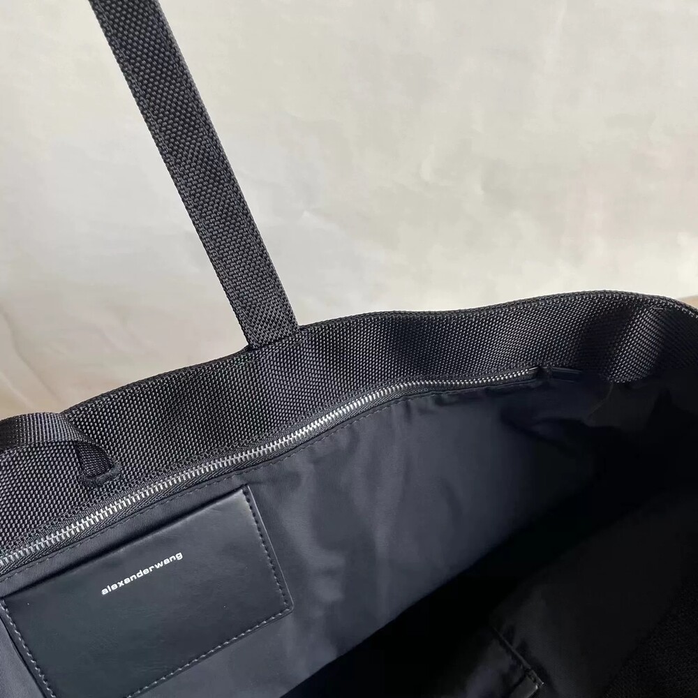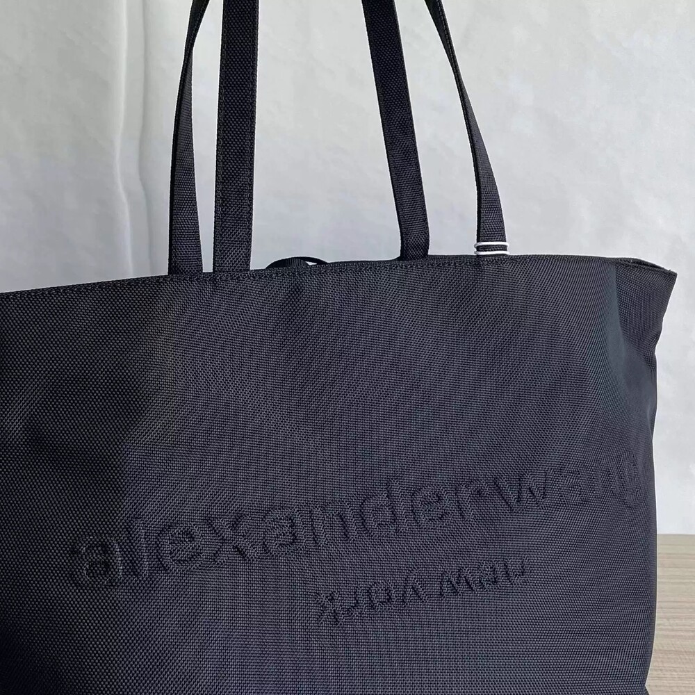 산뜻한 룩과 느낌을 선사하는 블랙 나일론 숄더백, 앞면 중앙의 볼록한 "alexanderwang" 로고 디테일. 노트북을 넣을 수 있는 사이즈의 내부 백월 포켓, 어깨에 맬 수 있는 2개의 핸들, 안전한 수납을 위한 상단의 타이 여밈.