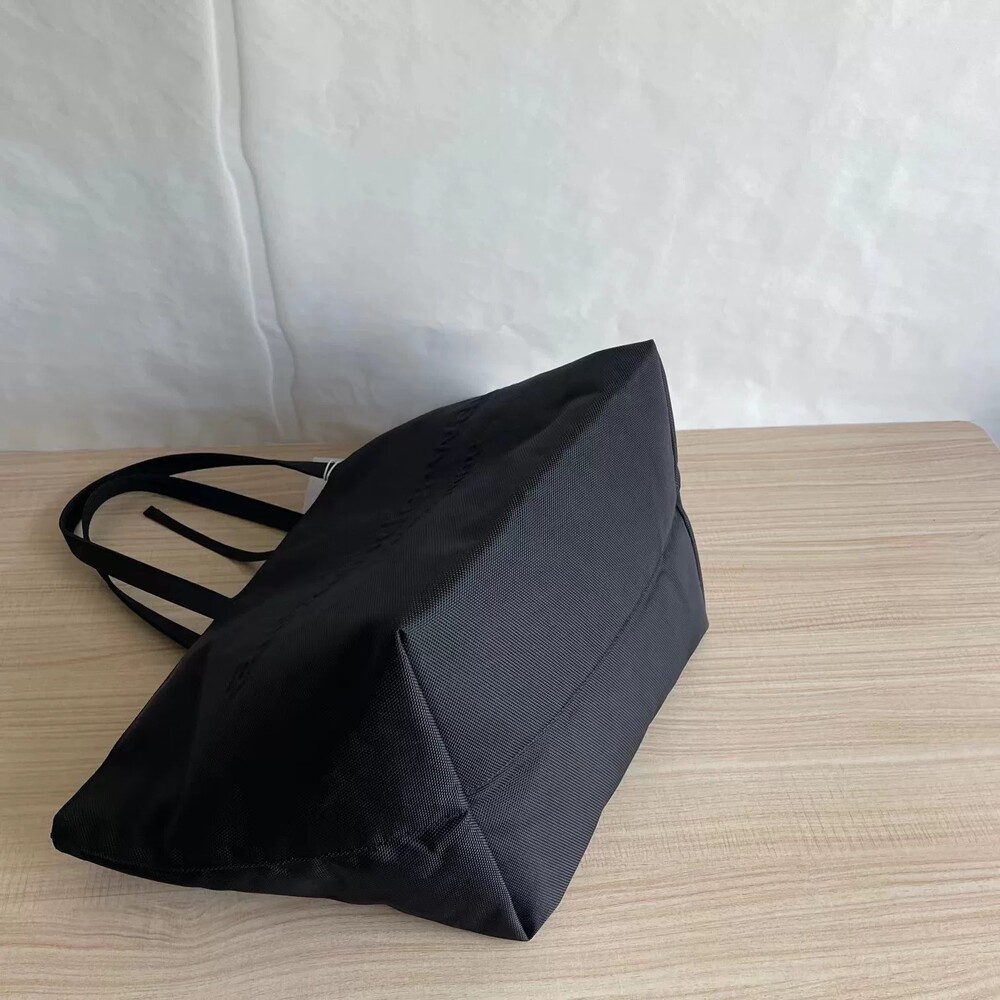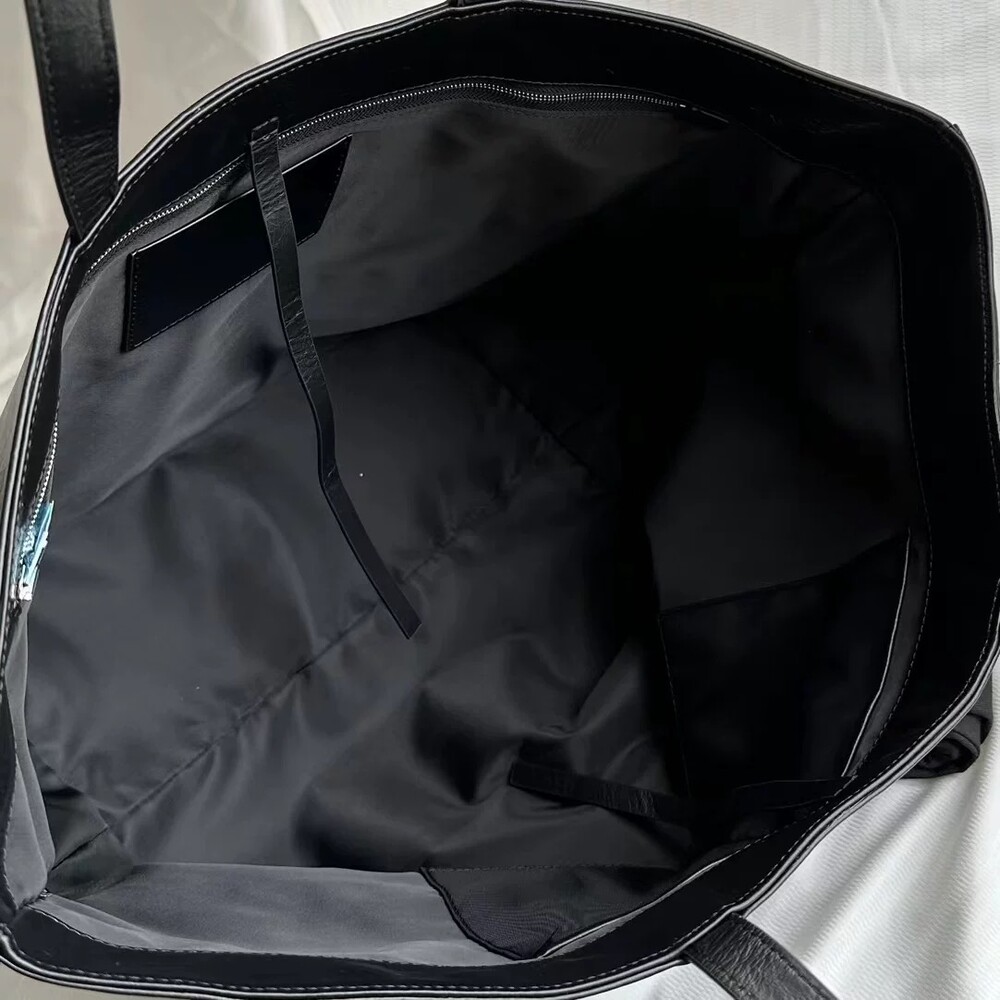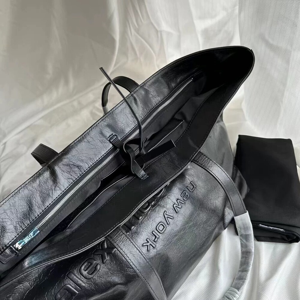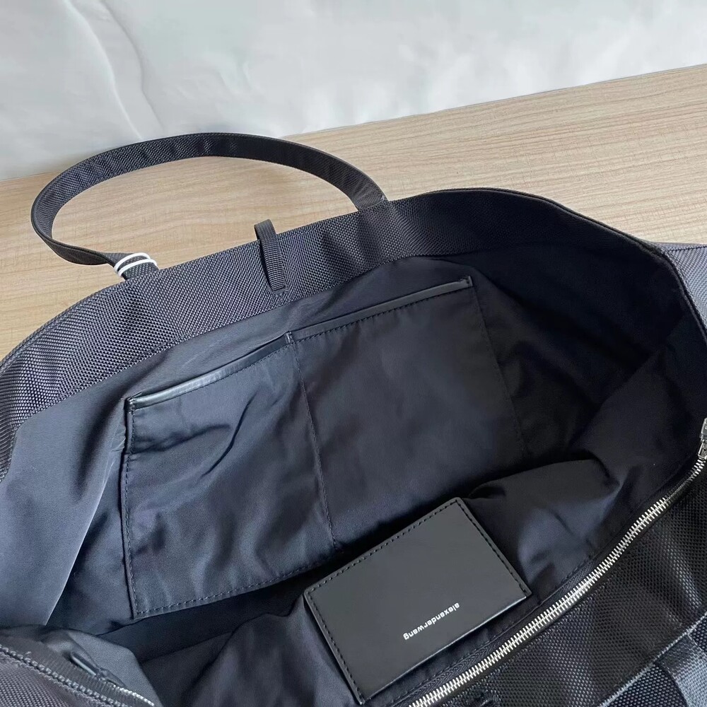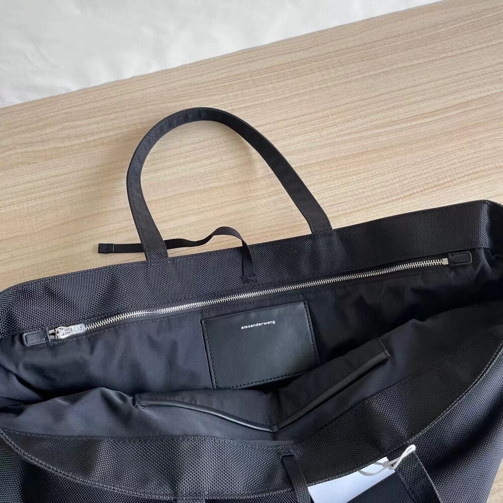 산뜻한 룩과 느낌을 선사하는 블랙 나일론 숄더백, 앞면 중앙의 볼록한 "alexanderwang" 로고 디테일. 노트북을 넣을 수 있는 사이즈의 내부 백월 포켓, 어깨에 맬 수 있는 2개의 핸들, 안전한 수납을 위한 상단의 타이 여밈.