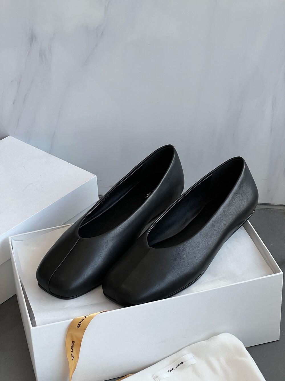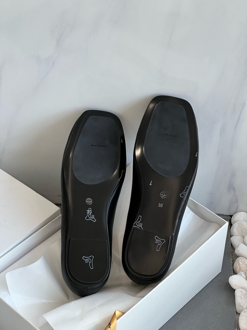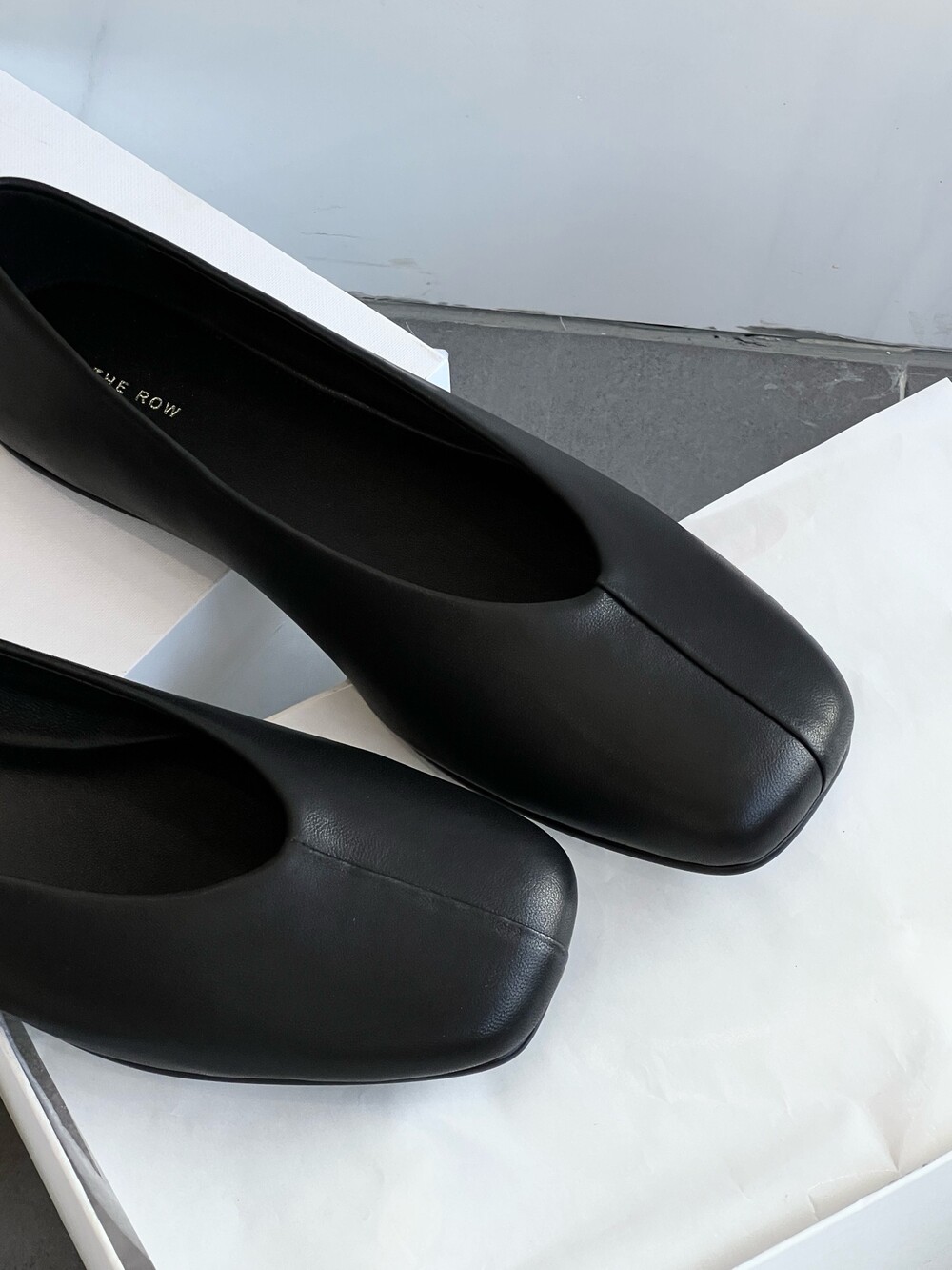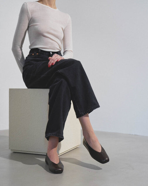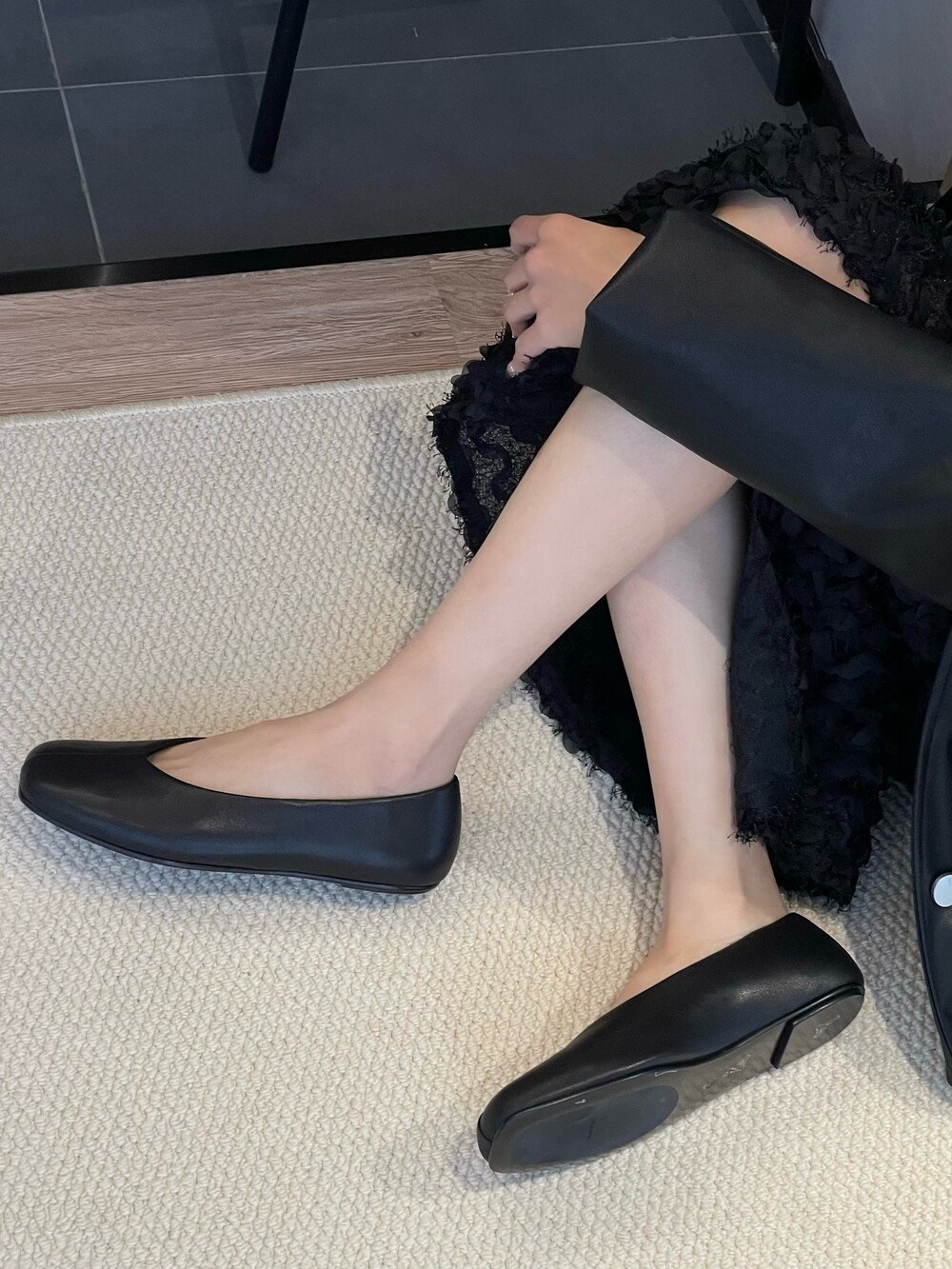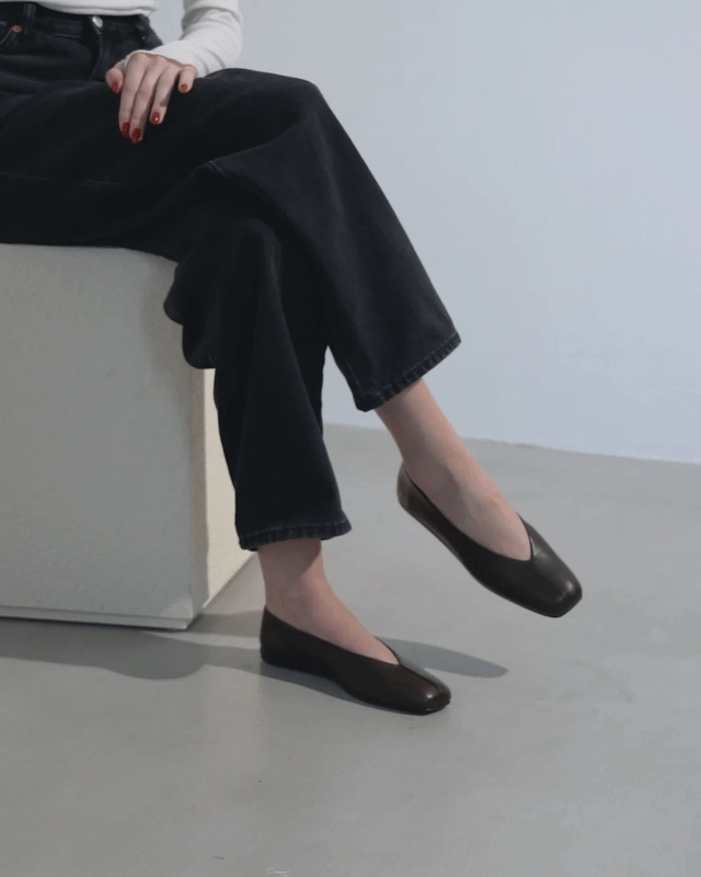 에바 투(Eva Two) 발레리나 플랫은 부드러운 나파 가죽 소재에 가벼운 가죽 밑창을 더했으며, 살짝 각진 앞코가 특징입니다.
