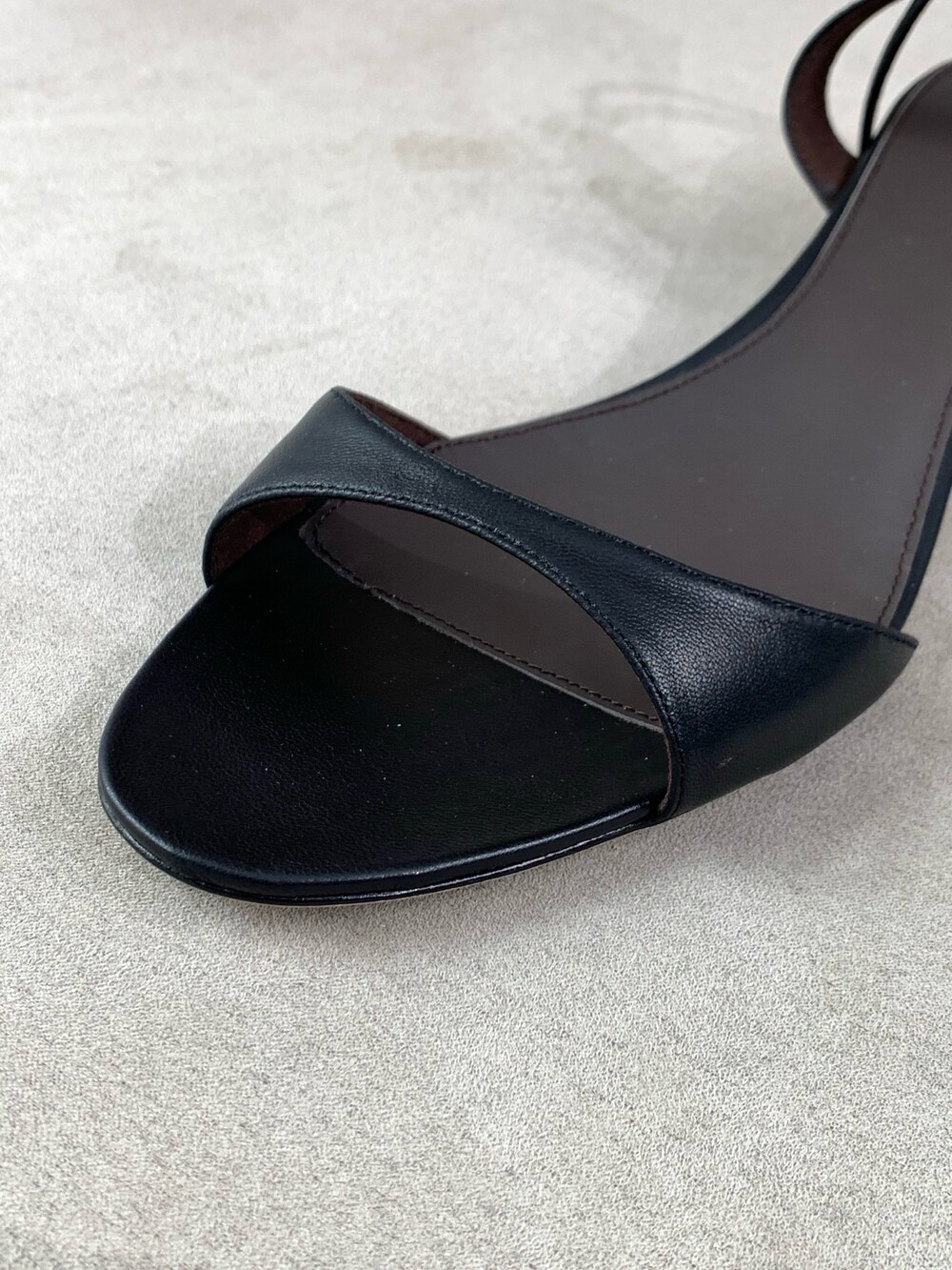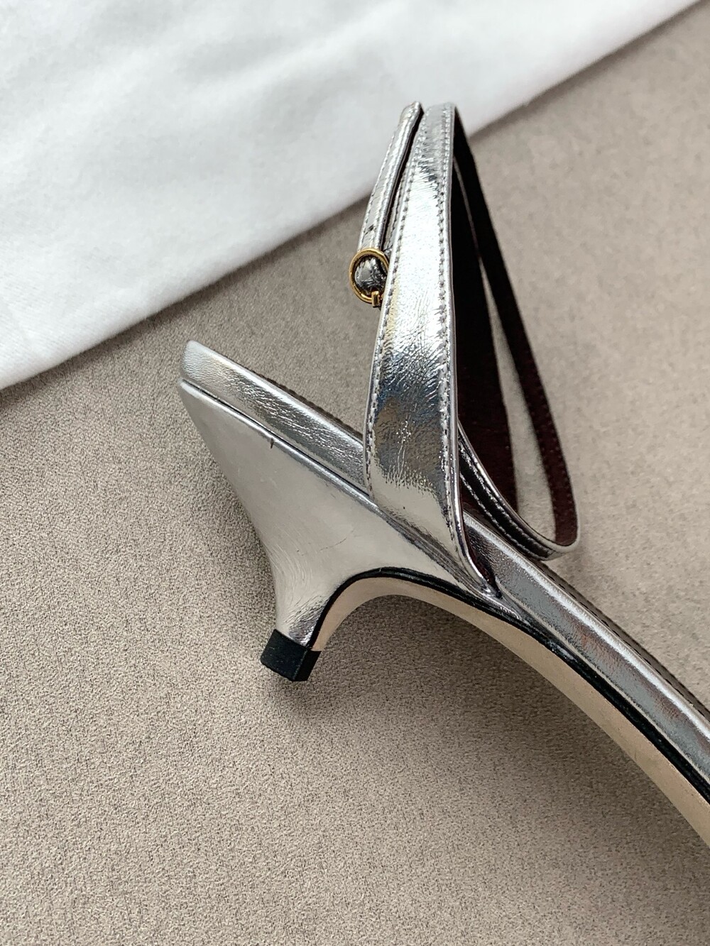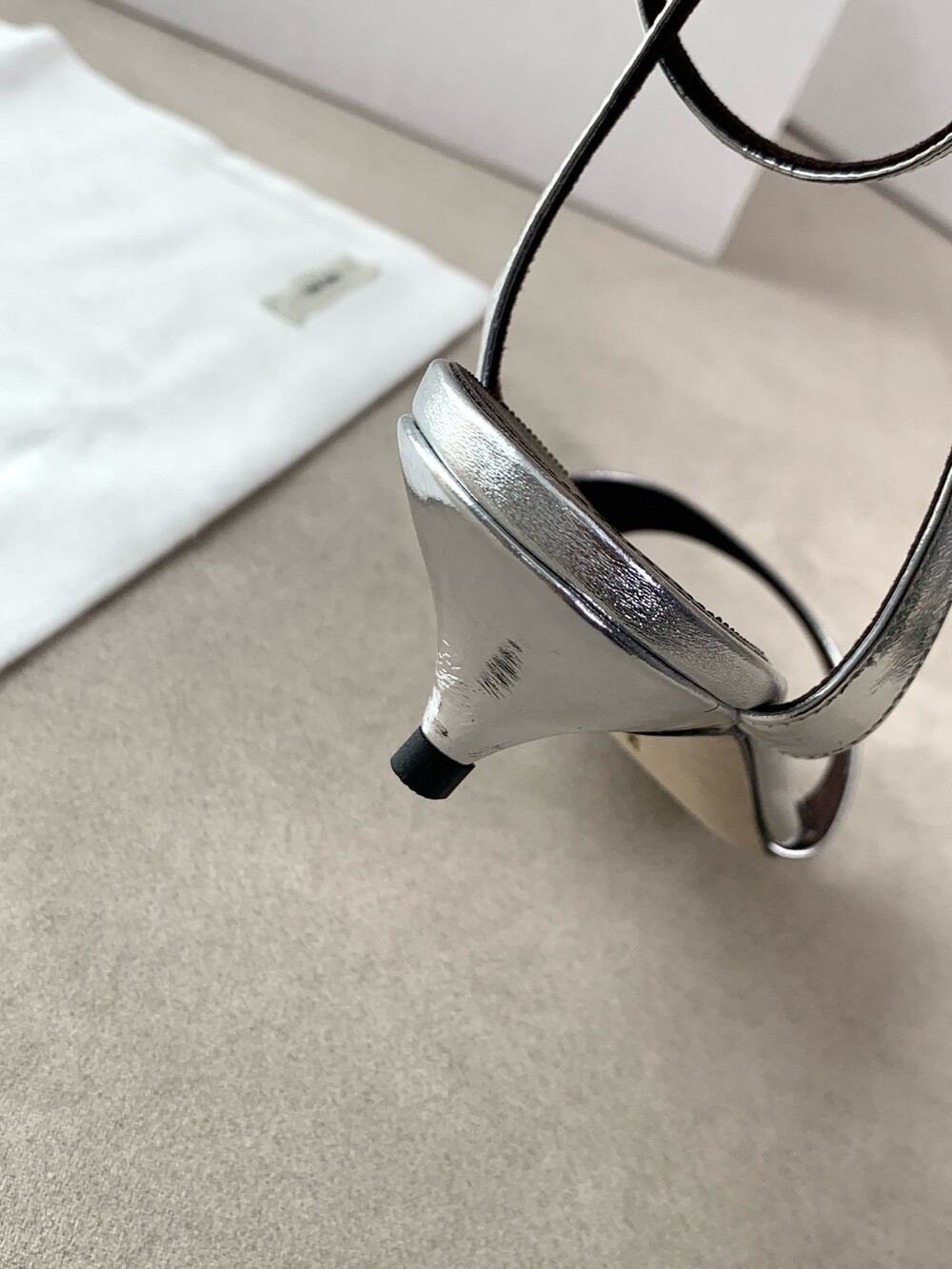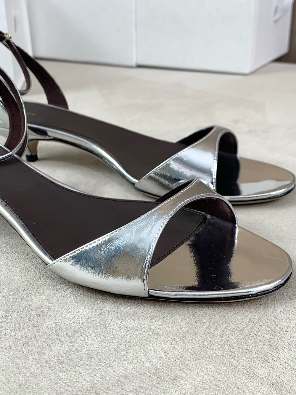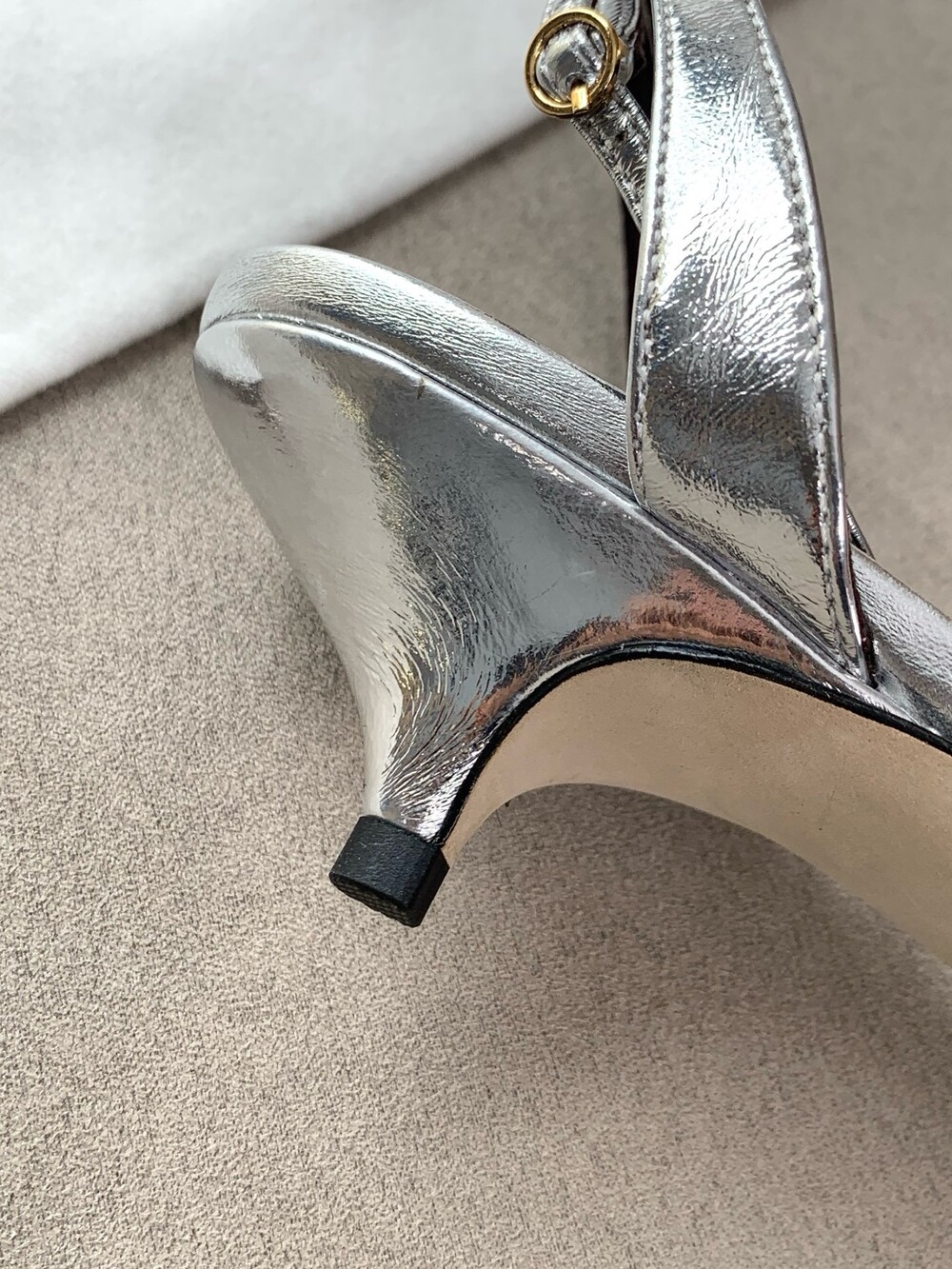 부드러운 램스킨 가죽 소재의 세련된 힐 샌들. 버클로 고정하는 섬세한 앵클 스트랩 및 테이퍼드 힐.