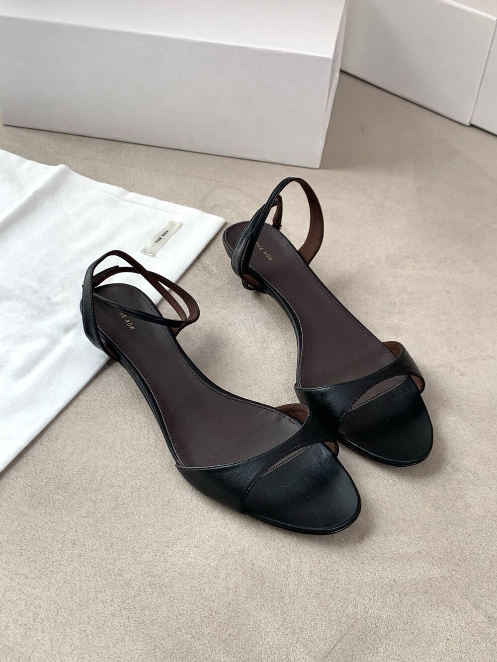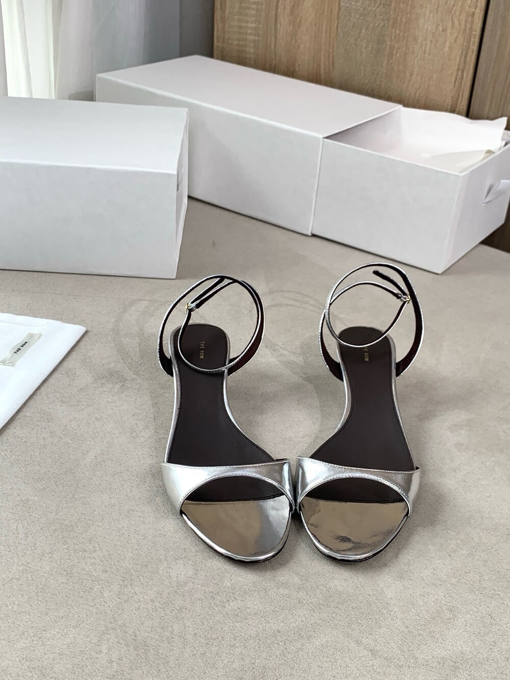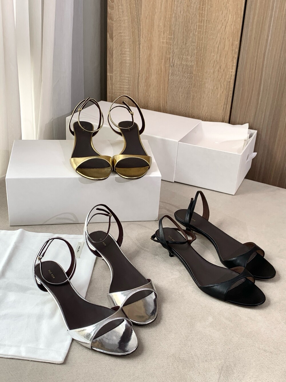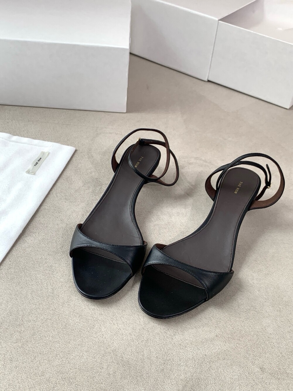 부드러운 램스킨 가죽 소재의 세련된 힐 샌들. 버클로 고정하는 섬세한 앵클 스트랩 및 테이퍼드 힐.