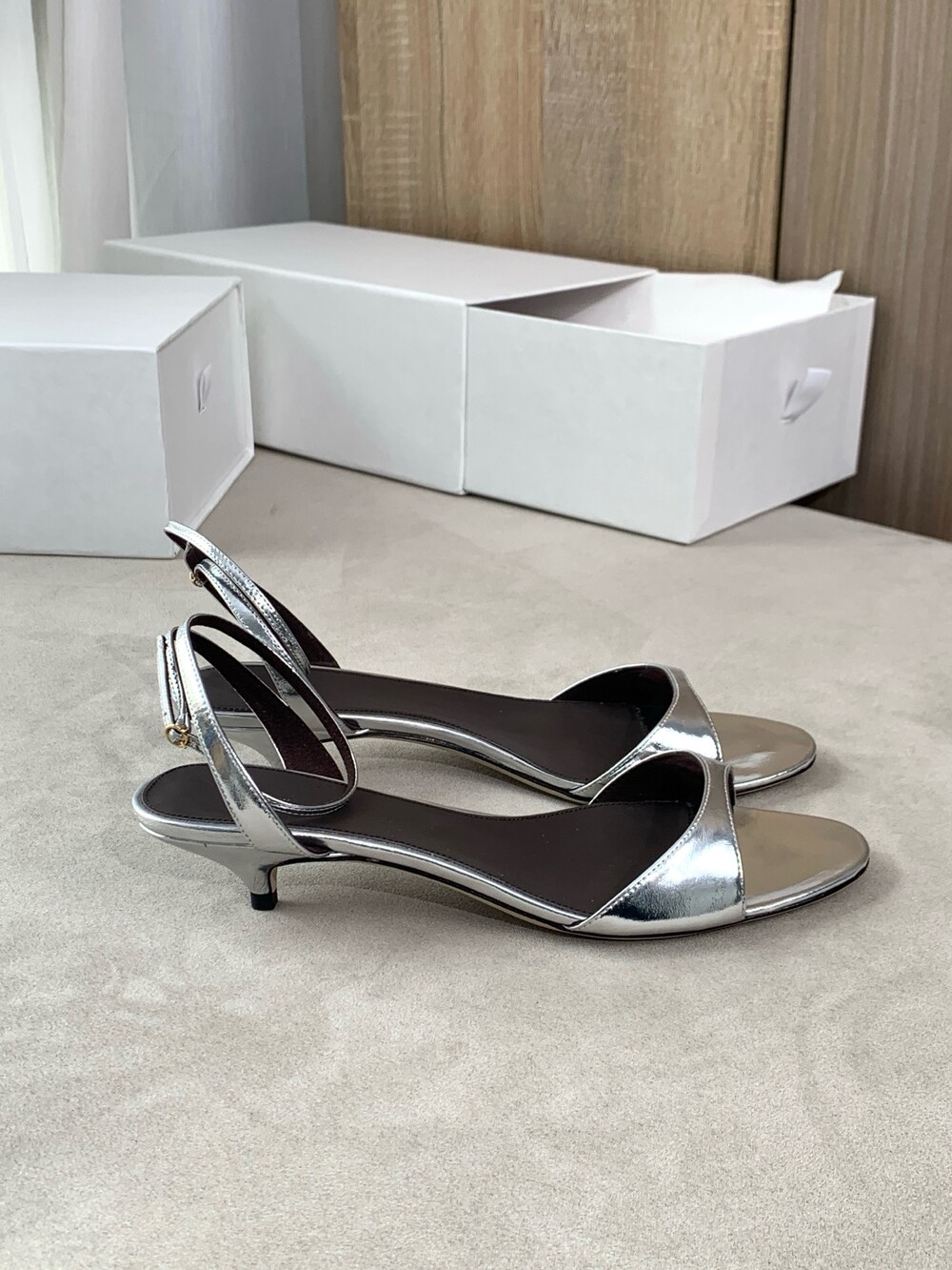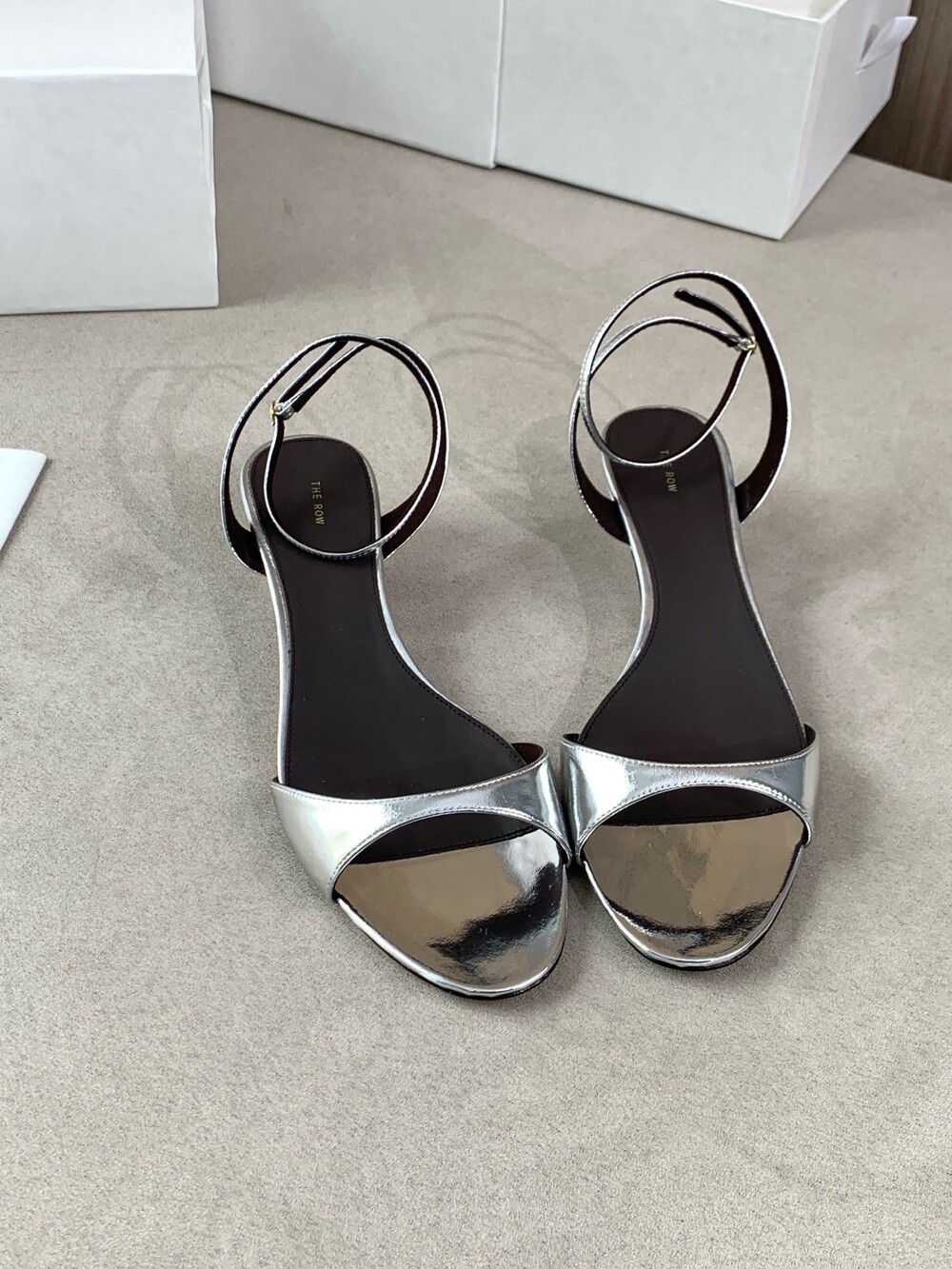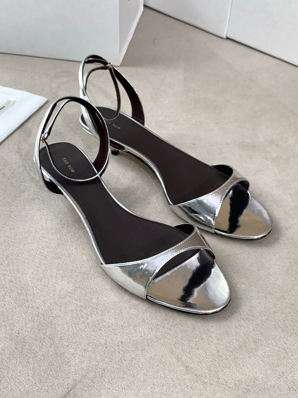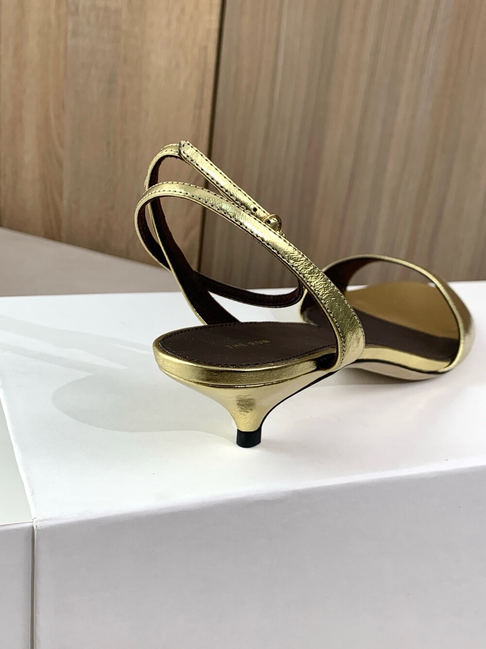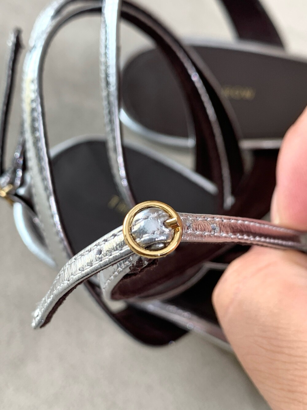 부드러운 램스킨 가죽 소재의 세련된 힐 샌들. 버클로 고정하는 섬세한 앵클 스트랩 및 테이퍼드 힐.