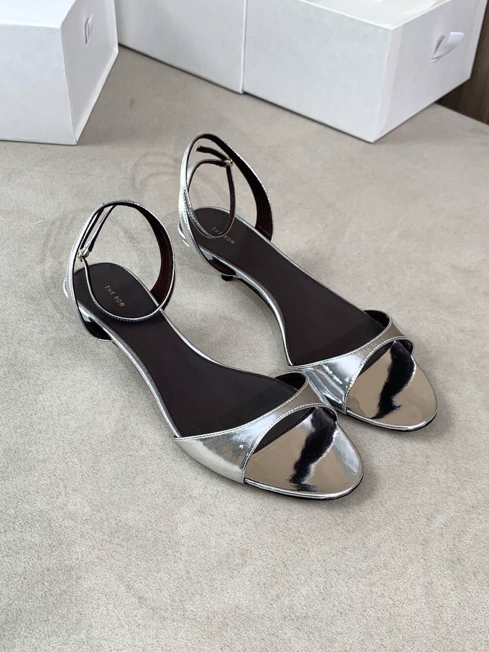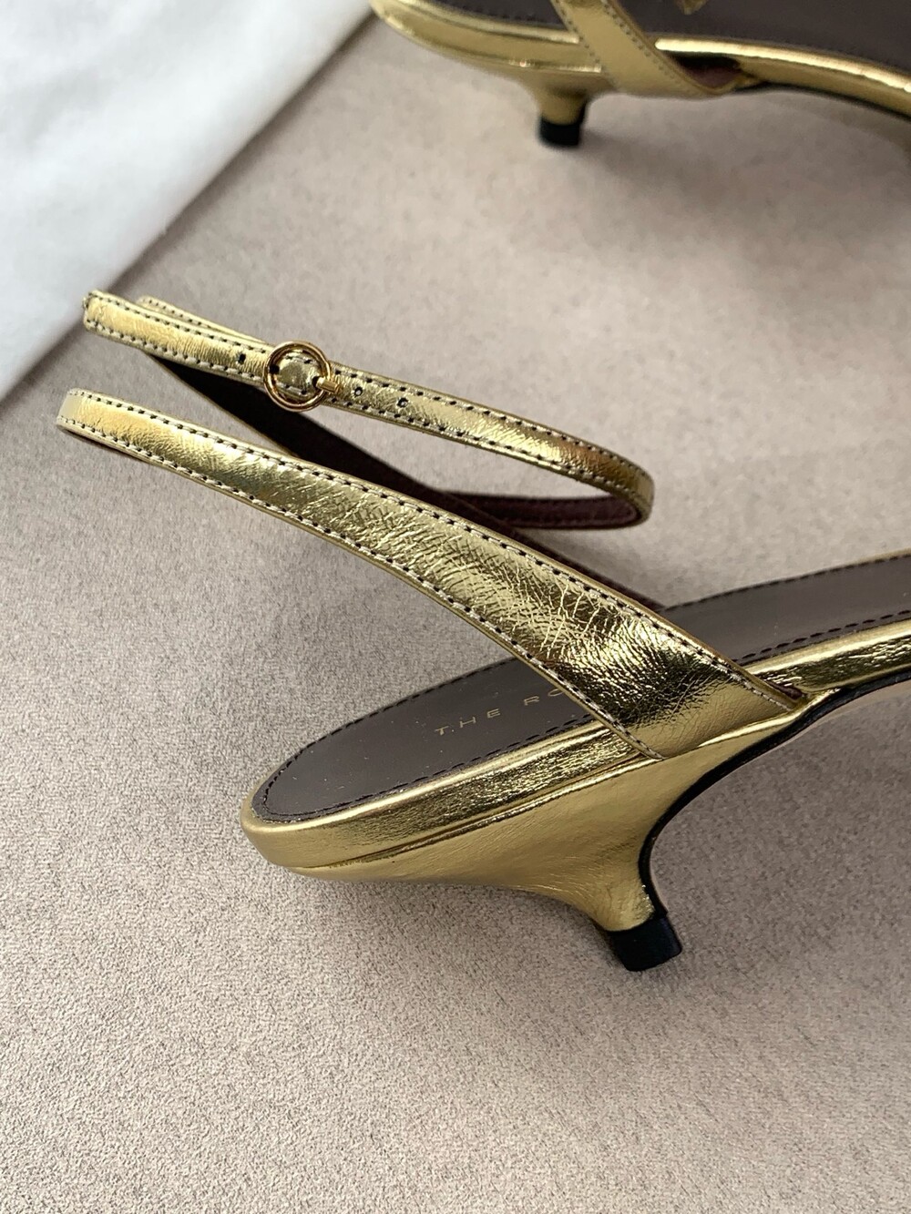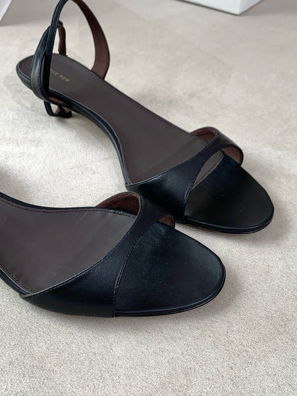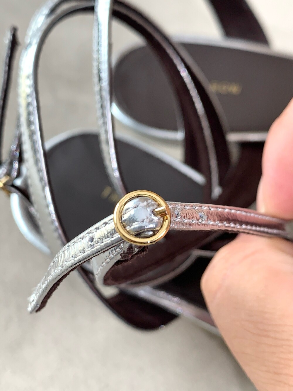 부드러운 램스킨 가죽 소재의 세련된 힐 샌들. 버클로 고정하는 섬세한 앵클 스트랩 및 테이퍼드 힐.