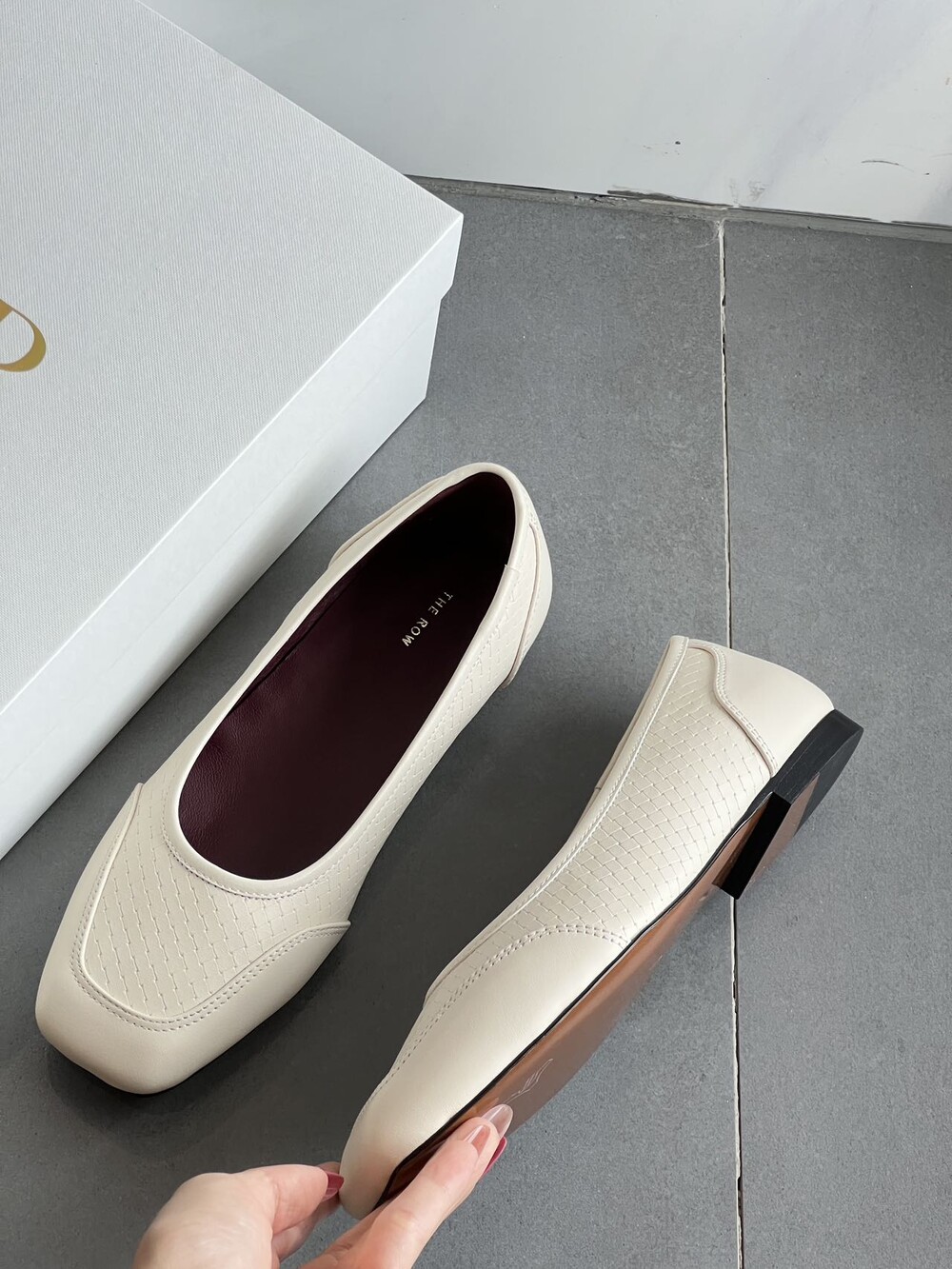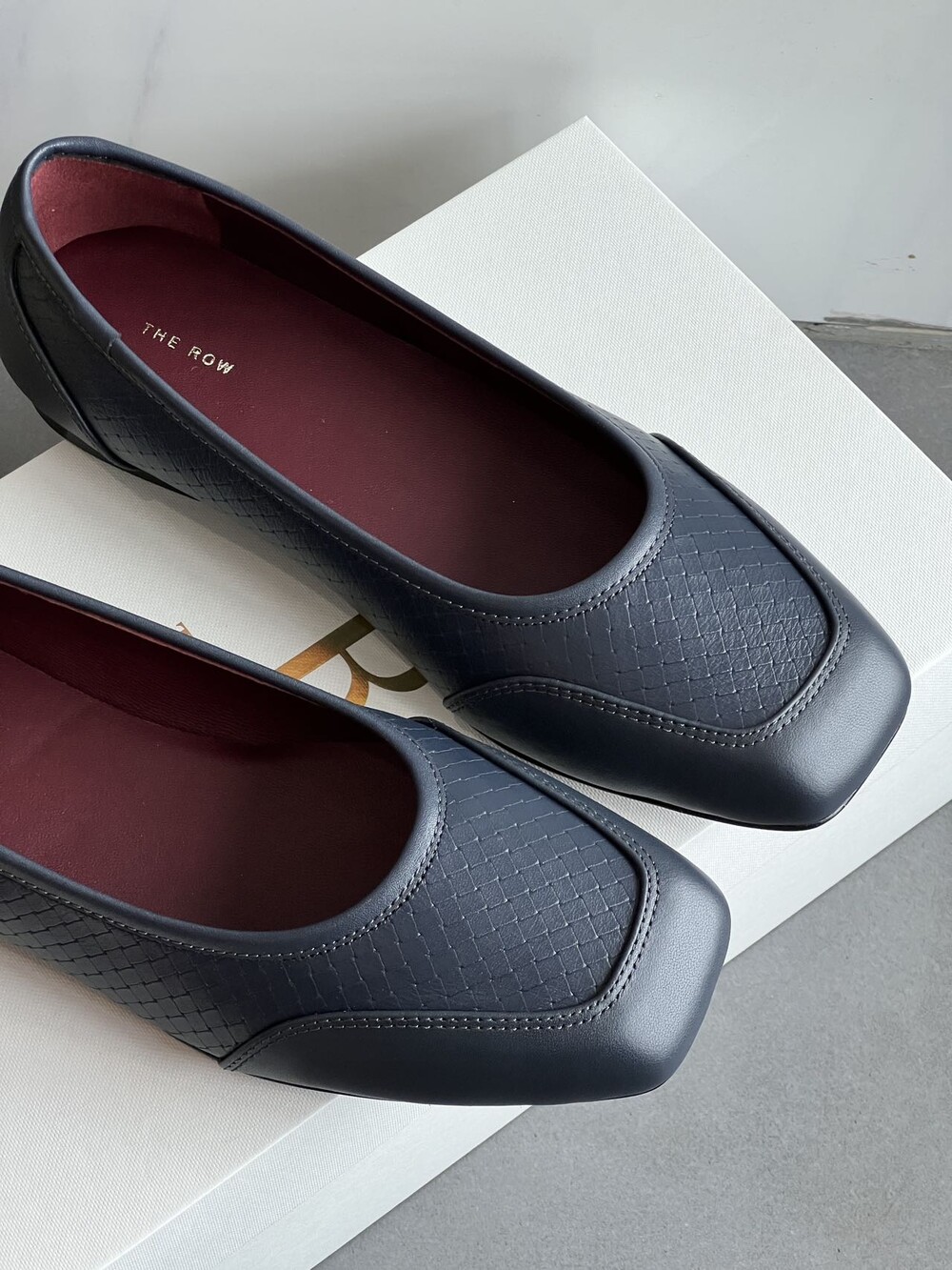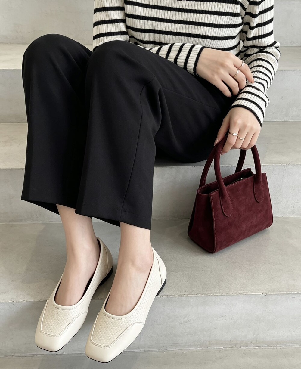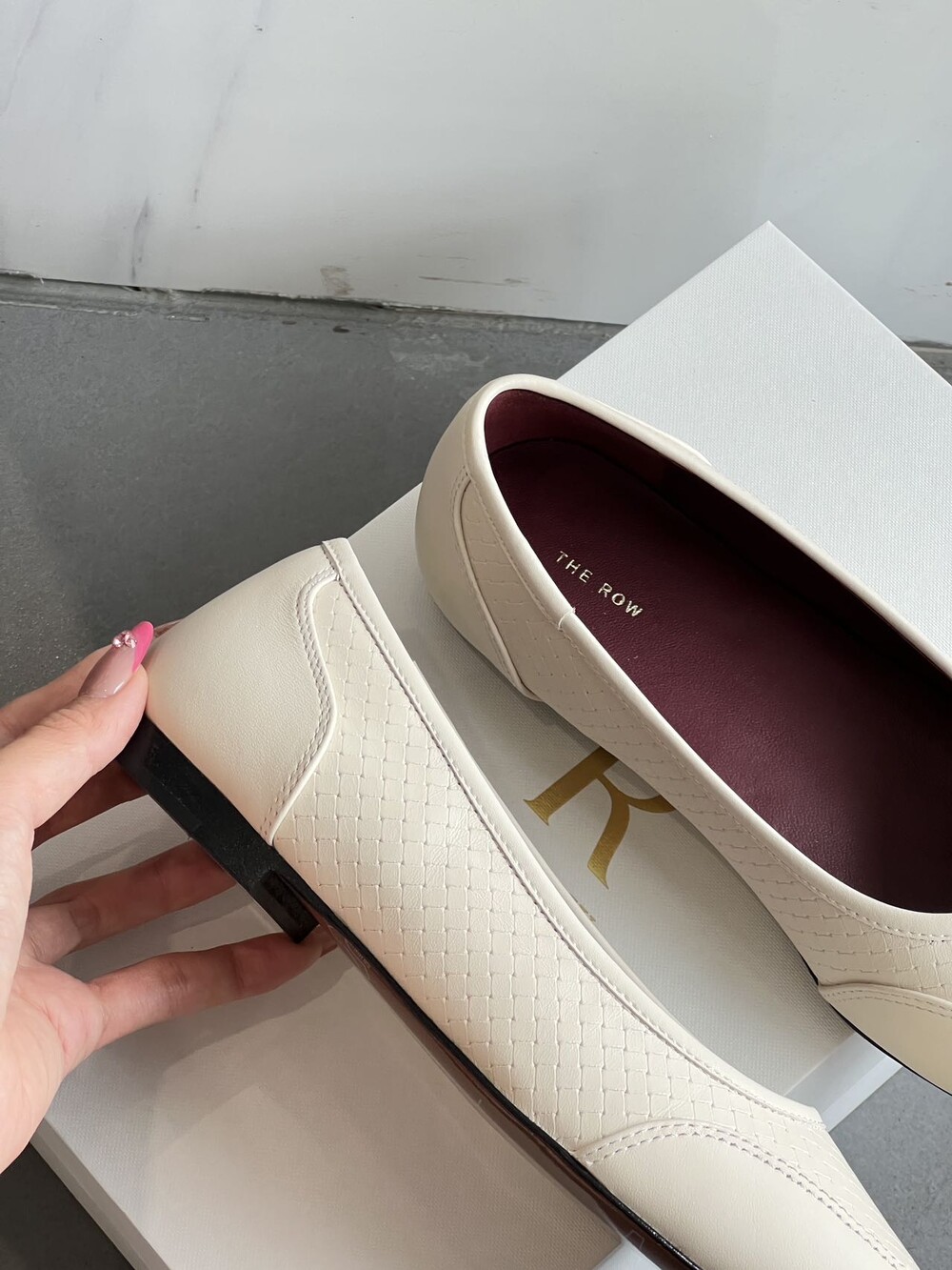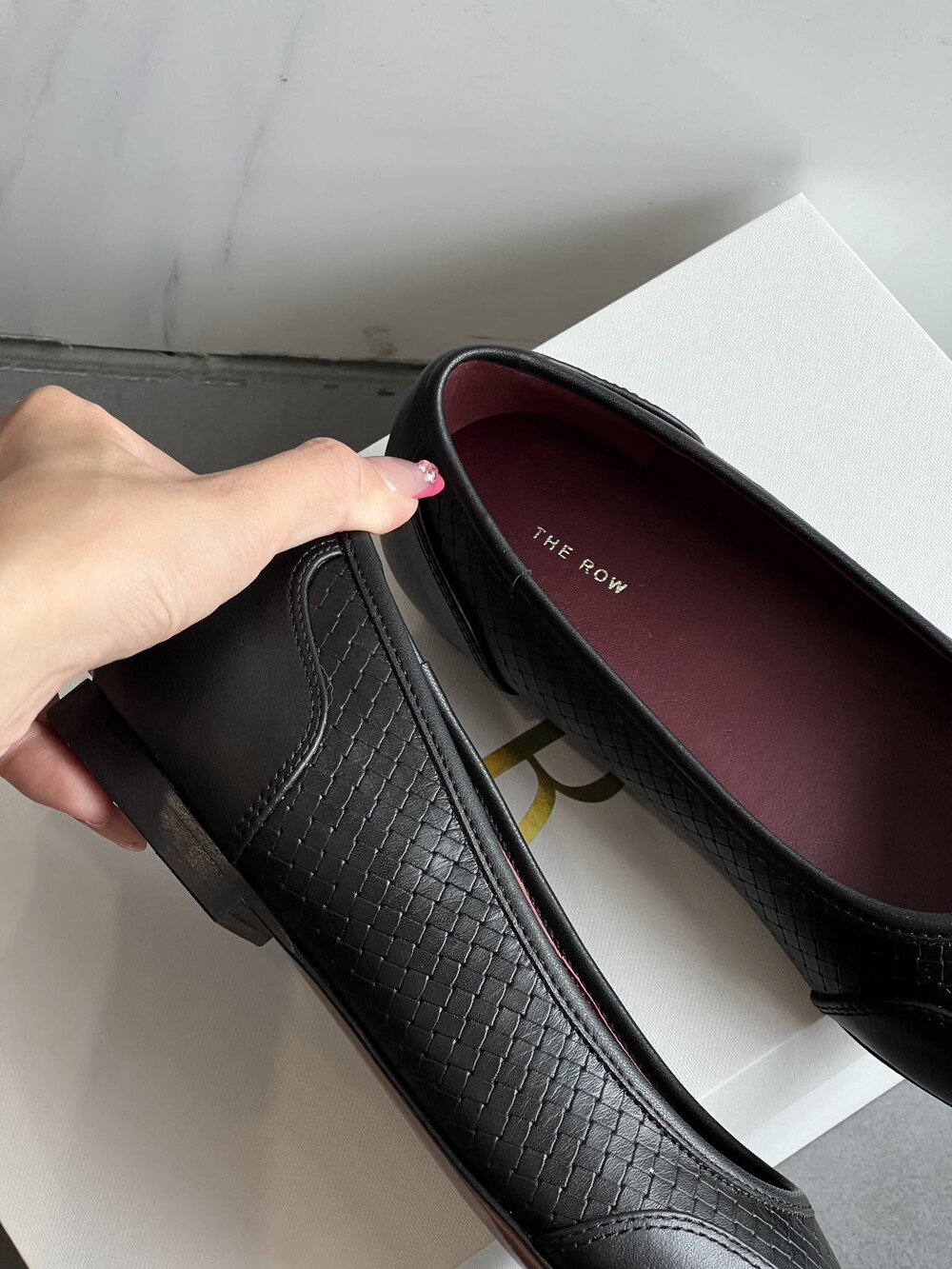 앞코와 옆면에 섬세한 마름모꼴(다이아몬드) 위빙 엠보싱 처리가 되어 있어있습니다. 밋밋한 프린팅이 아니라 입체적인 텍스처라서 디자인 포인트가 되면서도 과하지 않아, 더 로우 특유의 미니멀한 고급스러움을 느끼실 수 있습니다.