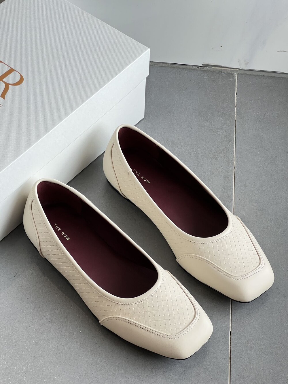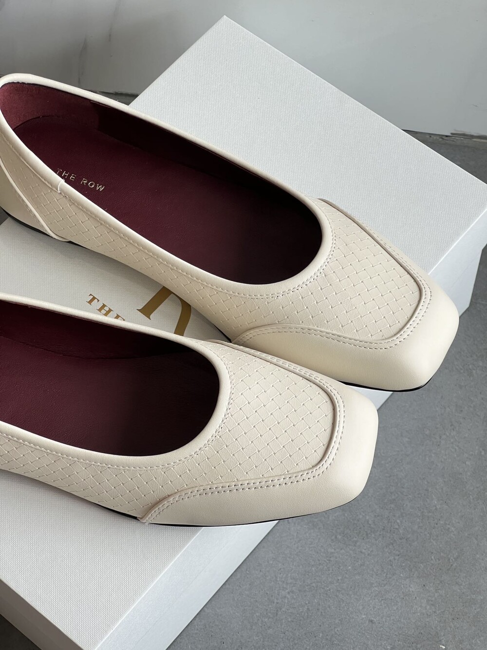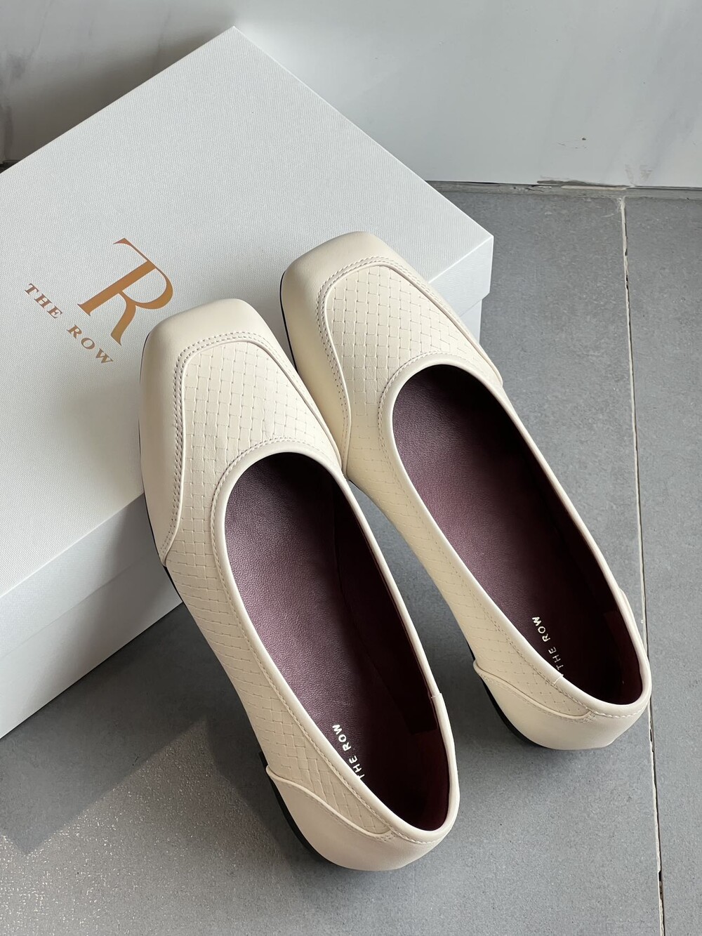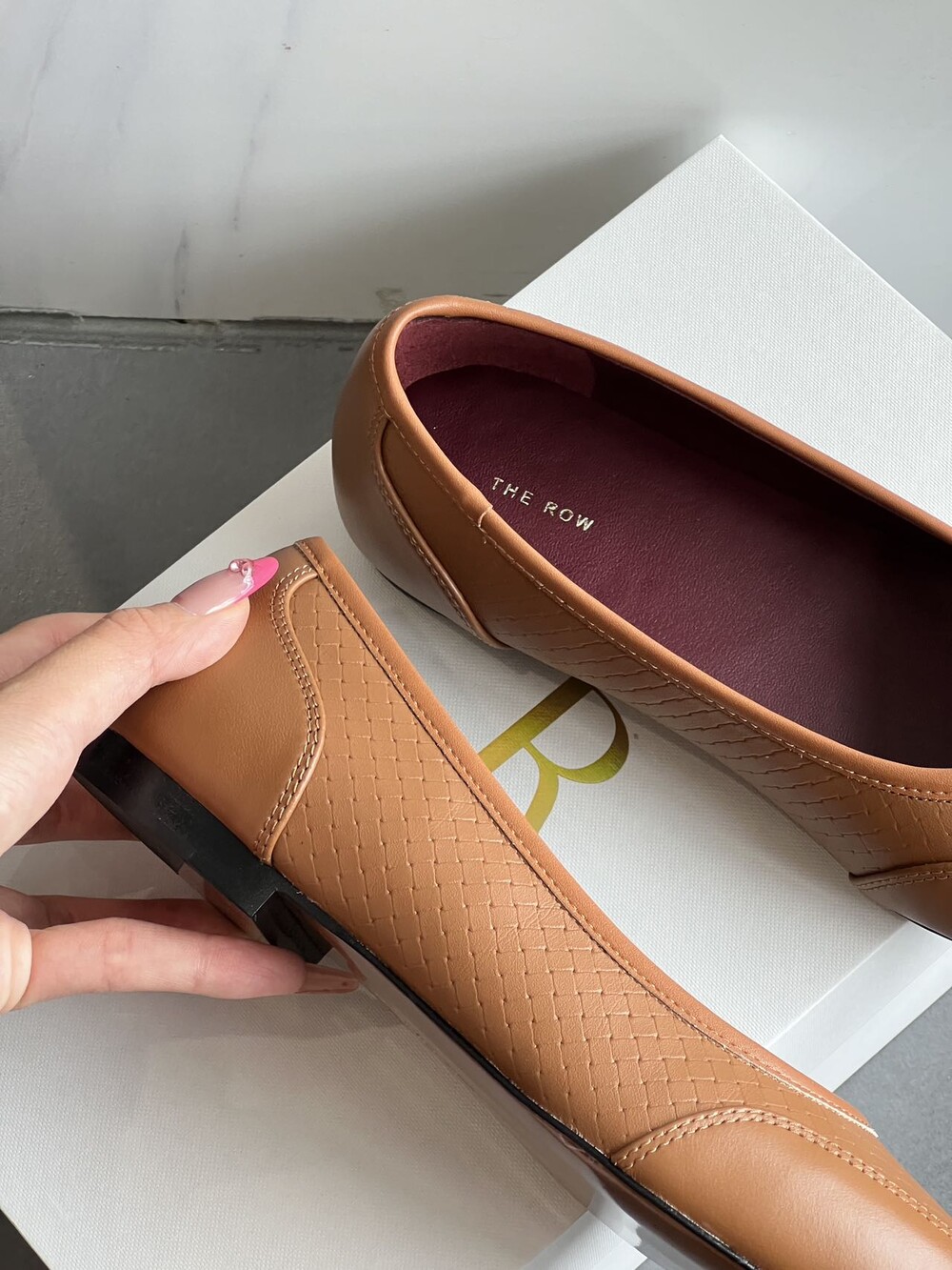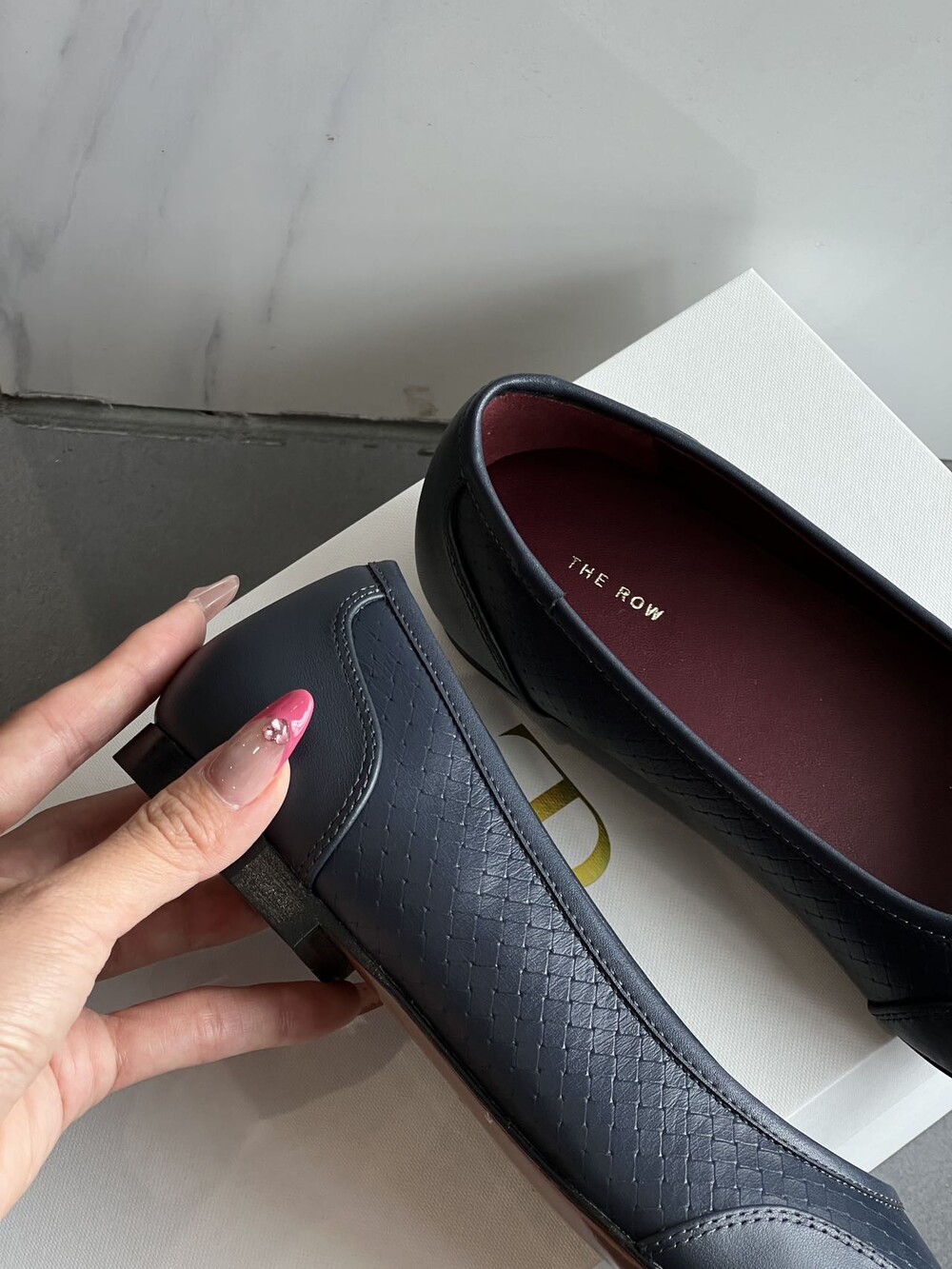 앞코와 옆면에 섬세한 마름모꼴(다이아몬드) 위빙 엠보싱 처리가 되어 있어있습니다. 밋밋한 프린팅이 아니라 입체적인 텍스처라서 디자인 포인트가 되면서도 과하지 않아, 더 로우 특유의 미니멀한 고급스러움을 느끼실 수 있습니다.