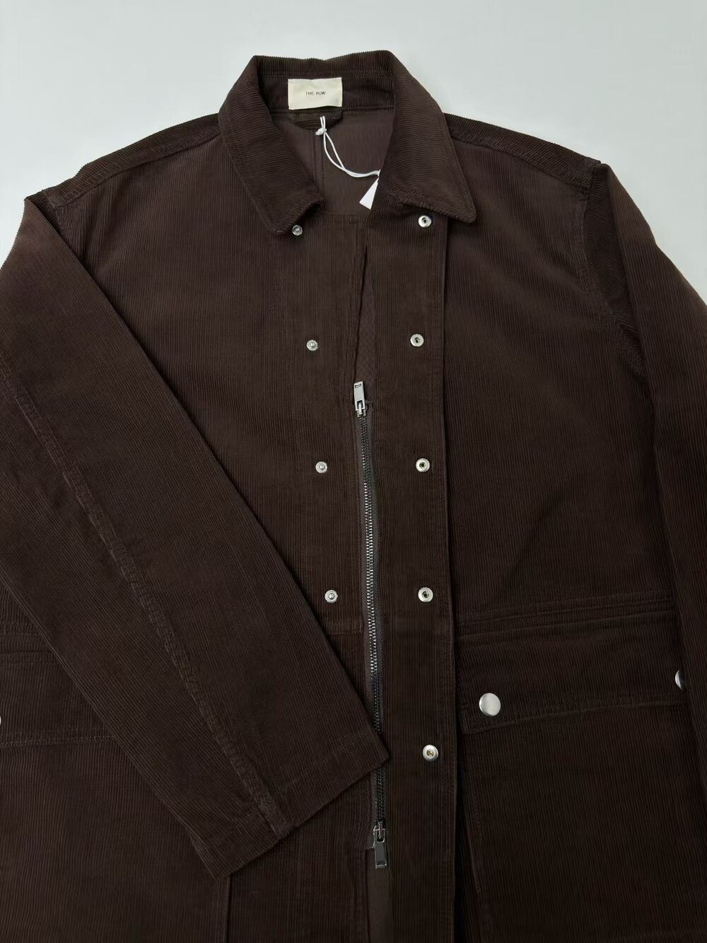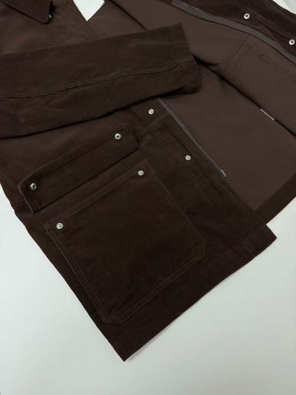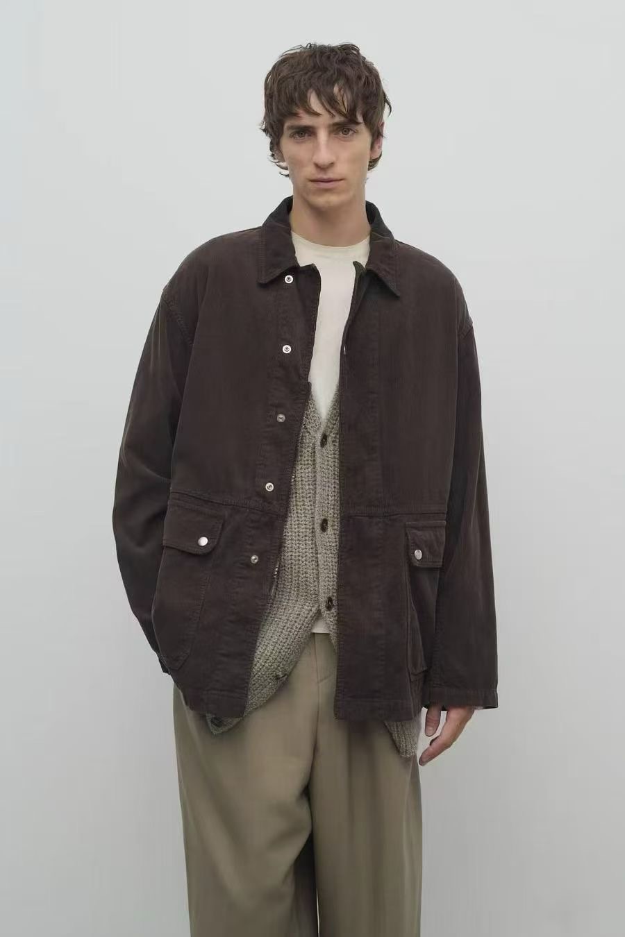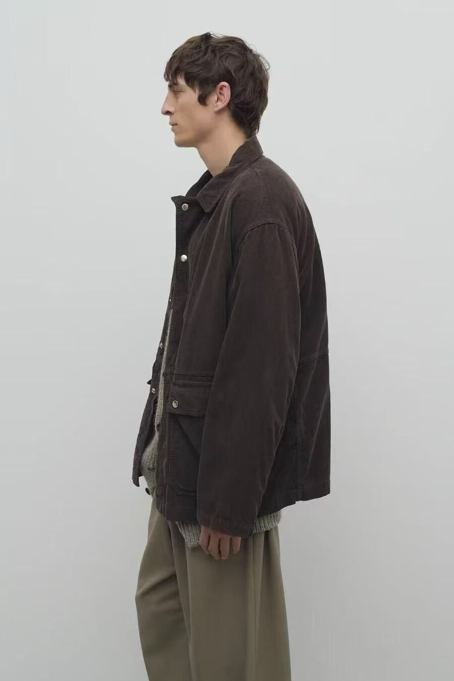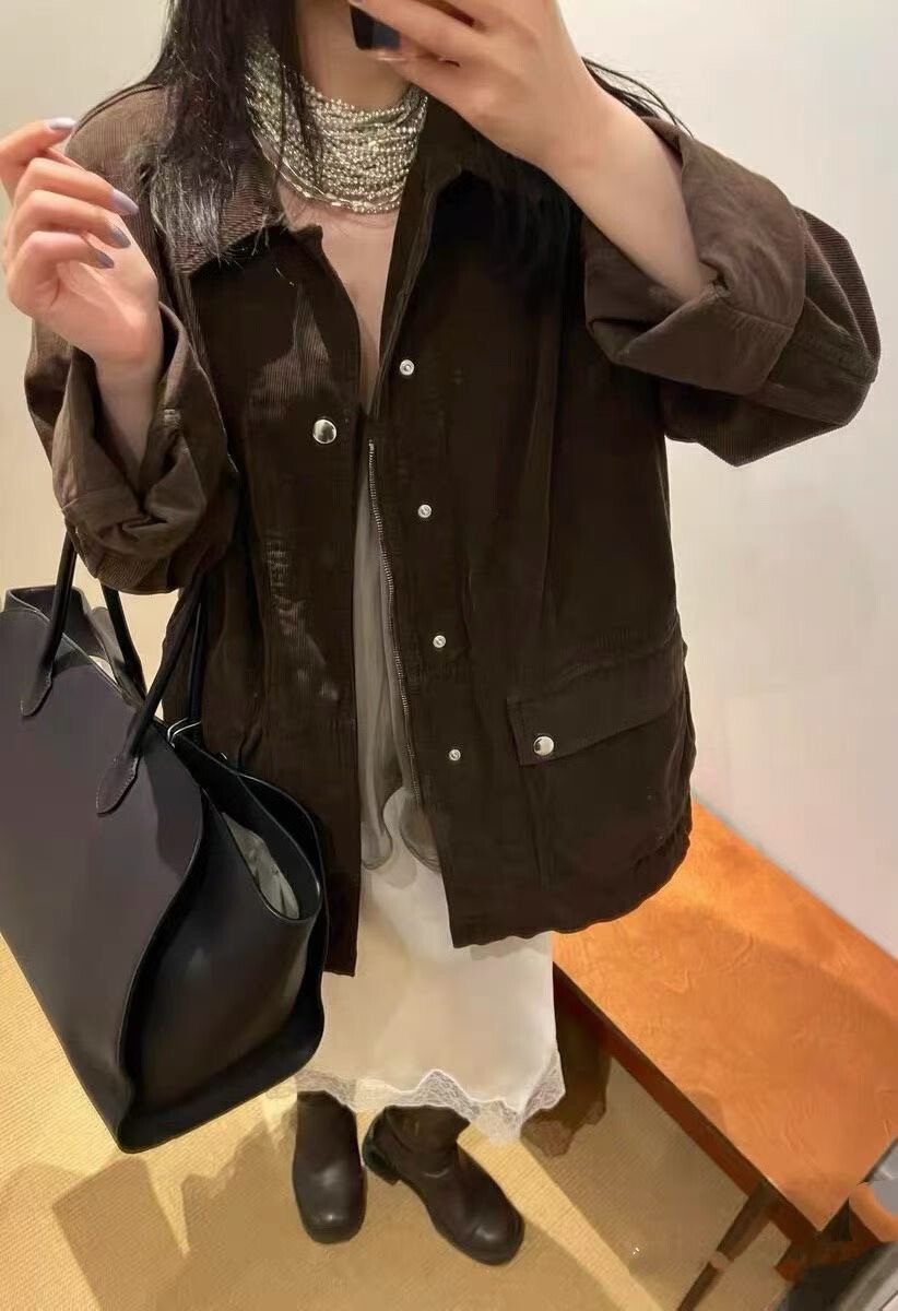 일본산 코튼 코듀로이 소재로 제작된 아웃도어 재킷으로, 앞면에 패치 포켓이 있으며 스냅 버튼과 지퍼로 여닫는 히든 플래킷(덮개 여밈) 디테일이 적용되어 있습니다.
