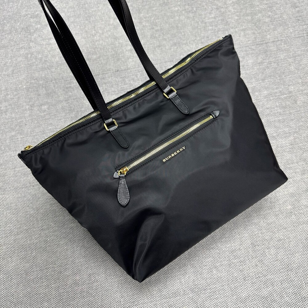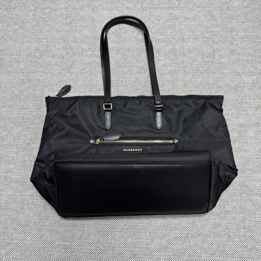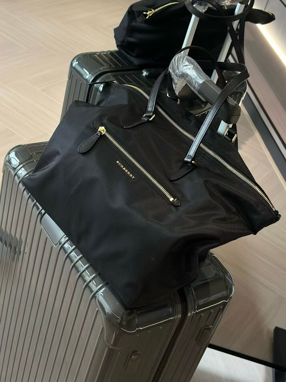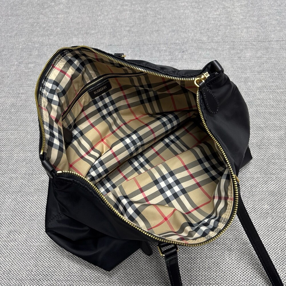 나일론 소재의 위켄드 토트 백. 버버리 체크 트윌 소재로 안감 처리되었으며, 가죽 손잡이 및 금속 로고 디테일이 특징.