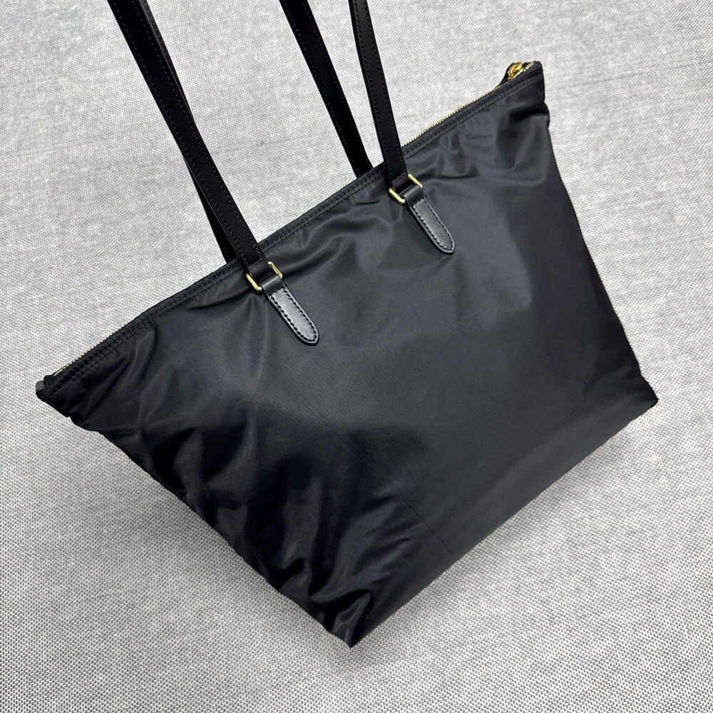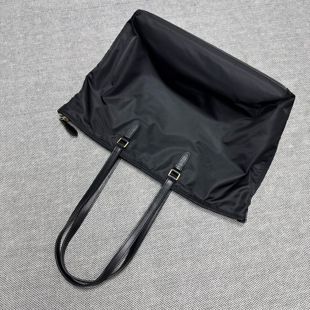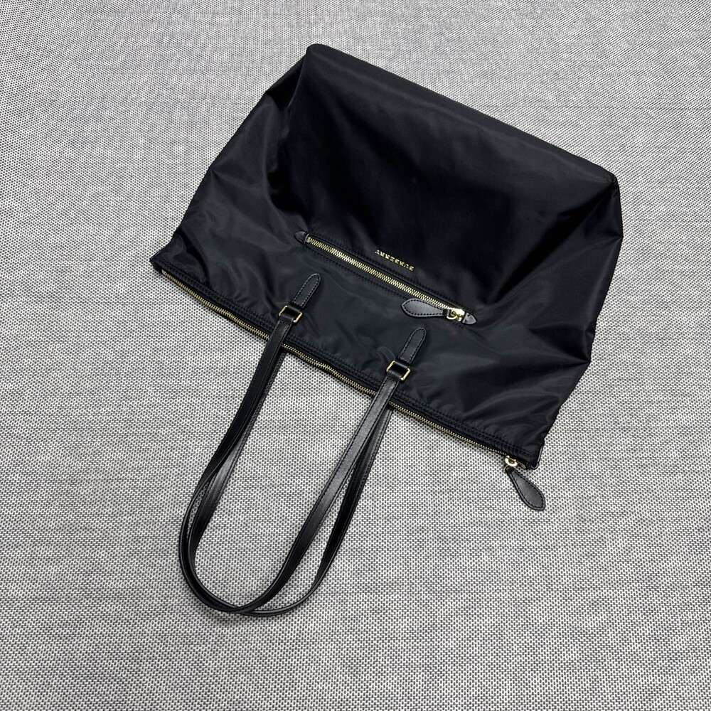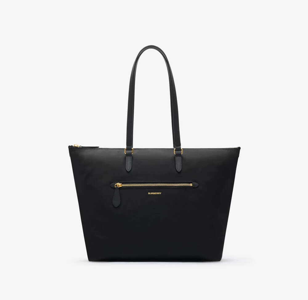 나일론 소재의 위켄드 토트 백. 버버리 체크 트윌 소재로 안감 처리되었으며, 가죽 손잡이 및 금속 로고 디테일이 특징.
