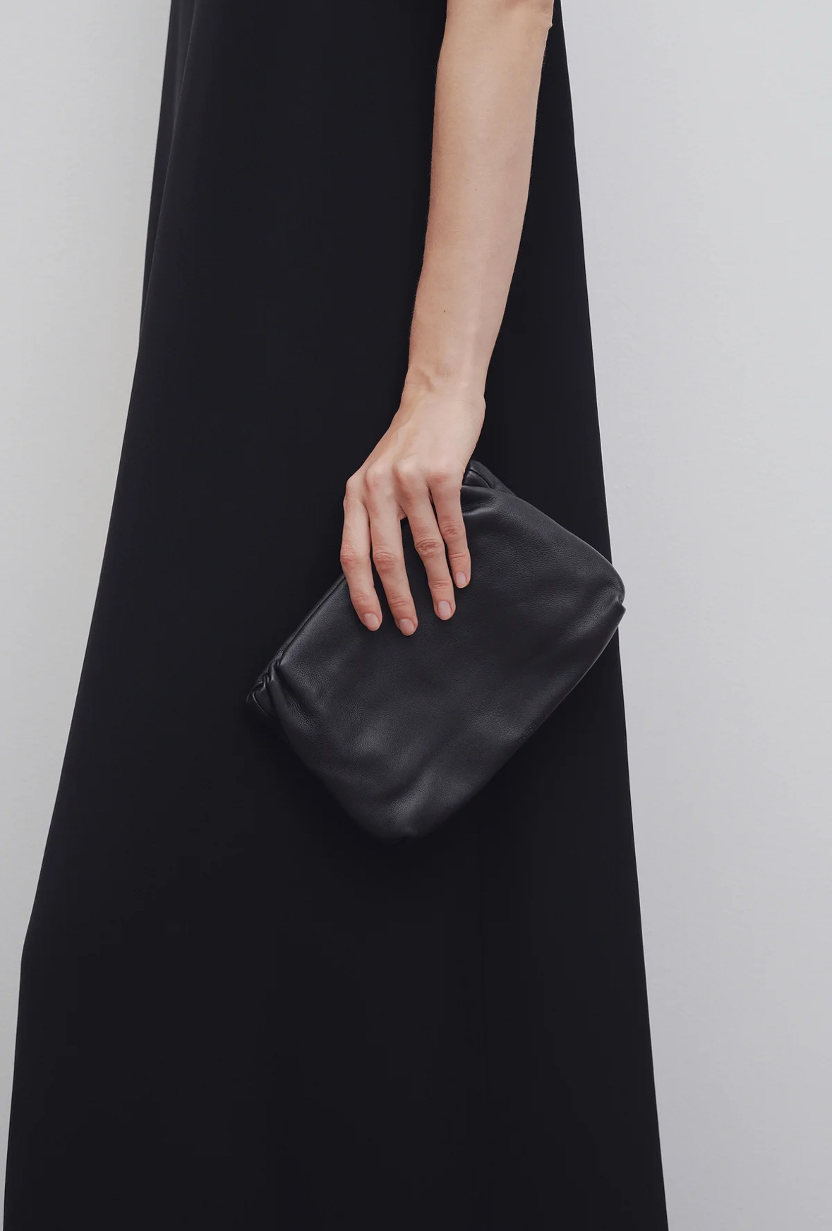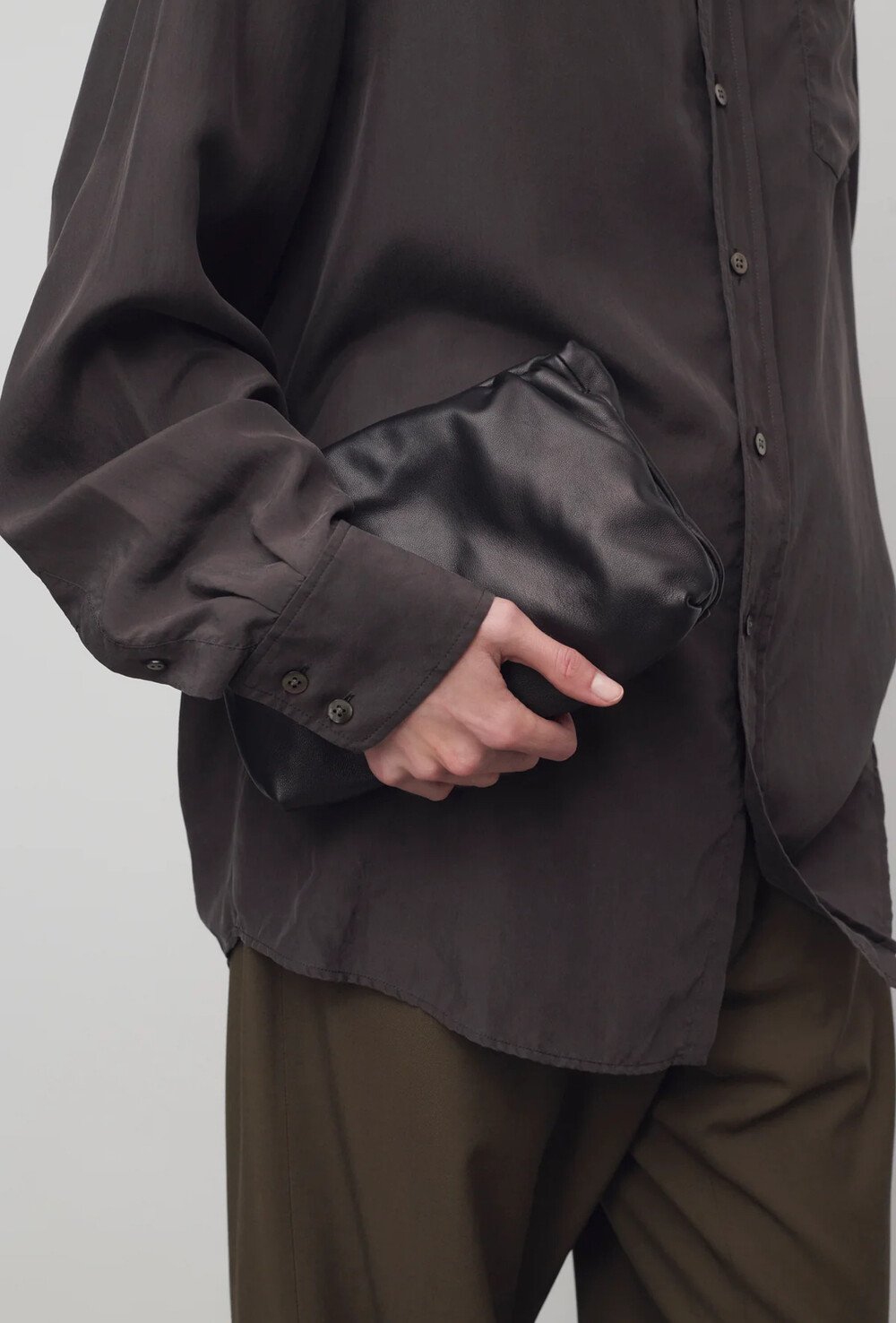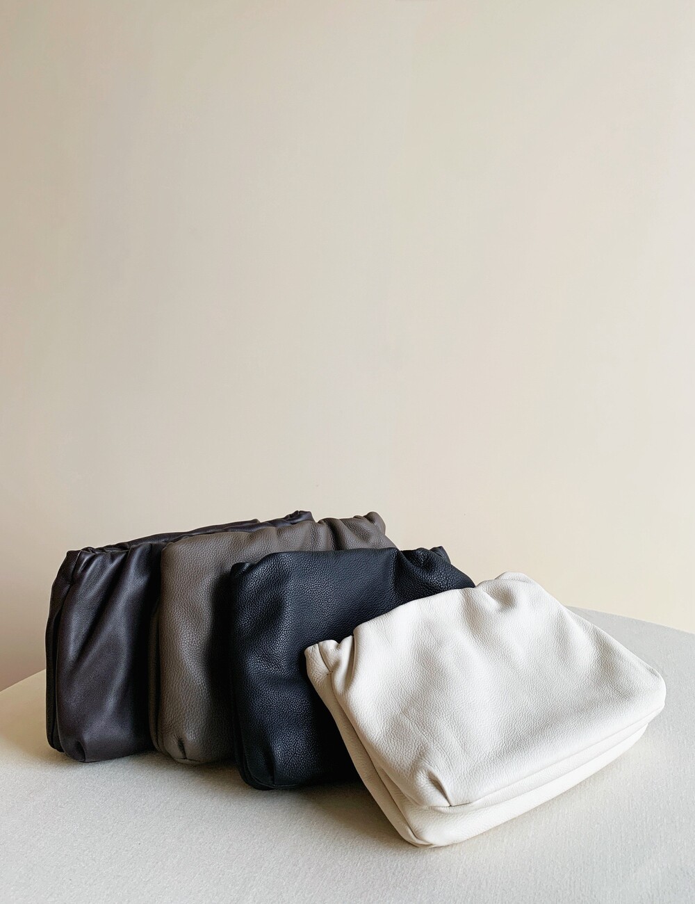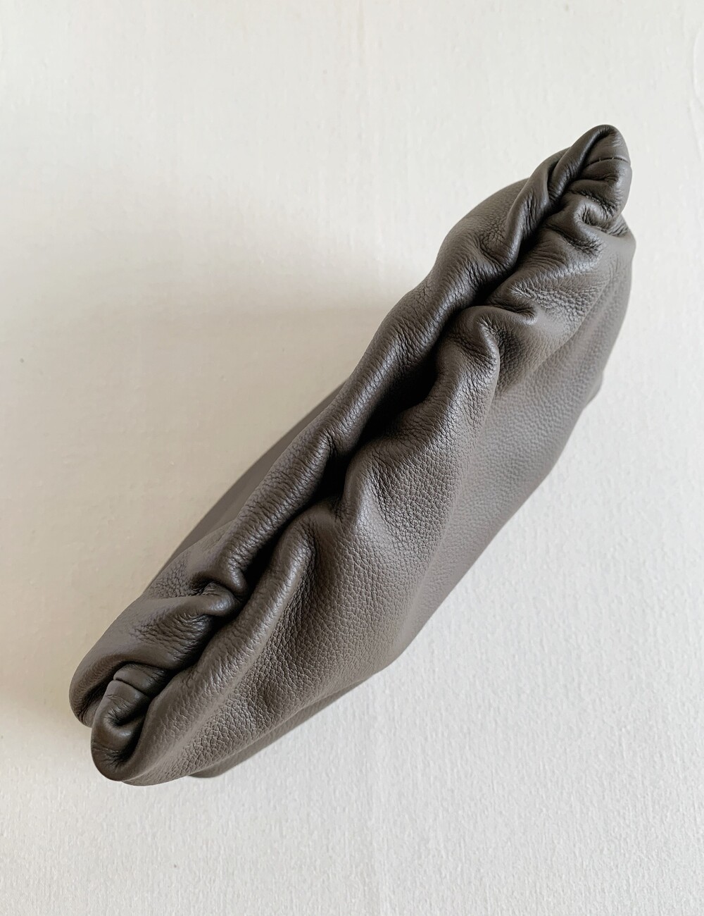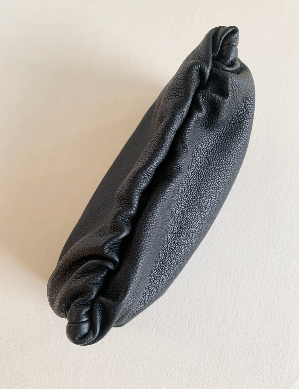 감춰진 조절식 숄더 스트랩과 힌지 프레임 클로저를 갖춘 세련되게 그레인 마감된 송아지 가죽 소재의 주름 마감 클러치. 버터처럼 부드러운 감촉과 은은한 광택이 특징인 이 가죽은 유연한 질감과 세련된 마감을 제공합니다.