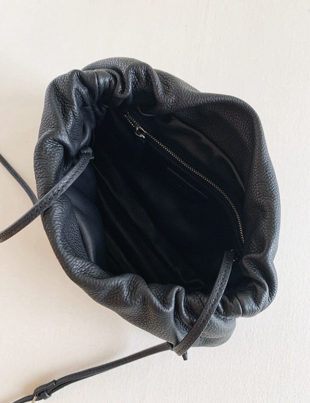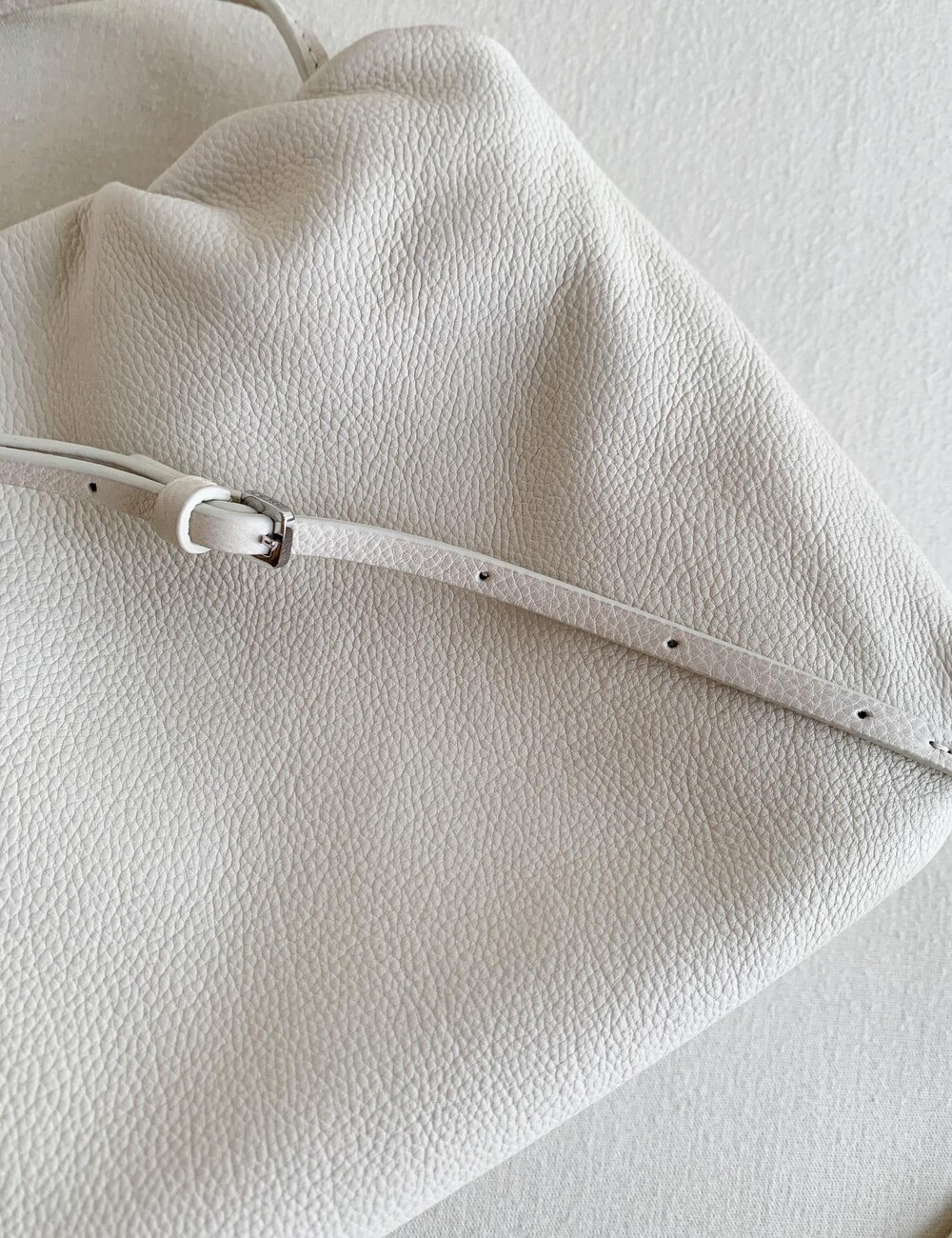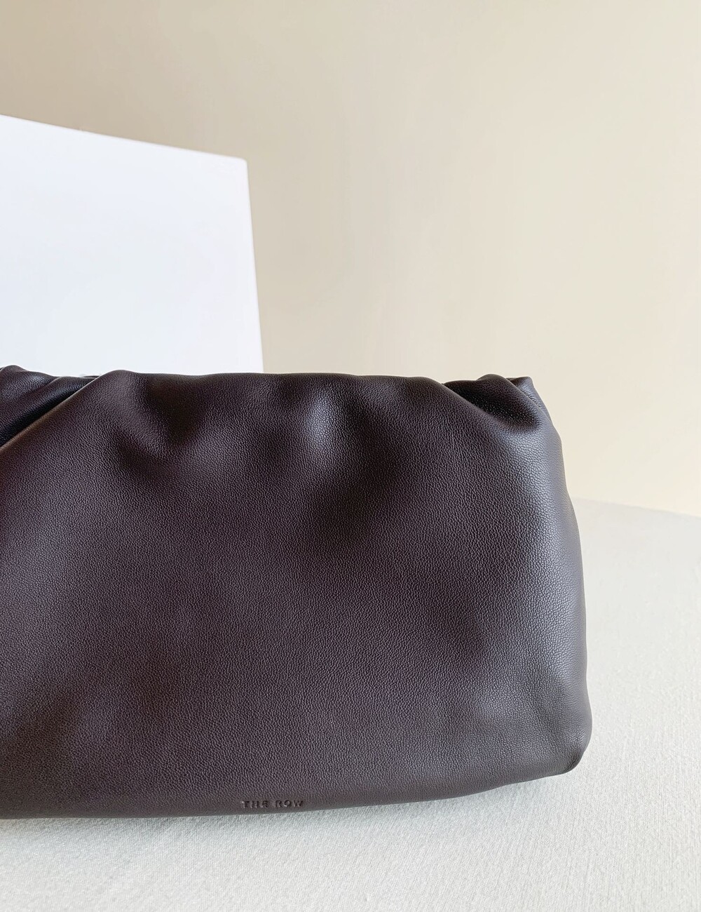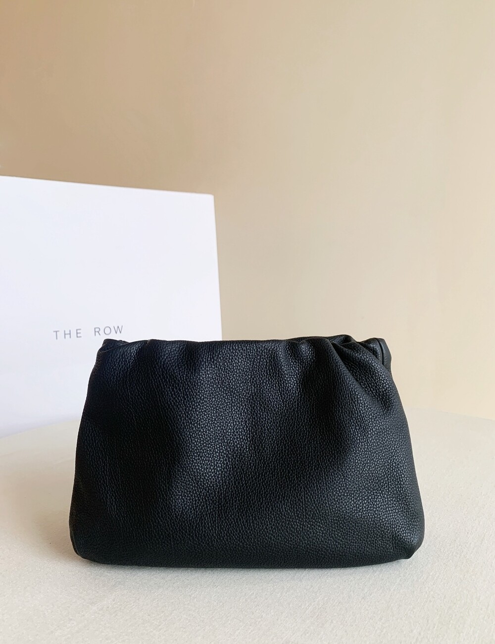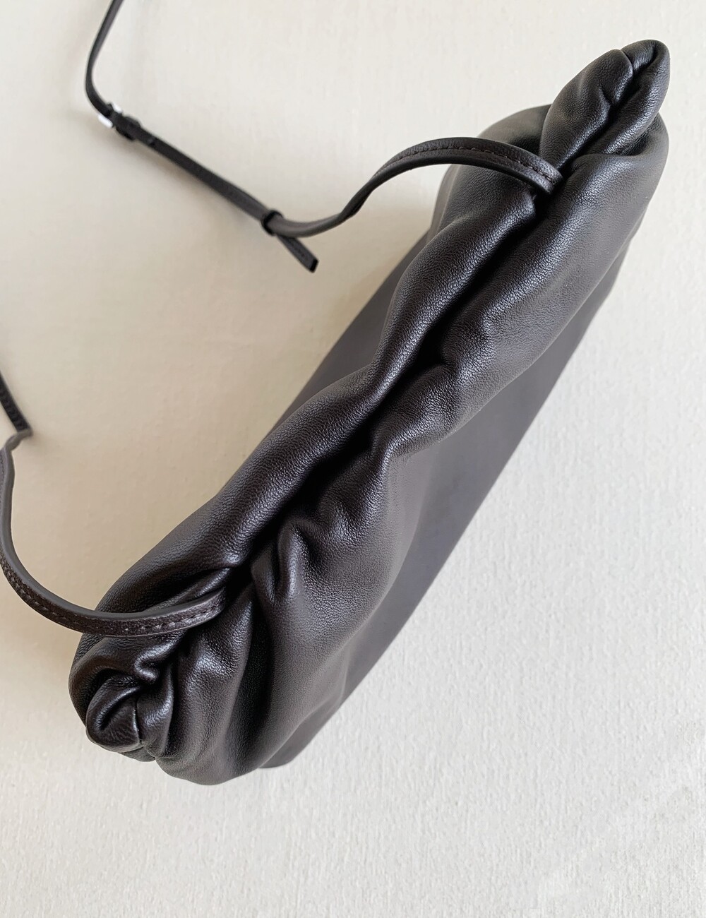 감춰진 조절식 숄더 스트랩과 힌지 프레임 클로저를 갖춘 세련되게 그레인 마감된 송아지 가죽 소재의 주름 마감 클러치. 버터처럼 부드러운 감촉과 은은한 광택이 특징인 이 가죽은 유연한 질감과 세련된 마감을 제공합니다.