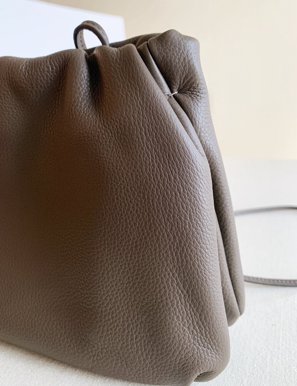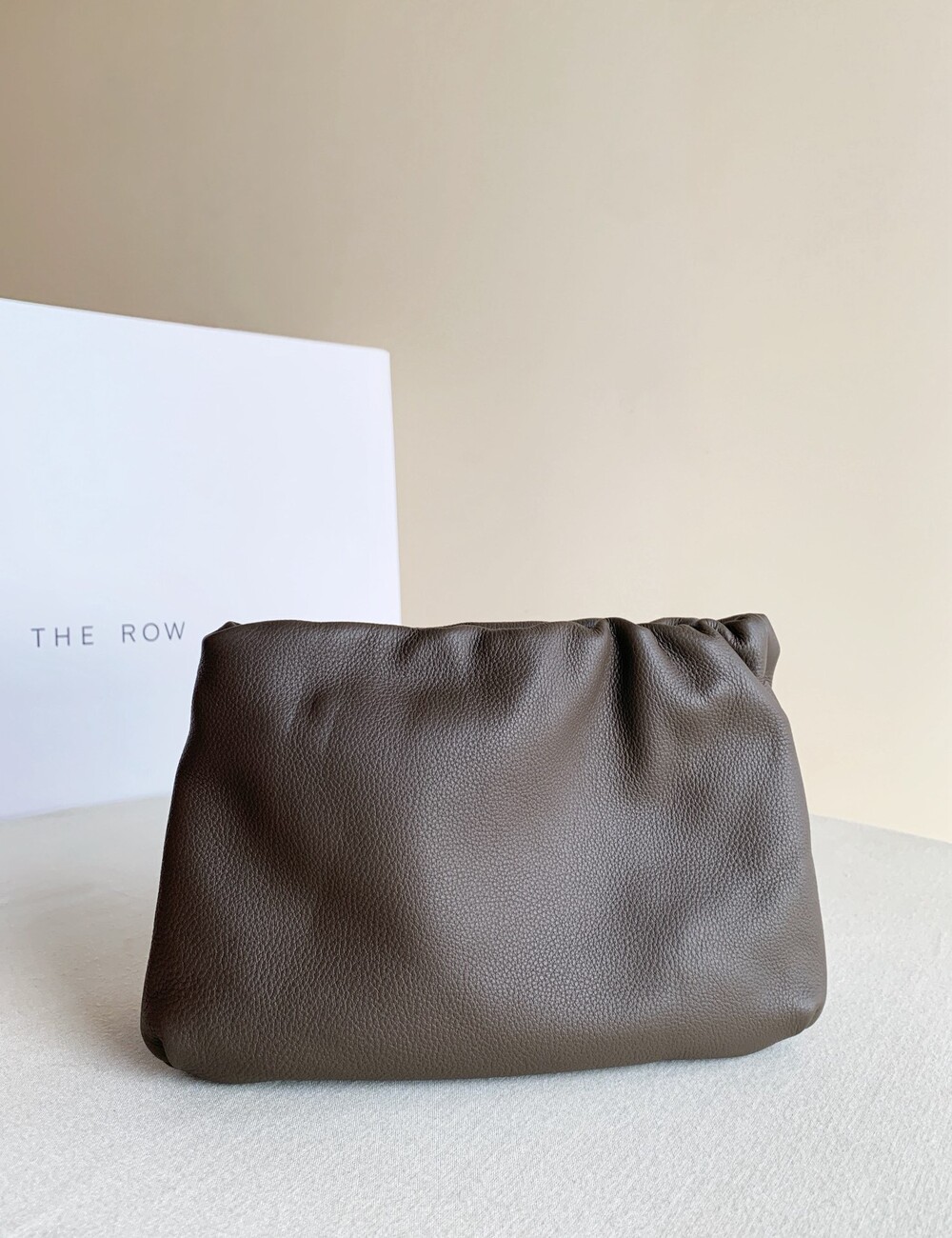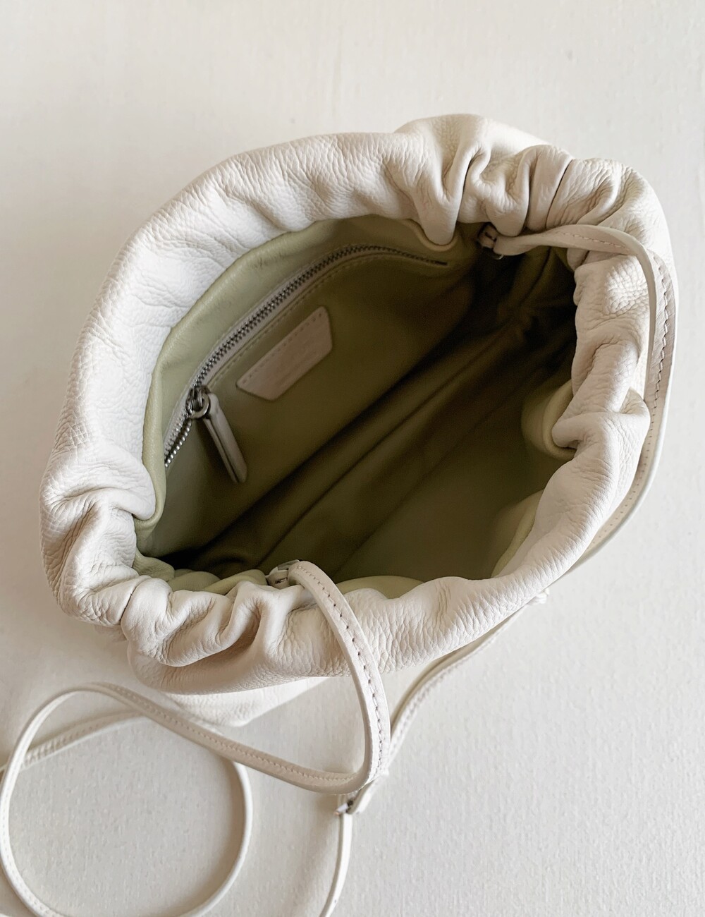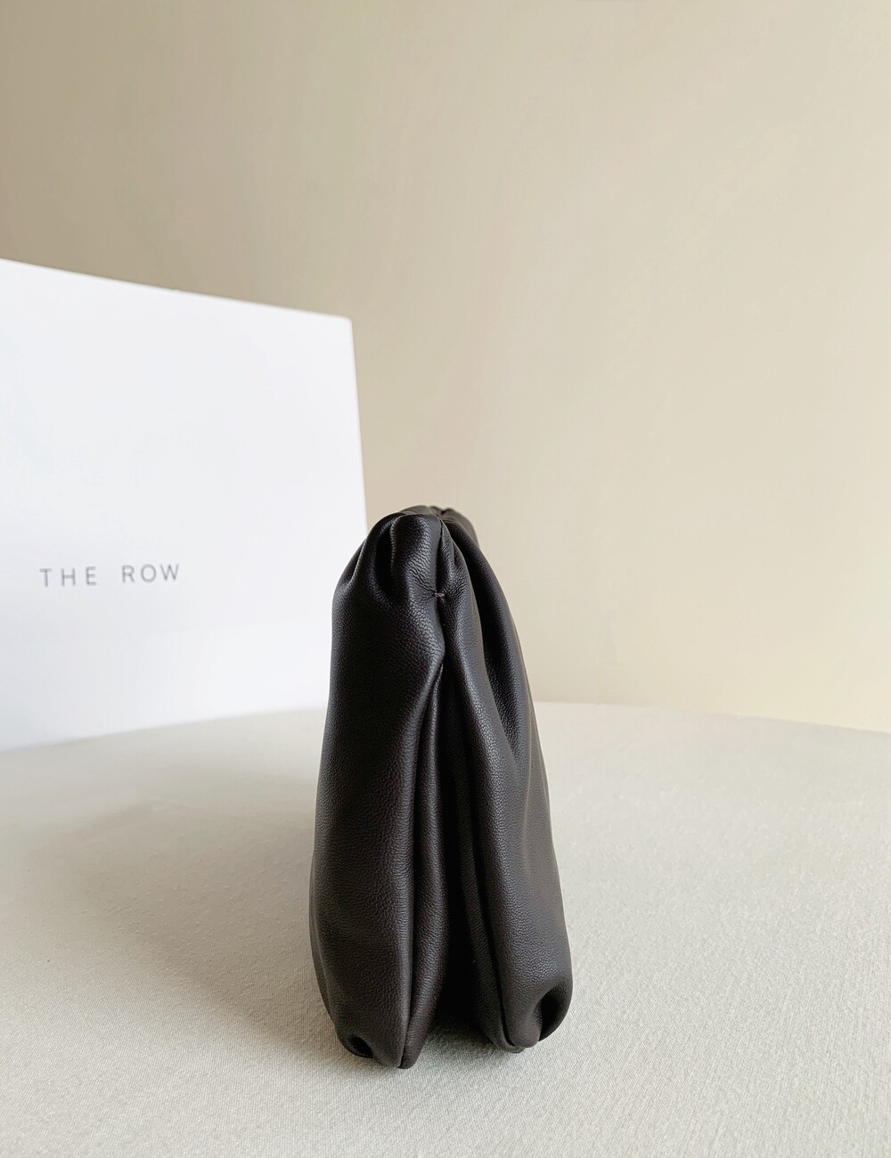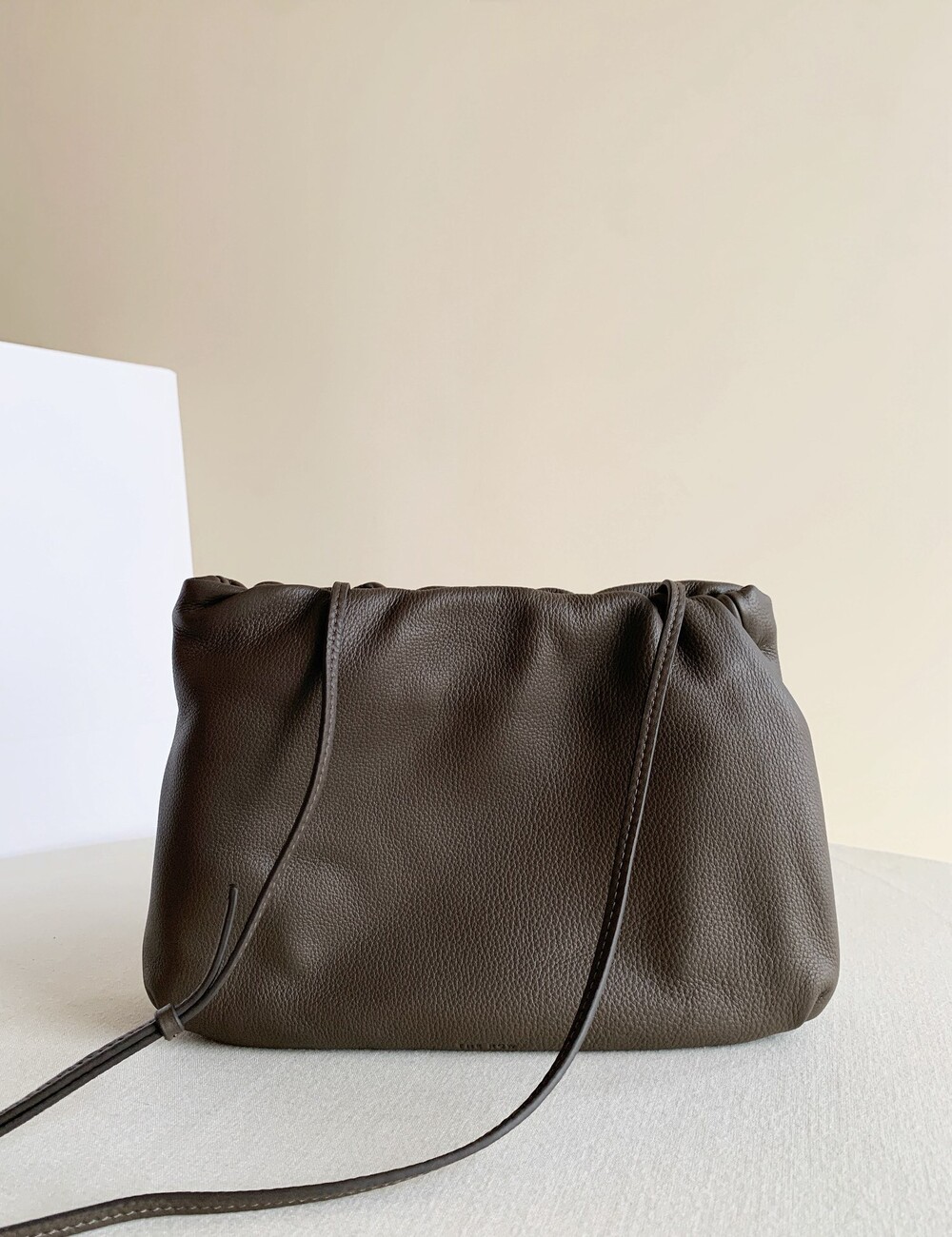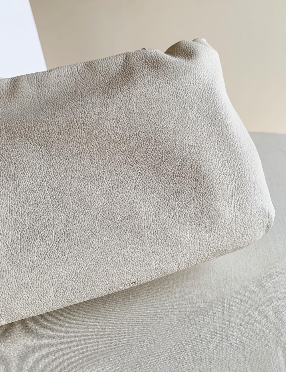 감춰진 조절식 숄더 스트랩과 힌지 프레임 클로저를 갖춘 세련되게 그레인 마감된 송아지 가죽 소재의 주름 마감 클러치. 버터처럼 부드러운 감촉과 은은한 광택이 특징인 이 가죽은 유연한 질감과 세련된 마감을 제공합니다.