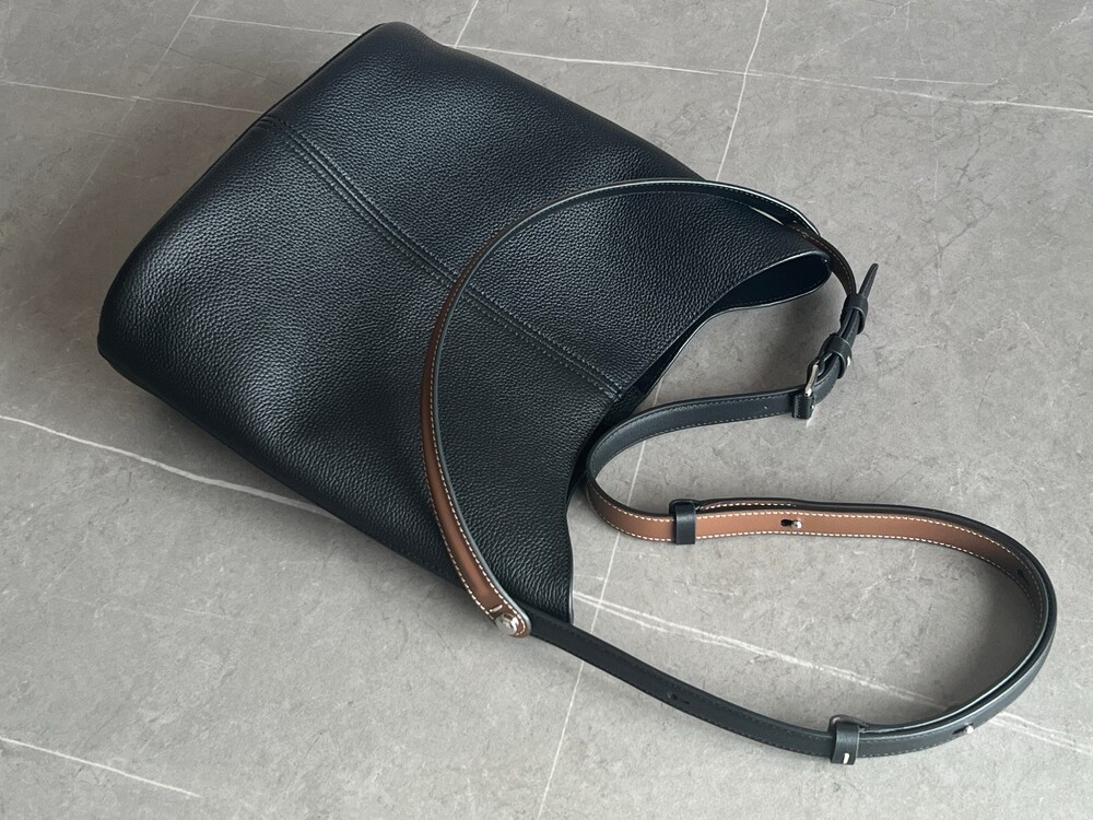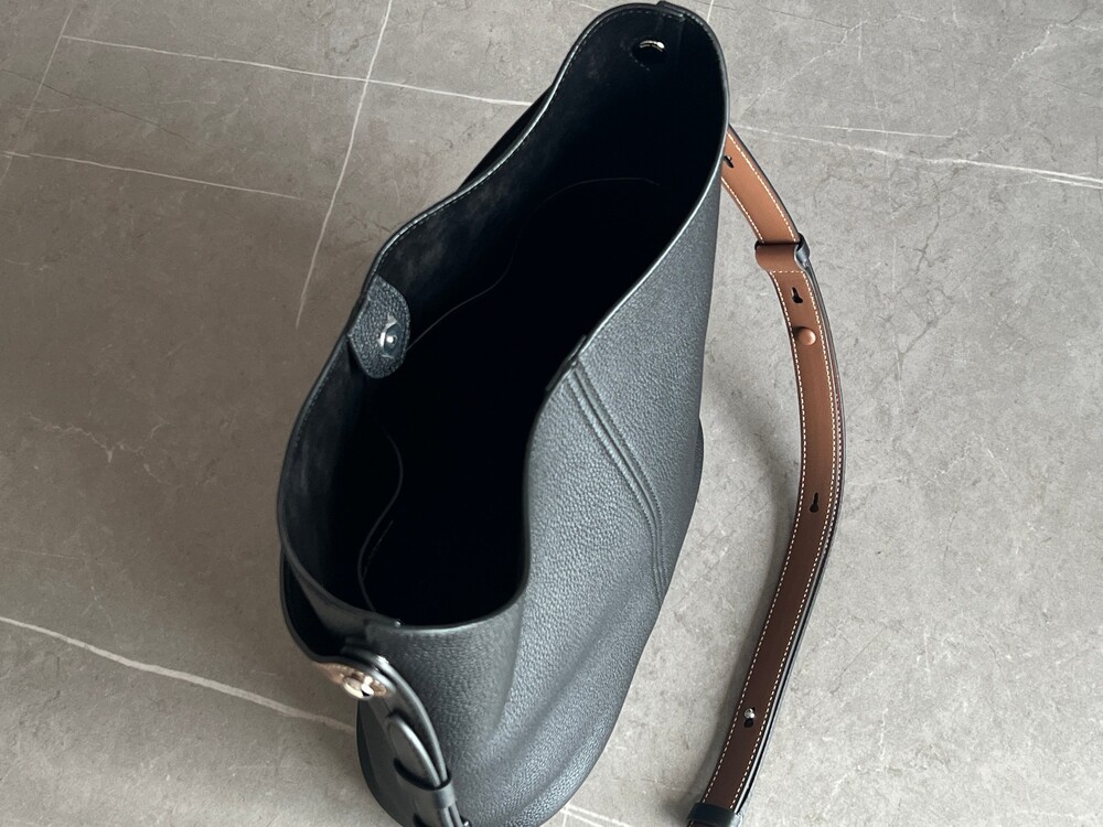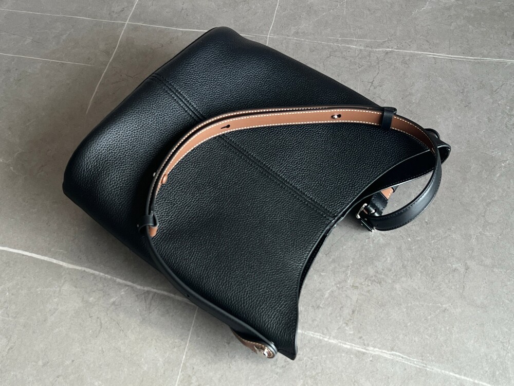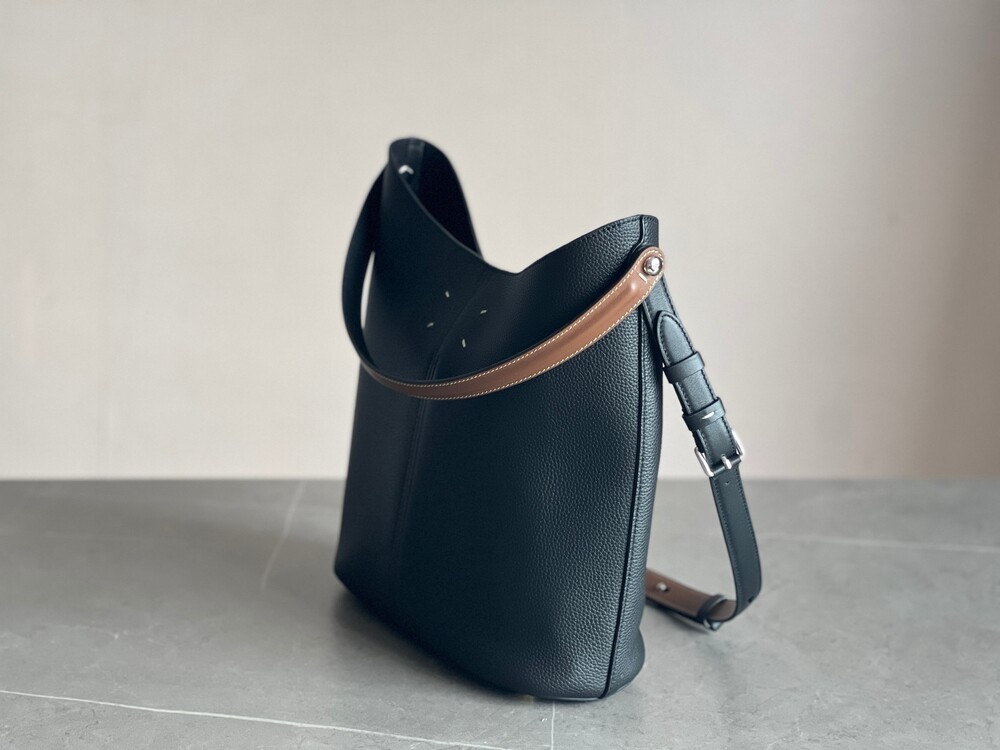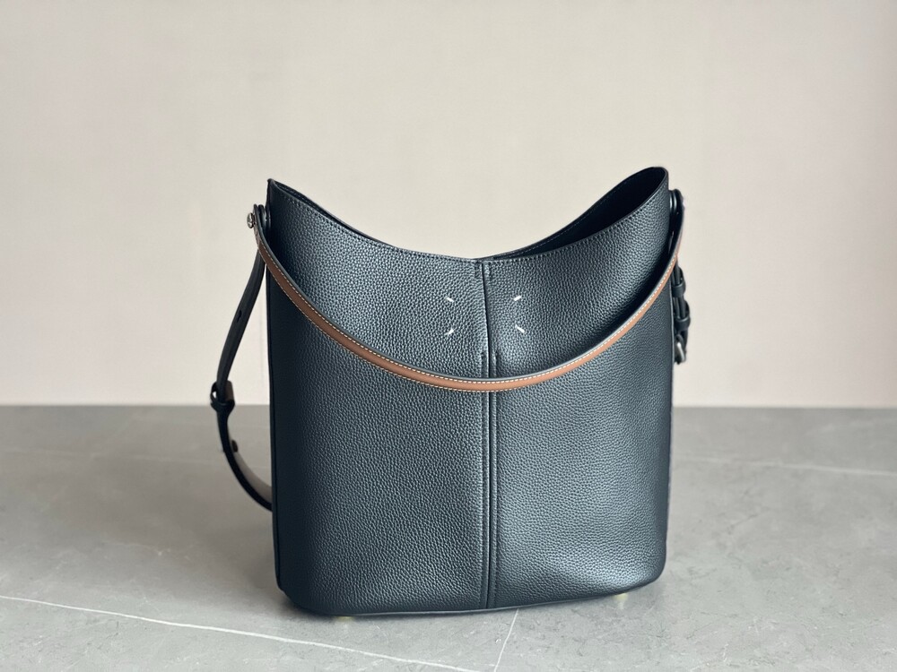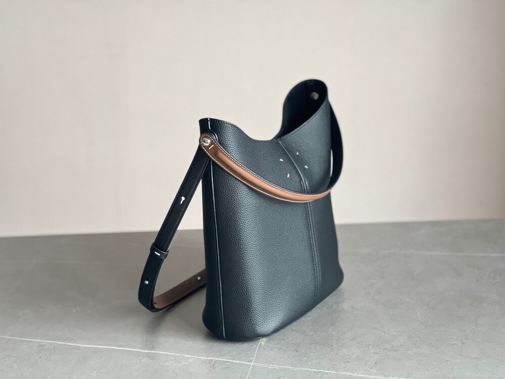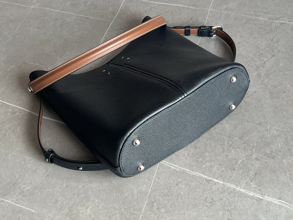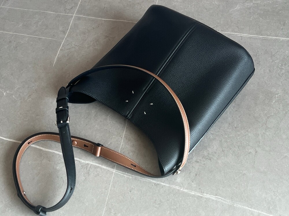 메종에서 첫선을 보인 Dress-age Hobo. 부드러운 페블 카프스킨 소재. 승마 모티프를 더한 스몰 핸드백. 클래식한 가죽 디테일과 깔끔한 라인. 꾸미지 않은 듯한 화려함과 제스처를 담은 디자인. 원뿔을 그리는 형태. 대조적인 듀얼웨어 스트랩. 백이 설 수 있도록 스터드를 세팅한 베이스. 내부에 장식된 로고. 뒷면에 Maison Margiela의 시그니처인 라벨 반대편 four stitches 디테일로 브랜드 정체성 표현.