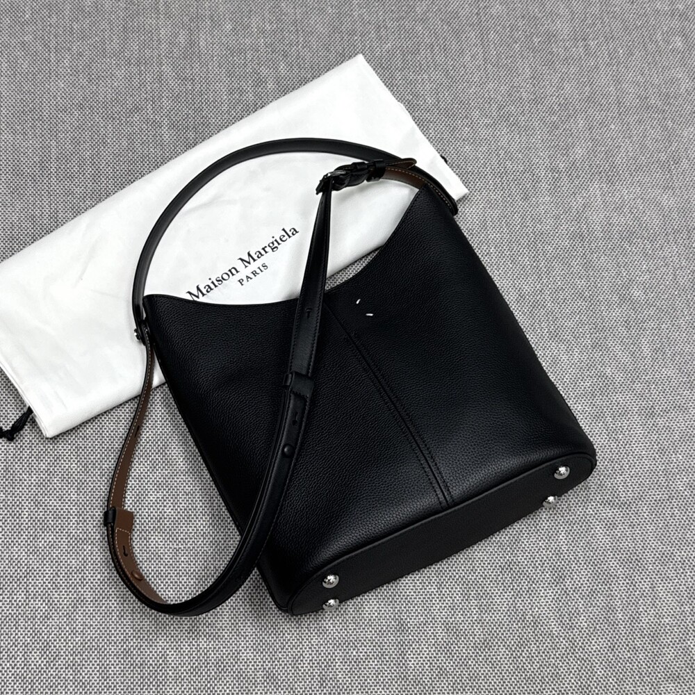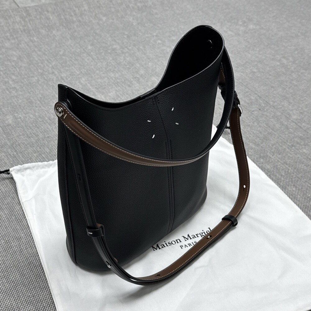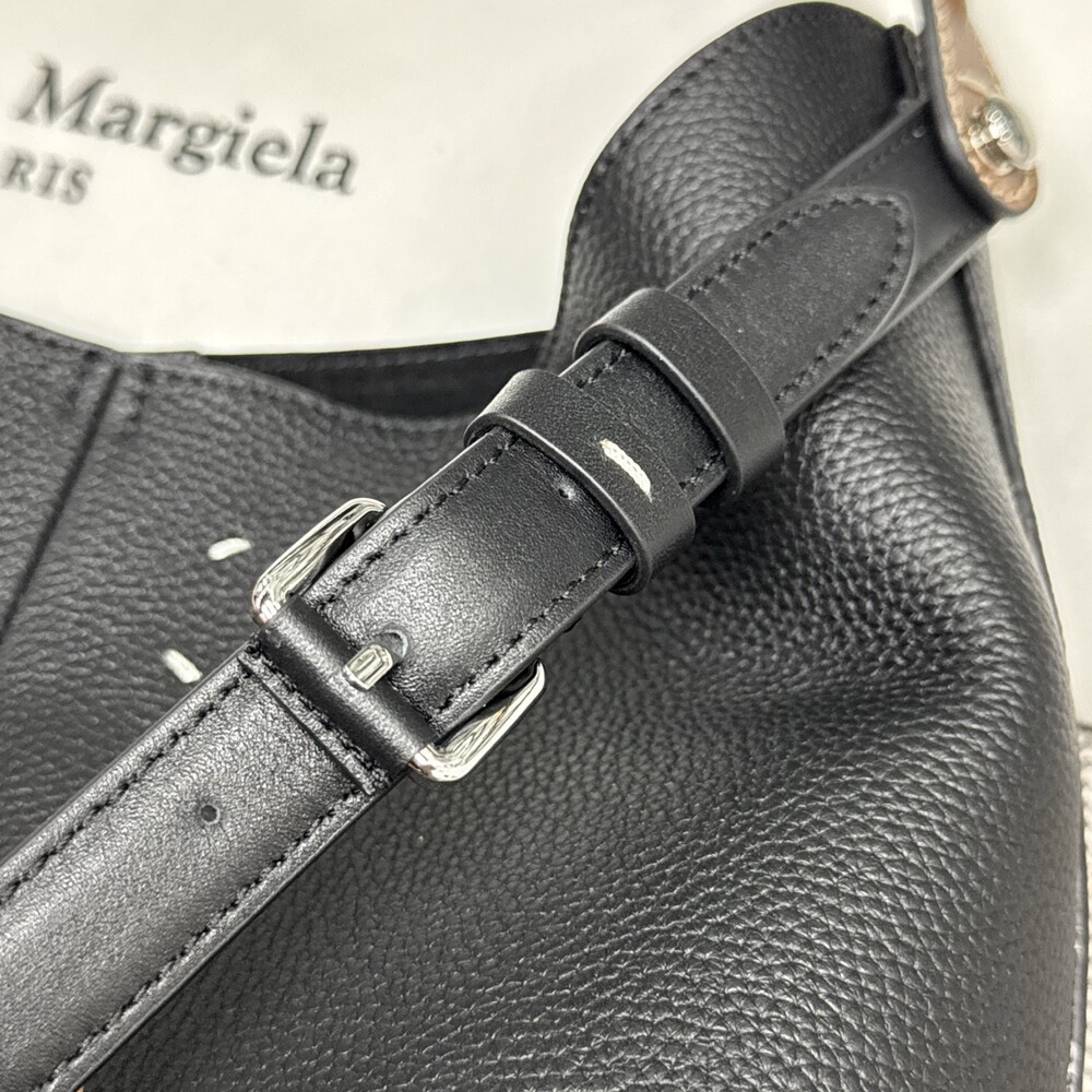 메종에서 첫선을 보인 Dress-age Hobo. 부드러운 페블 카프스킨 소재. 승마 모티프를 더한 스몰 핸드백. 클래식한 가죽 디테일과 깔끔한 라인. 꾸미지 않은 듯한 화려함과 제스처를 담은 디자인. 원뿔을 그리는 형태. 대조적인 듀얼웨어 스트랩. 백이 설 수 있도록 스터드를 세팅한 베이스. 내부에 장식된 로고. 뒷면에 Maison Margiela의 시그니처인 라벨 반대편 four stitches 디테일로 브랜드 정체성 표현.