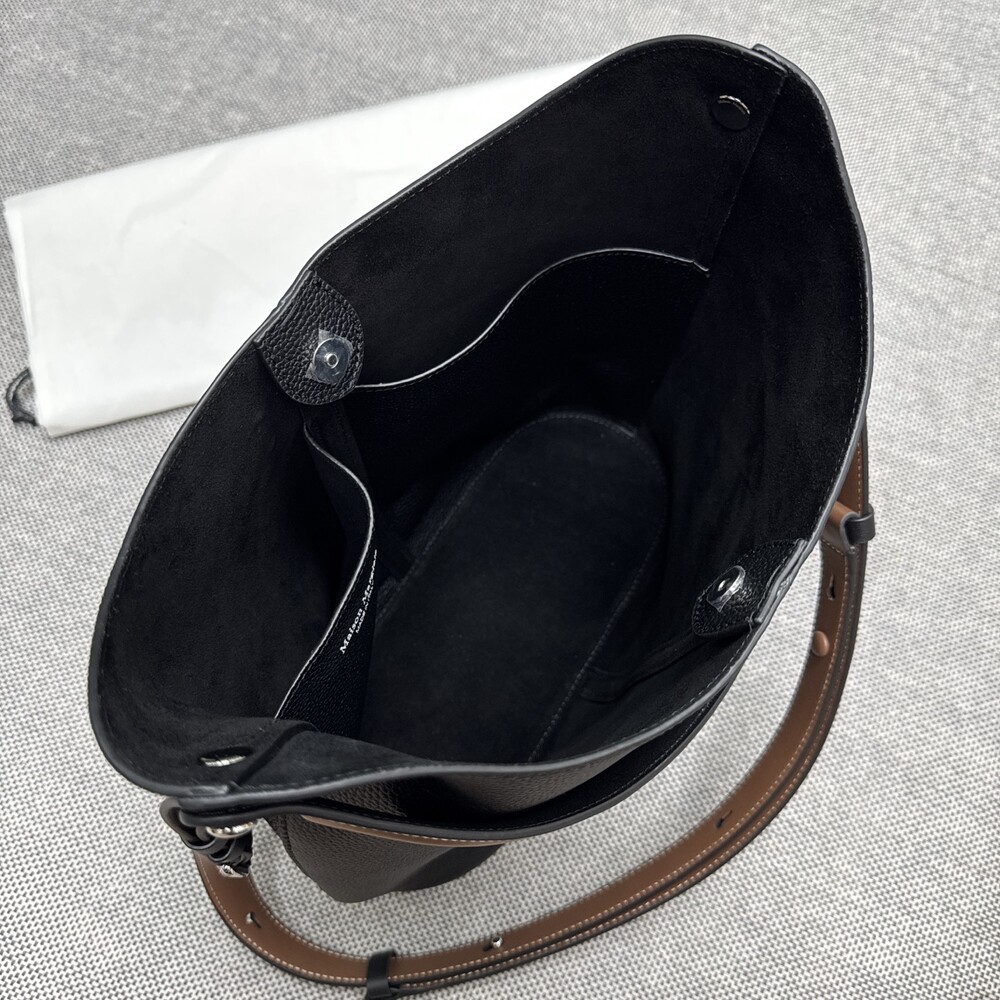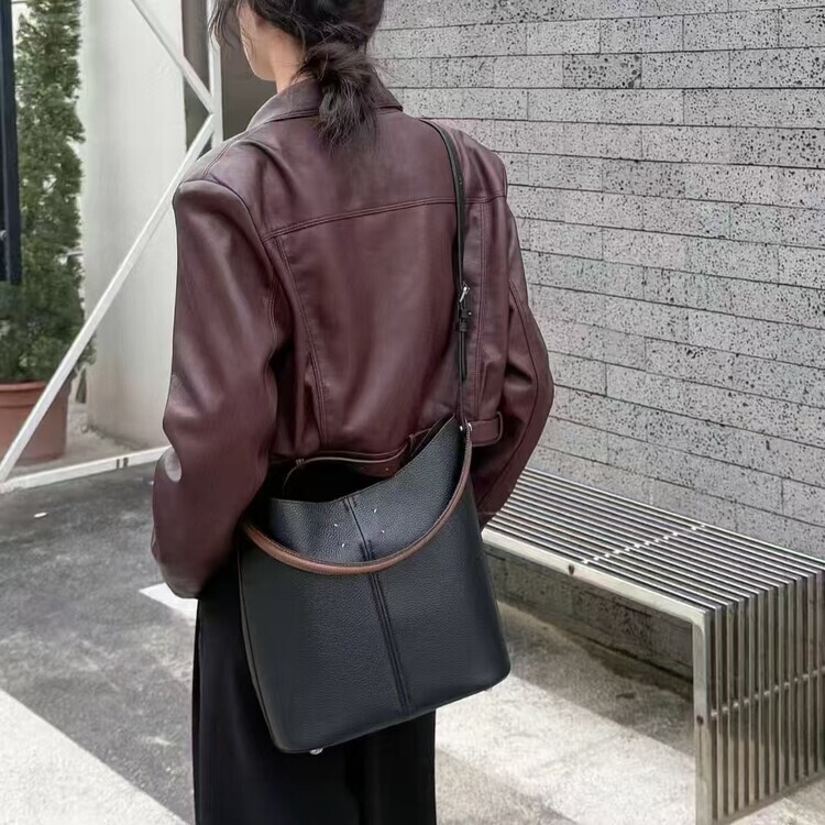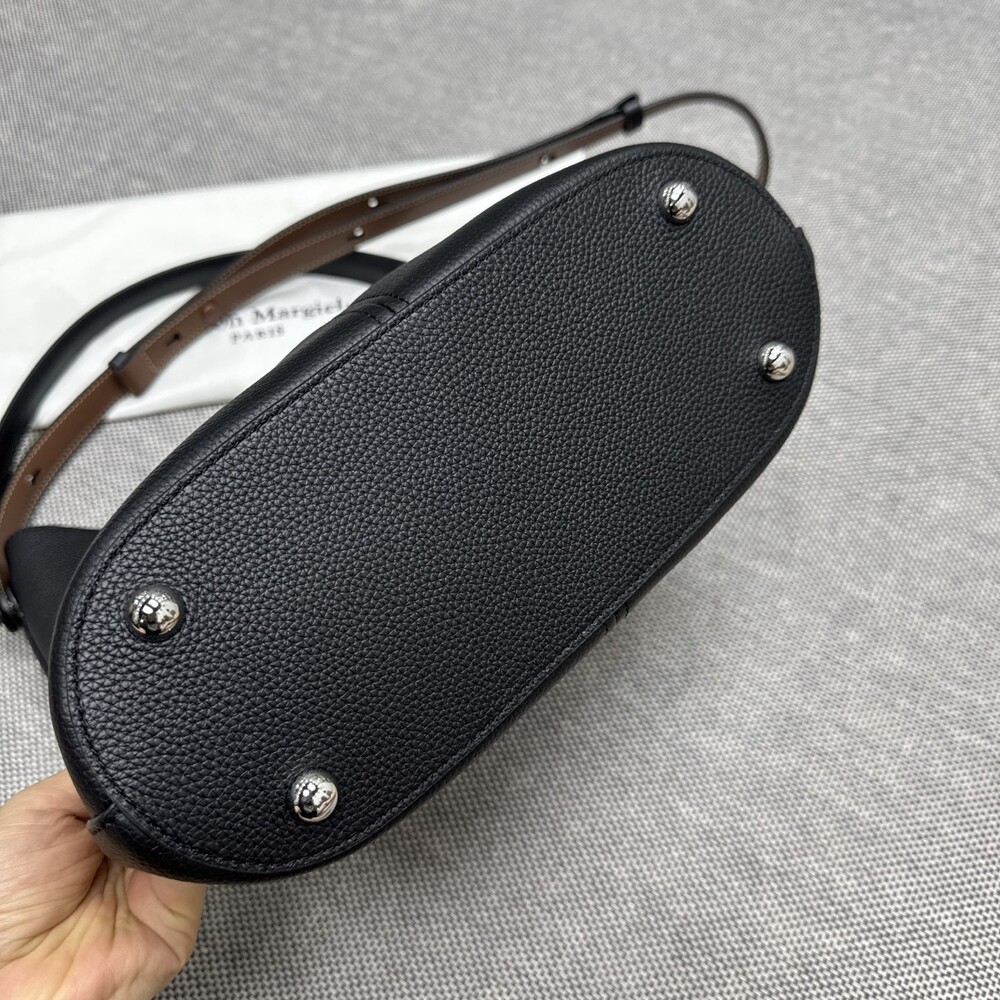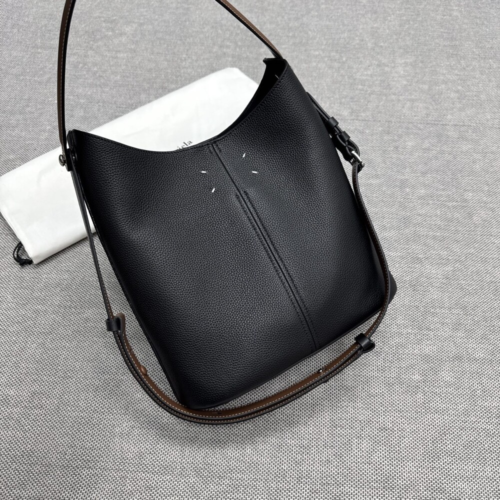 메종에서 첫선을 보인 Dress-age Hobo. 부드러운 페블 카프스킨 소재. 승마 모티프를 더한 스몰 핸드백. 클래식한 가죽 디테일과 깔끔한 라인. 꾸미지 않은 듯한 화려함과 제스처를 담은 디자인. 원뿔을 그리는 형태. 대조적인 듀얼웨어 스트랩. 백이 설 수 있도록 스터드를 세팅한 베이스. 내부에 장식된 로고. 뒷면에 Maison Margiela의 시그니처인 라벨 반대편 four stitches 디테일로 브랜드 정체성 표현.