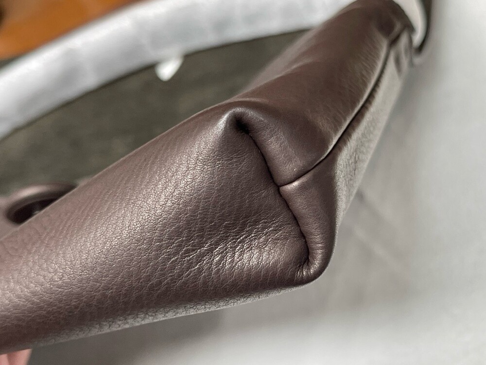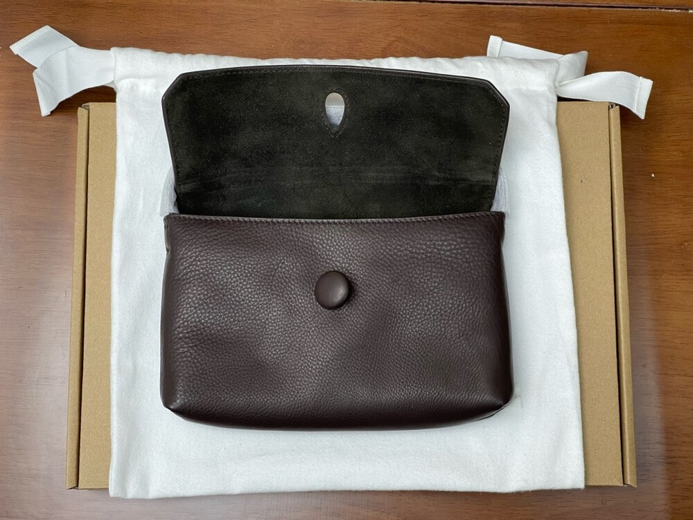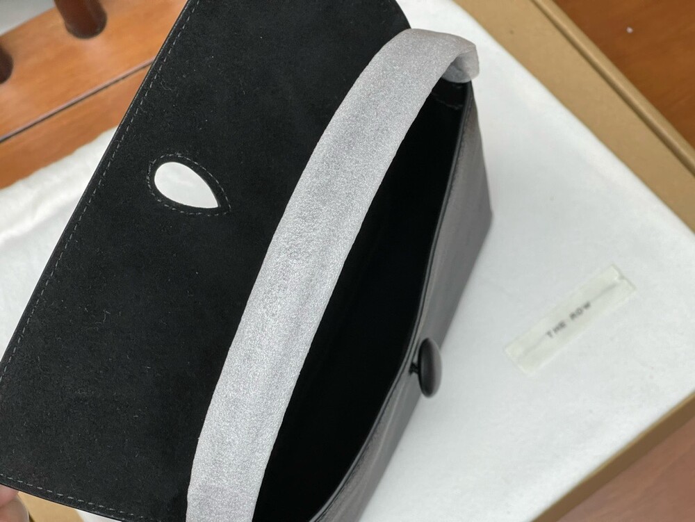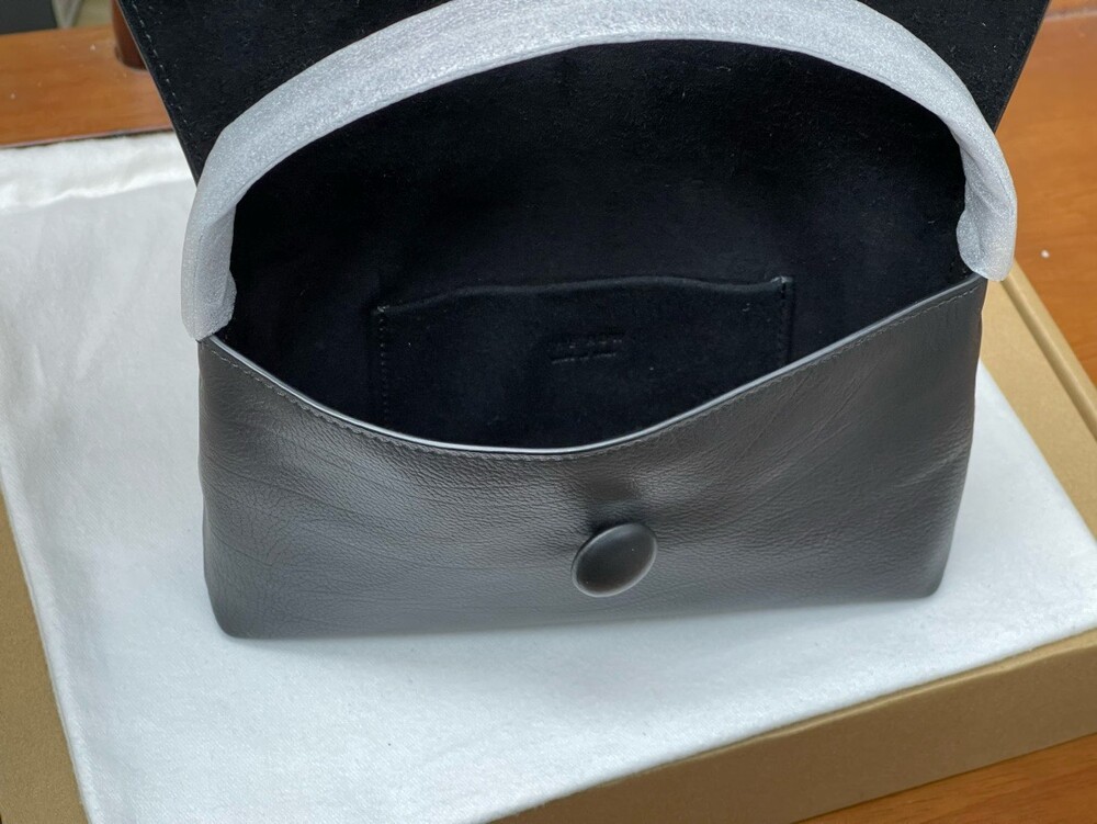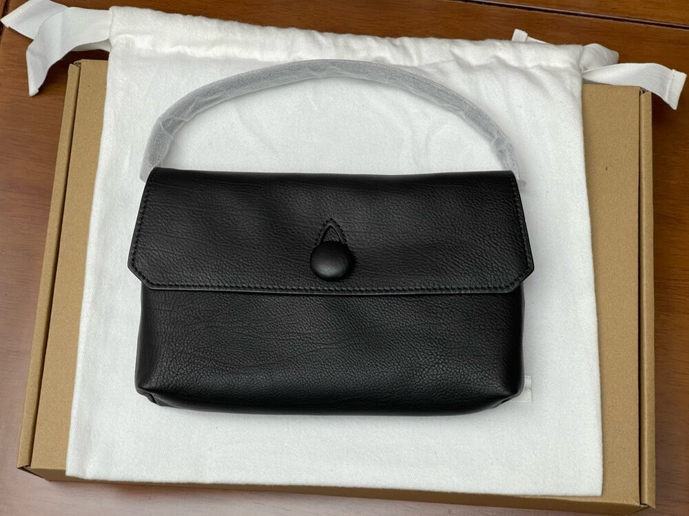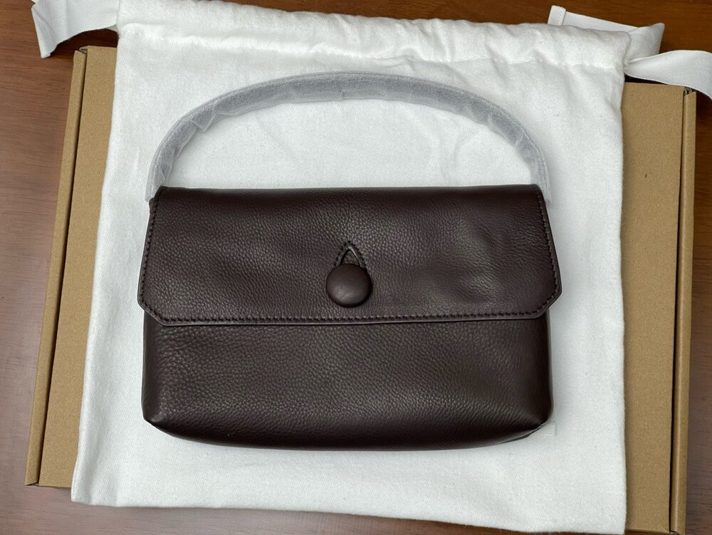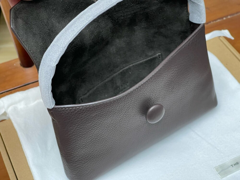 싱글 플랫 핸들, 가죽 커버 버튼으로 닫는 플랩 클로저가 특징인 세련된 그레인 마감 송아지 가죽 소재의 콤팩트 탑 핸들 백. 안감이 없고 봉제선이 보이지 않는 디자인으로 부드럽고 섬세한 느낌을 유지합니다. 버터처럼 부드러운 감촉과 은은한 광택이 특징인 이 가죽은 유연한 질감과 세련된 마감을 제공합니다.