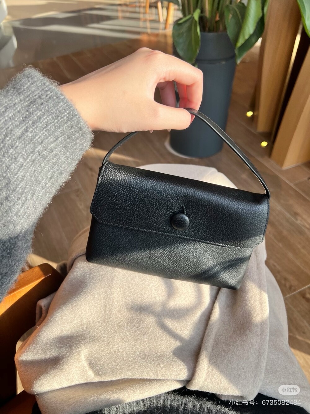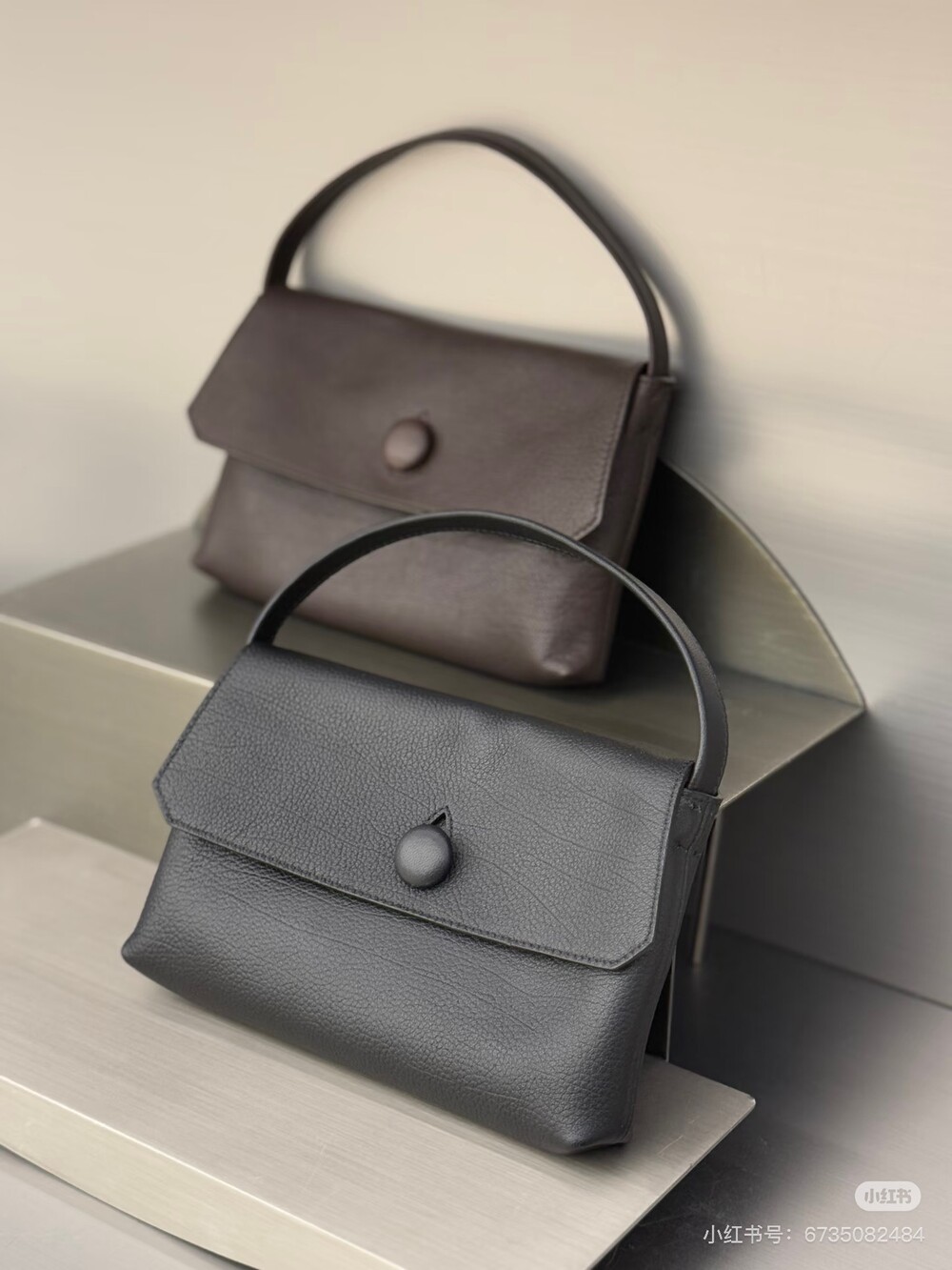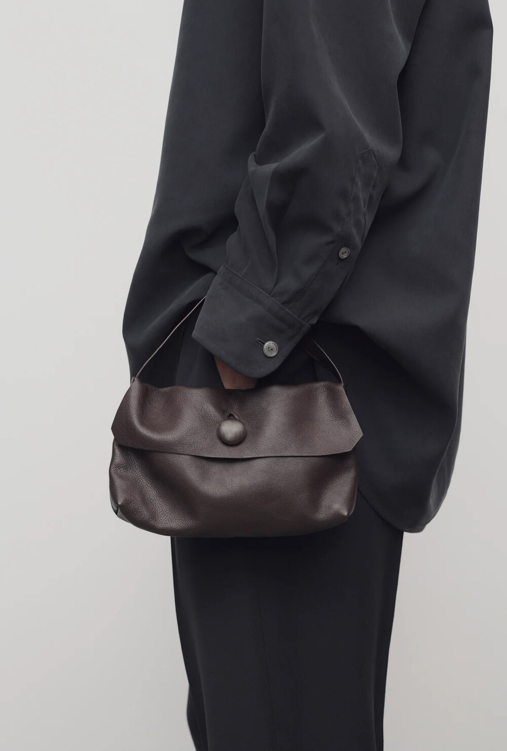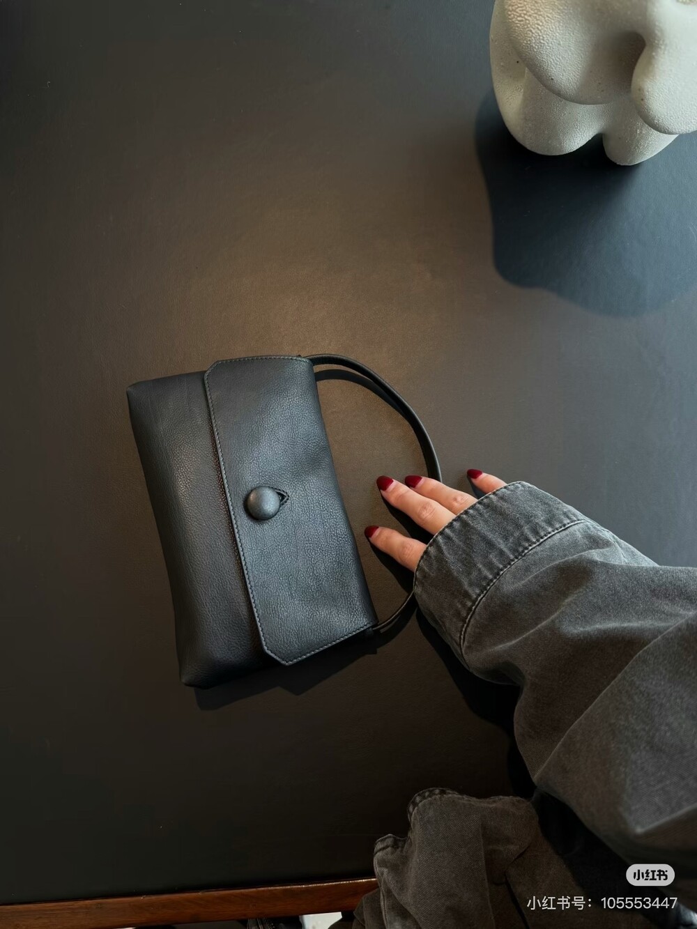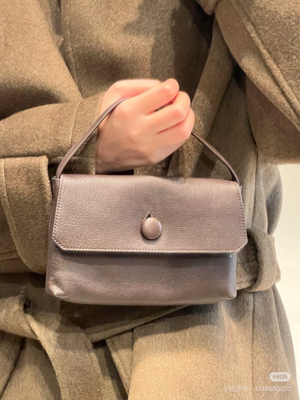 싱글 플랫 핸들, 가죽 커버 버튼으로 닫는 플랩 클로저가 특징인 세련된 그레인 마감 송아지 가죽 소재의 콤팩트 탑 핸들 백. 안감이 없고 봉제선이 보이지 않는 디자인으로 부드럽고 섬세한 느낌을 유지합니다. 버터처럼 부드러운 감촉과 은은한 광택이 특징인 이 가죽은 유연한 질감과 세련된 마감을 제공합니다.