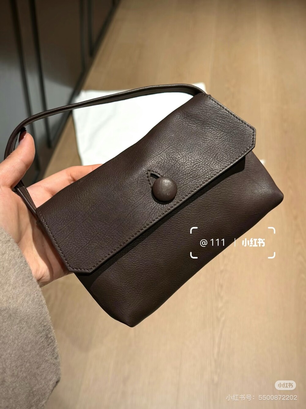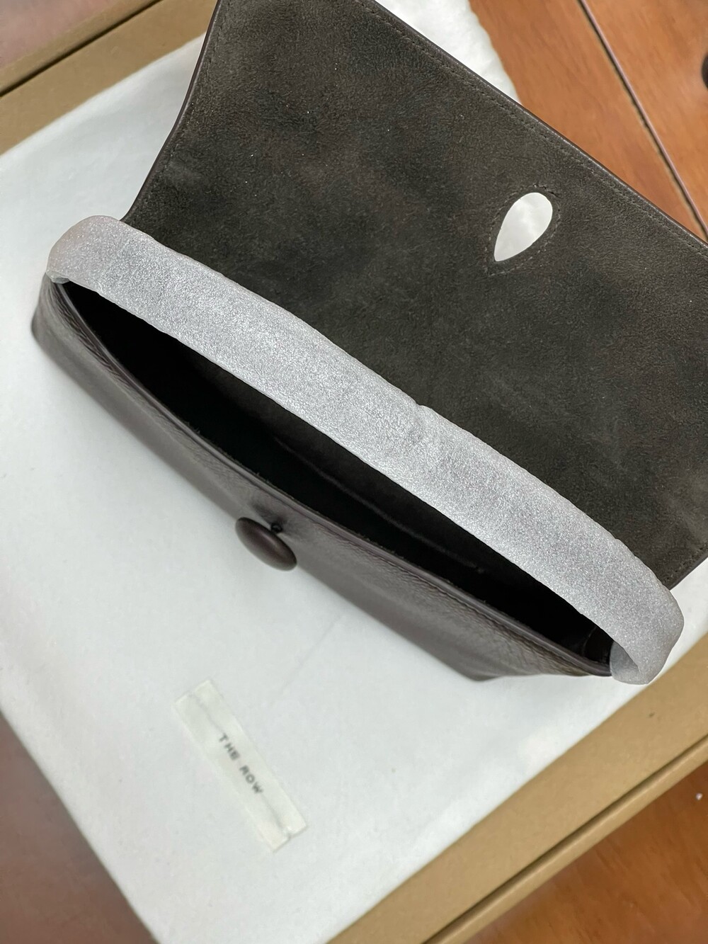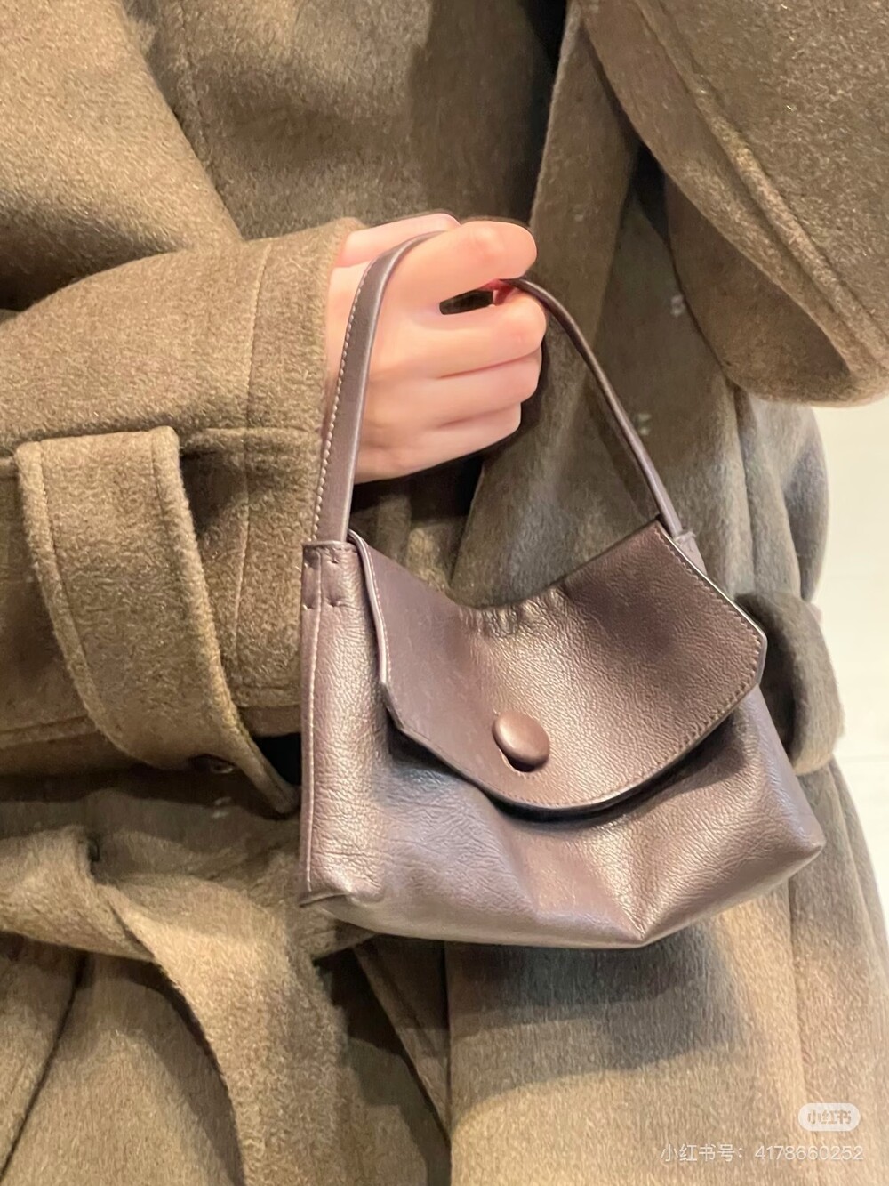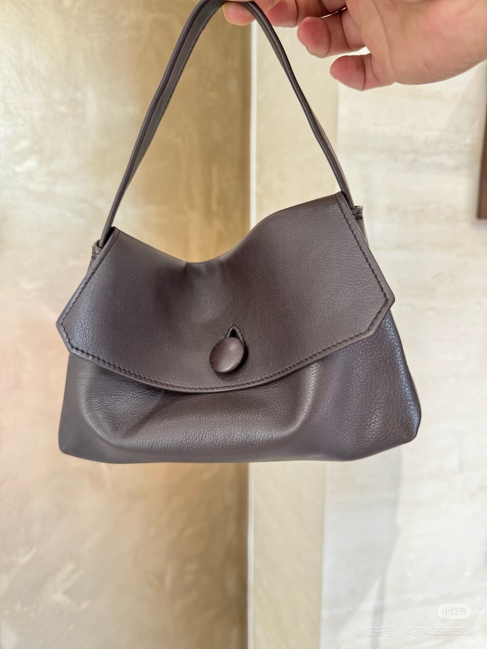 싱글 플랫 핸들, 가죽 커버 버튼으로 닫는 플랩 클로저가 특징인 세련된 그레인 마감 송아지 가죽 소재의 콤팩트 탑 핸들 백. 안감이 없고 봉제선이 보이지 않는 디자인으로 부드럽고 섬세한 느낌을 유지합니다. 버터처럼 부드러운 감촉과 은은한 광택이 특징인 이 가죽은 유연한 질감과 세련된 마감을 제공합니다.