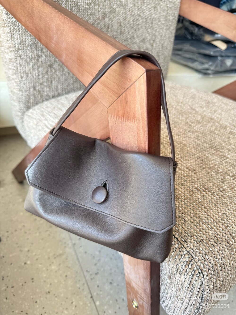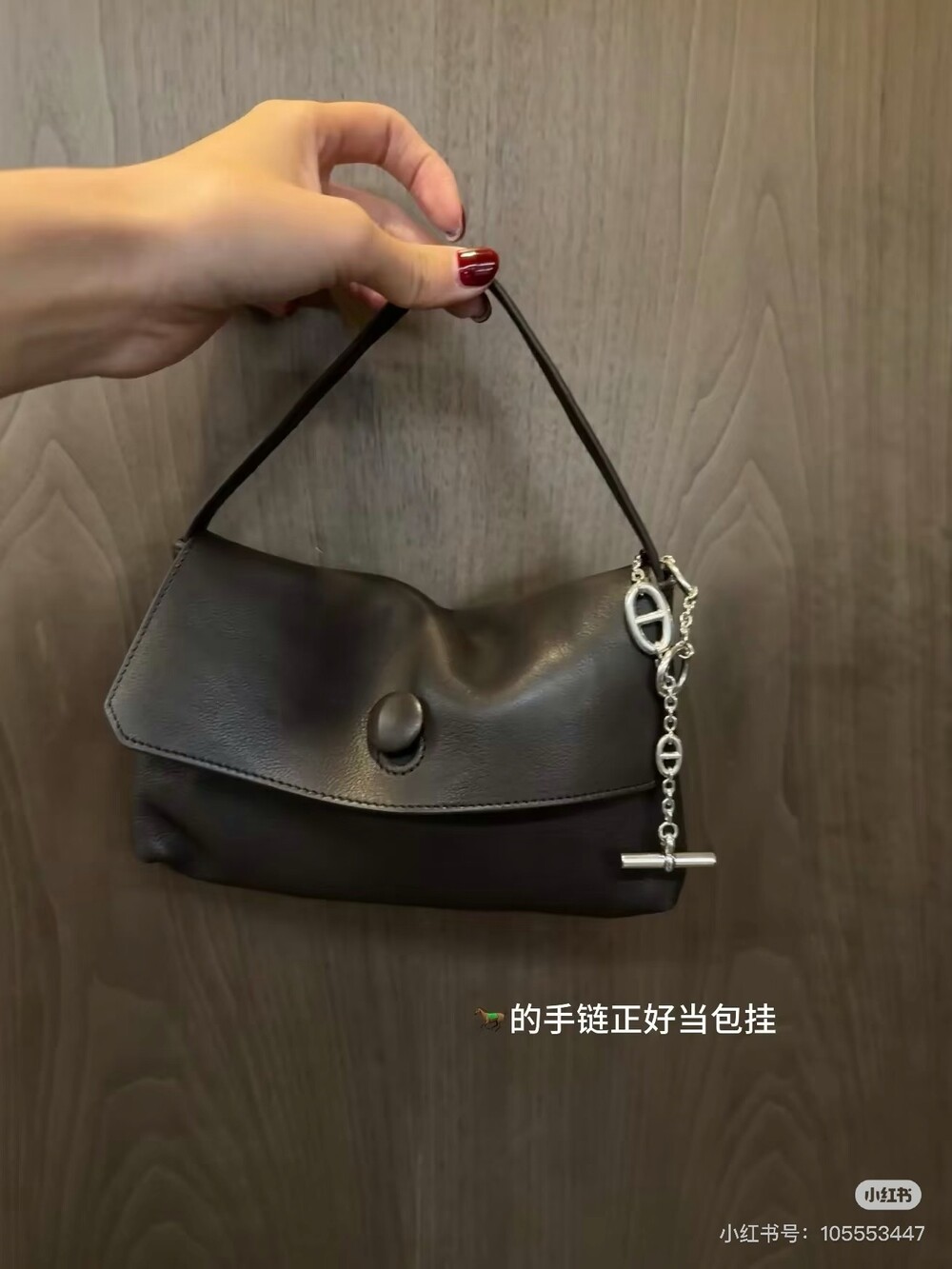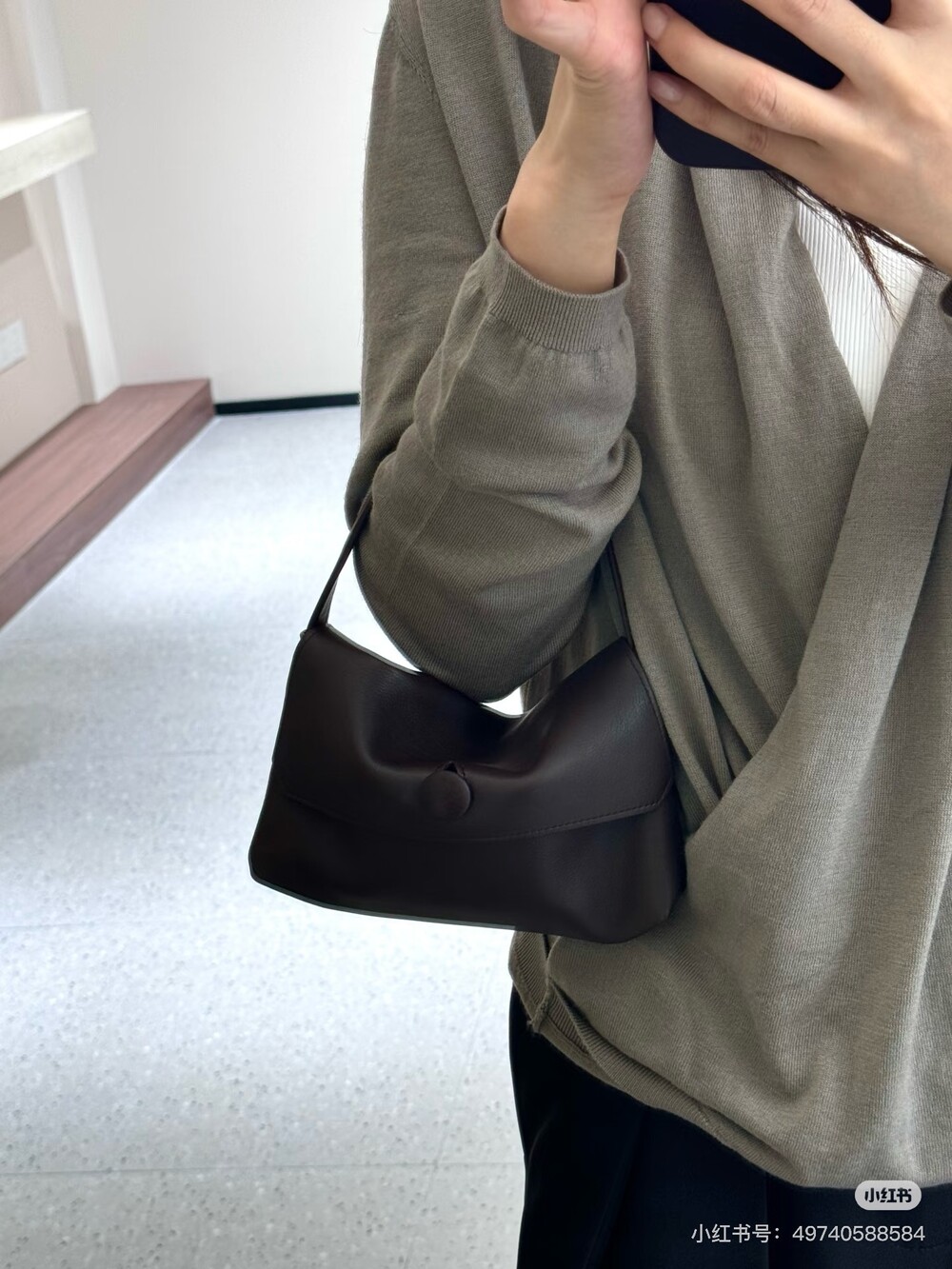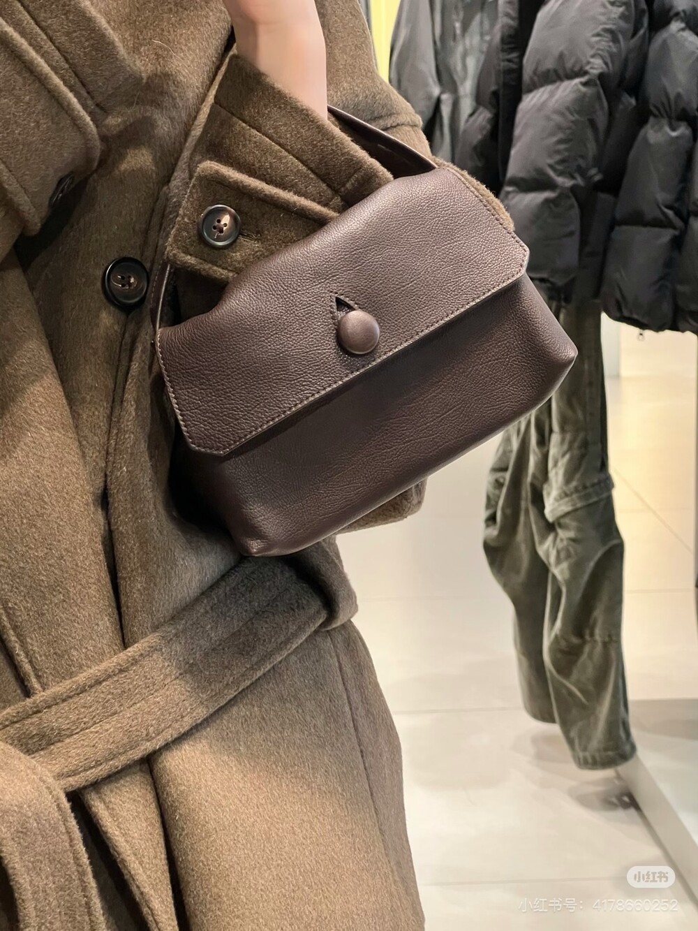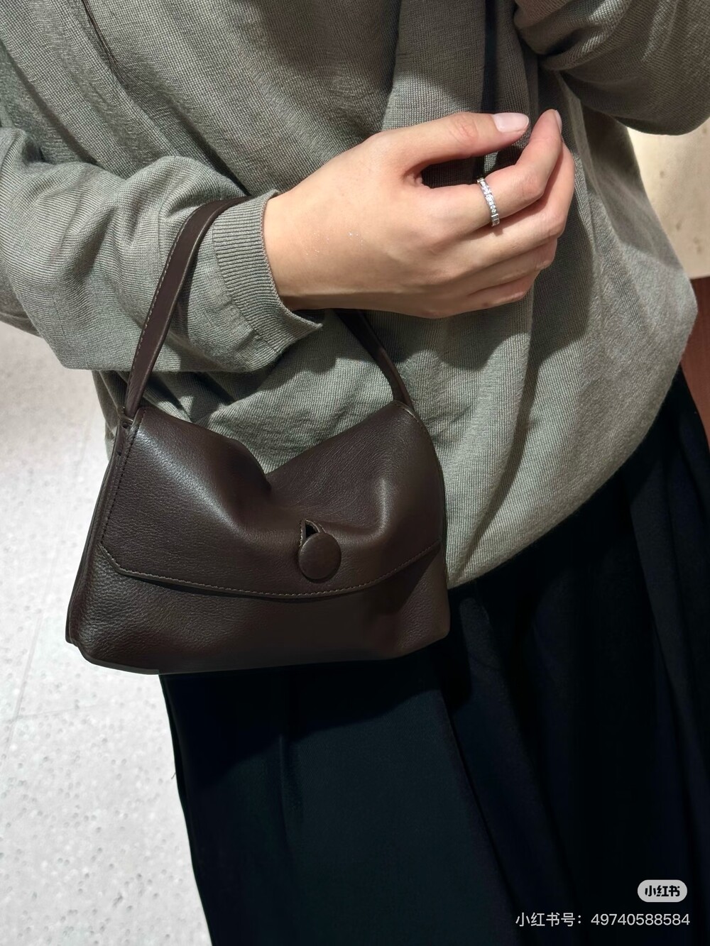 싱글 플랫 핸들, 가죽 커버 버튼으로 닫는 플랩 클로저가 특징인 세련된 그레인 마감 송아지 가죽 소재의 콤팩트 탑 핸들 백. 안감이 없고 봉제선이 보이지 않는 디자인으로 부드럽고 섬세한 느낌을 유지합니다. 버터처럼 부드러운 감촉과 은은한 광택이 특징인 이 가죽은 유연한 질감과 세련된 마감을 제공합니다.