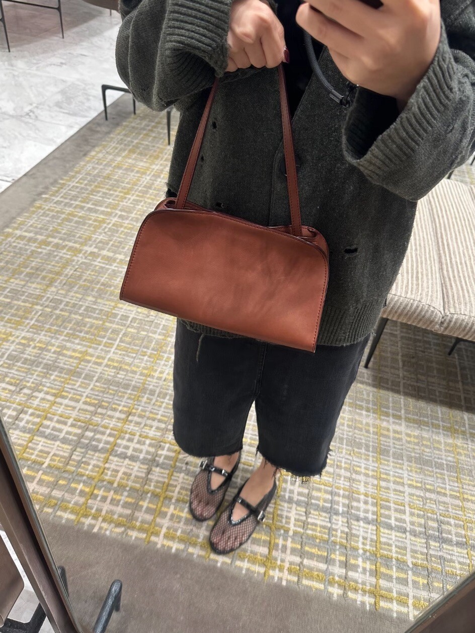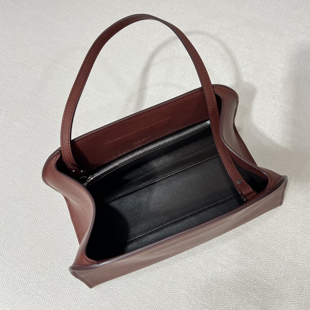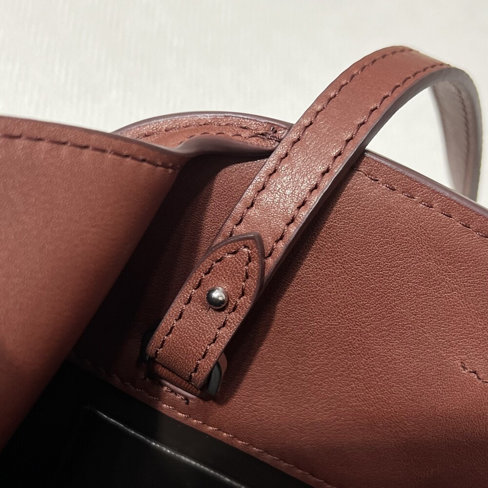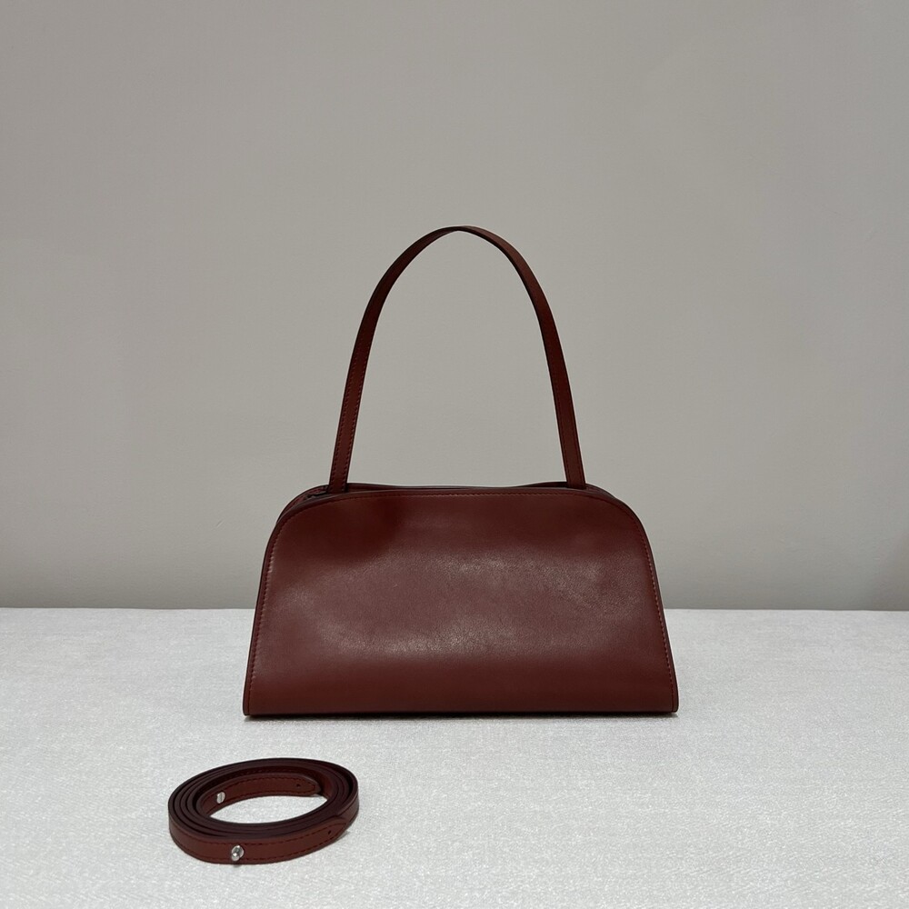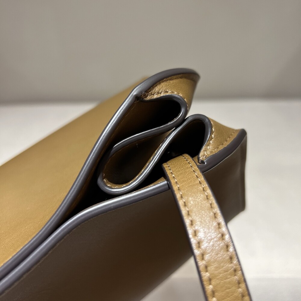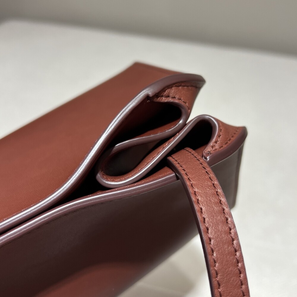 폴리시드 새들 가죽 소재의 소프트 스트럭처 클러치. 싱글 숄더 스트랩 및 거싯 디테일의 사이드 패널.