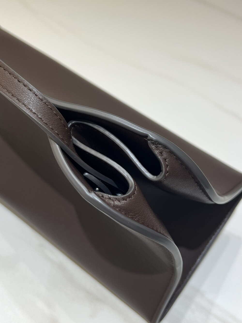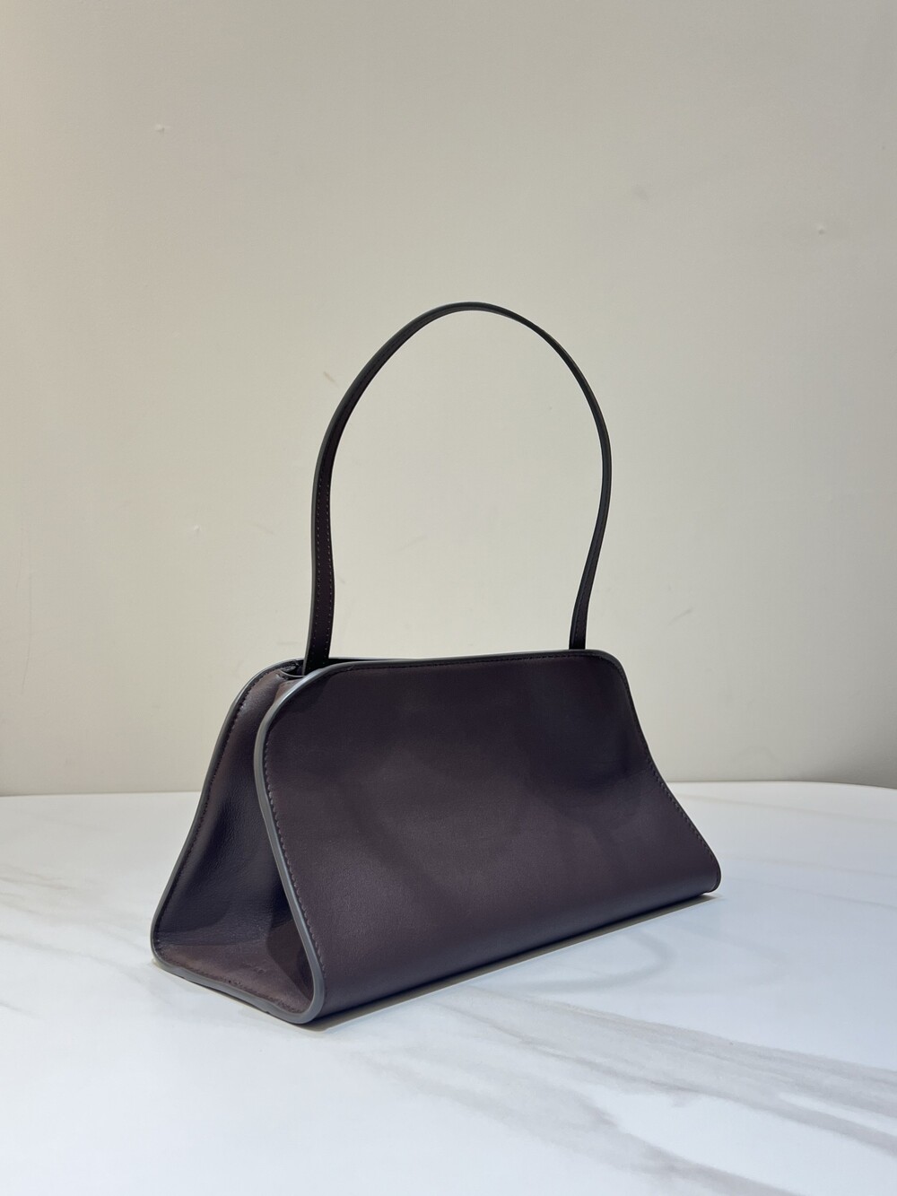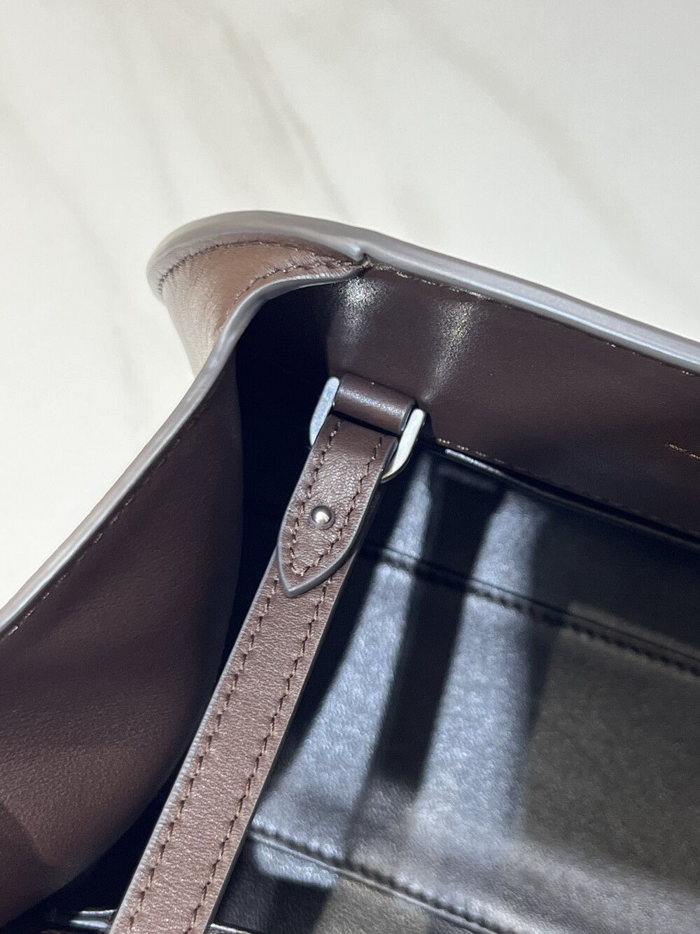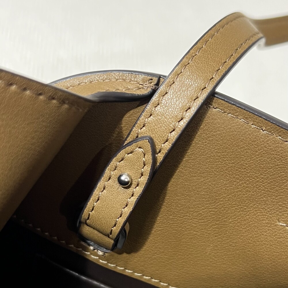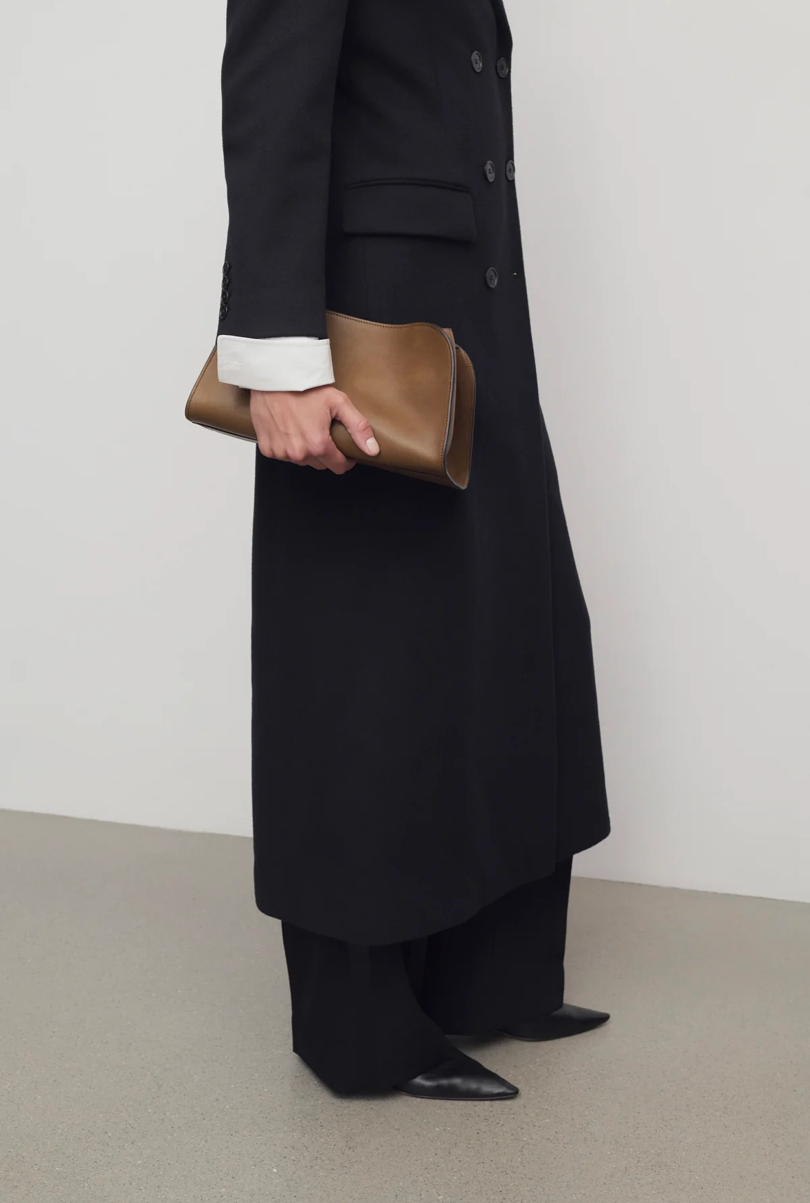 폴리시드 새들 가죽 소재의 소프트 스트럭처 클러치. 싱글 숄더 스트랩 및 거싯 디테일의 사이드 패널.
