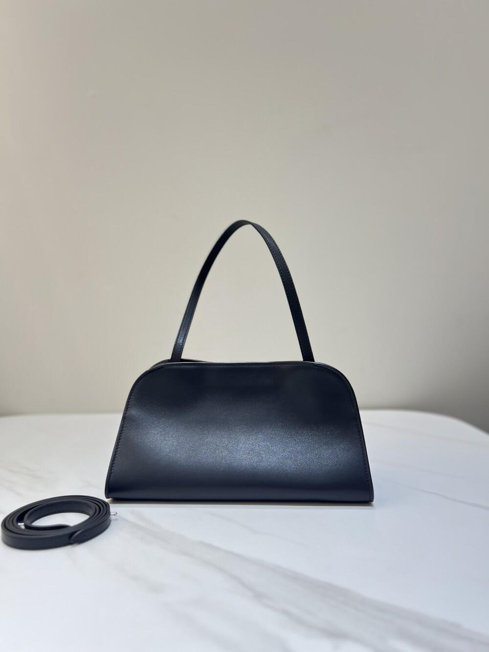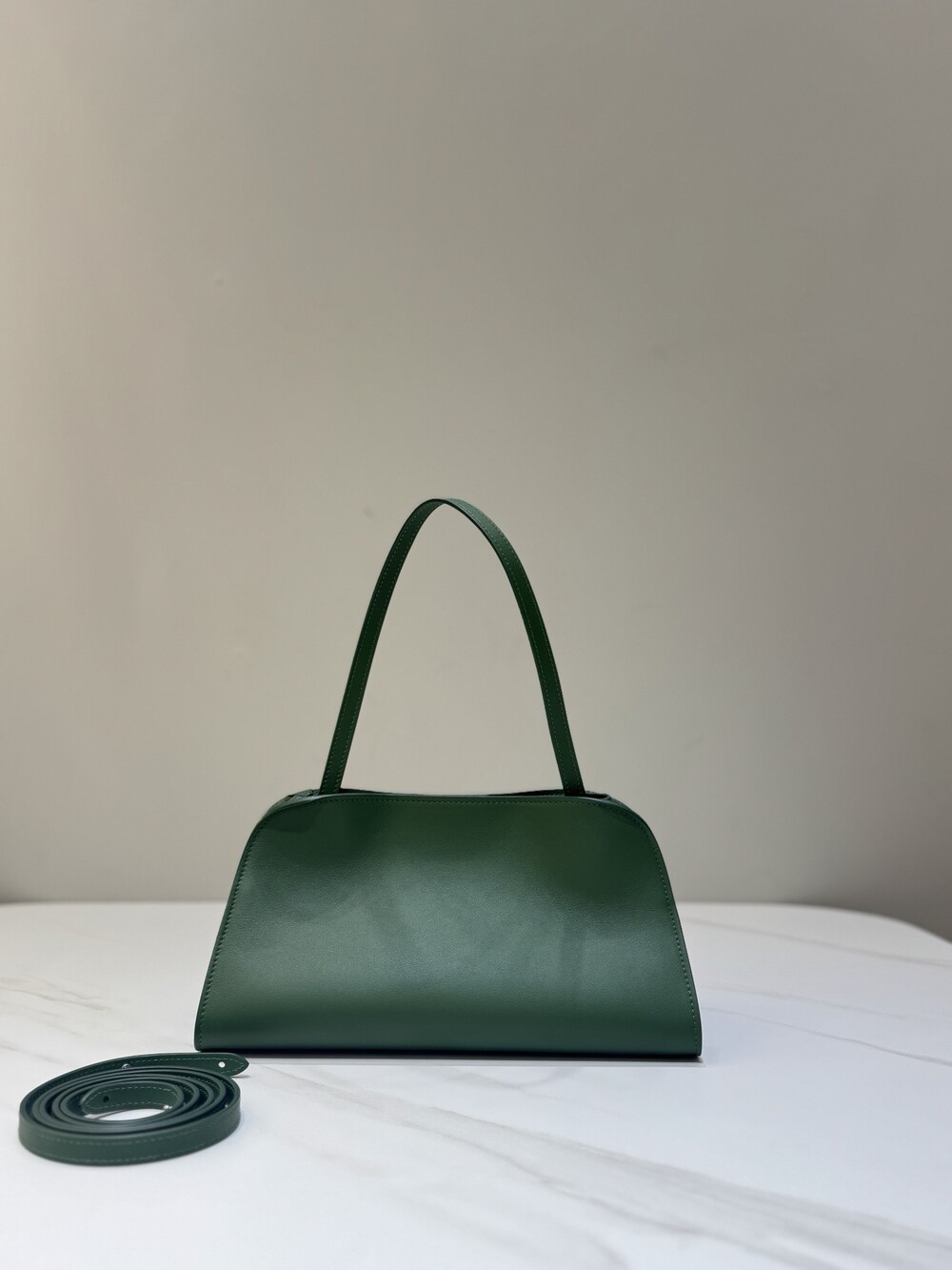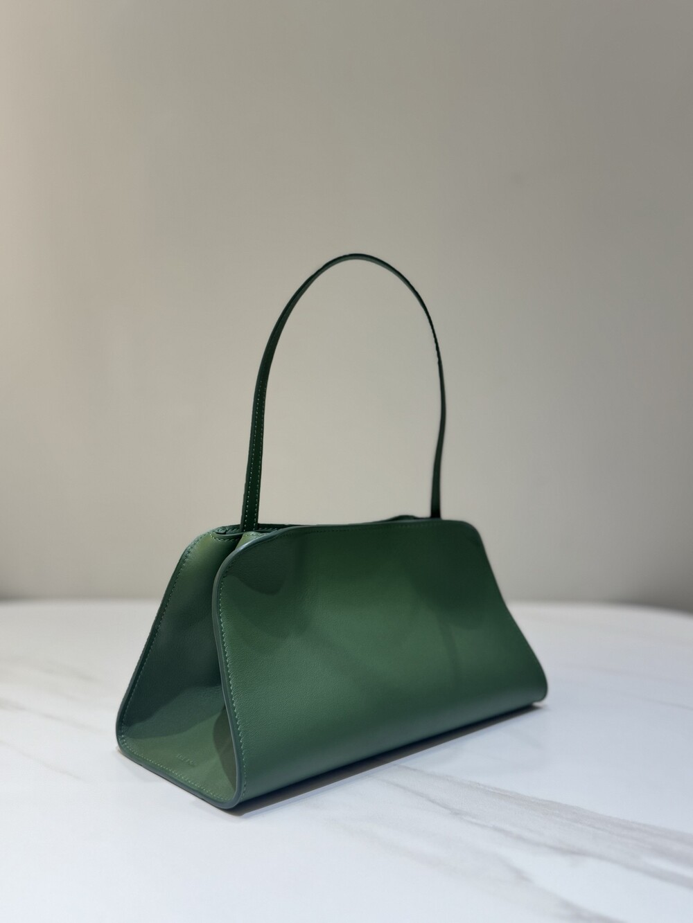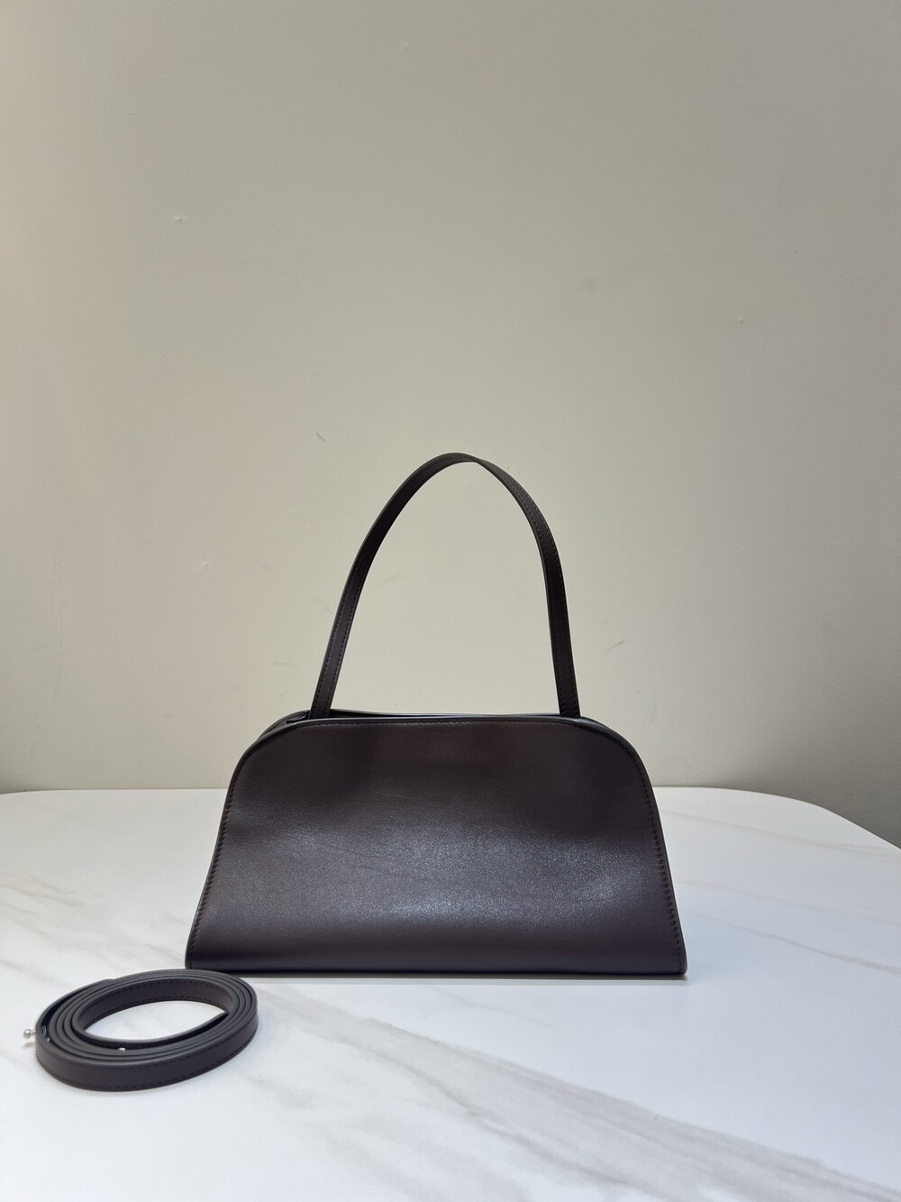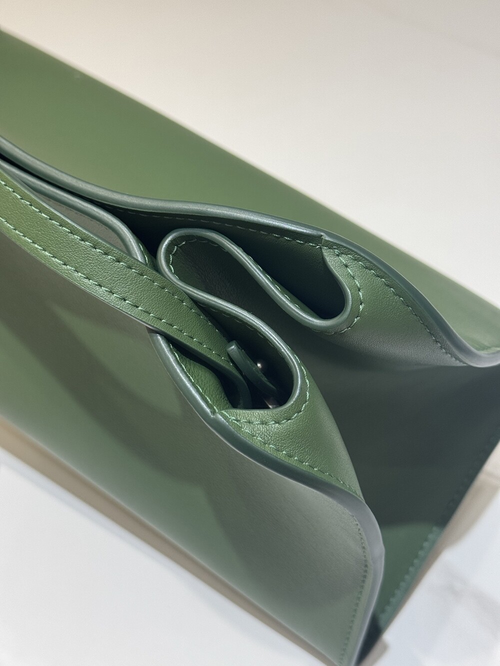 폴리시드 새들 가죽 소재의 소프트 스트럭처 클러치. 싱글 숄더 스트랩 및 거싯 디테일의 사이드 패널.