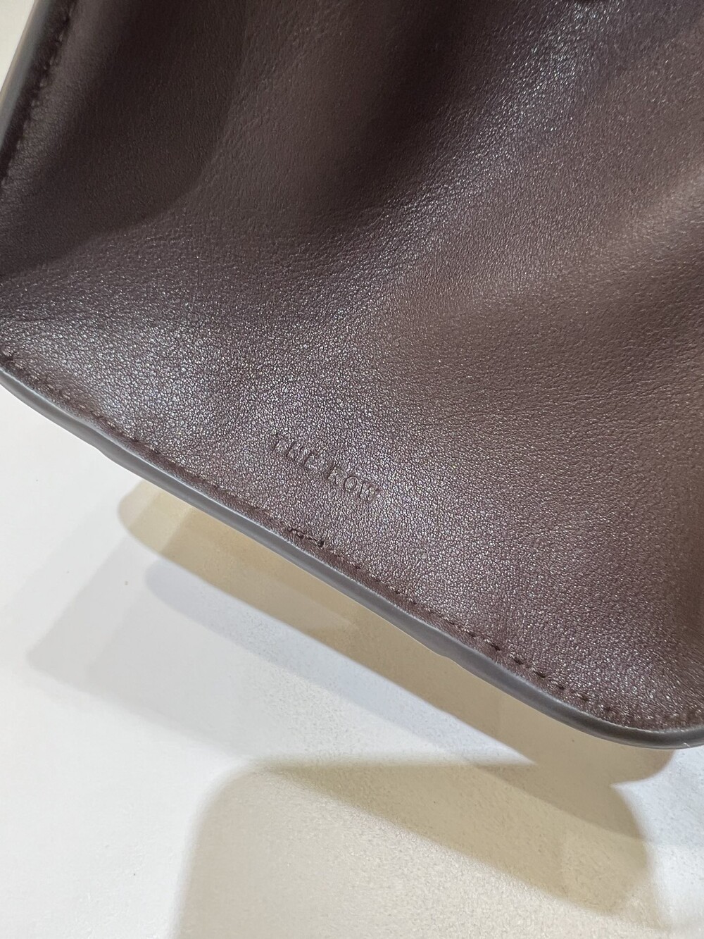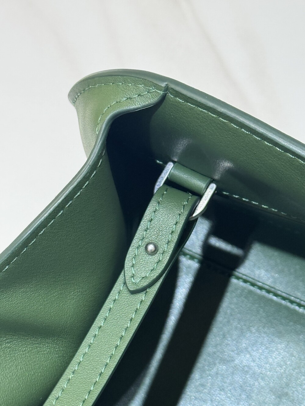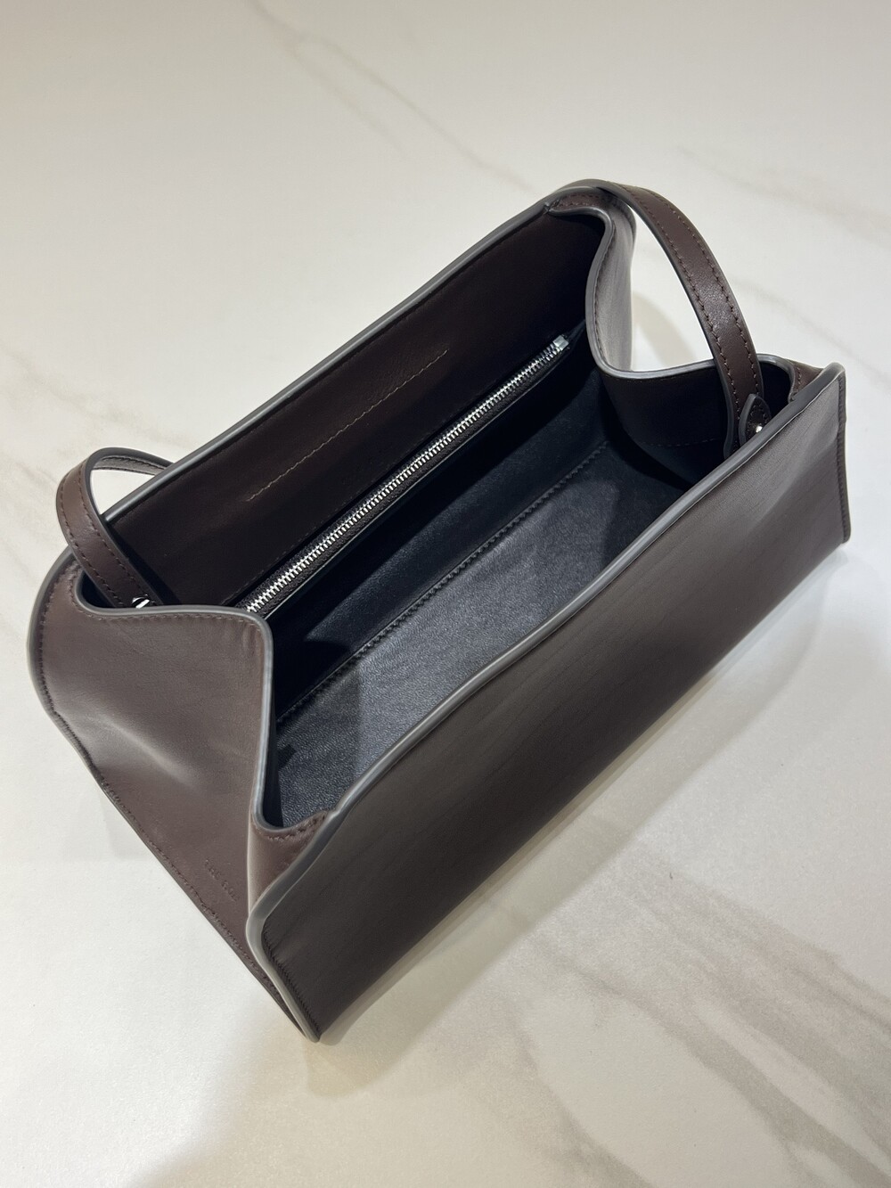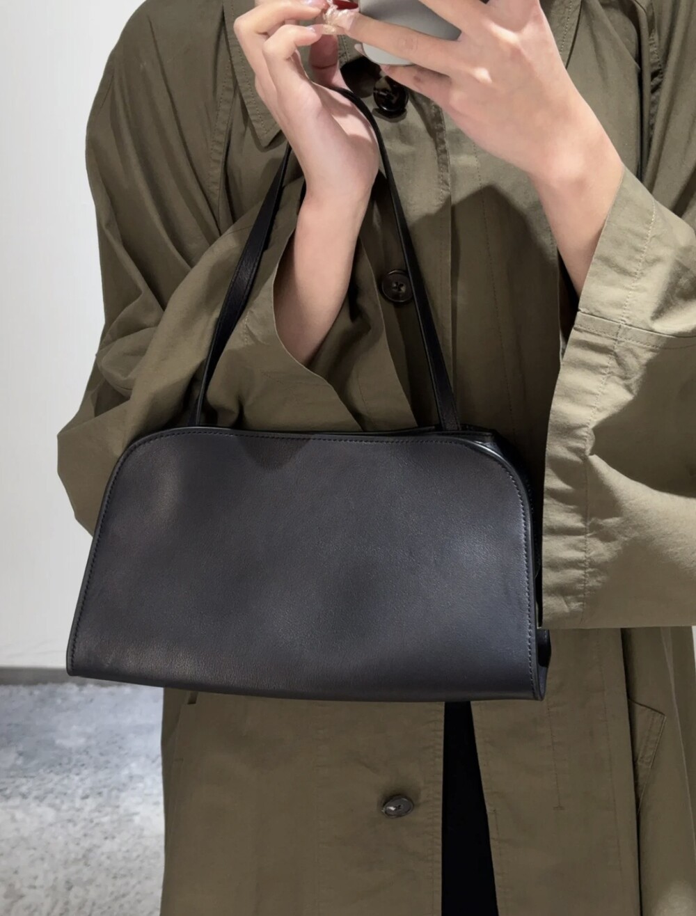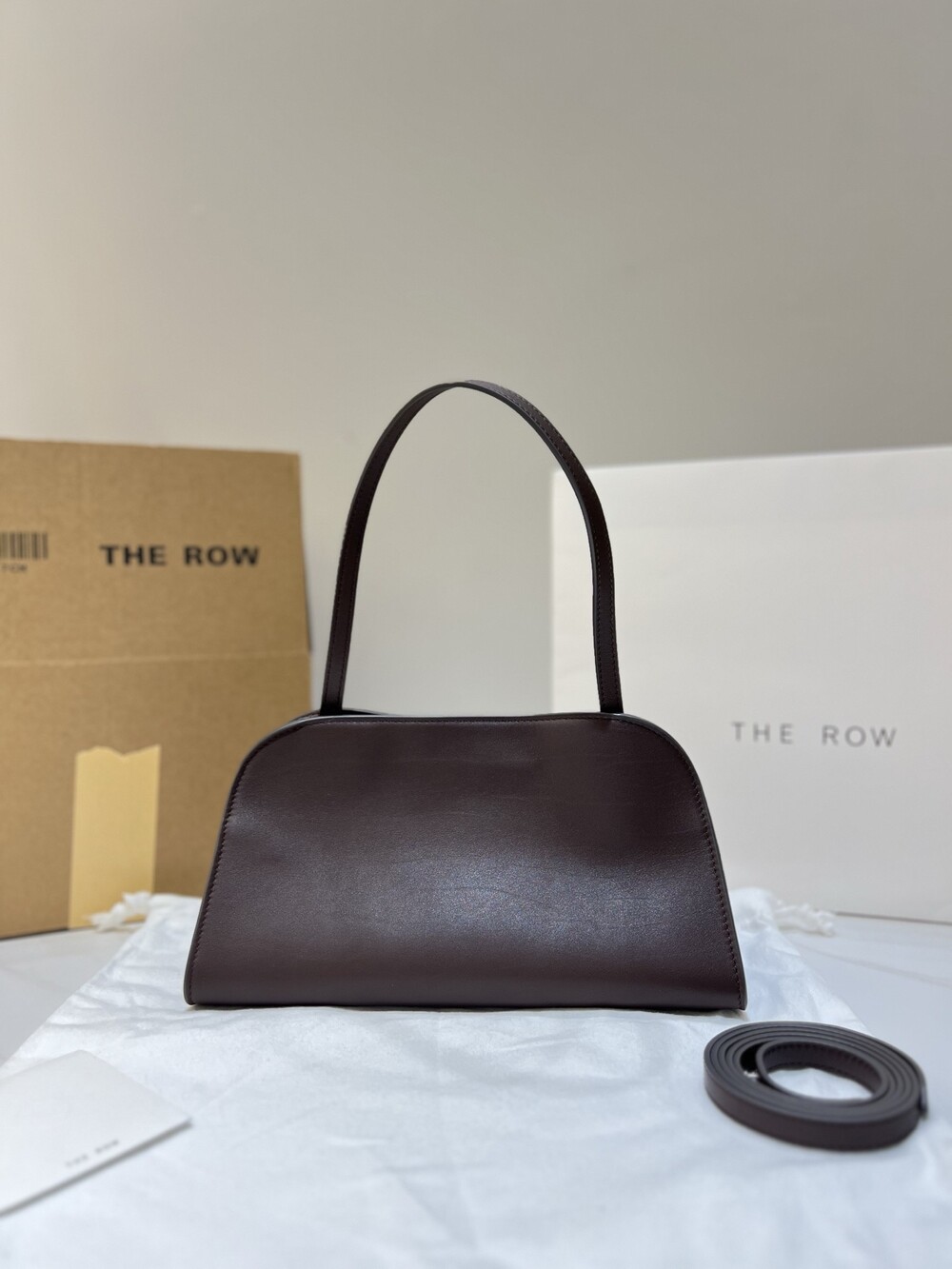 폴리시드 새들 가죽 소재의 소프트 스트럭처 클러치. 싱글 숄더 스트랩 및 거싯 디테일의 사이드 패널.