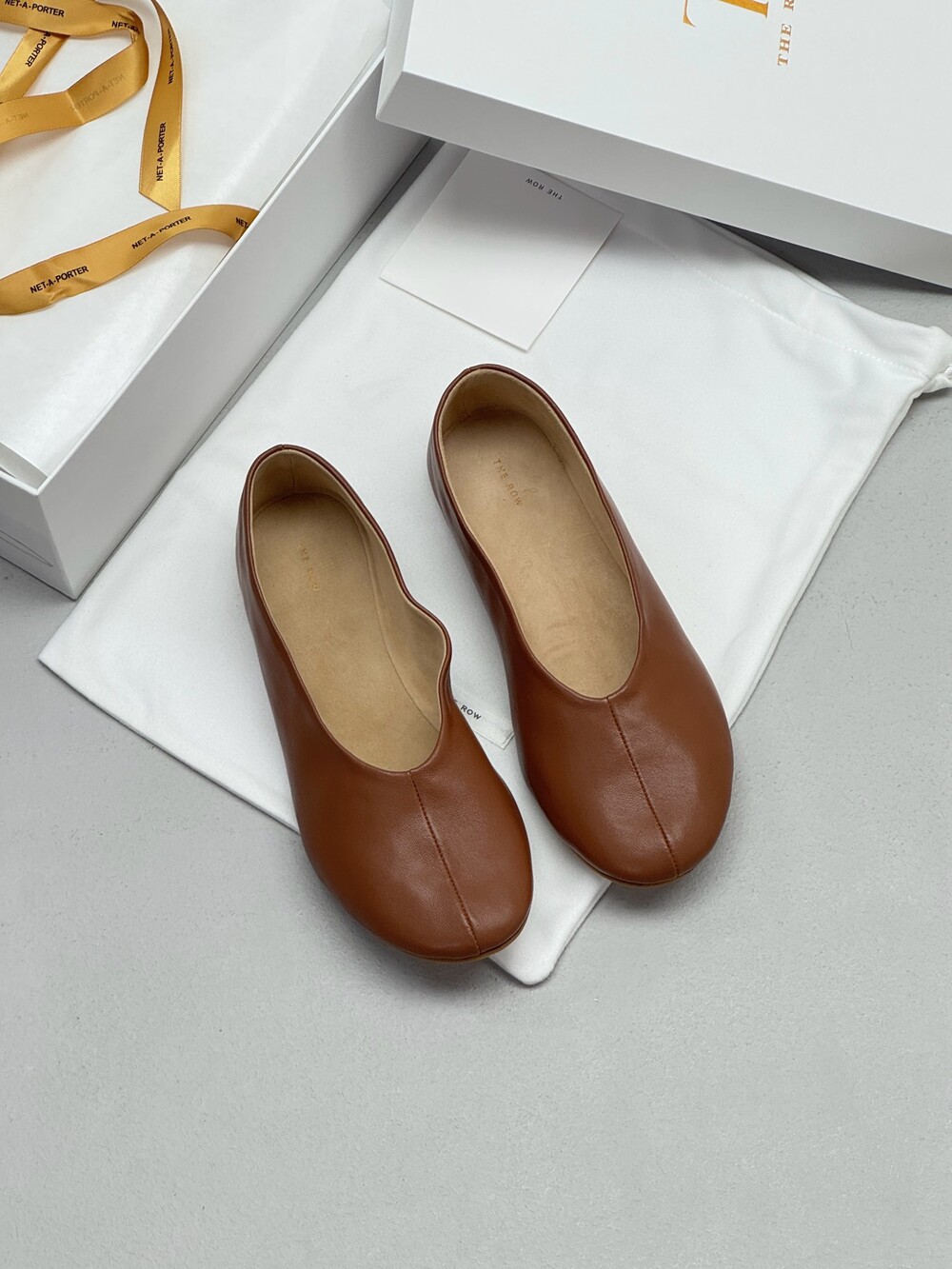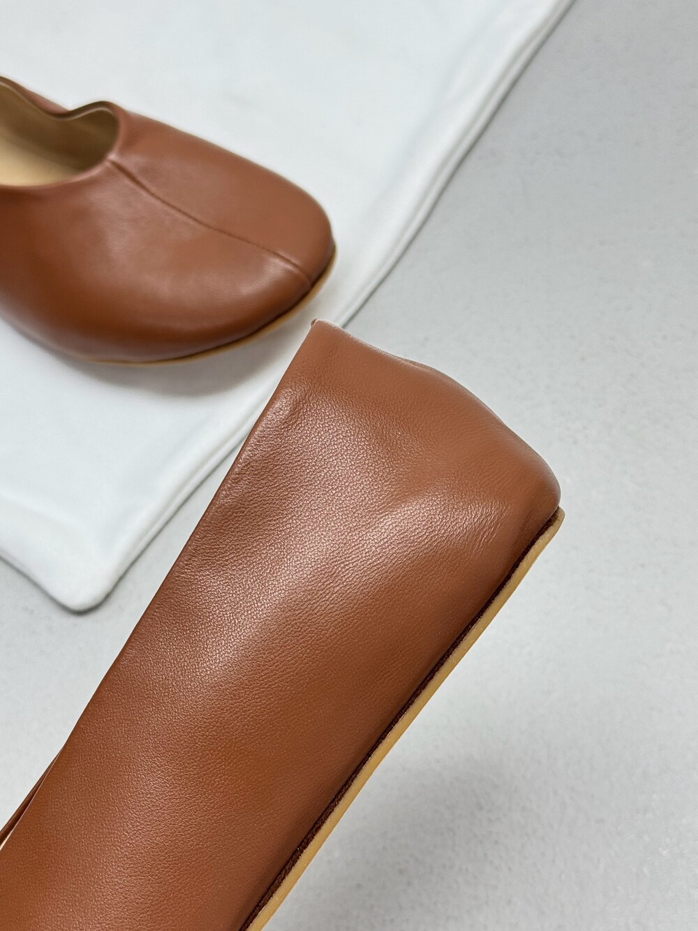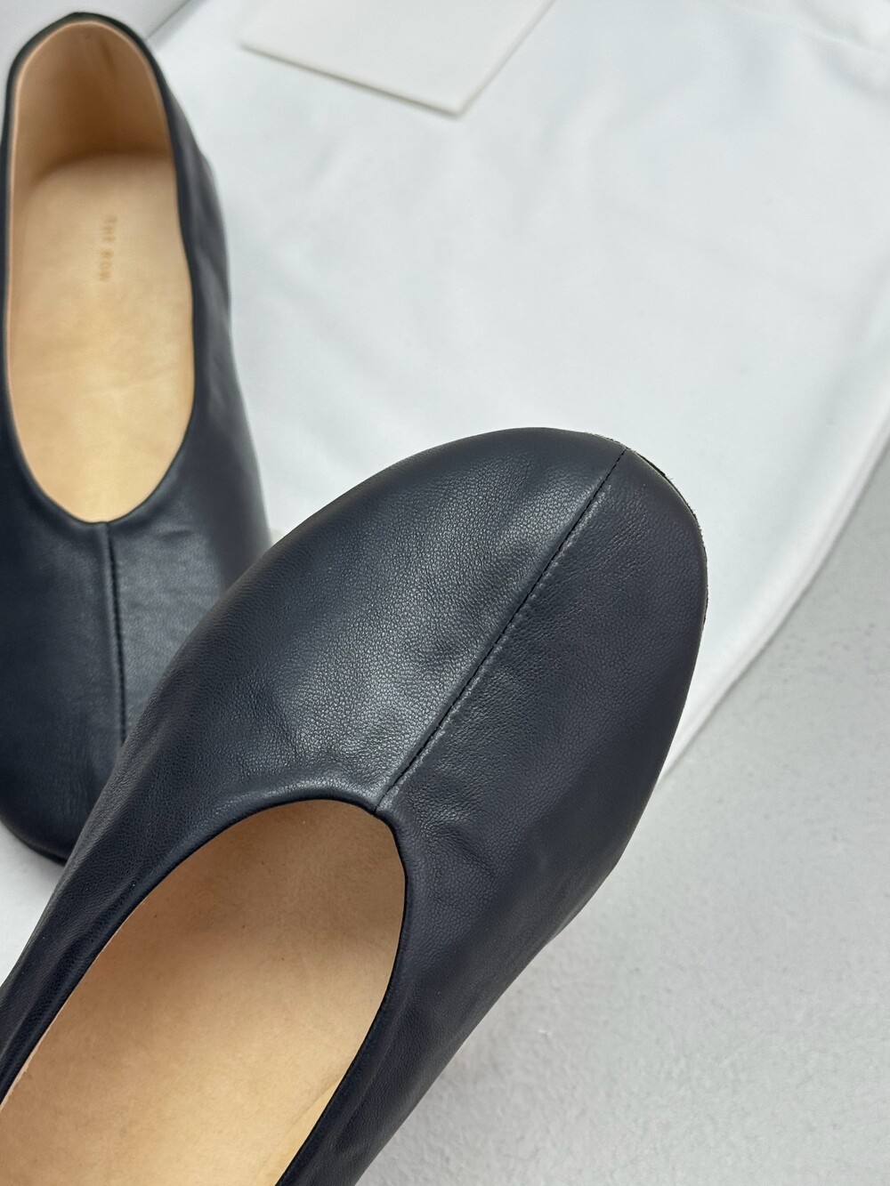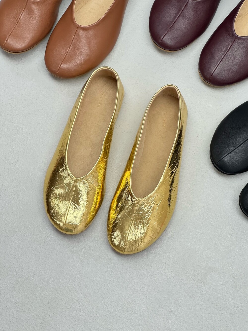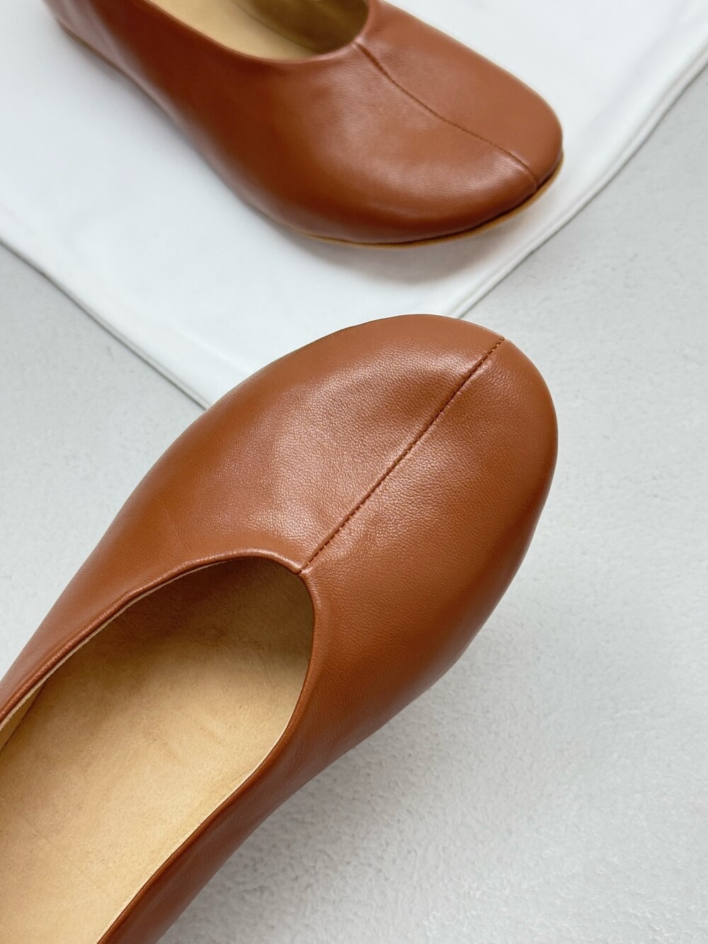 부드러운 나파 가죽 소재의 슬립온 슈즈로 타원형 토, 앞면 중앙 솔기와 유연한 고무 코팅 밑창이 특징입니다.