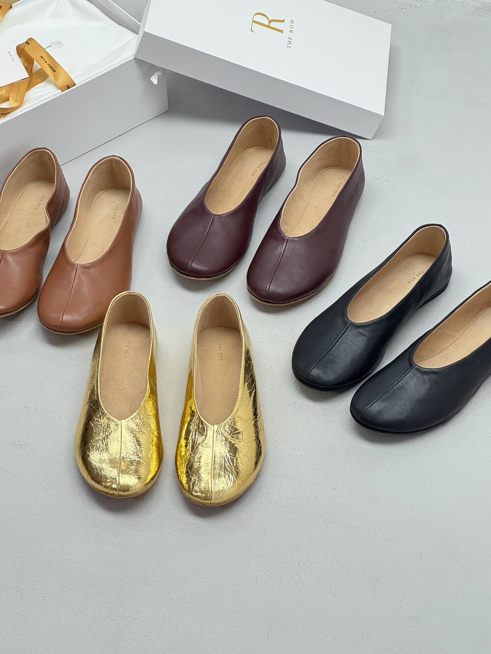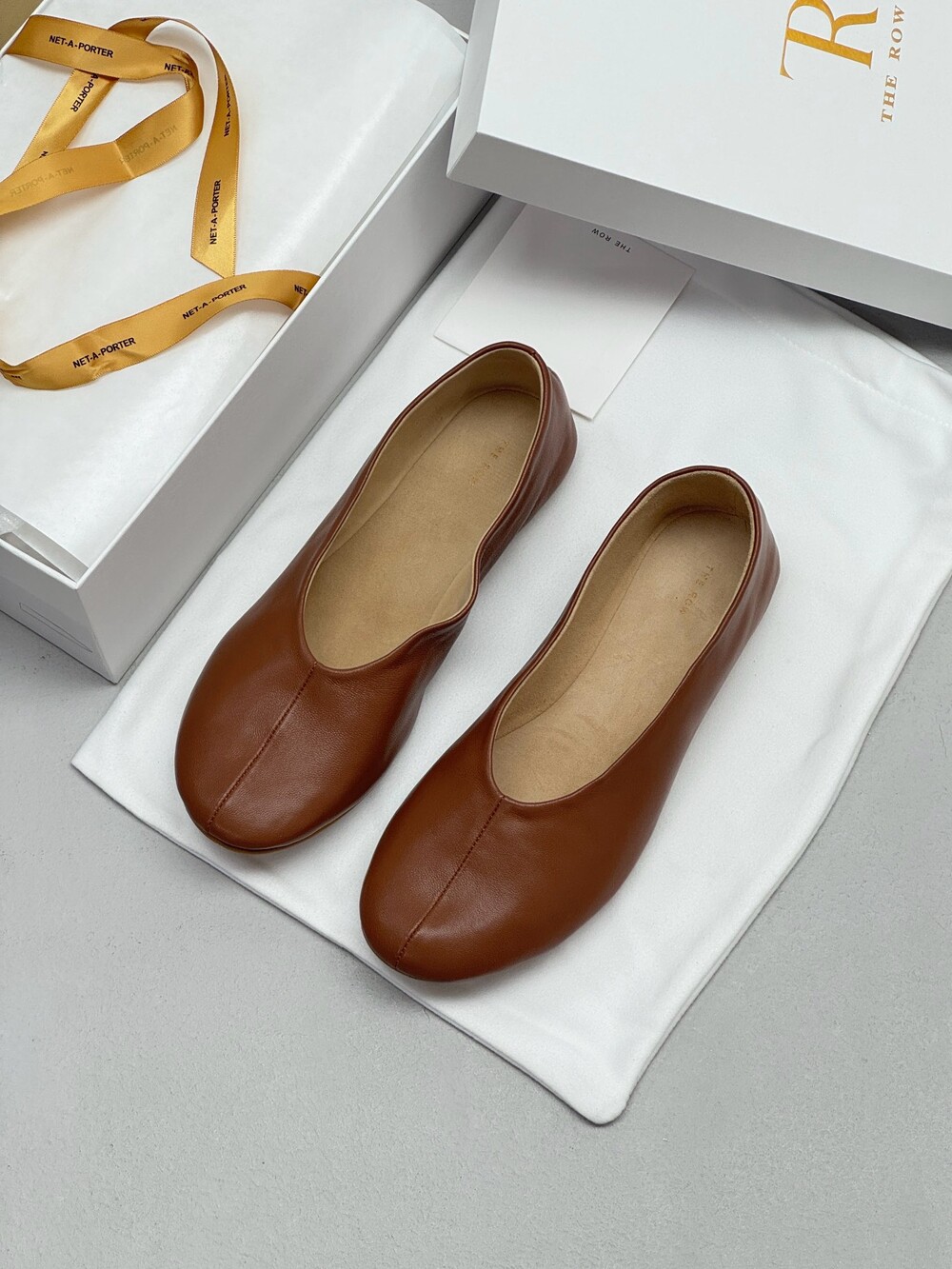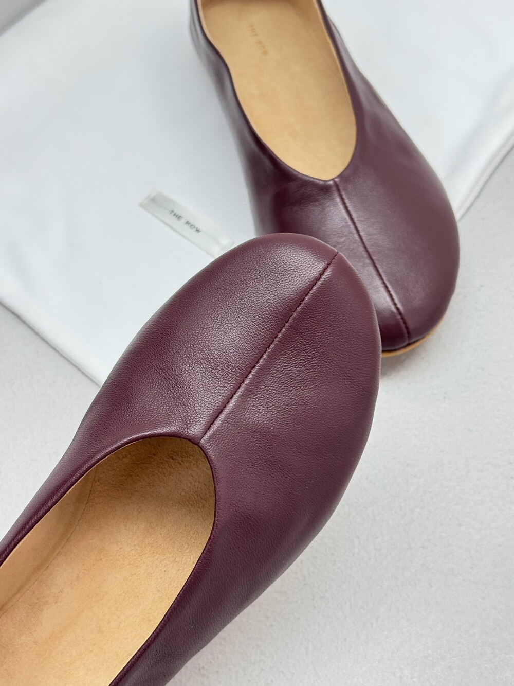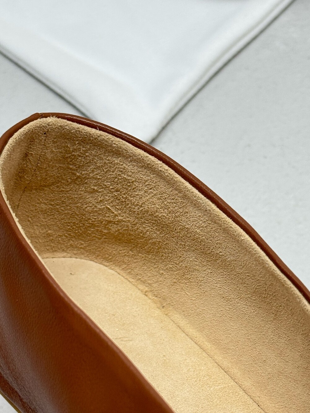 부드러운 나파 가죽 소재의 슬립온 슈즈로 타원형 토, 앞면 중앙 솔기와 유연한 고무 코팅 밑창이 특징입니다.