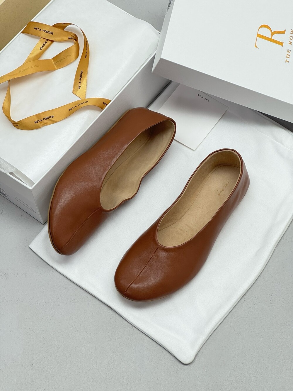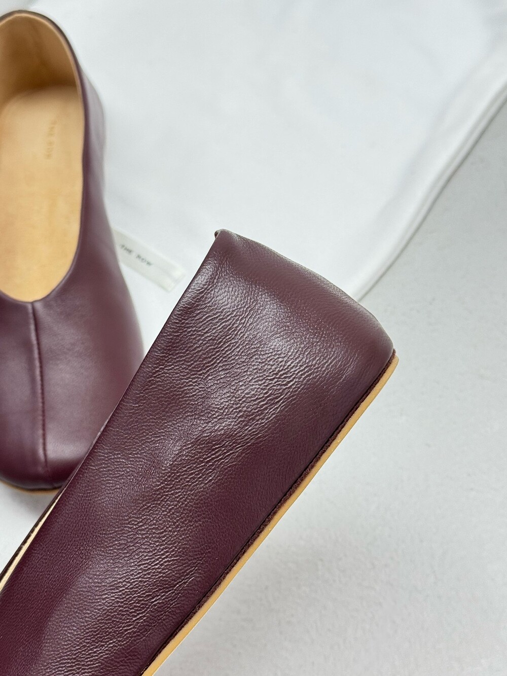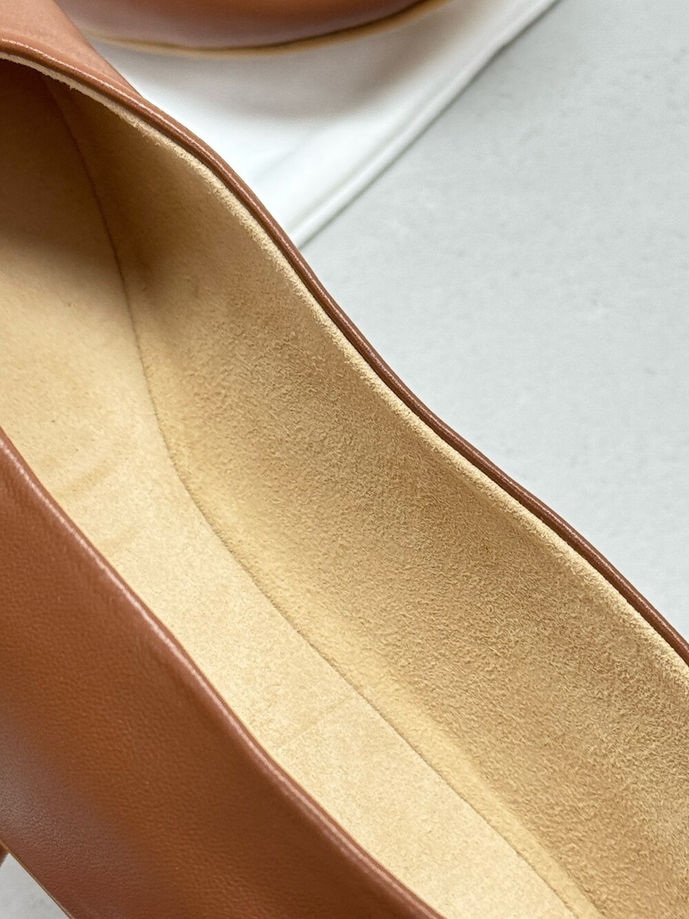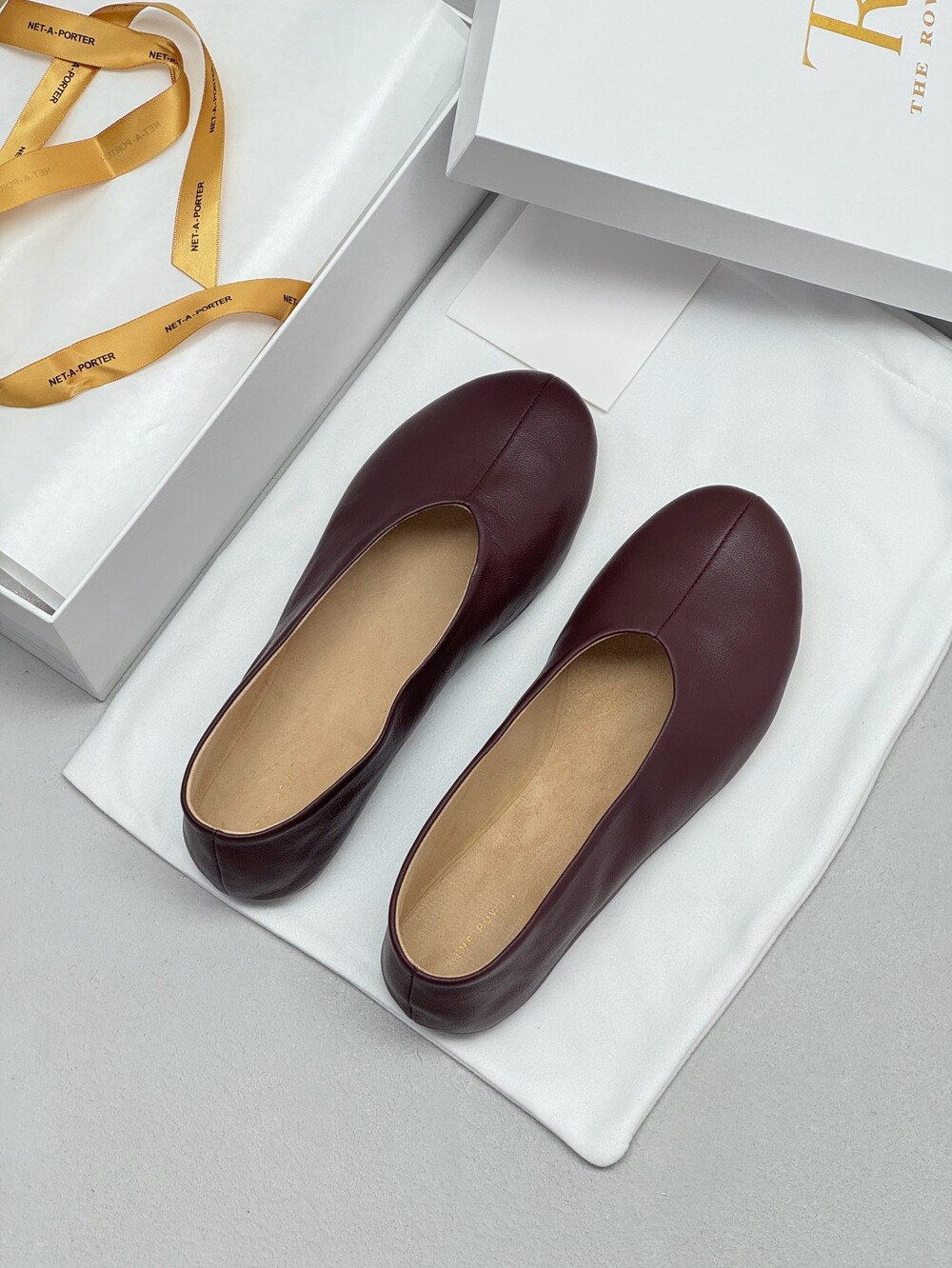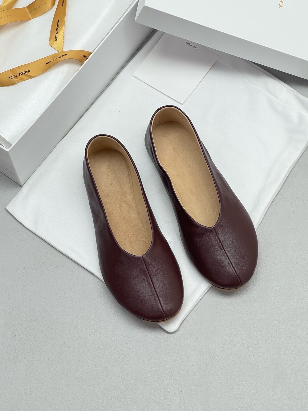 부드러운 나파 가죽 소재의 슬립온 슈즈로 타원형 토, 앞면 중앙 솔기와 유연한 고무 코팅 밑창이 특징입니다.