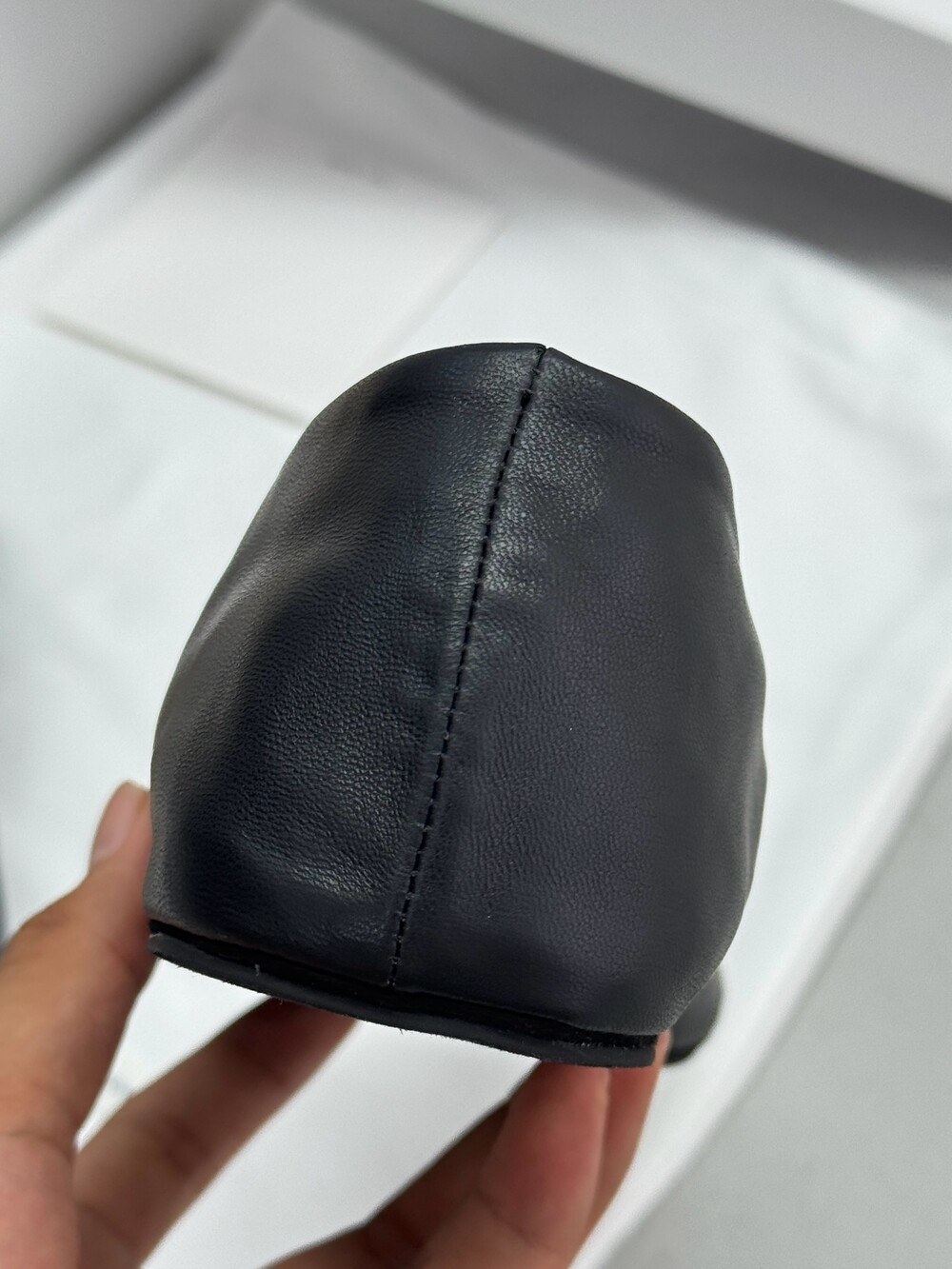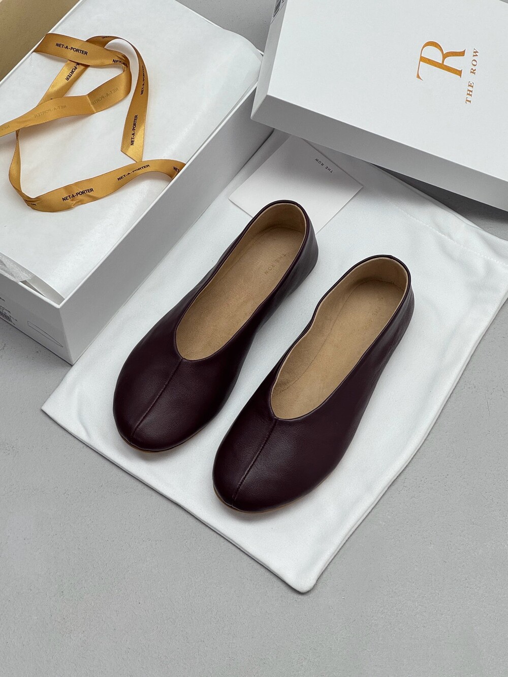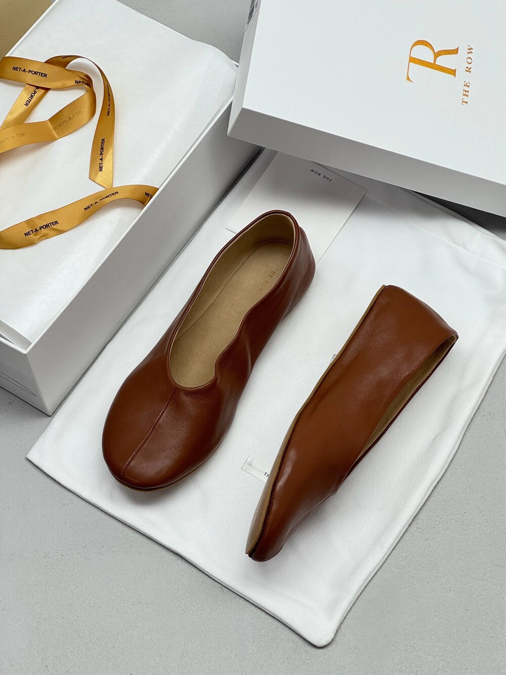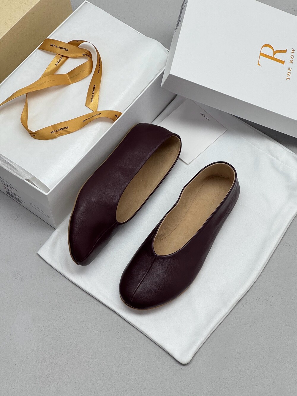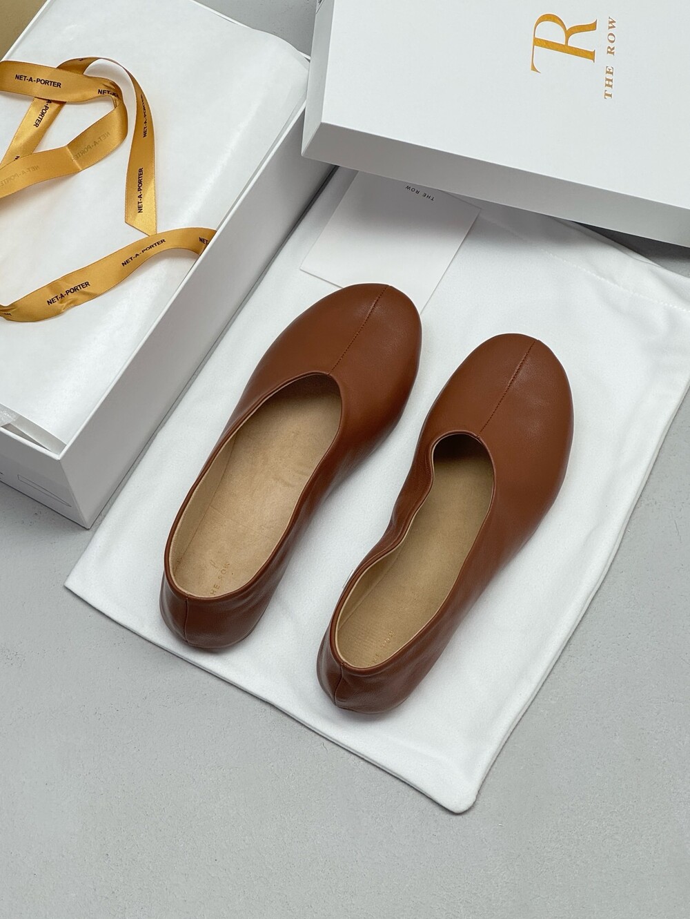 부드러운 나파 가죽 소재의 슬립온 슈즈로 타원형 토, 앞면 중앙 솔기와 유연한 고무 코팅 밑창이 특징입니다.