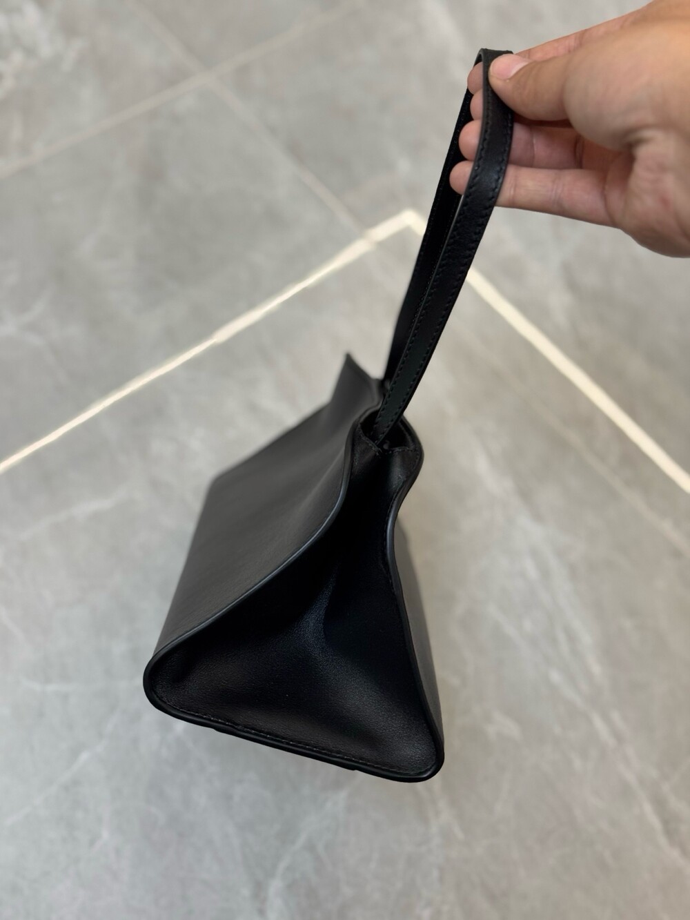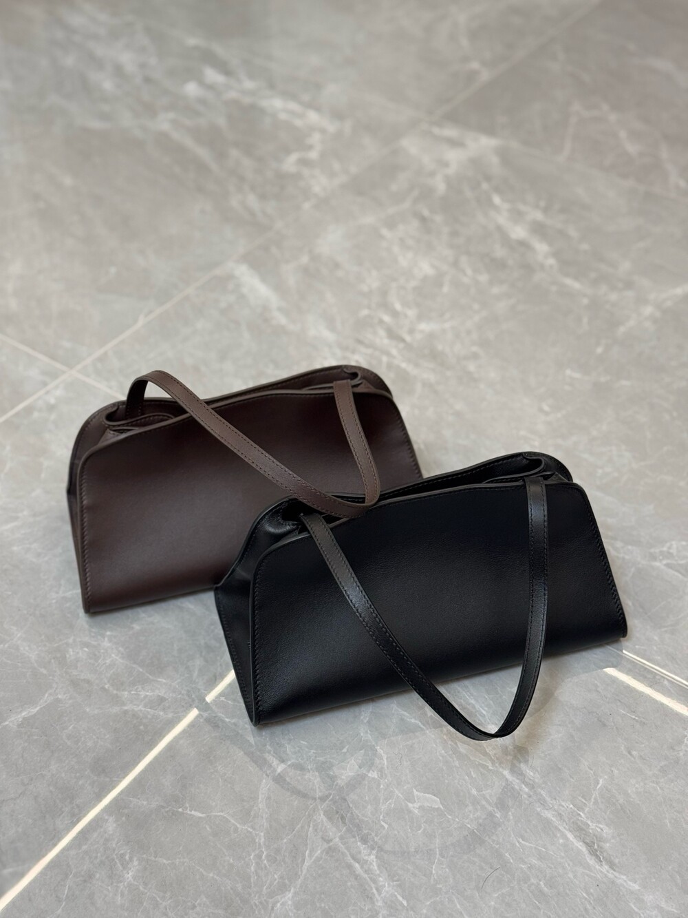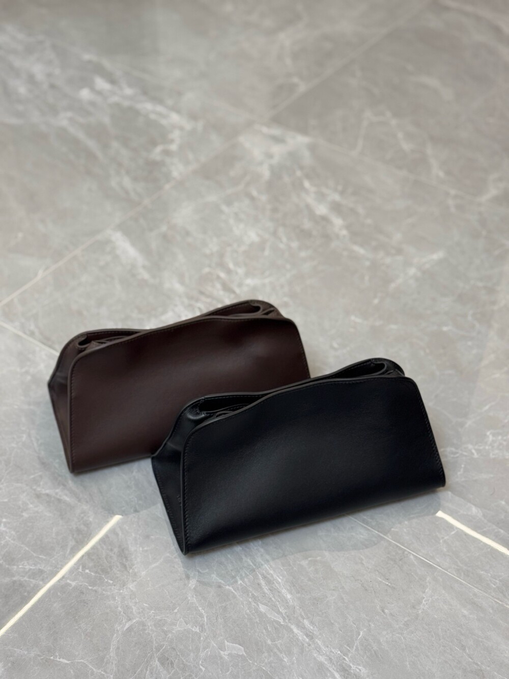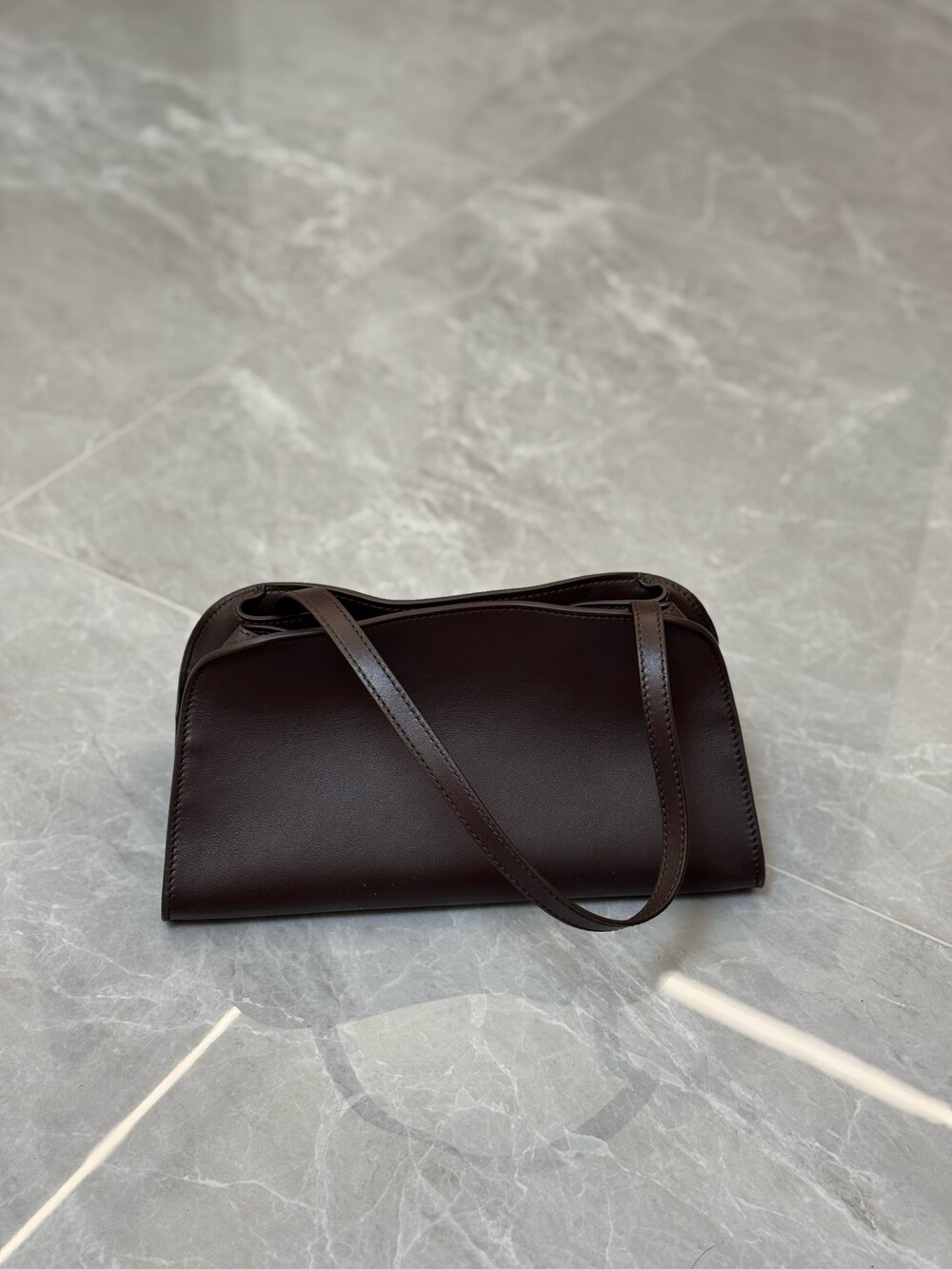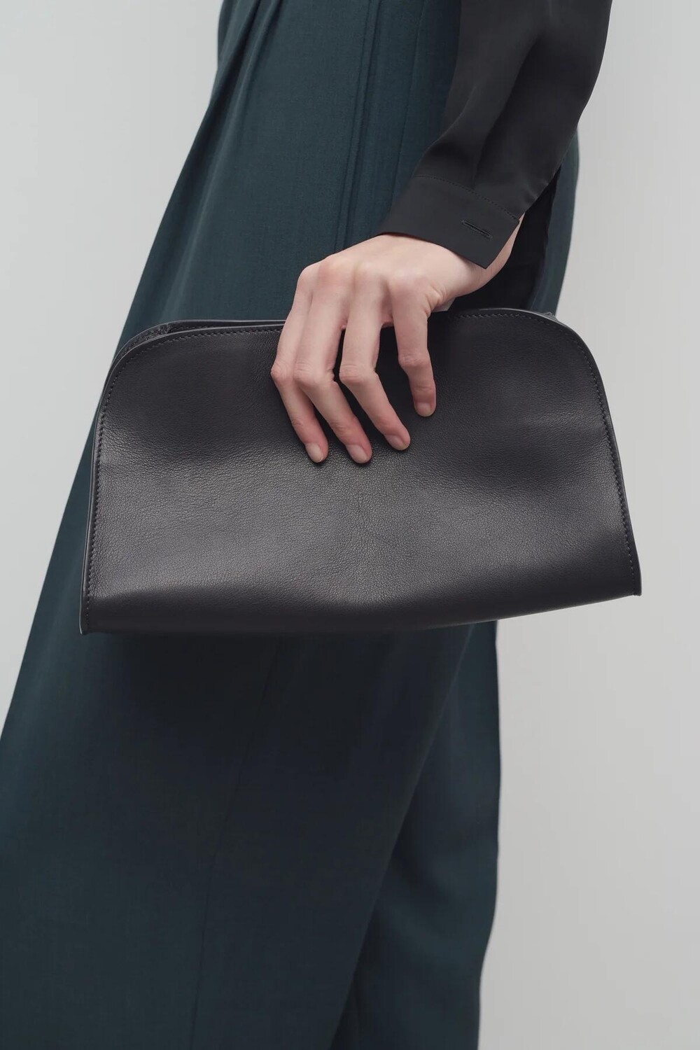폴리시드 새들 가죽 소재의 소프트 스트럭처 클러치. 싱글 숄더 스트랩 및 거싯 디테일의 사이드 패널.