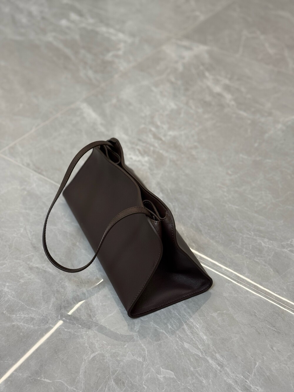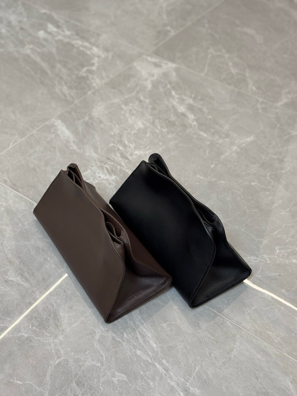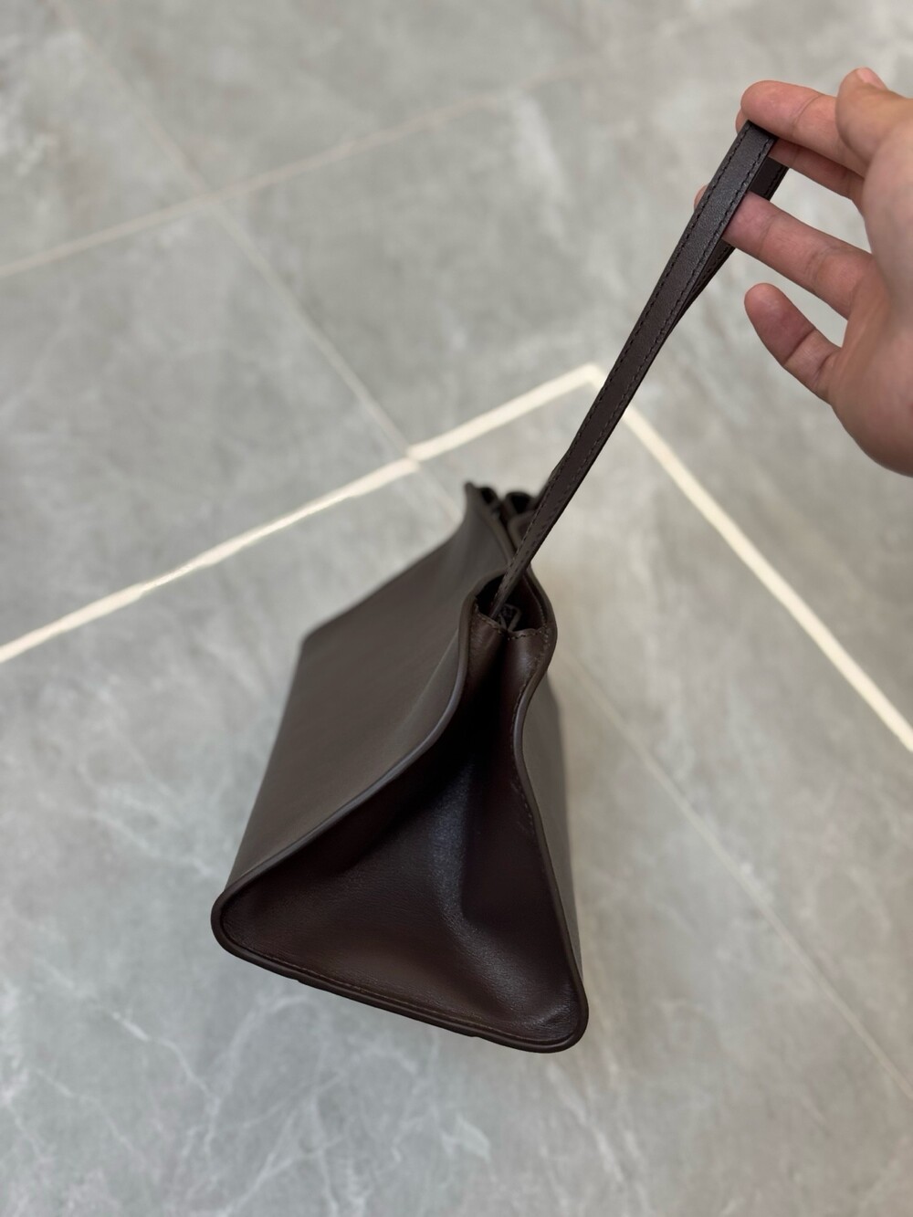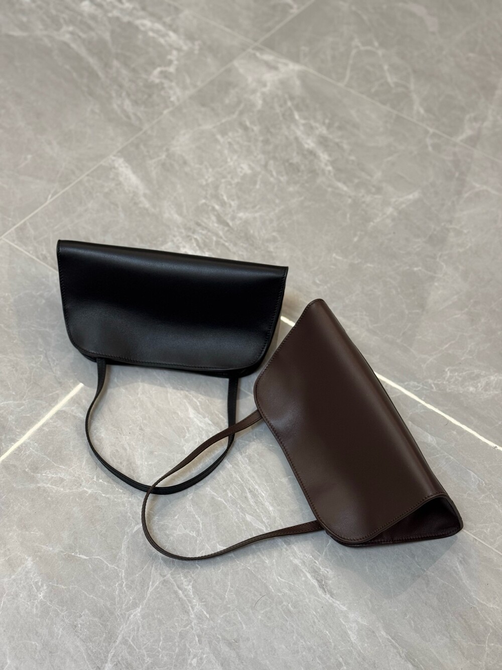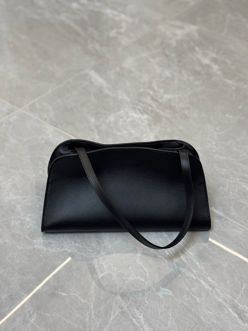 폴리시드 새들 가죽 소재의 소프트 스트럭처 클러치. 싱글 숄더 스트랩 및 거싯 디테일의 사이드 패널.