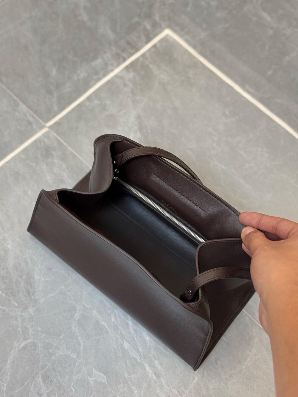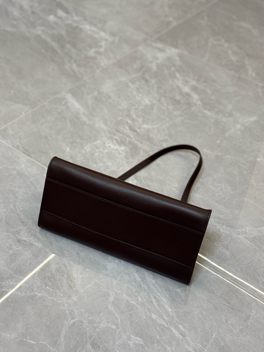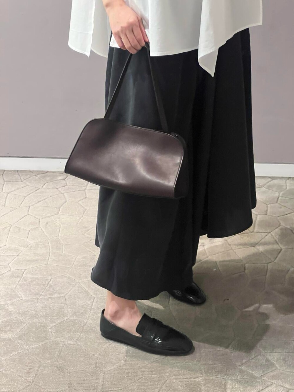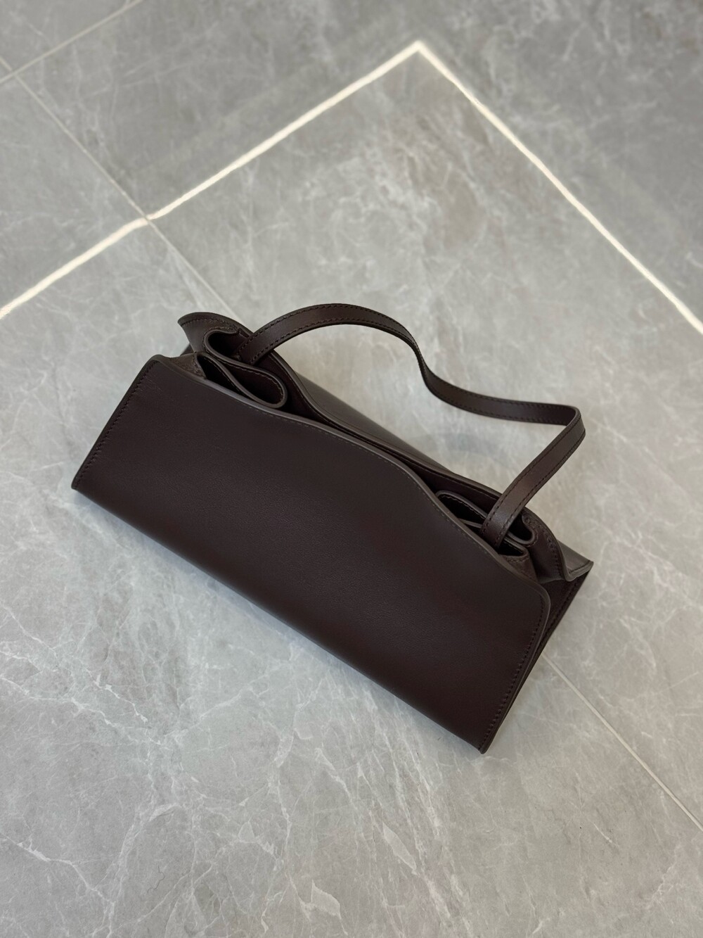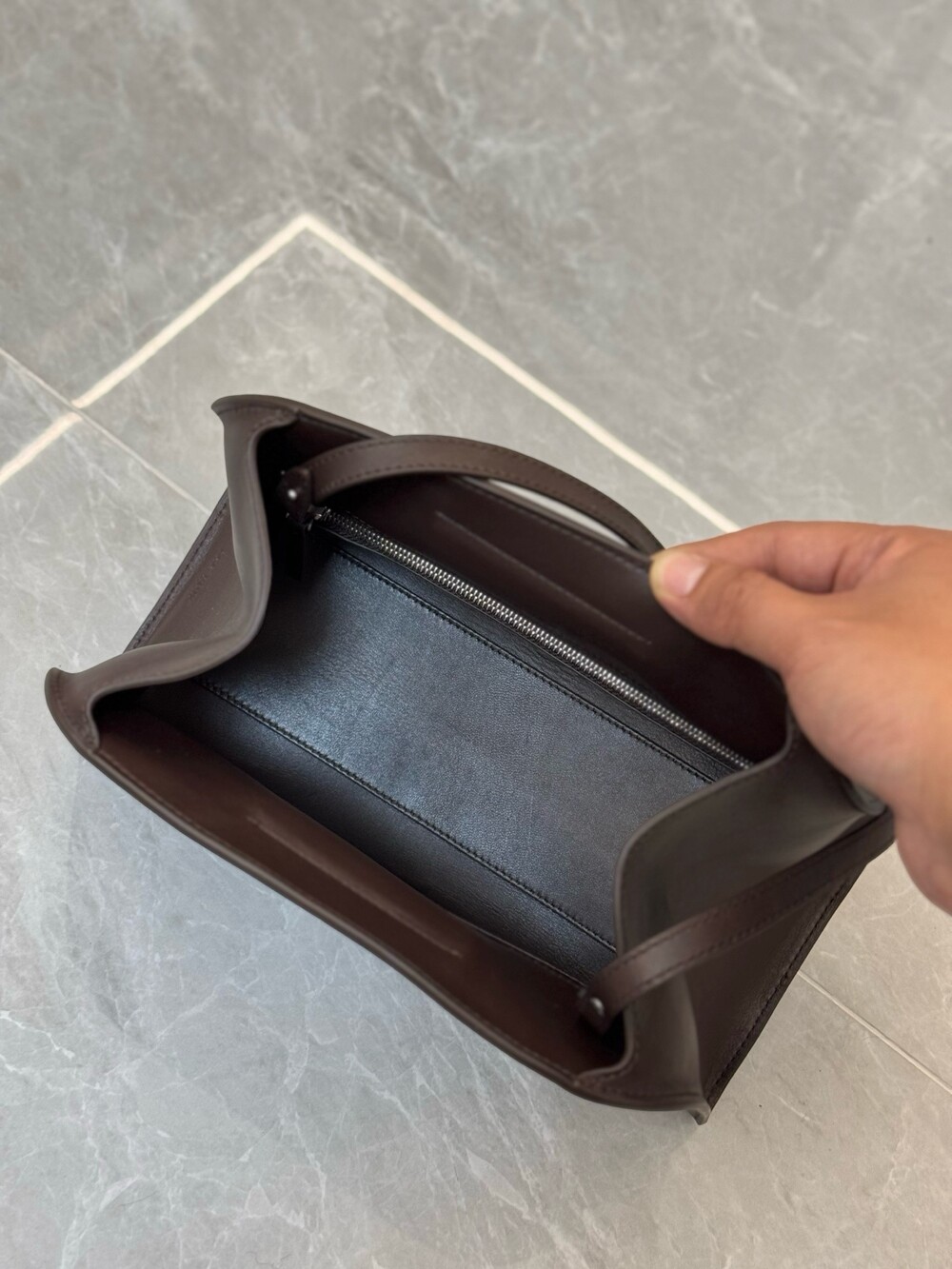폴리시드 새들 가죽 소재의 소프트 스트럭처 클러치. 싱글 숄더 스트랩 및 거싯 디테일의 사이드 패널.