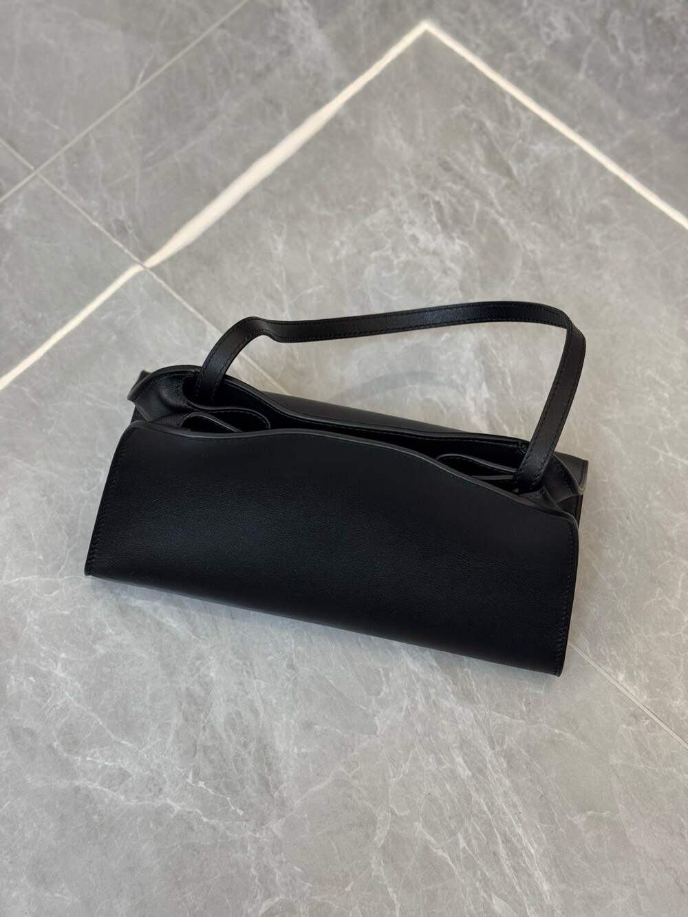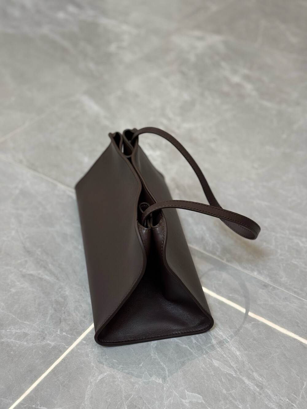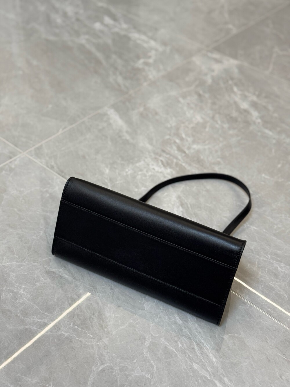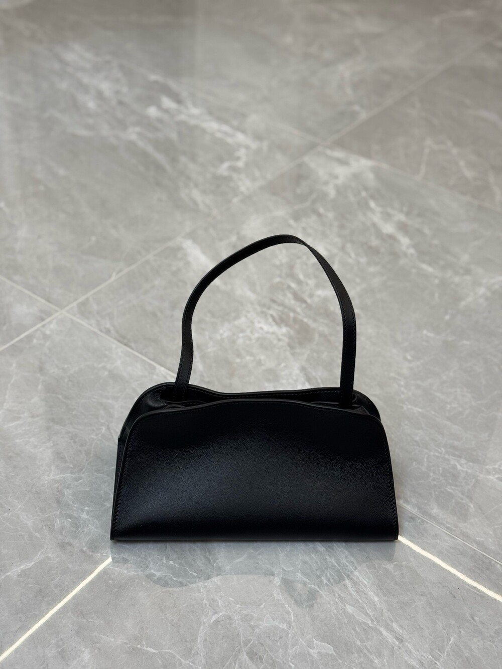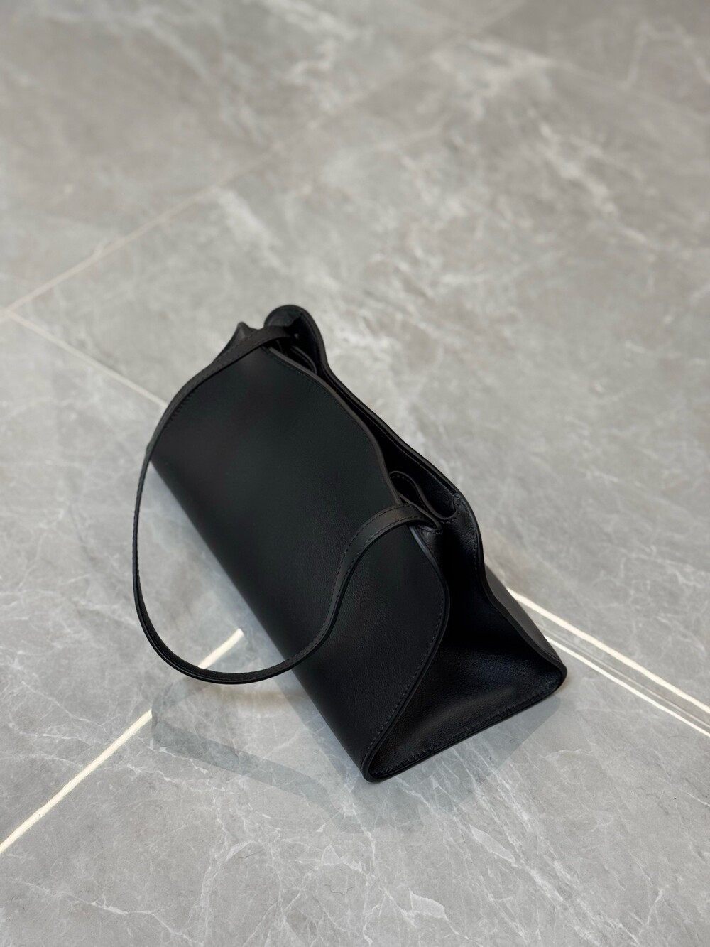 폴리시드 새들 가죽 소재의 소프트 스트럭처 클러치. 싱글 숄더 스트랩 및 거싯 디테일의 사이드 패널.