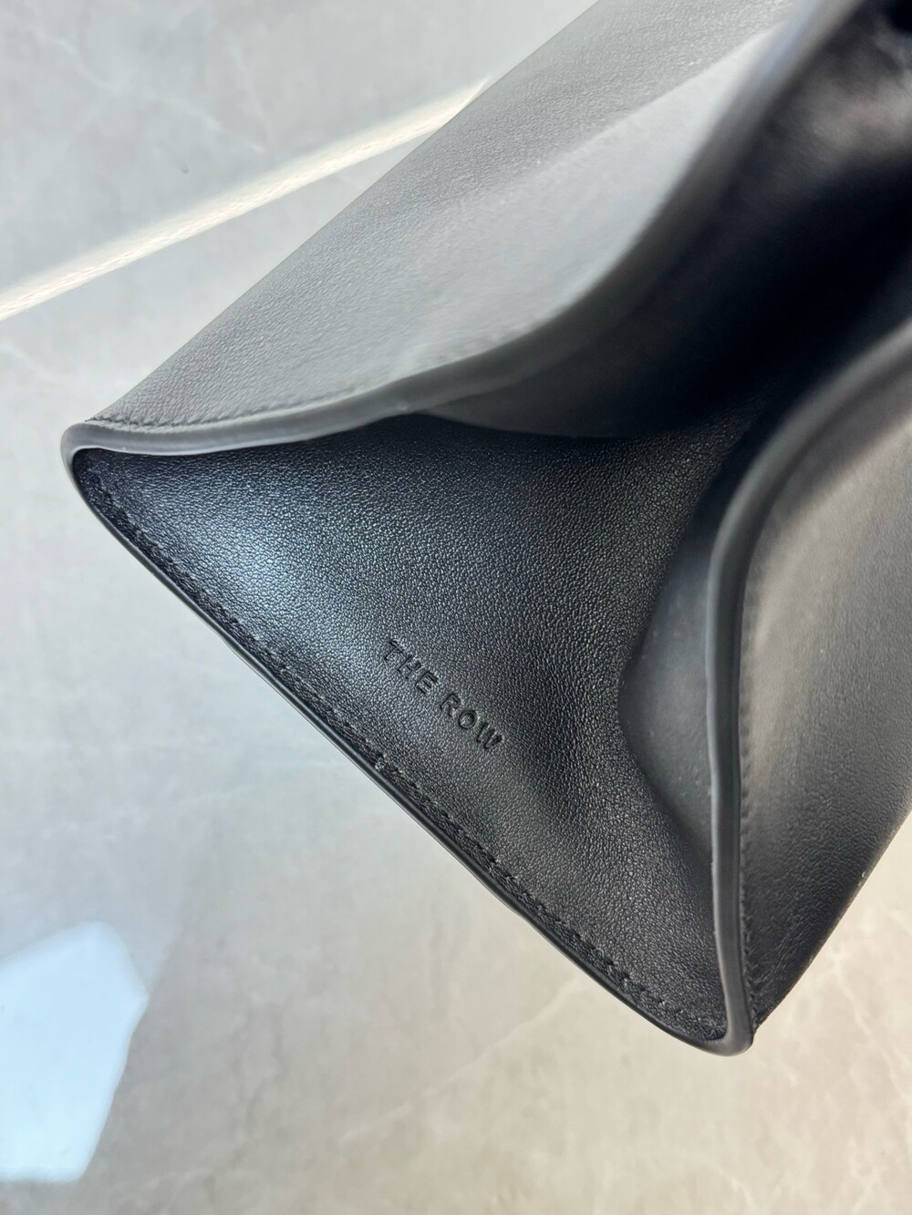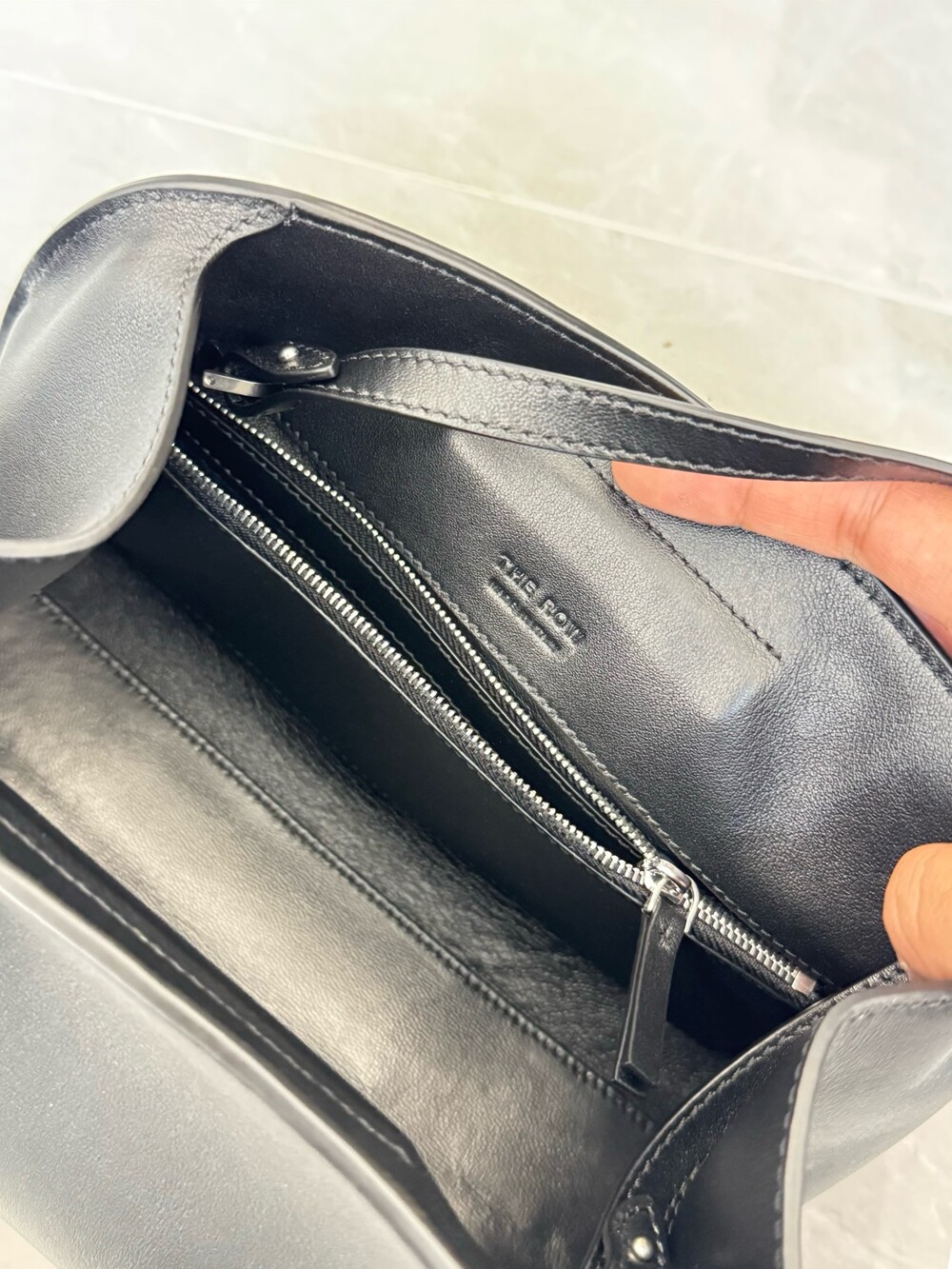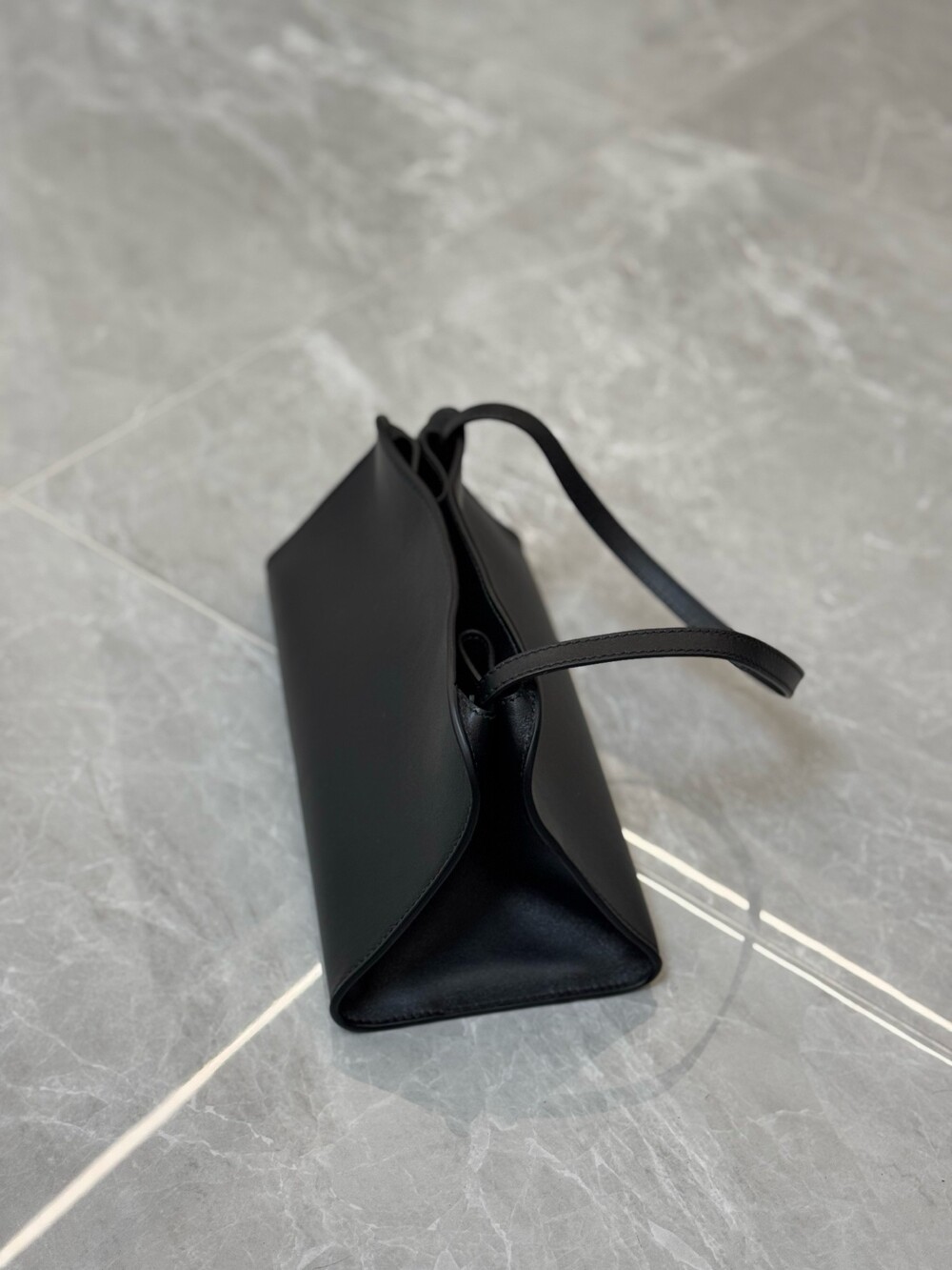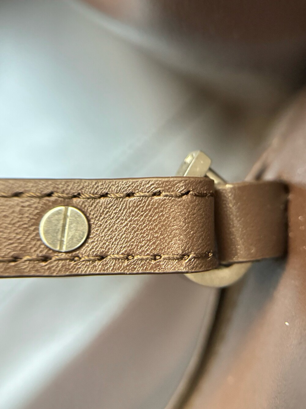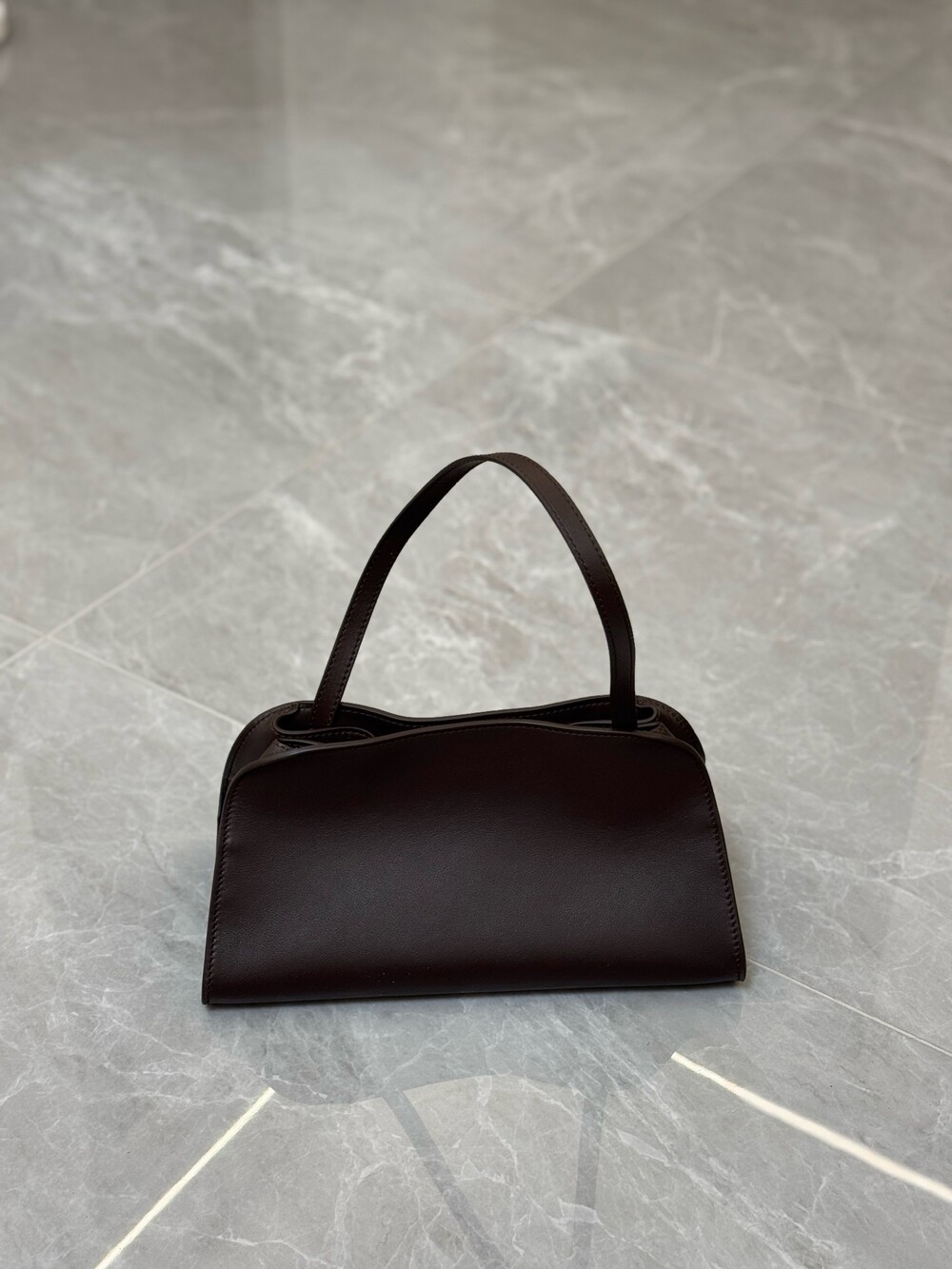 폴리시드 새들 가죽 소재의 소프트 스트럭처 클러치. 싱글 숄더 스트랩 및 거싯 디테일의 사이드 패널.