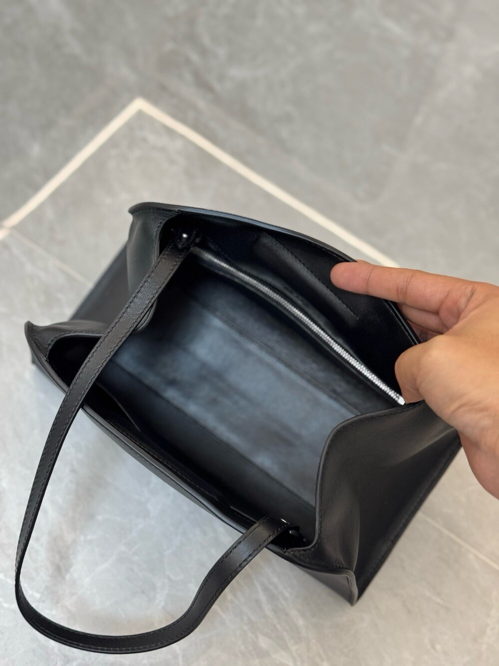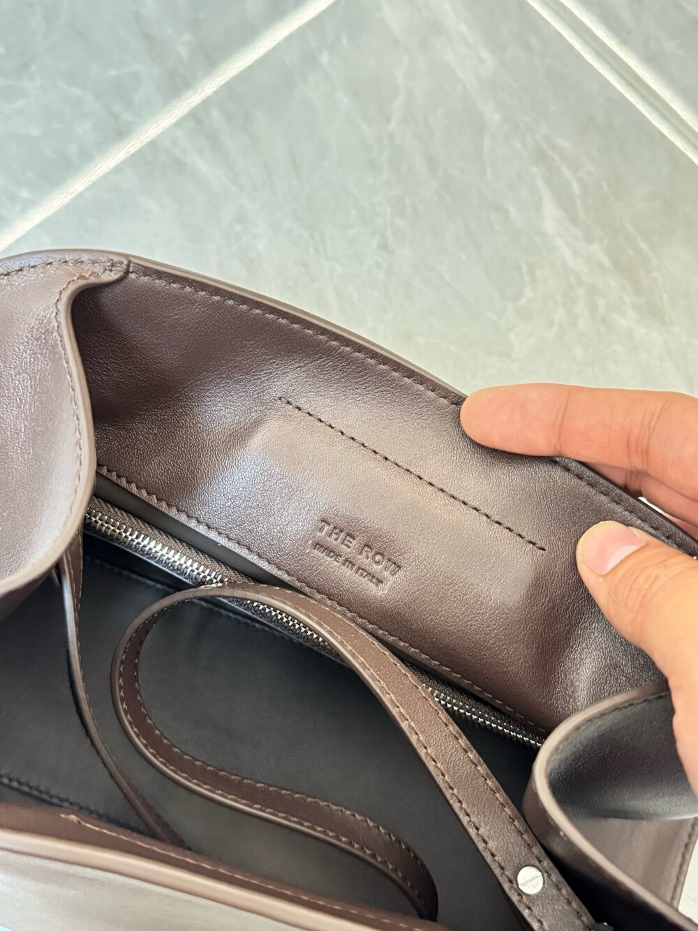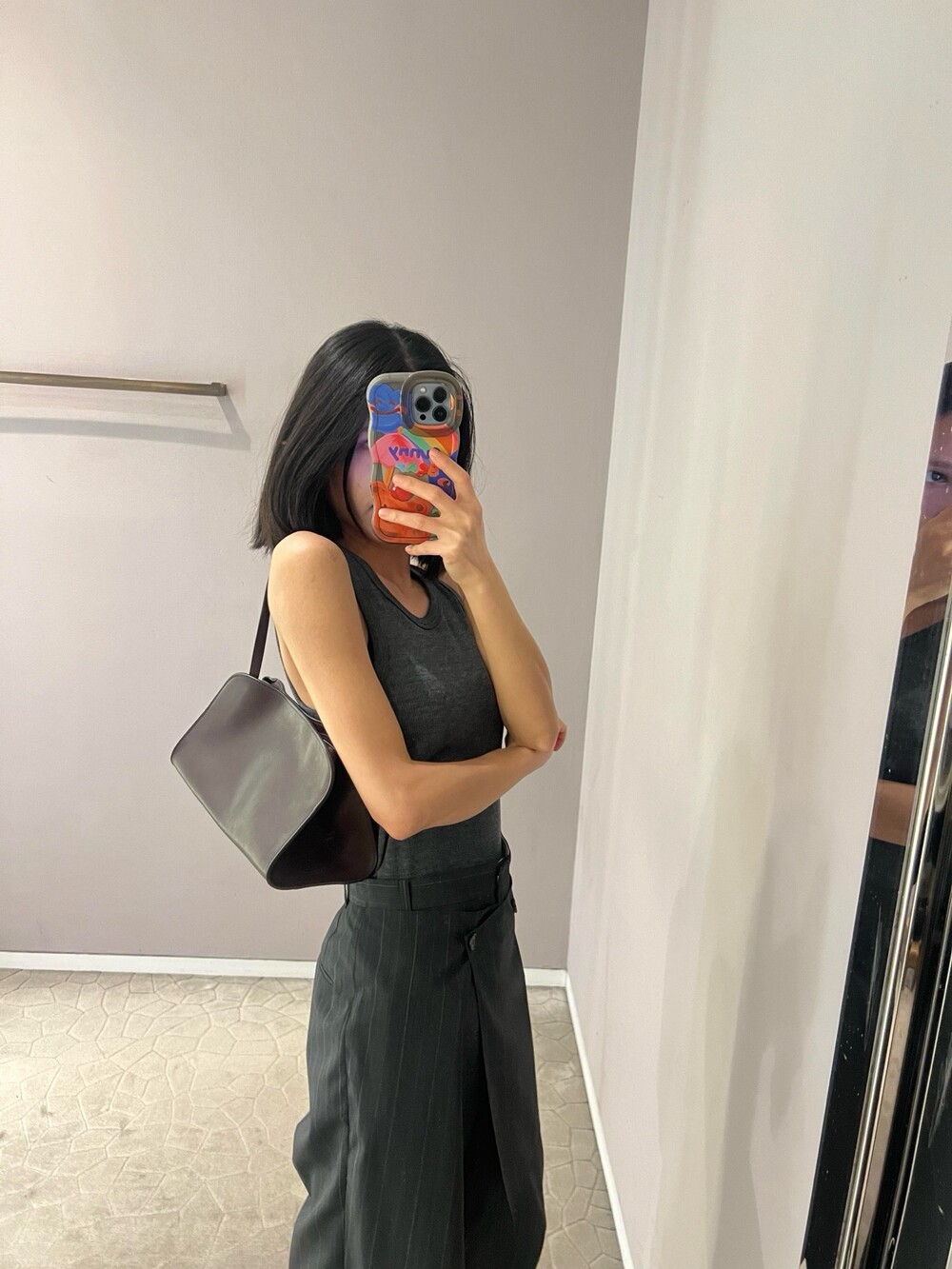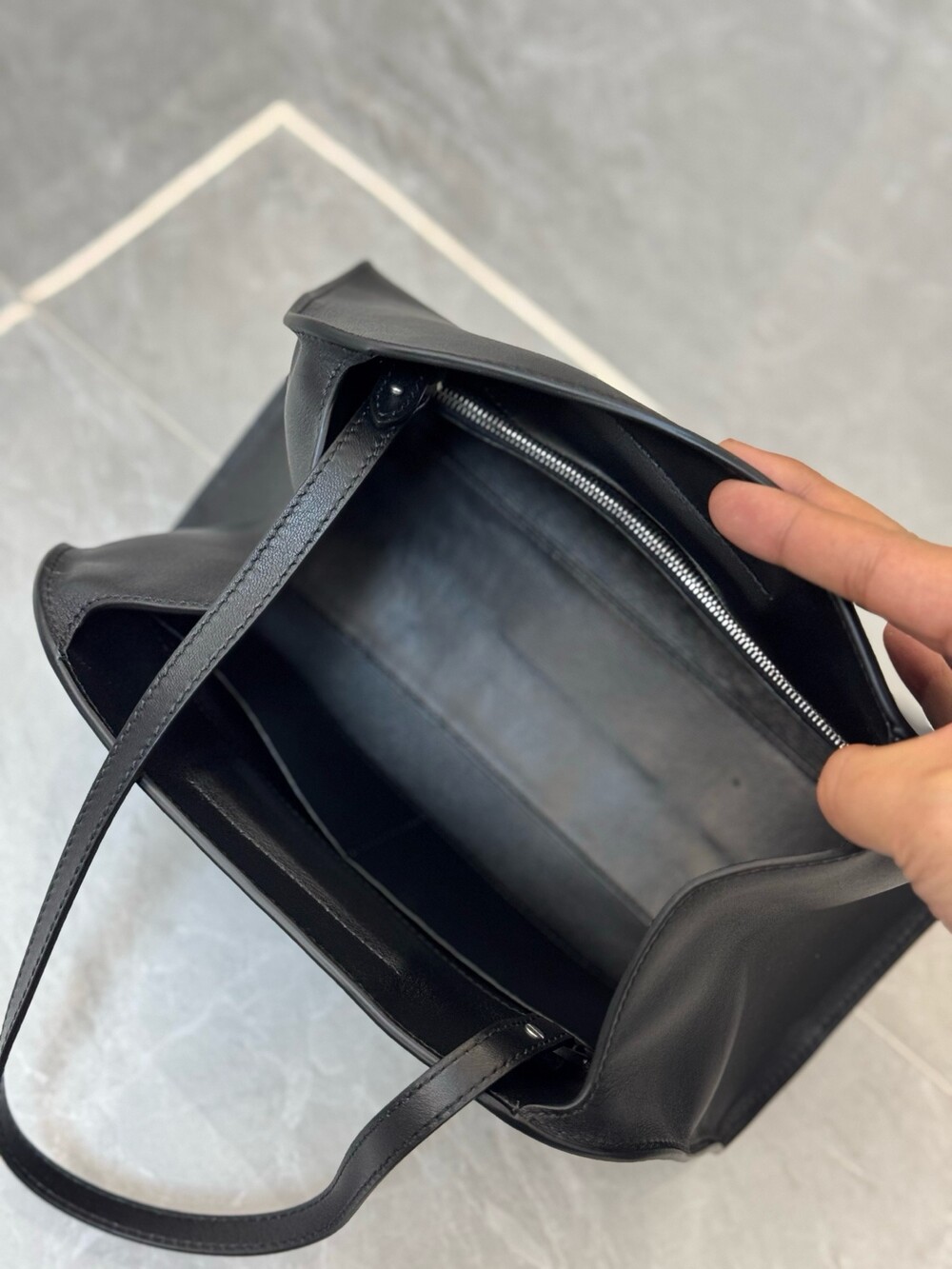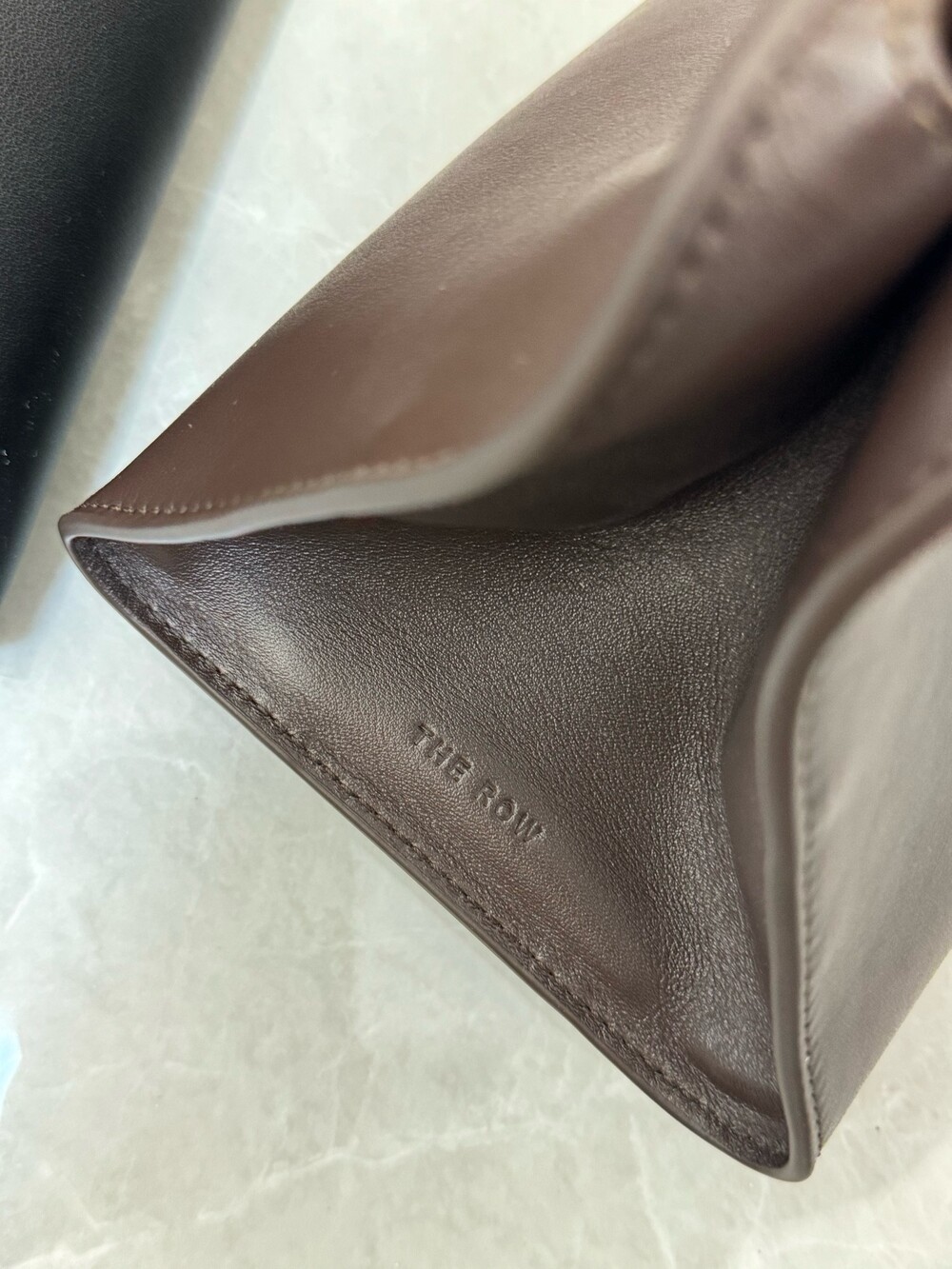 폴리시드 새들 가죽 소재의 소프트 스트럭처 클러치. 싱글 숄더 스트랩 및 거싯 디테일의 사이드 패널.