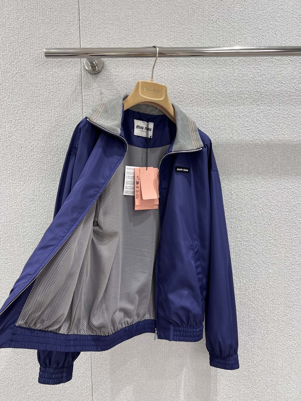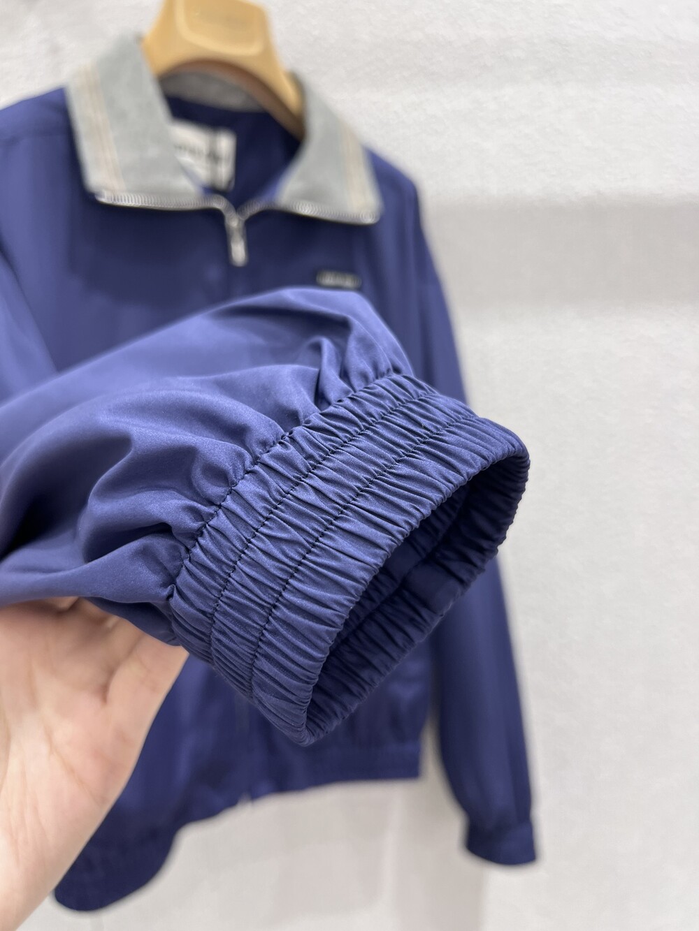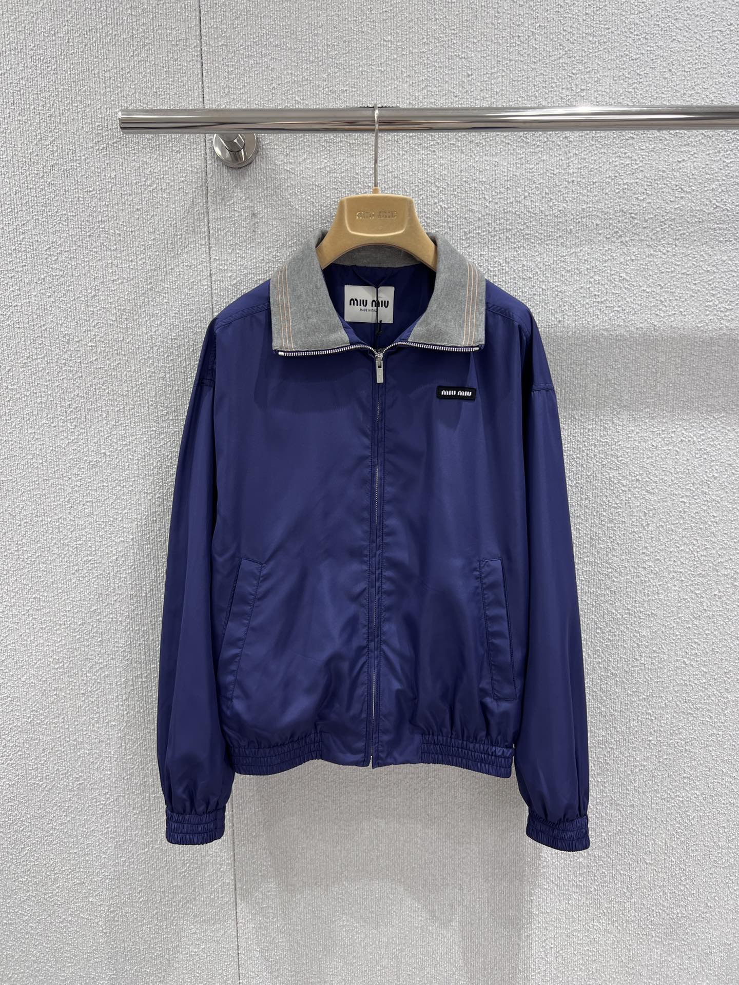 미우미우 특유의 스포티하고 클래식한 코드가 담긴 오버사이즈 핏의 테크니컬 포플린 블루종 재킷입니다. 정교한 니트 칼라와 로고 라벨 디테일이 아이코닉한 스타일을 완성합니다.