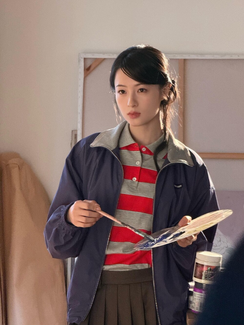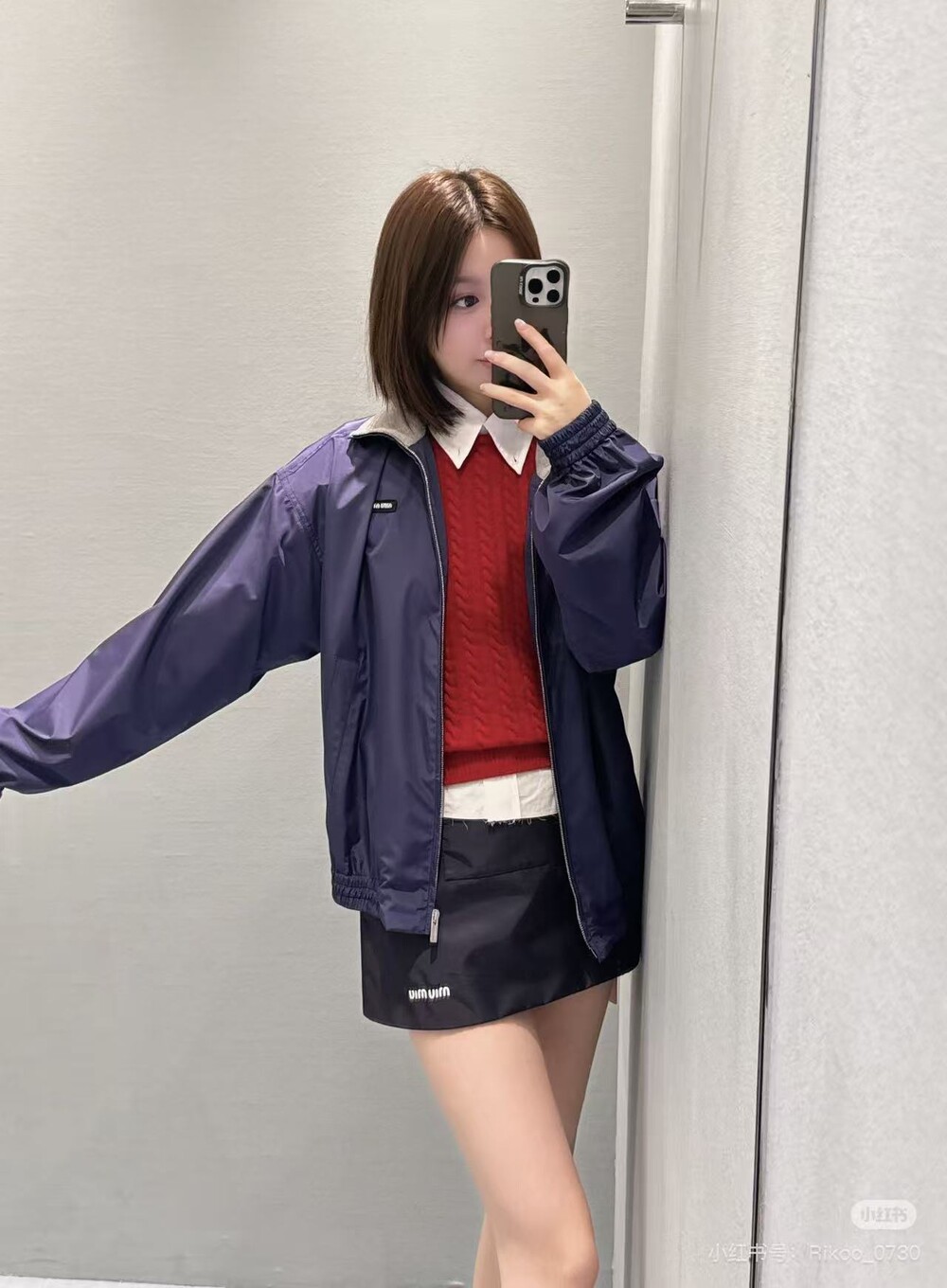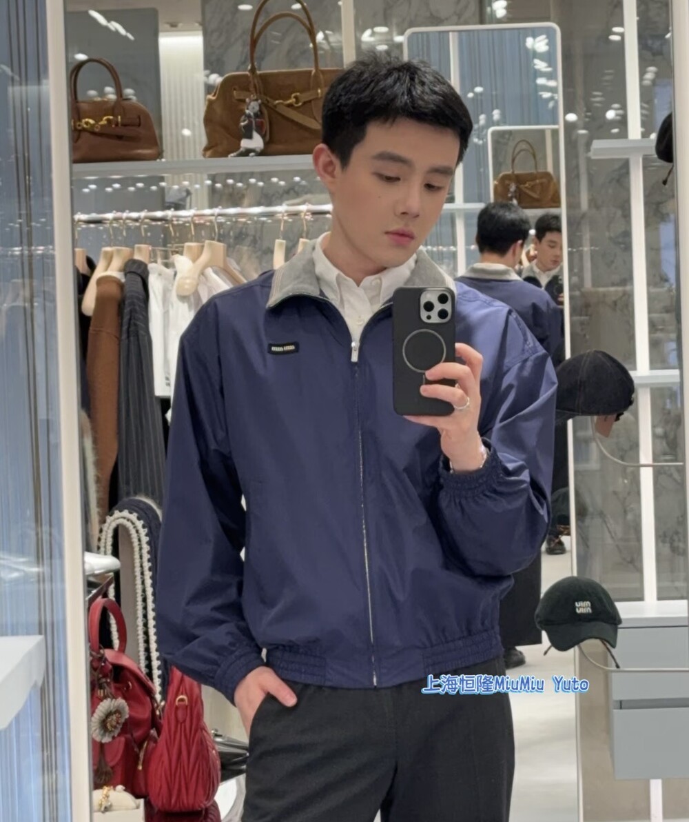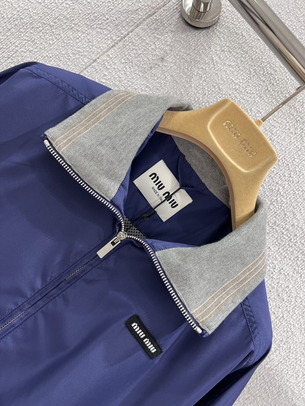미우미우 특유의 스포티하고 클래식한 코드가 담긴 오버사이즈 핏의 테크니컬 포플린 블루종 재킷입니다. 정교한 니트 칼라와 로고 라벨 디테일이 아이코닉한 스타일을 완성합니다.