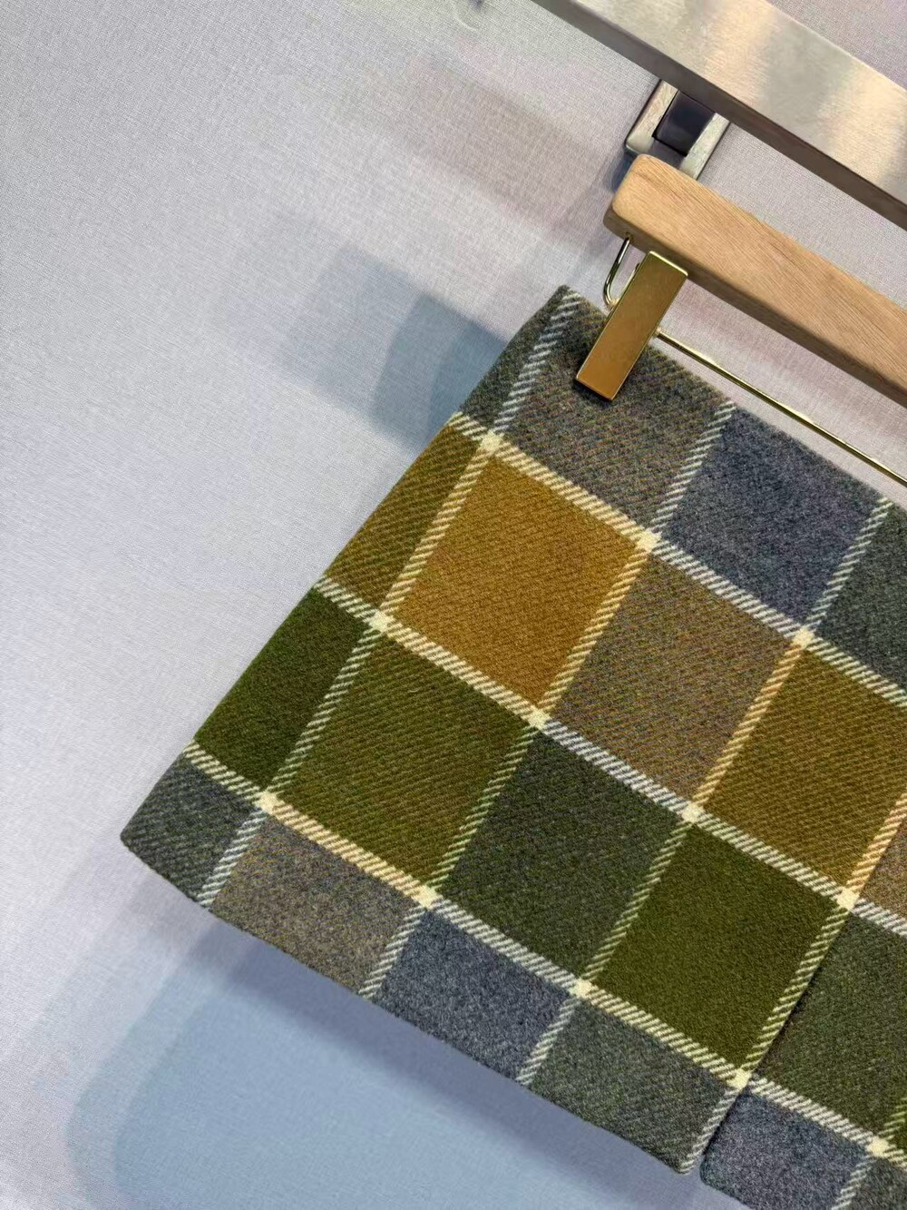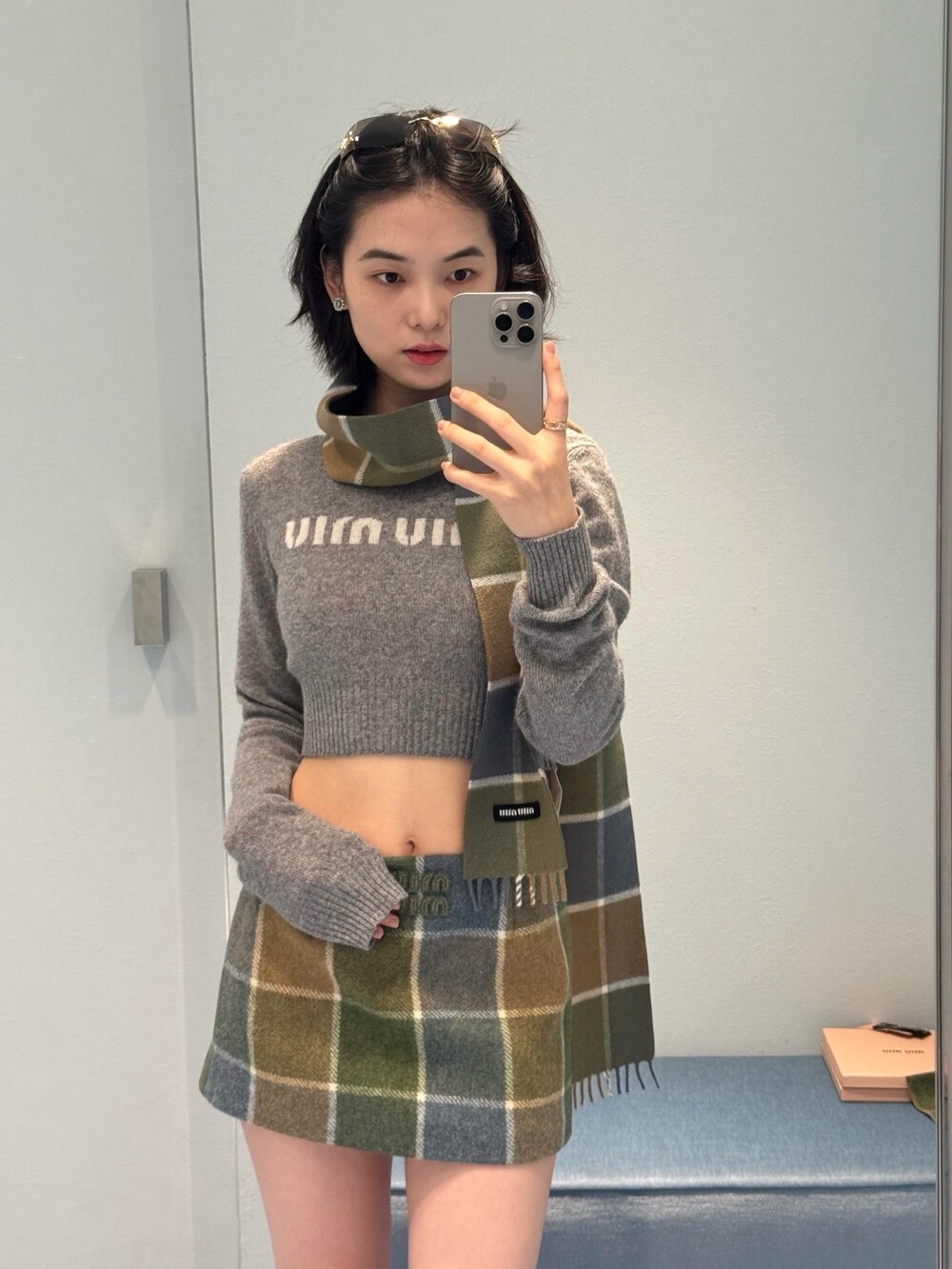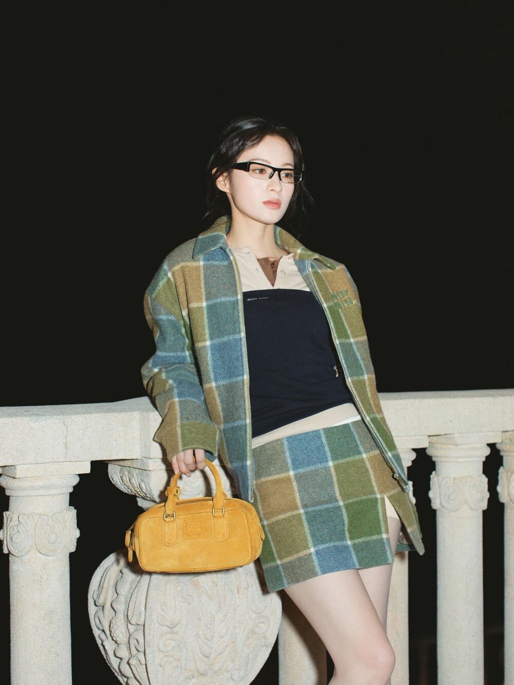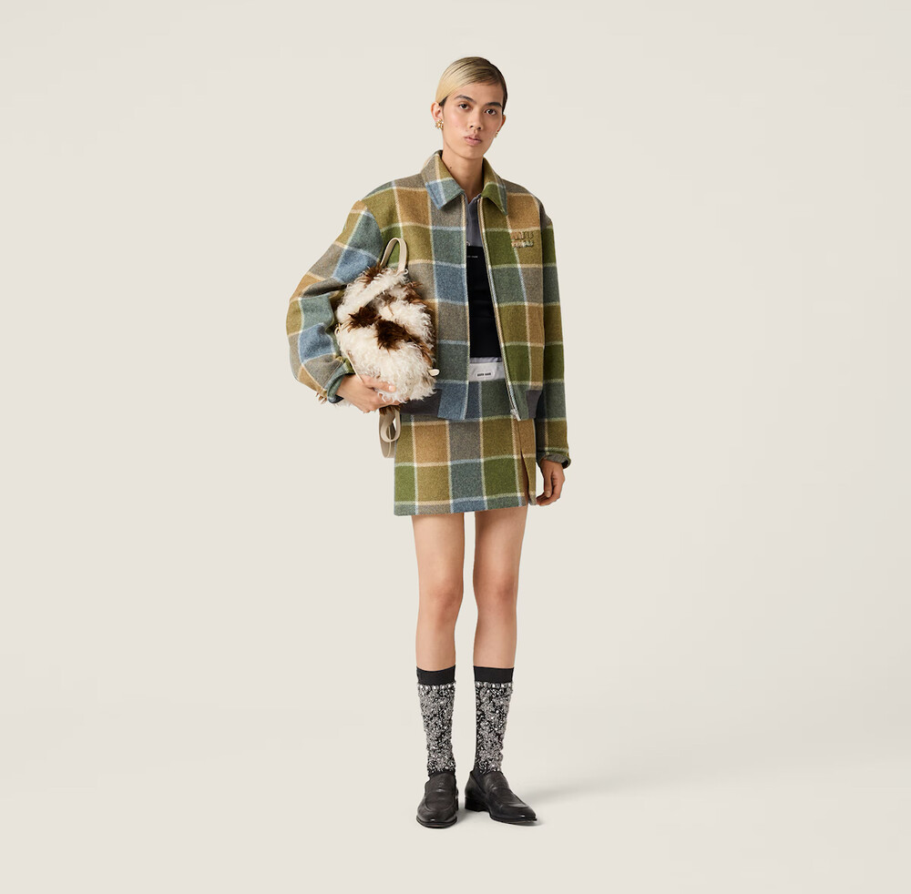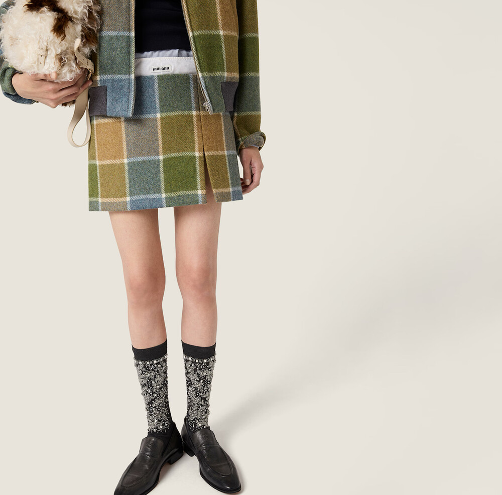 부드러운 톤의 클래식한 체크 패턴이 90년대 무드를 연상시키며, 슬릿 디테일이 더해진 이 울 미니 스커트에 개성을 부여합니다. 여성스럽고 대담한 실루엣이 미우미우 아카이브 아이콘에서 영감을 받아 재해석되었습니다.