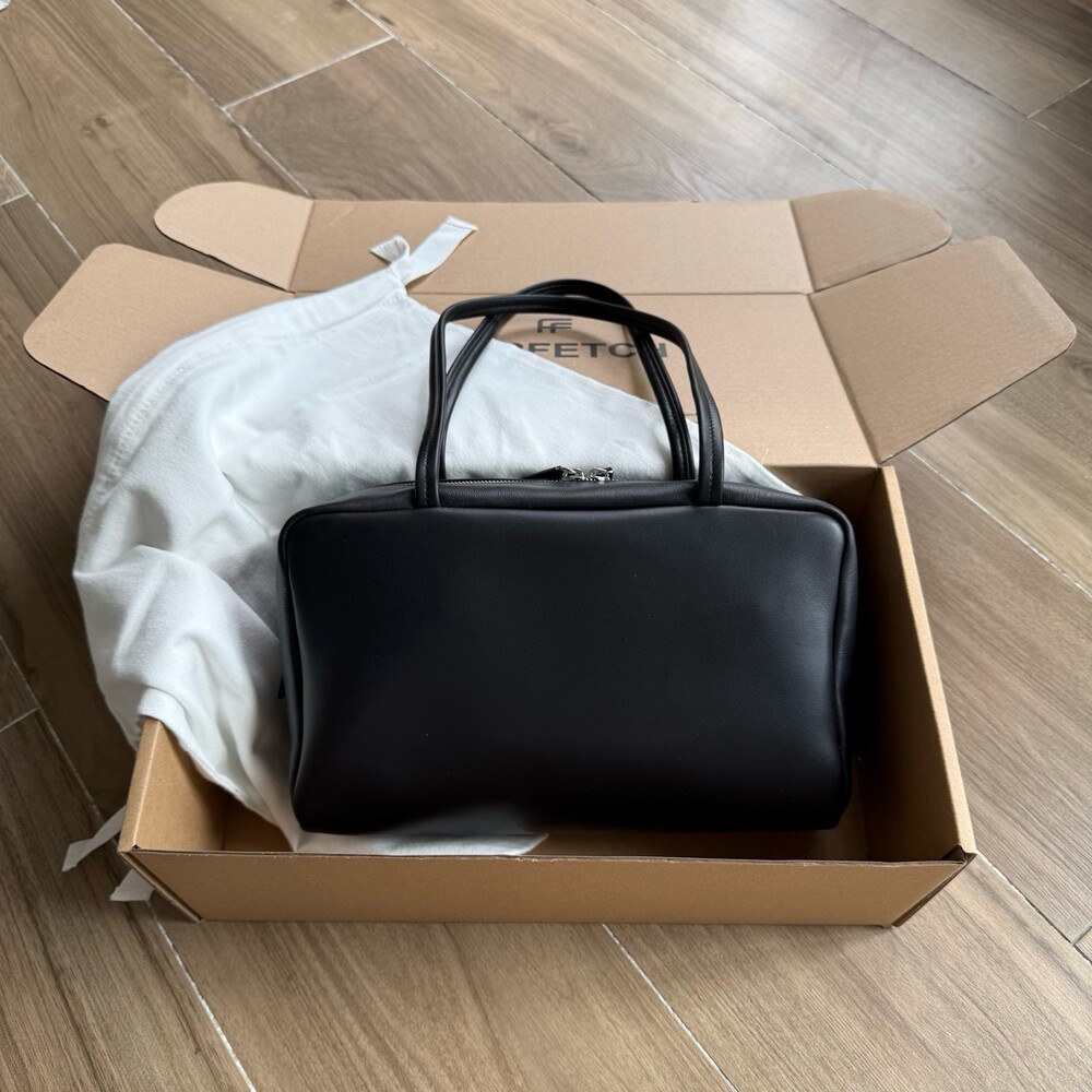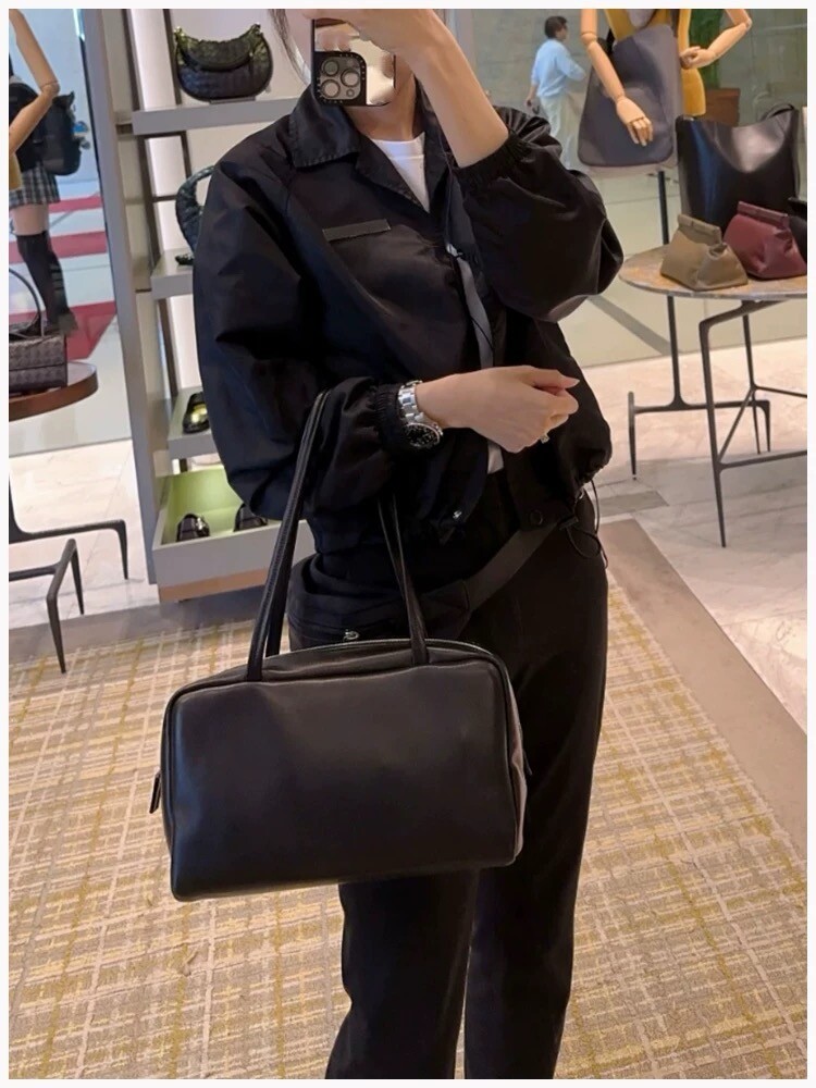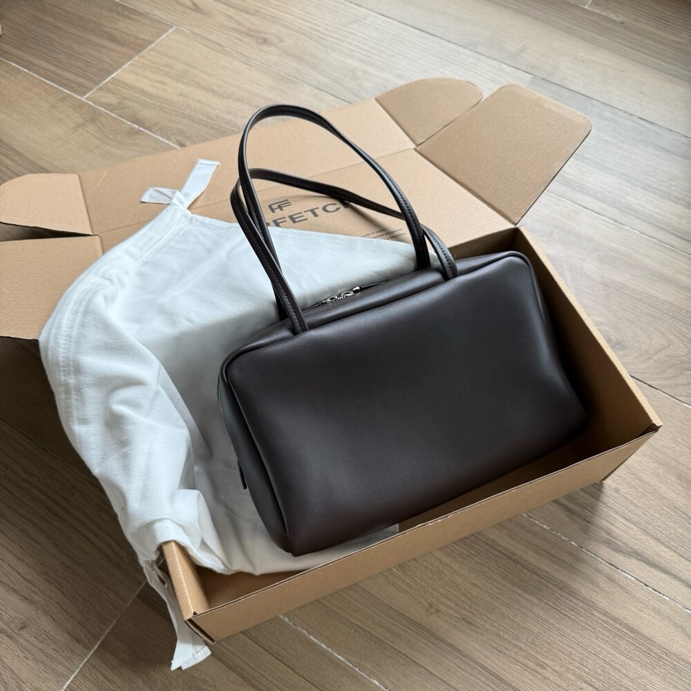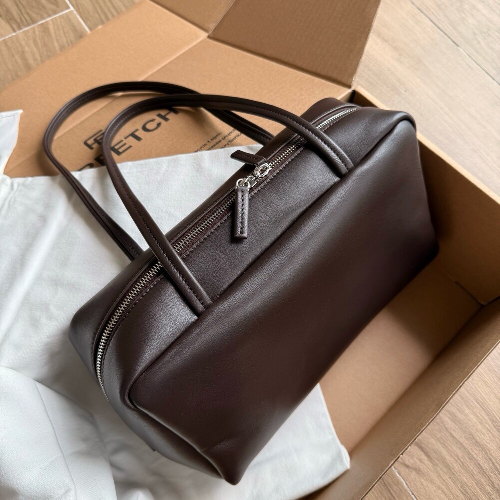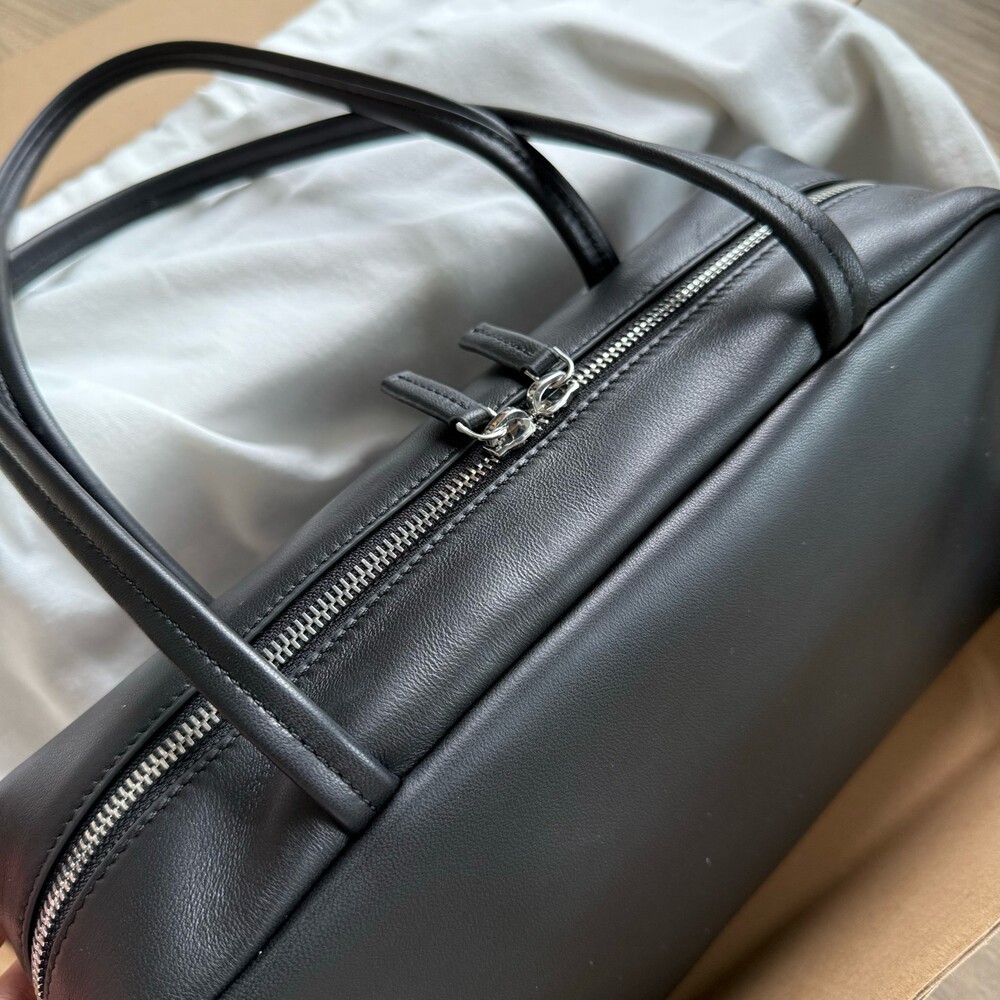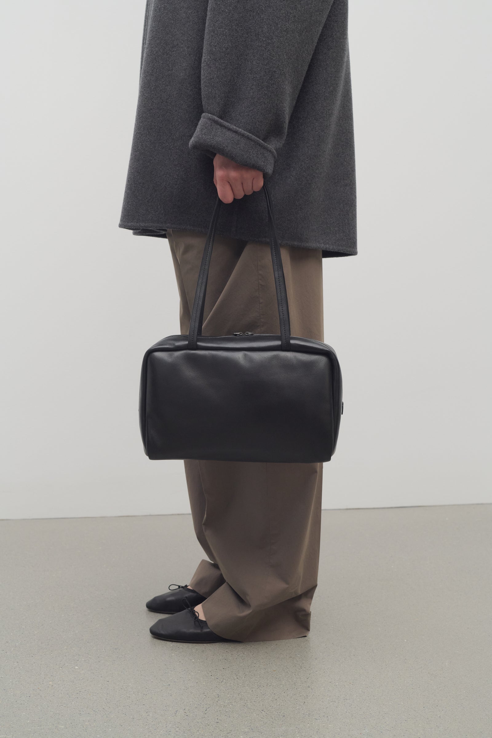 매끄러운 나파 가죽 소재의 소프트 볼링 백. 터닝 엣지 마감한 디자인, 긴 플랫 핸들, 듀얼 지퍼 클로저.