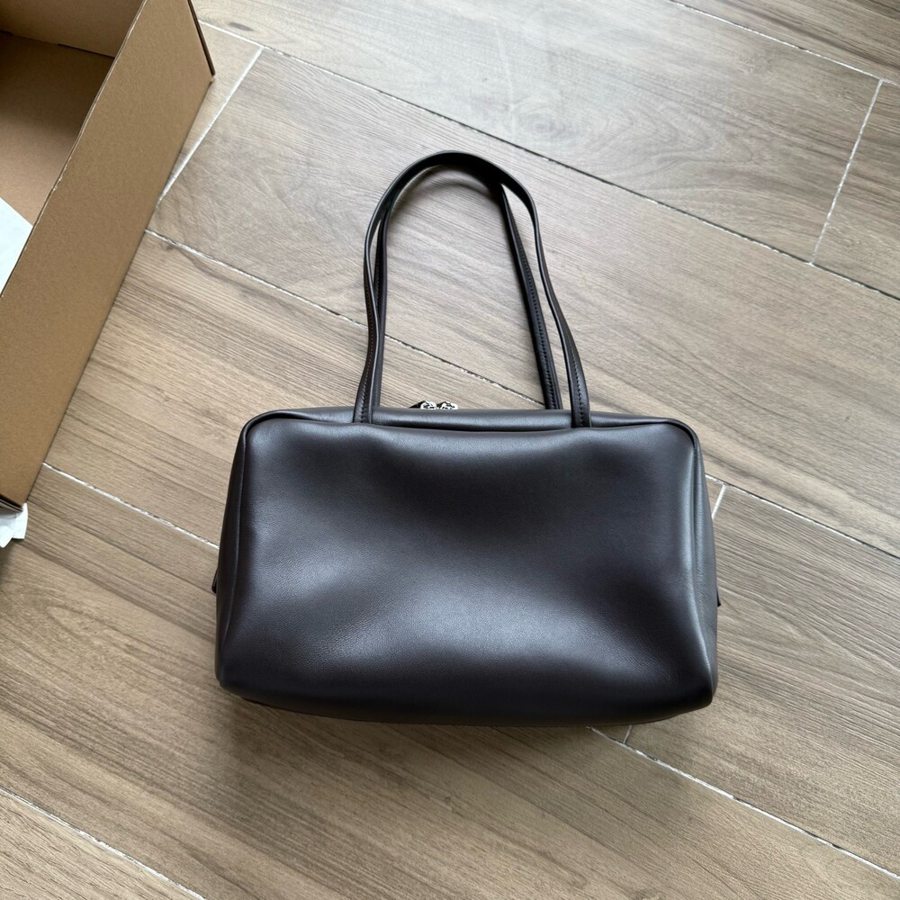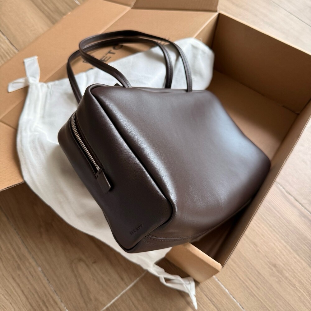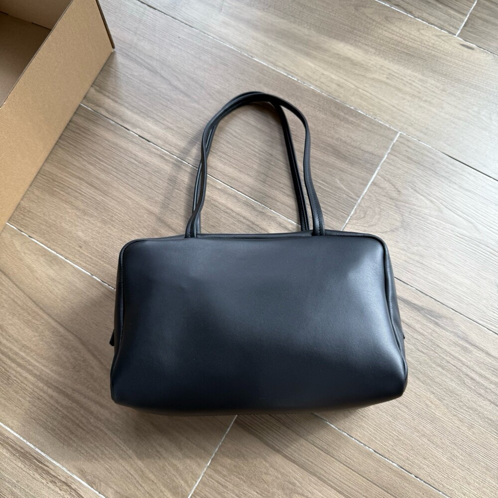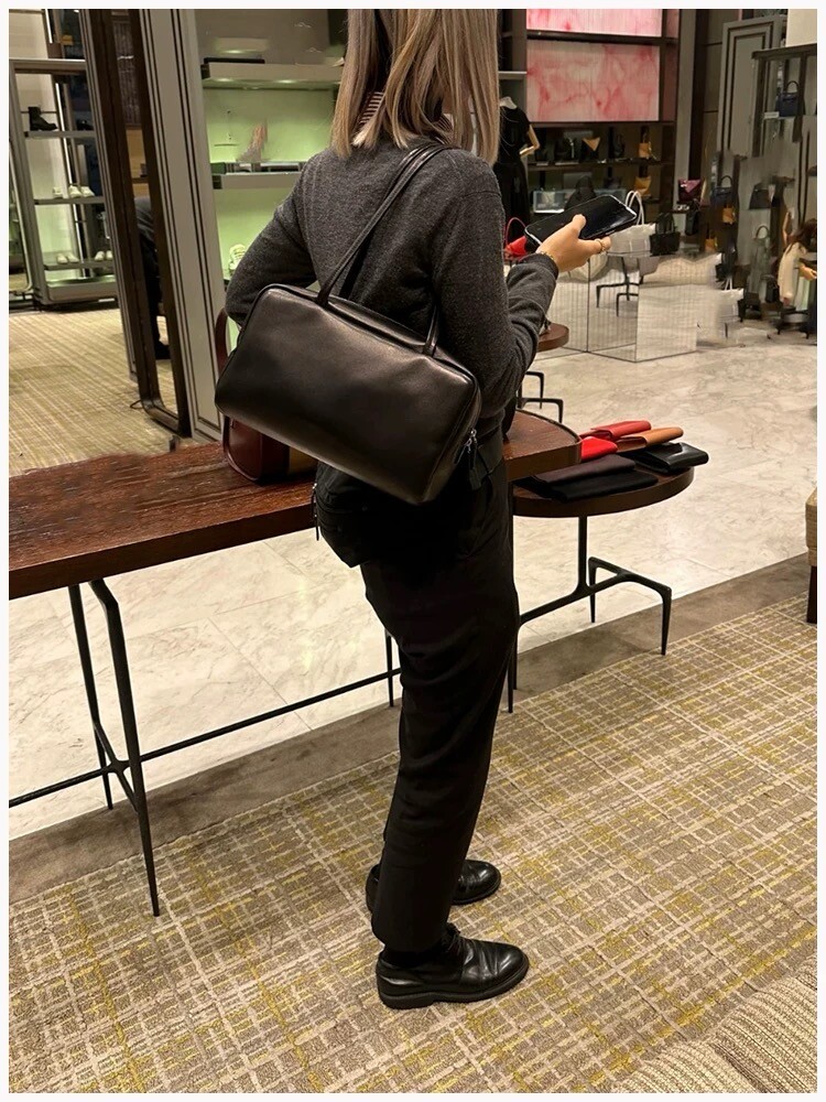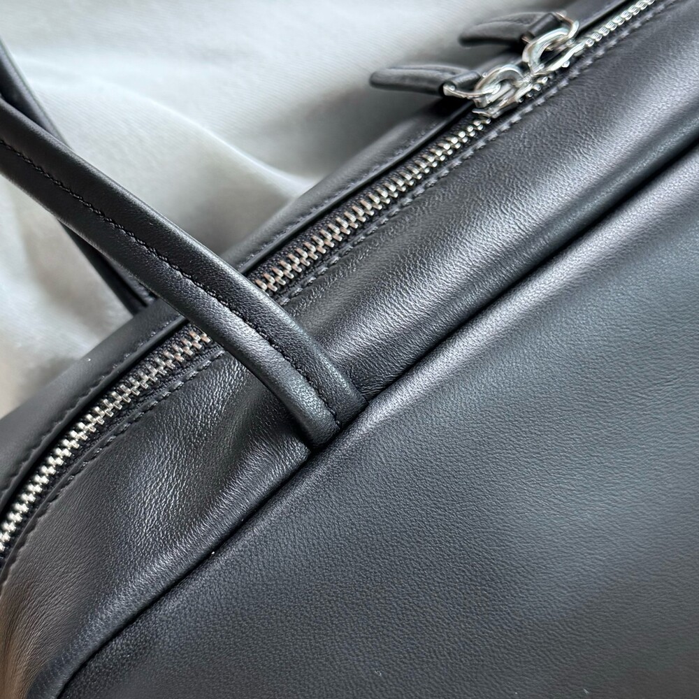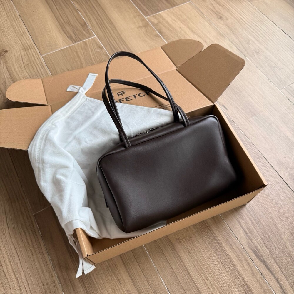 매끄러운 나파 가죽 소재의 소프트 볼링 백. 터닝 엣지 마감한 디자인, 긴 플랫 핸들, 듀얼 지퍼 클로저.