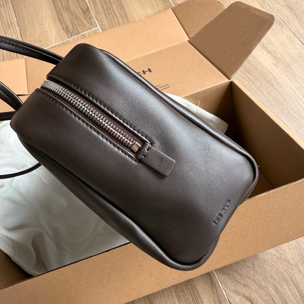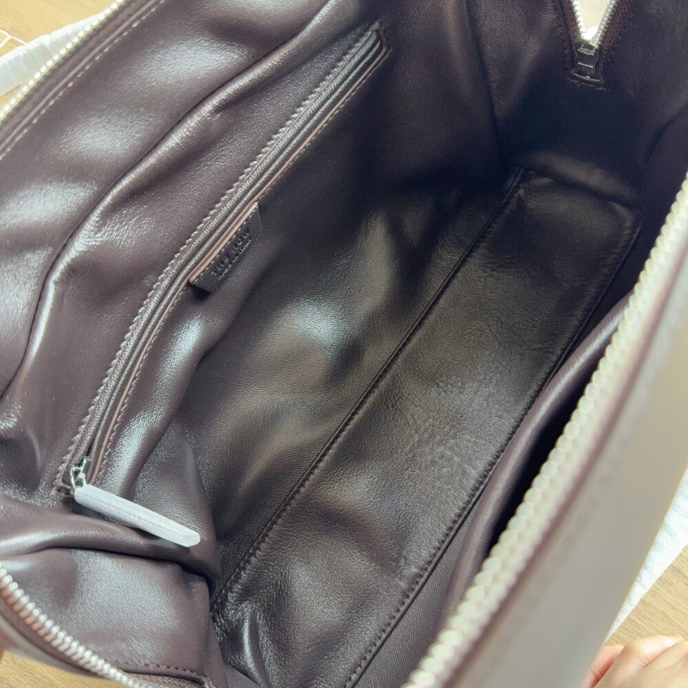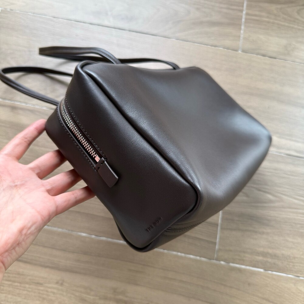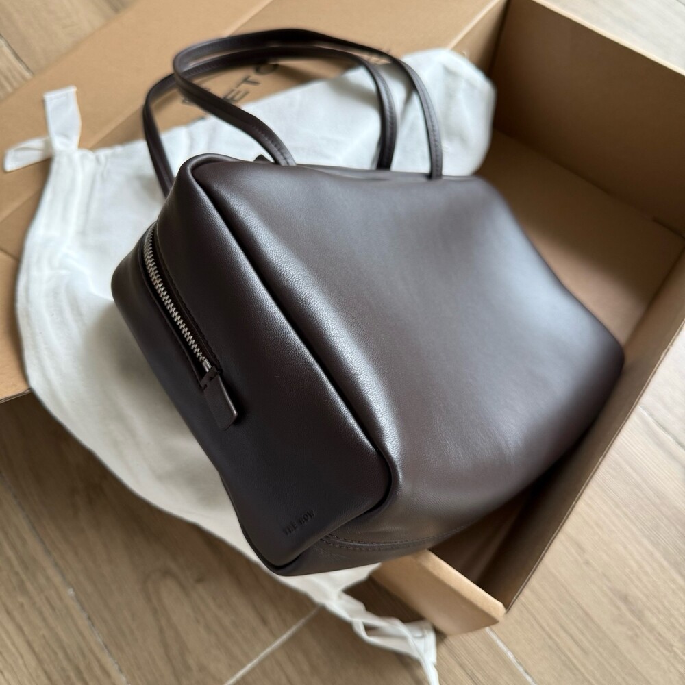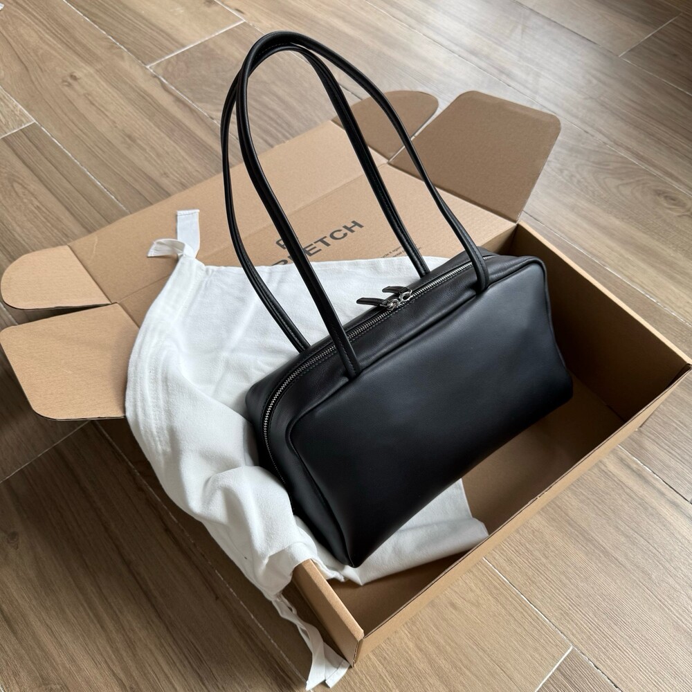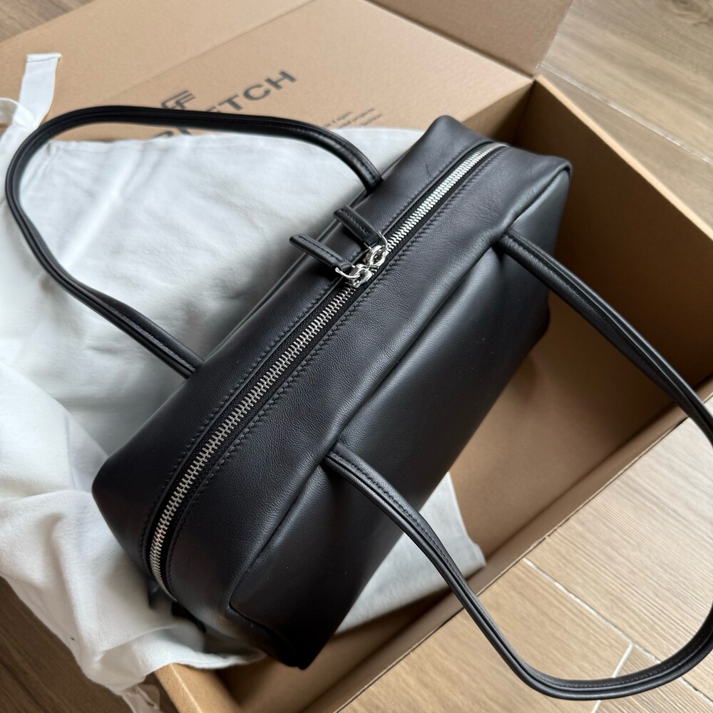 매끄러운 나파 가죽 소재의 소프트 볼링 백. 터닝 엣지 마감한 디자인, 긴 플랫 핸들, 듀얼 지퍼 클로저.