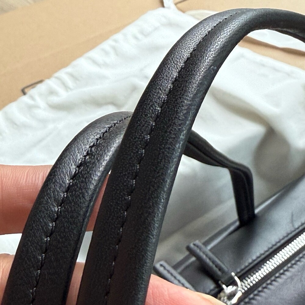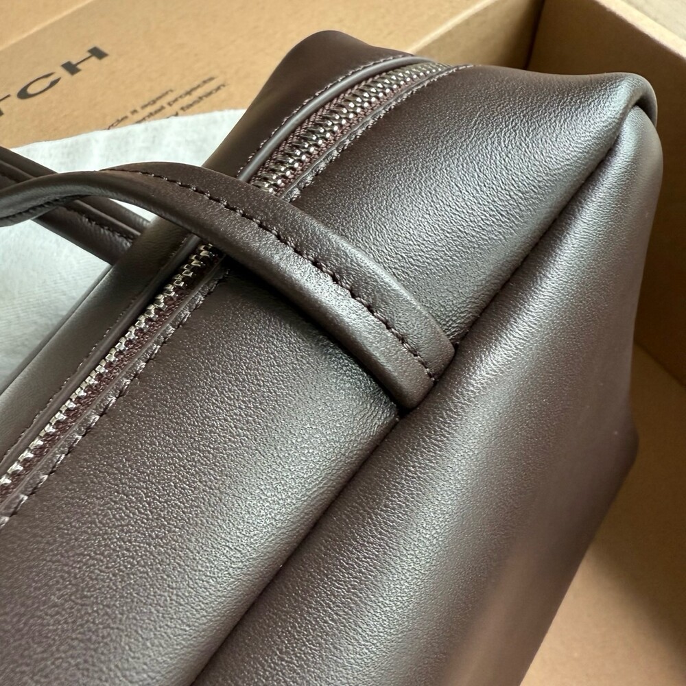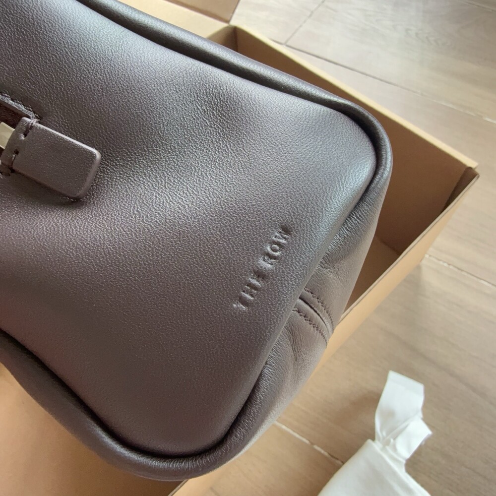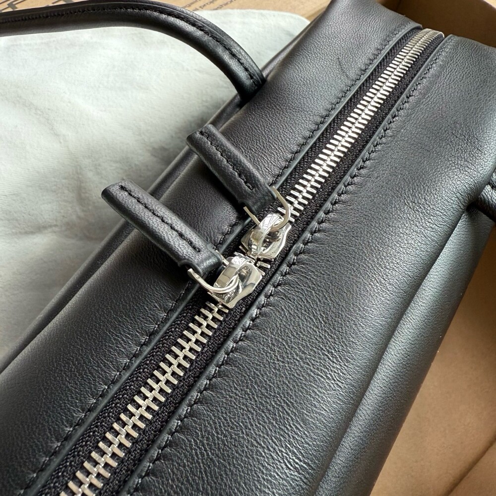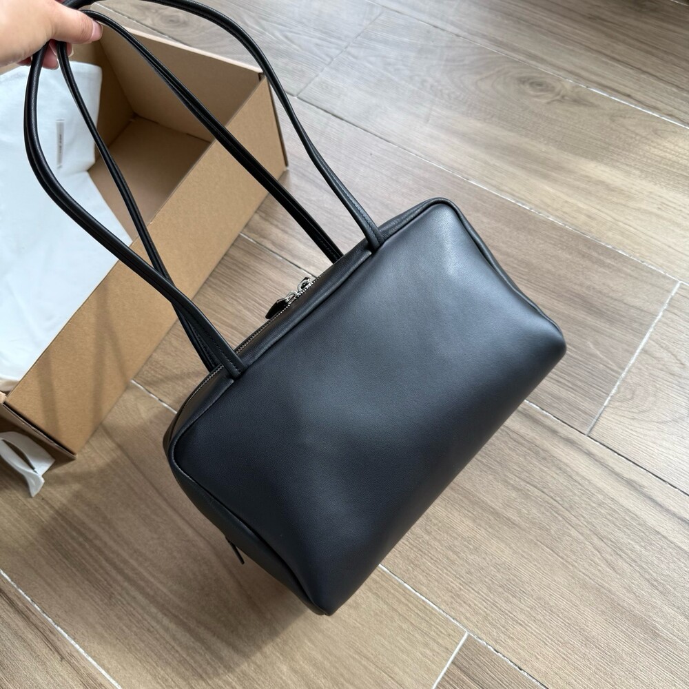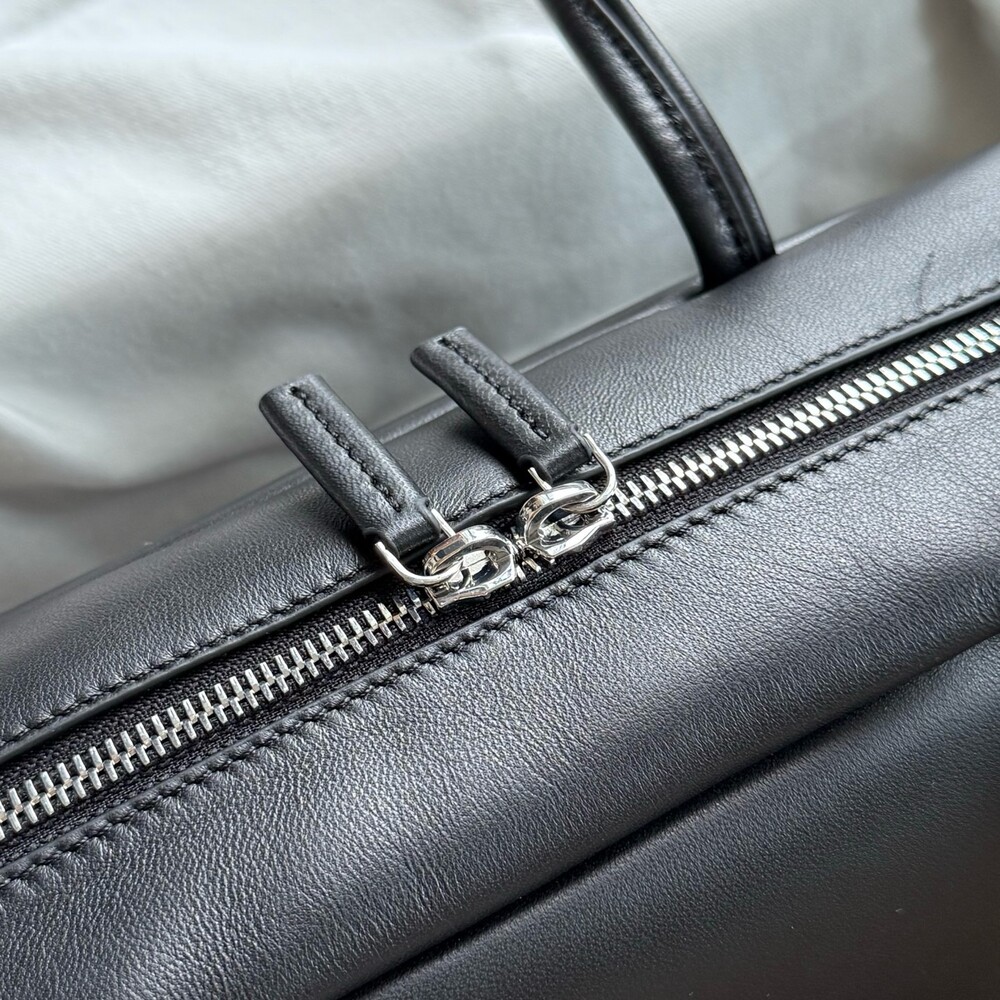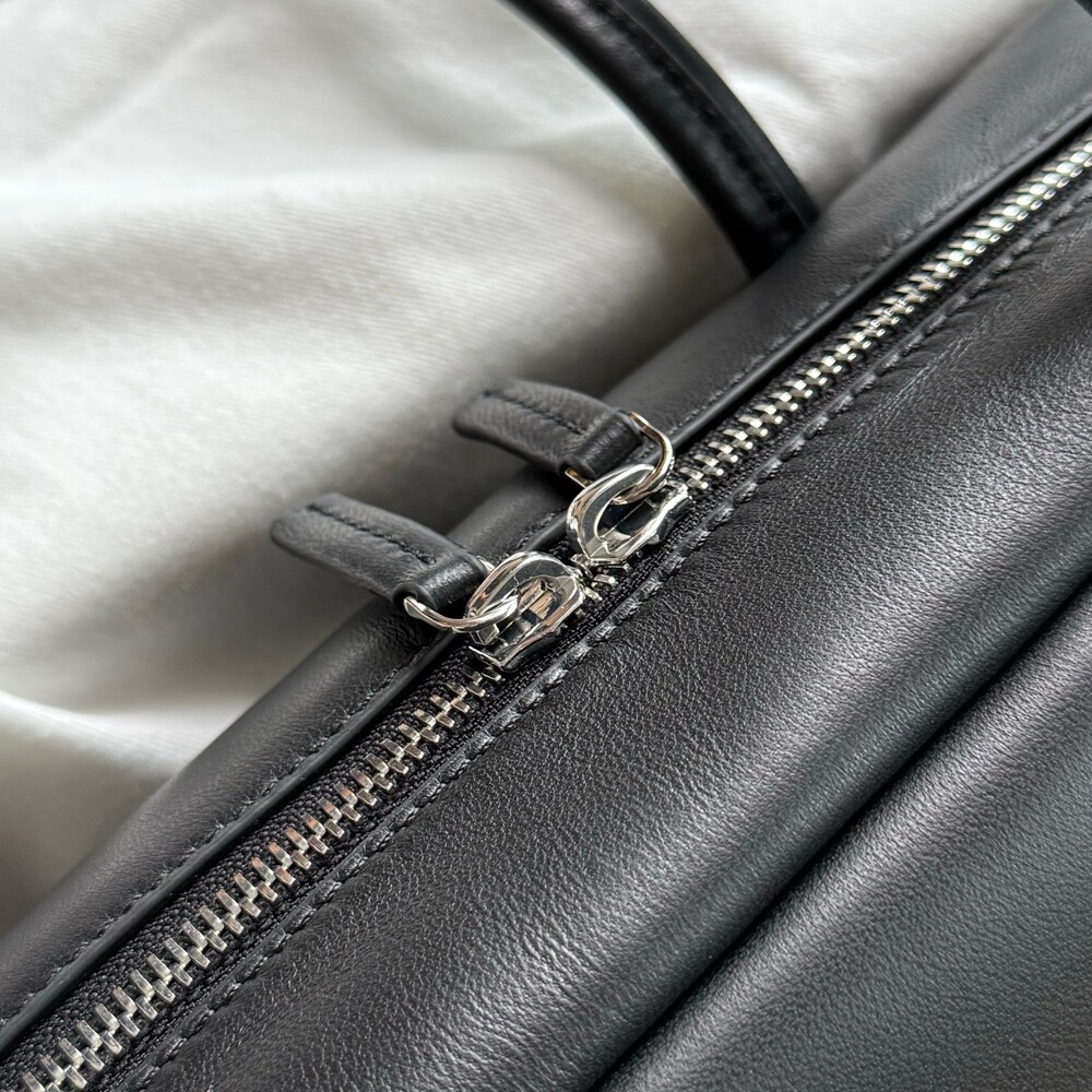 매끄러운 나파 가죽 소재의 소프트 볼링 백. 터닝 엣지 마감한 디자인, 긴 플랫 핸들, 듀얼 지퍼 클로저.