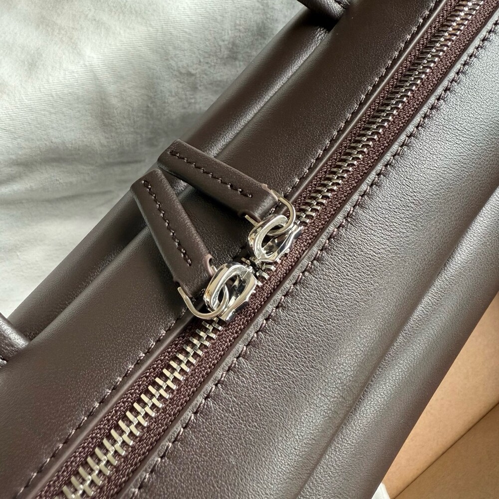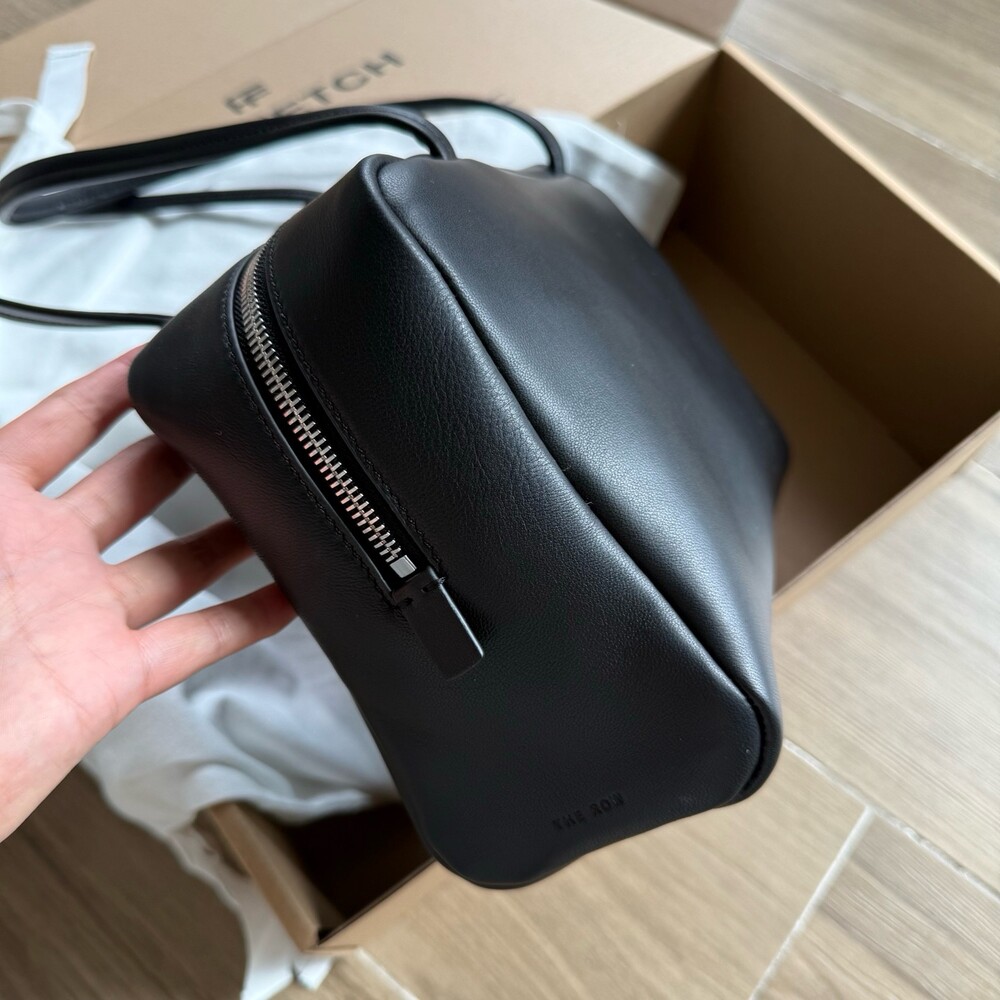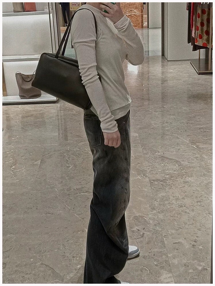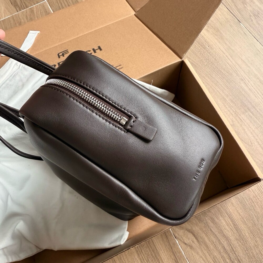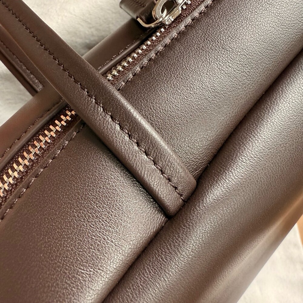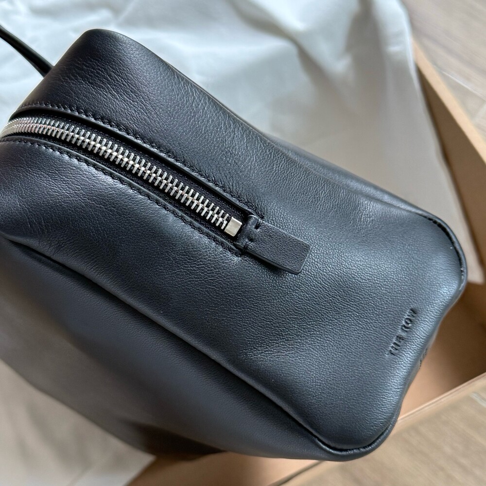 매끄러운 나파 가죽 소재의 소프트 볼링 백. 터닝 엣지 마감한 디자인, 긴 플랫 핸들, 듀얼 지퍼 클로저.