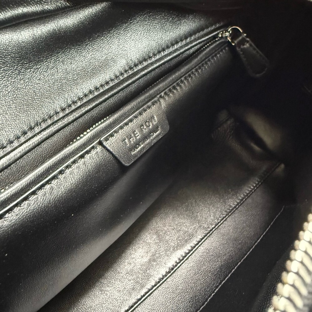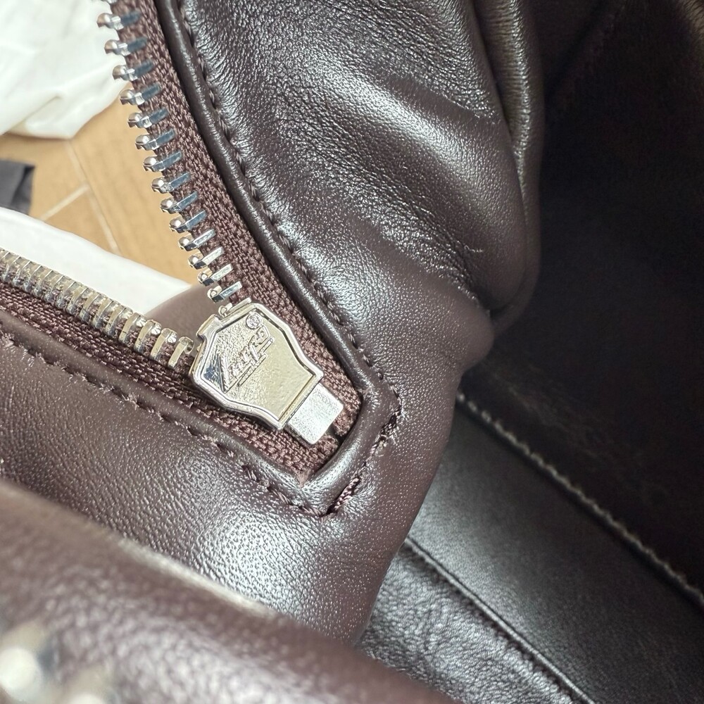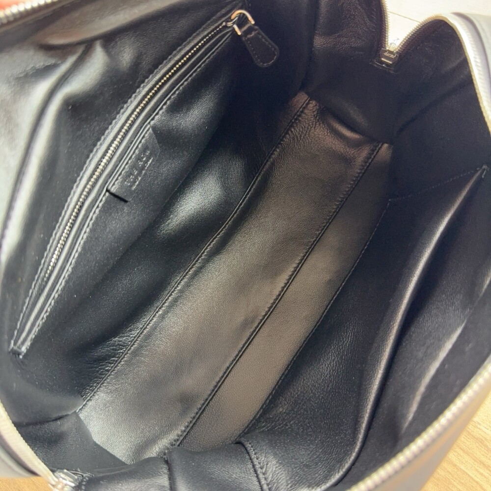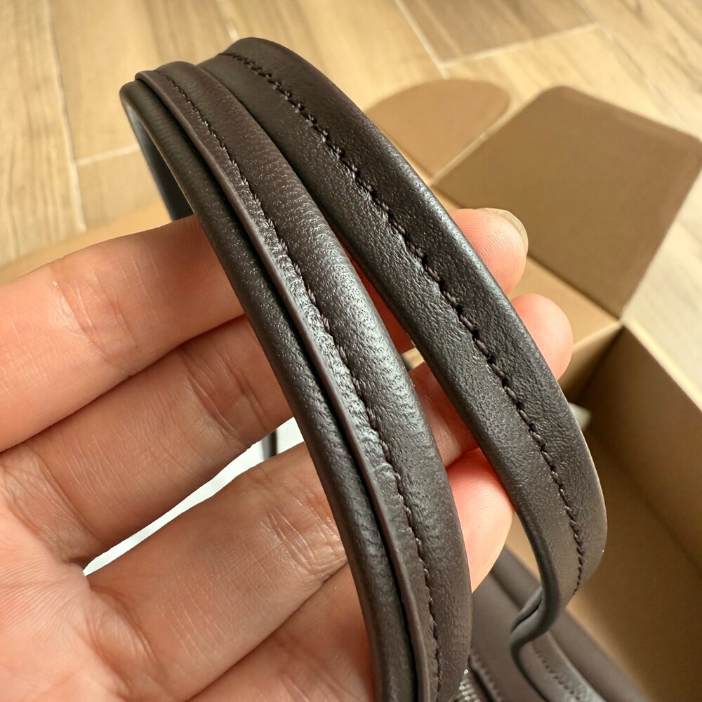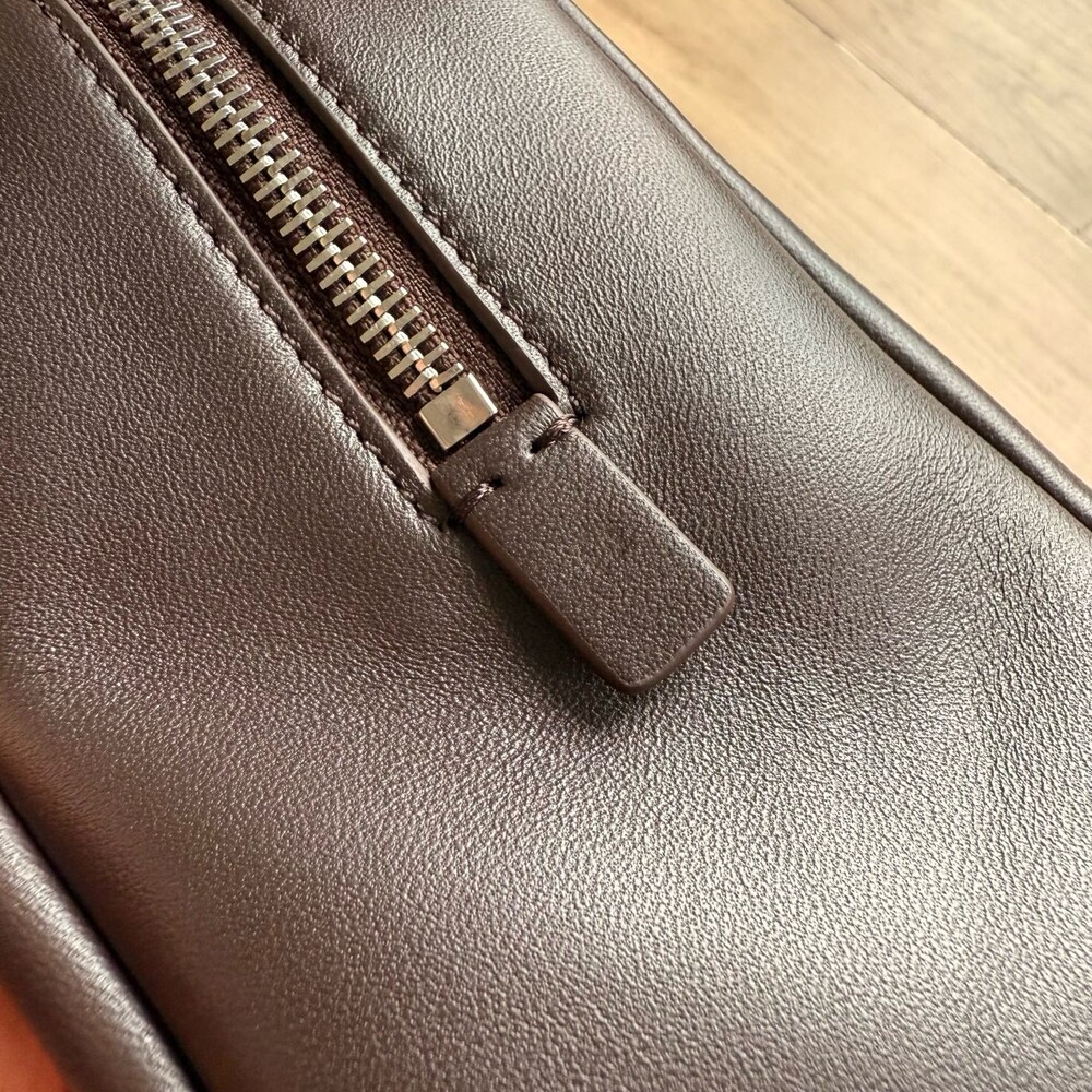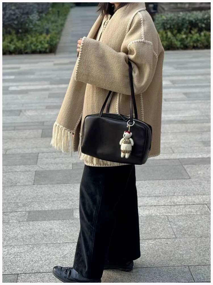 매끄러운 나파 가죽 소재의 소프트 볼링 백. 터닝 엣지 마감한 디자인, 긴 플랫 핸들, 듀얼 지퍼 클로저.