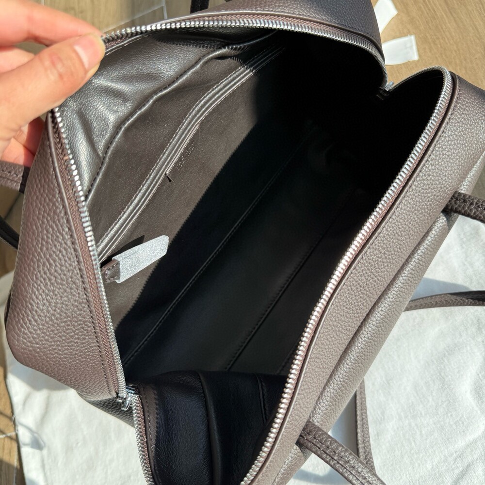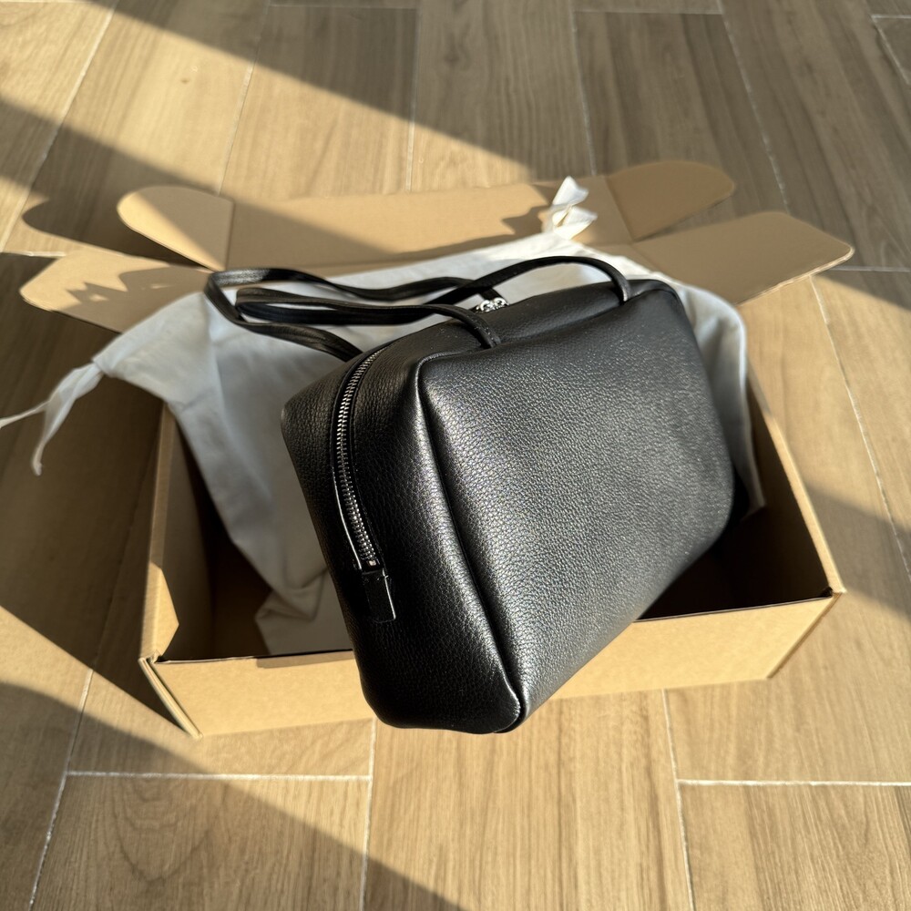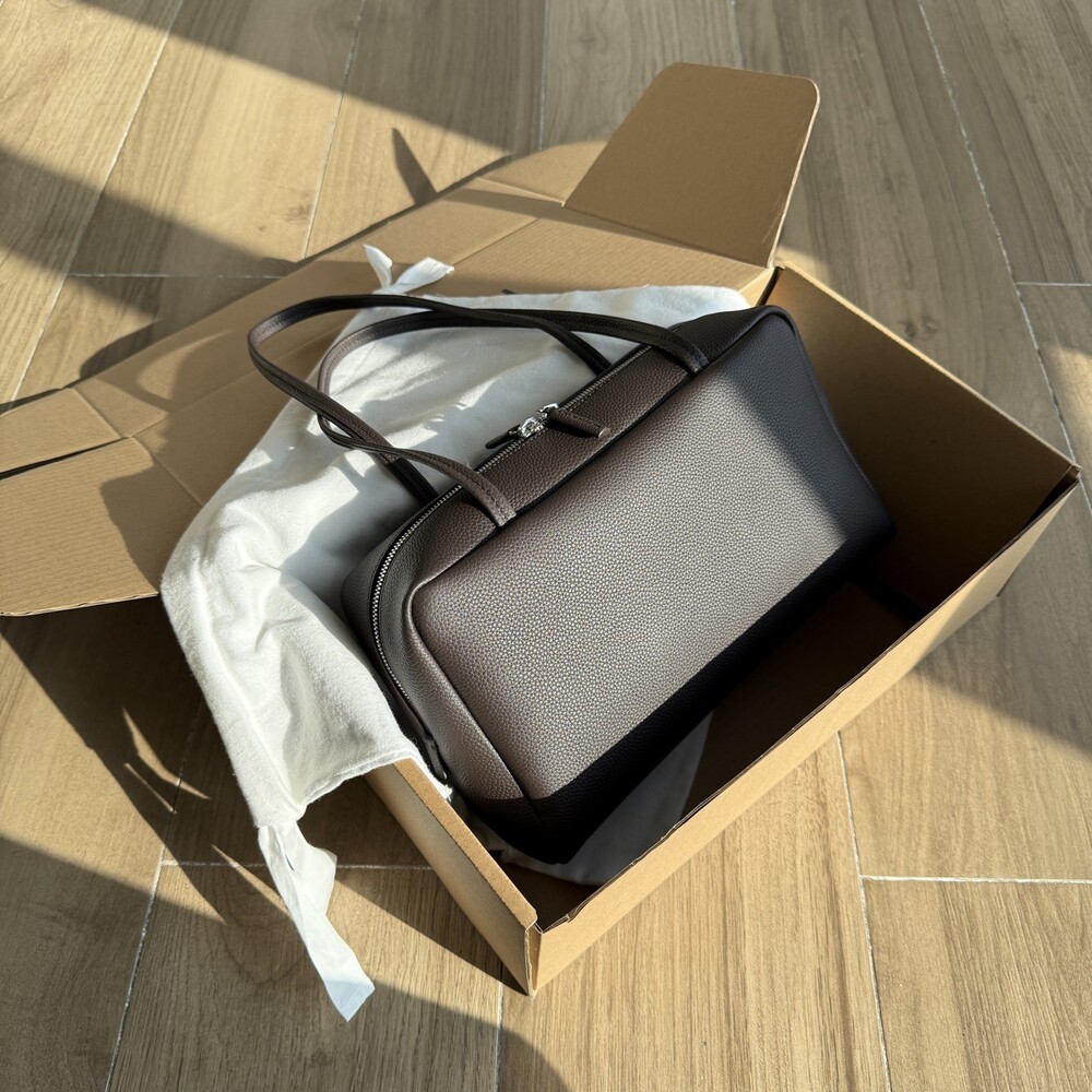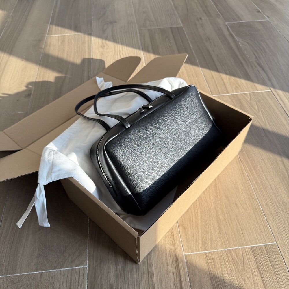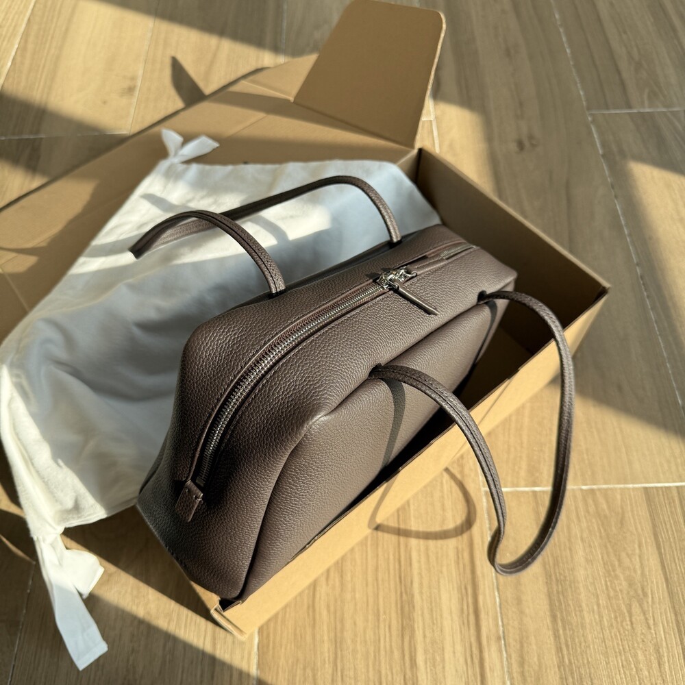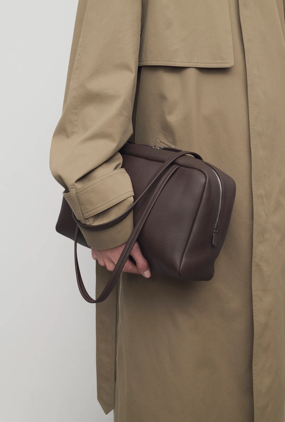 둥근 가장자리 구조, 긴 플랫 핸들과 듀얼 지퍼 클로저가 특징인 질감 마감 송아지 가죽 소재의 소프트 볼링 백. 부드러운 감촉과 세련된 질감을 부여하여 시간이 지날수록 개성이 더해집니다.