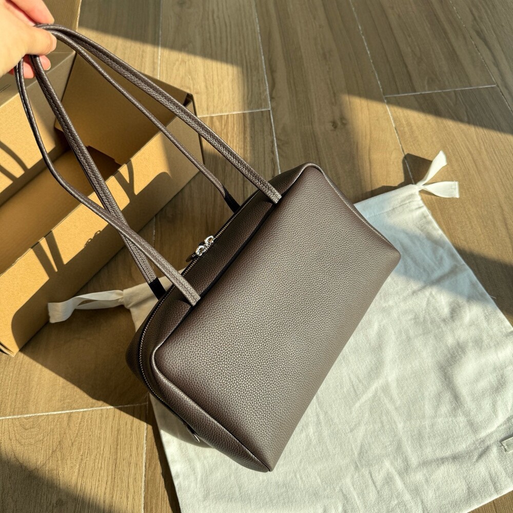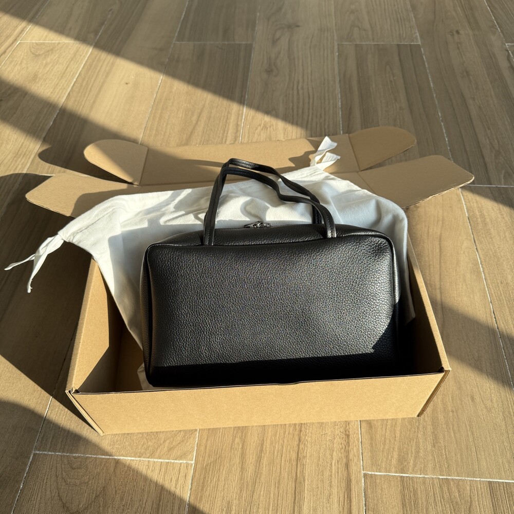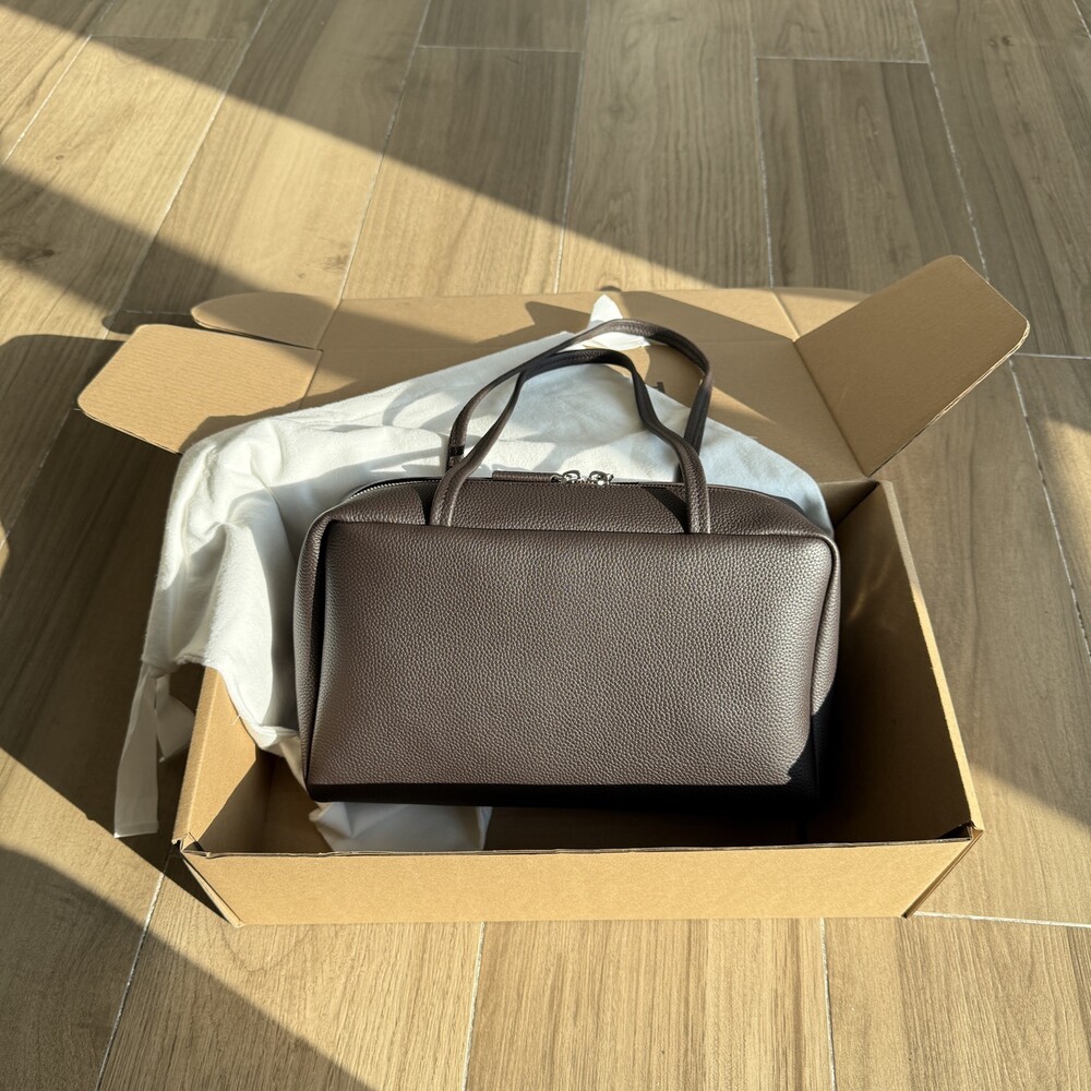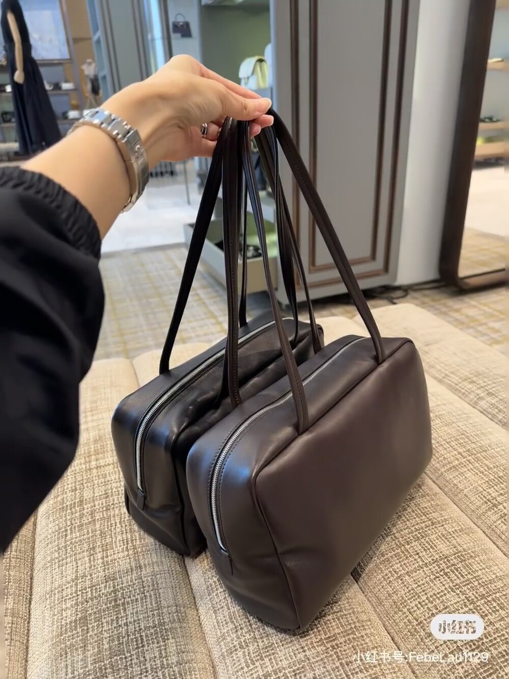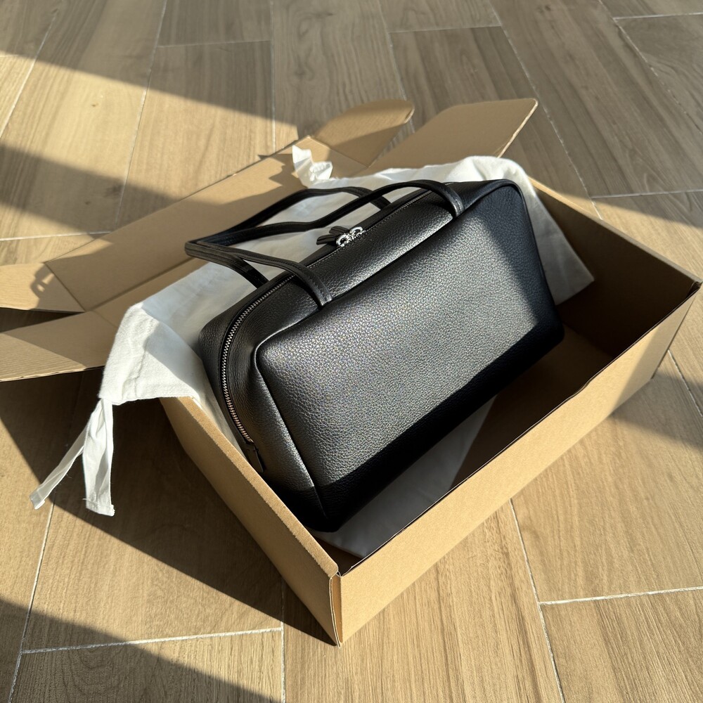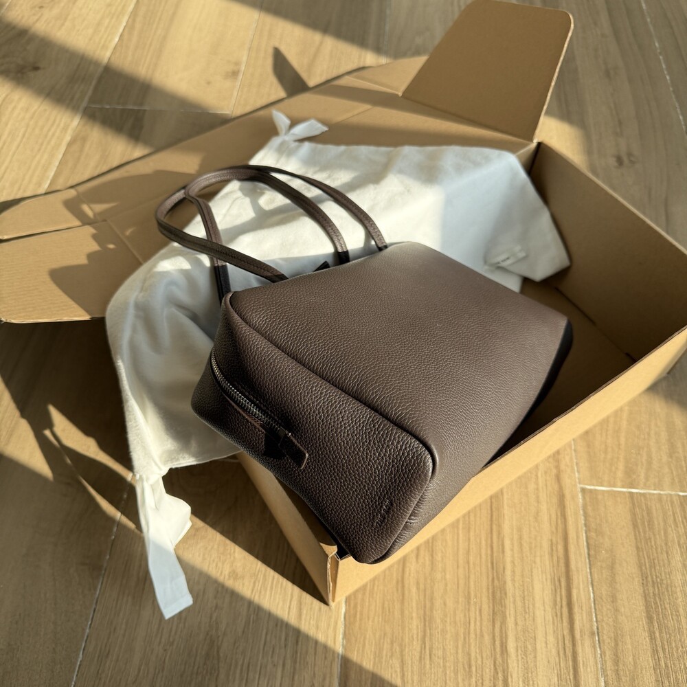 둥근 가장자리 구조, 긴 플랫 핸들과 듀얼 지퍼 클로저가 특징인 질감 마감 송아지 가죽 소재의 소프트 볼링 백. 부드러운 감촉과 세련된 질감을 부여하여 시간이 지날수록 개성이 더해집니다.
