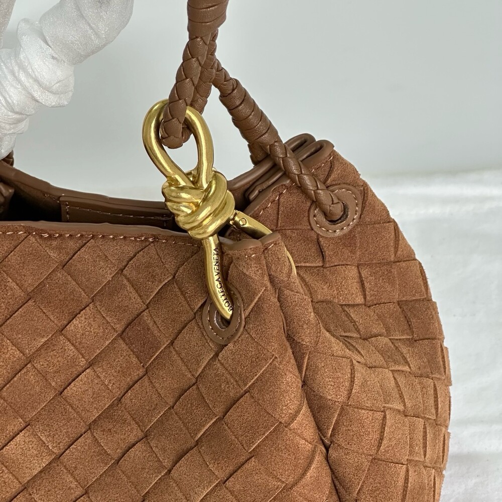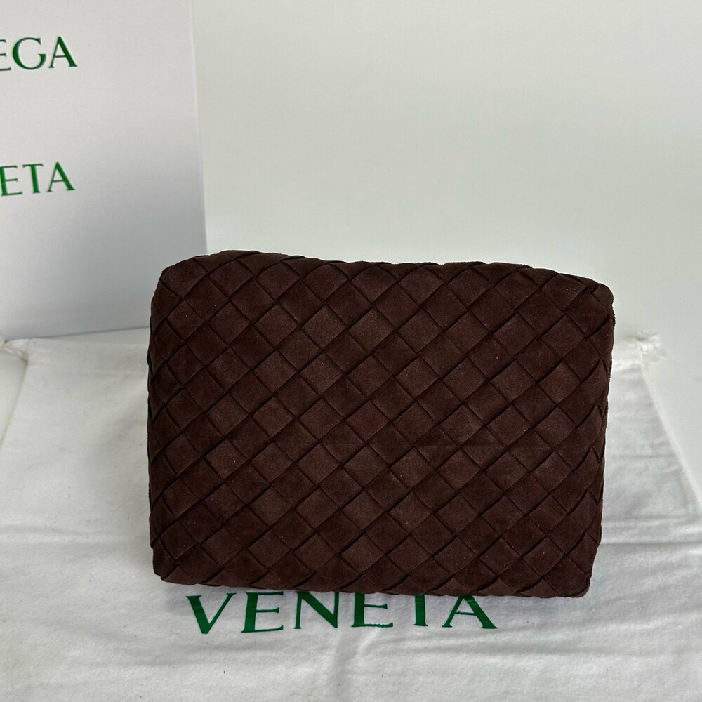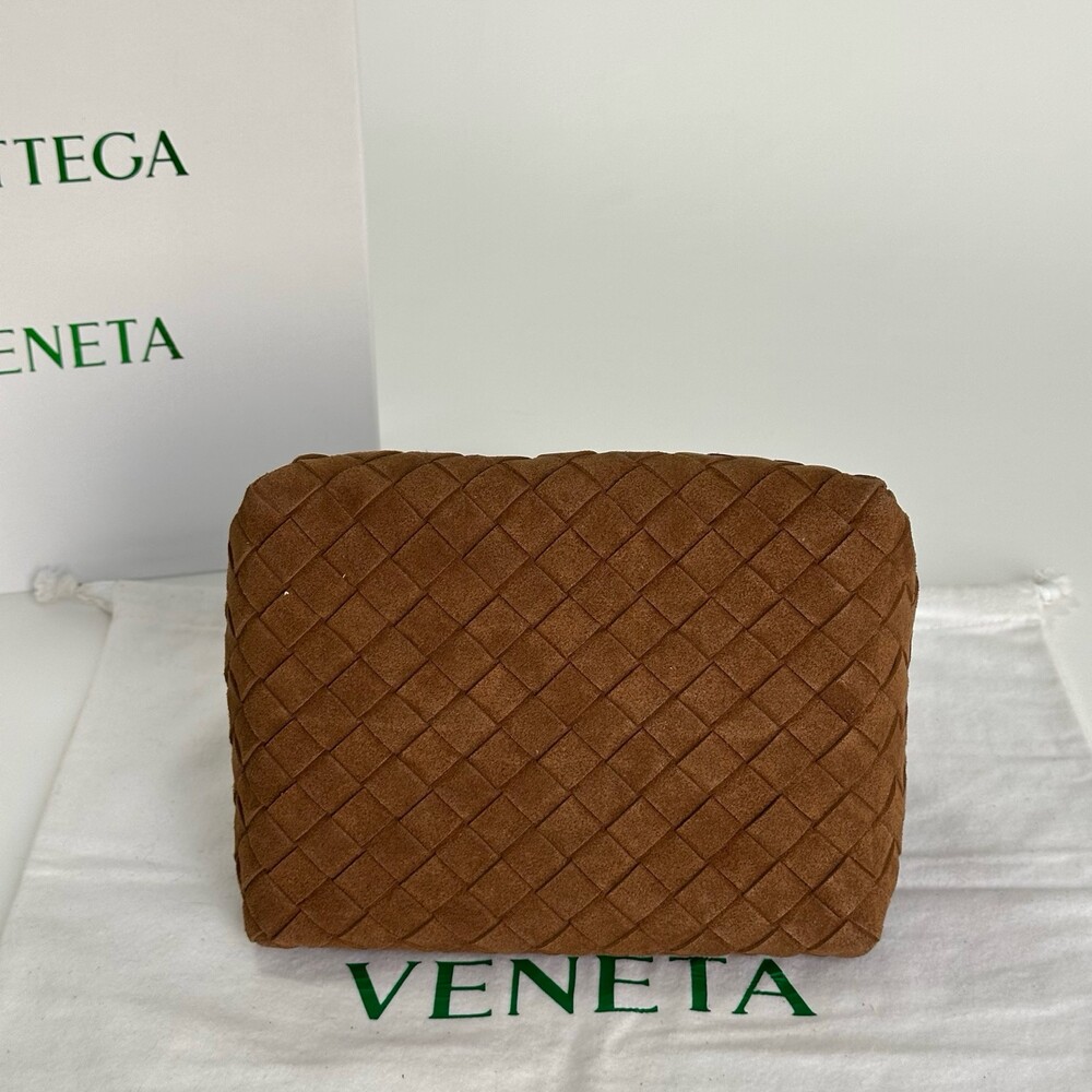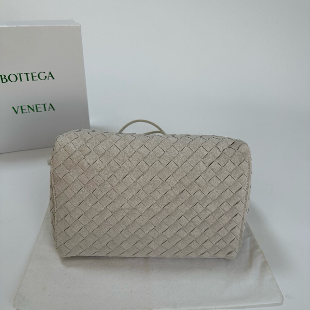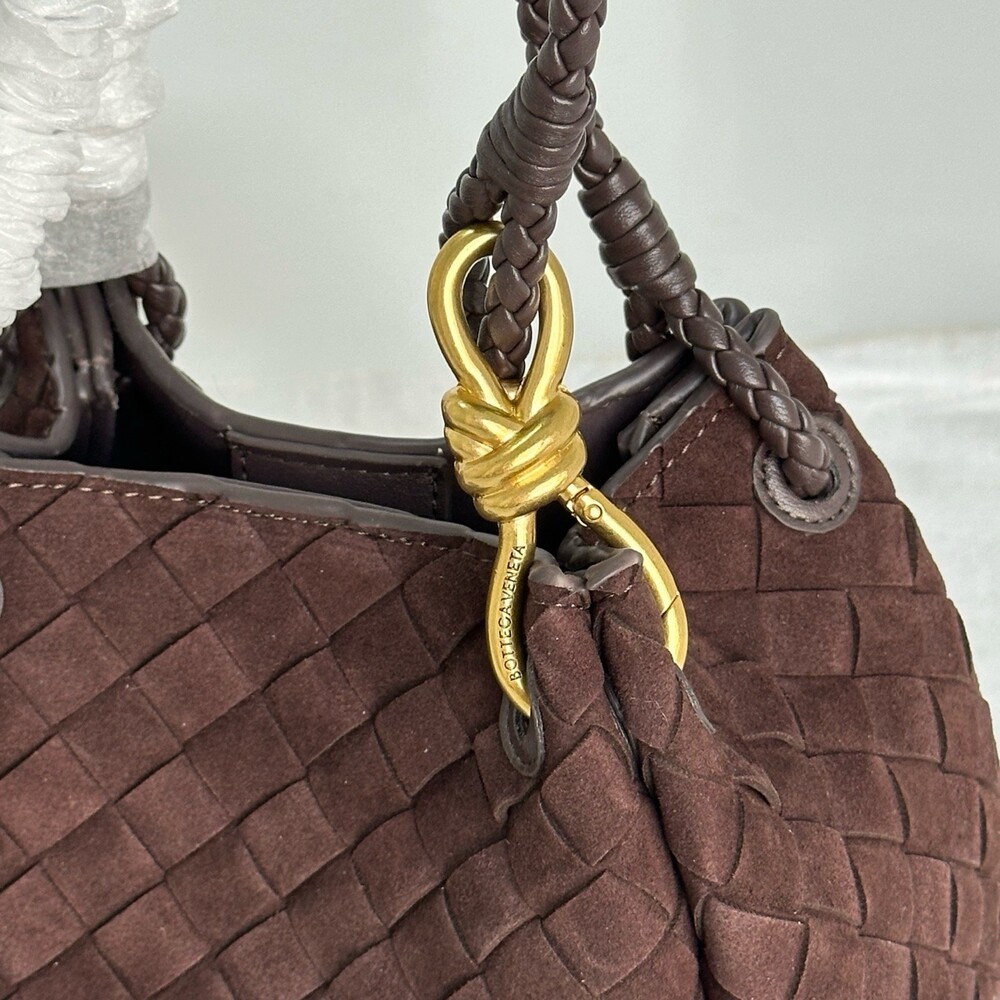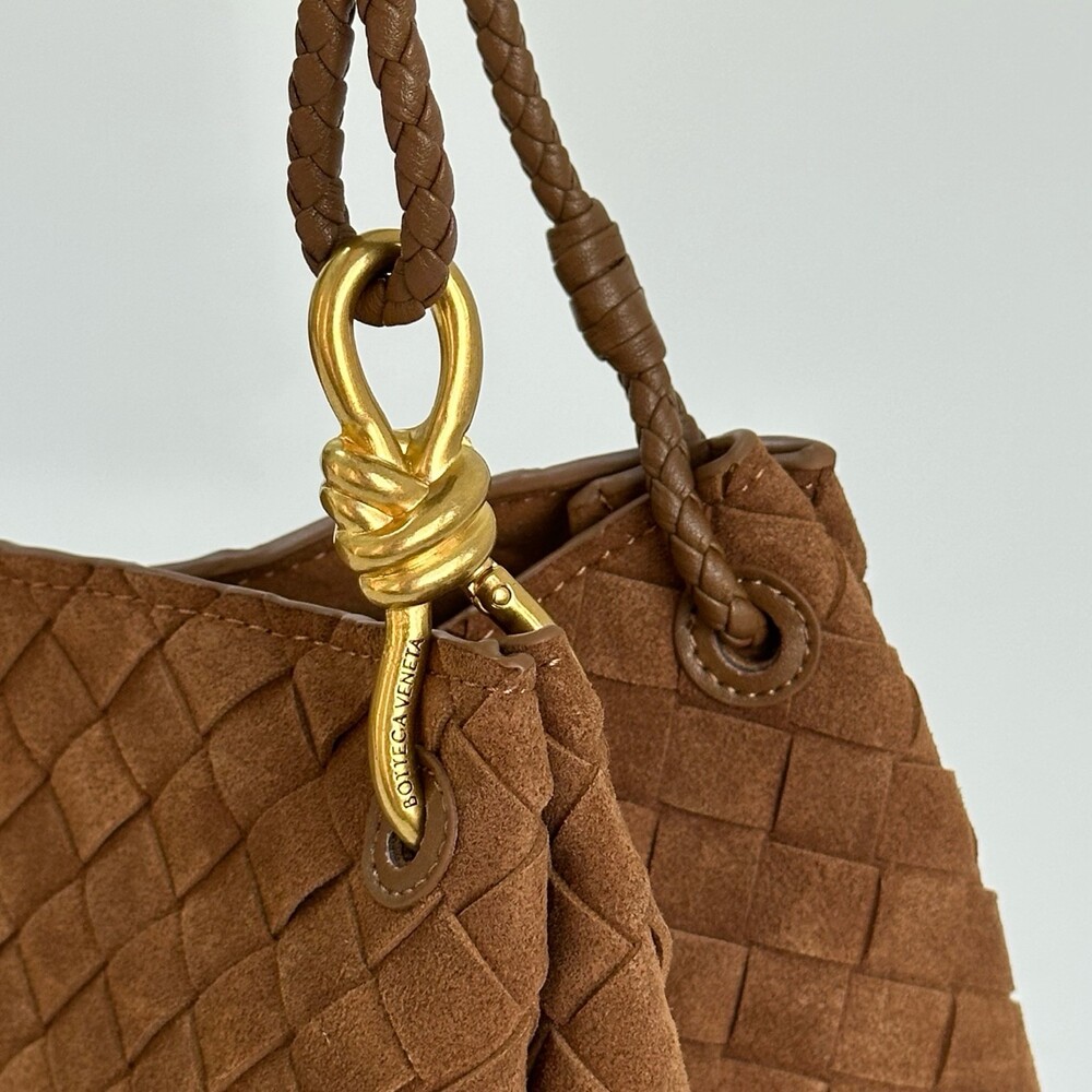 스웨이드 소재와 브랜드 시그니처 인트레치아토 직조 기법을 사용했습니다.