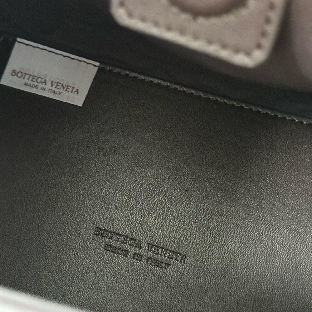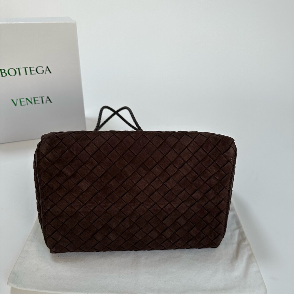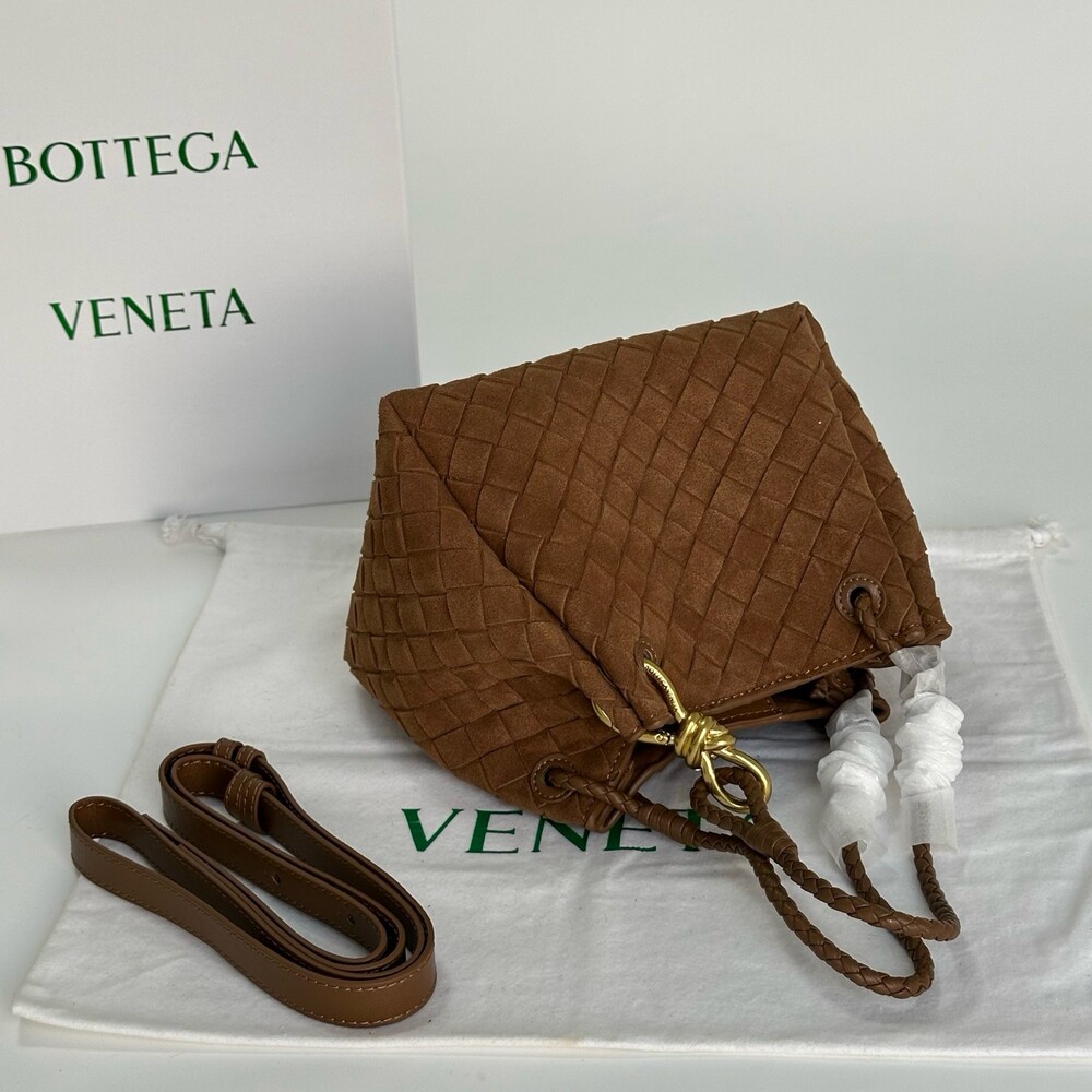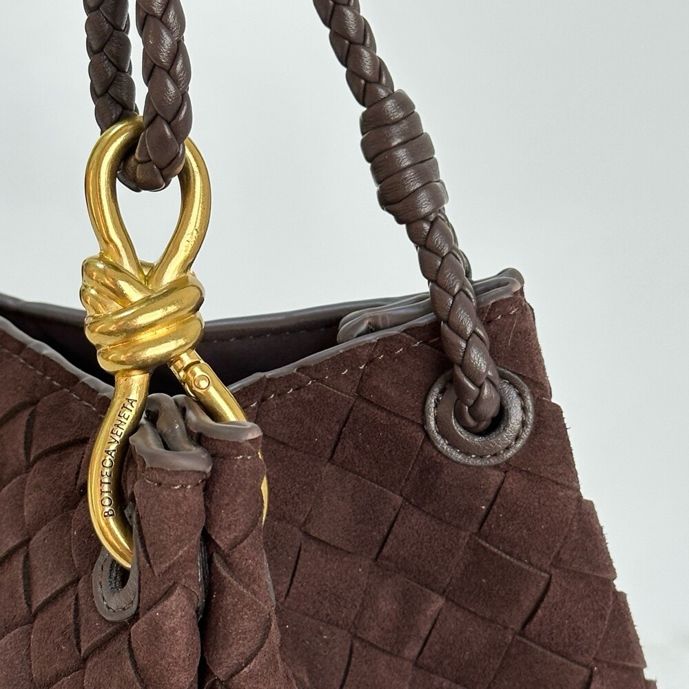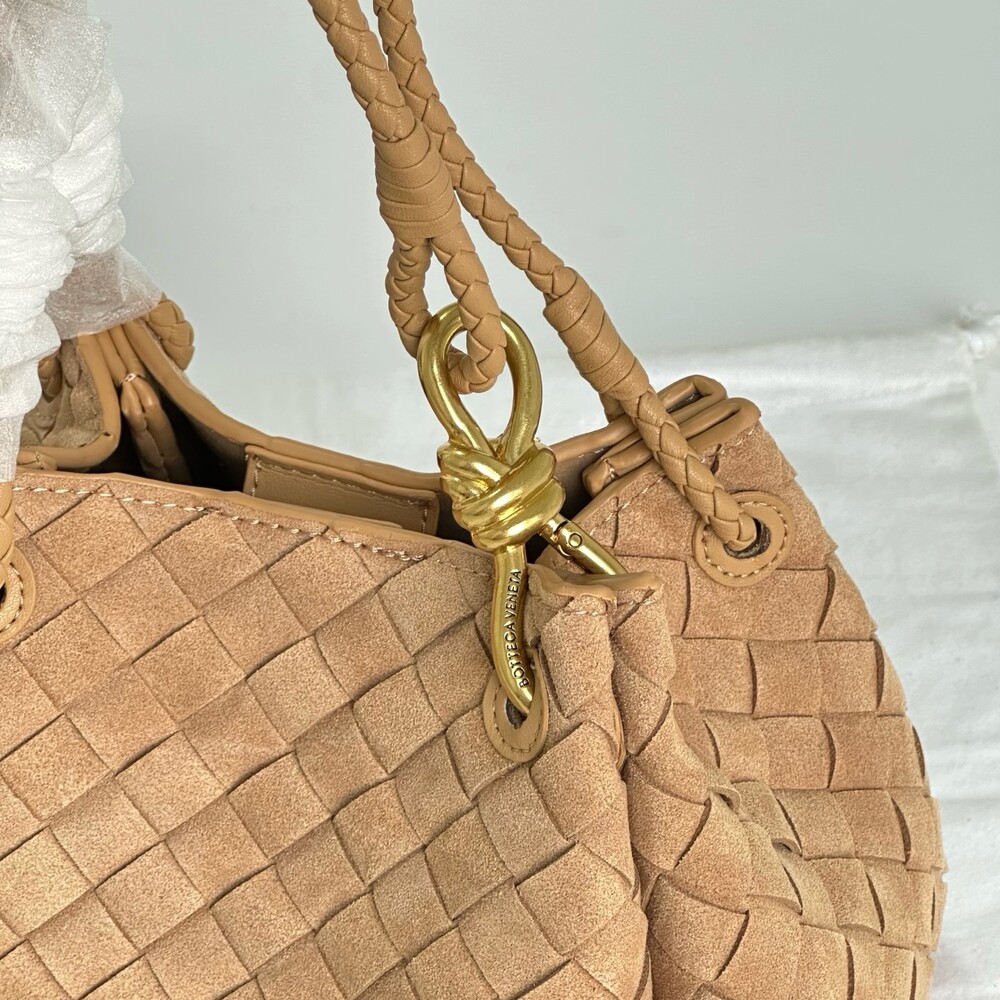 스웨이드 소재와 브랜드 시그니처 인트레치아토 직조 기법을 사용했습니다.